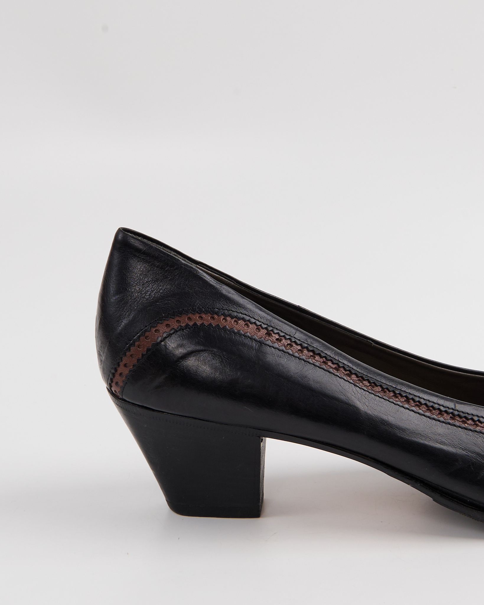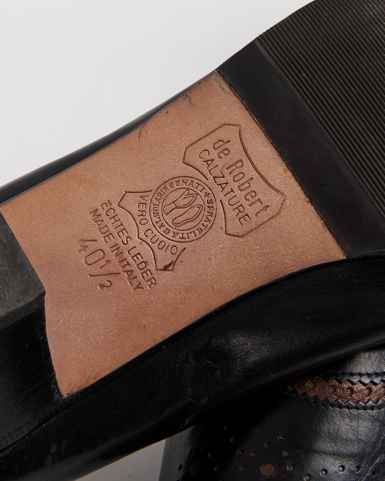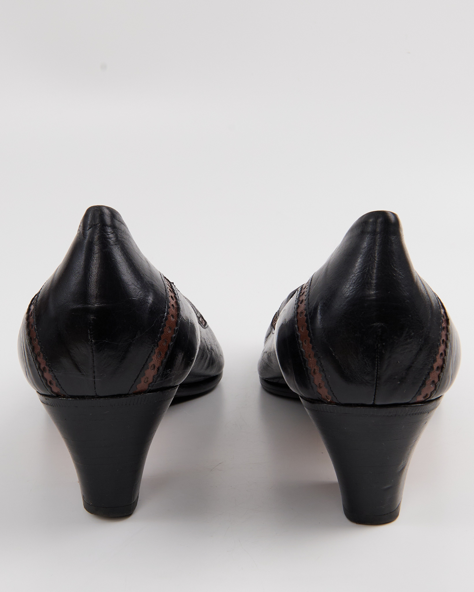Элегантные итальянские туфли De Roberti Calzature из натуральной кожи. Стильный классический дизайн с округлым носком, дополненный изящными декоративными перфорациями и контрастной коричневой строчкой. Удобный устойчивый каблук средней высоты. Сделаны в Италии.