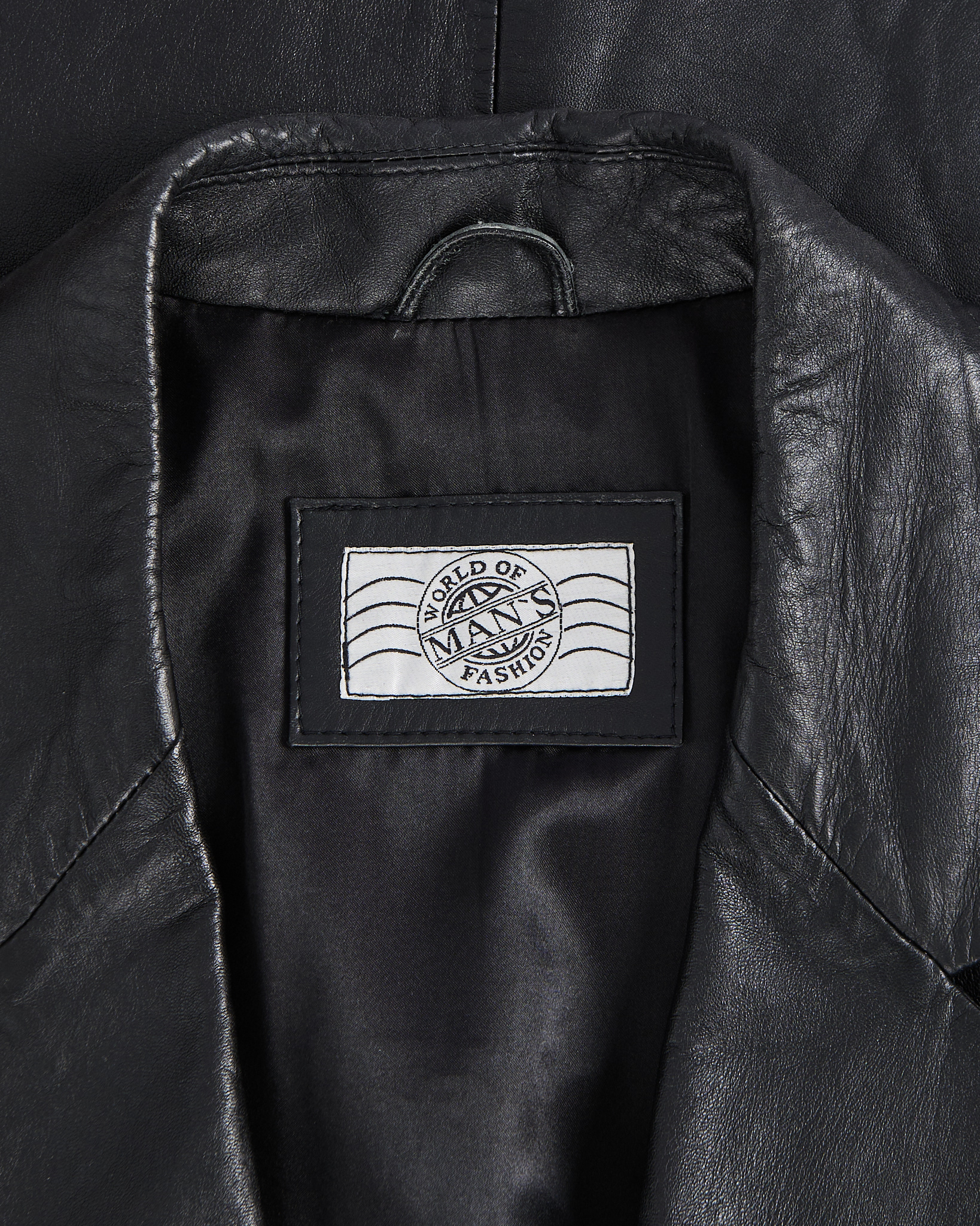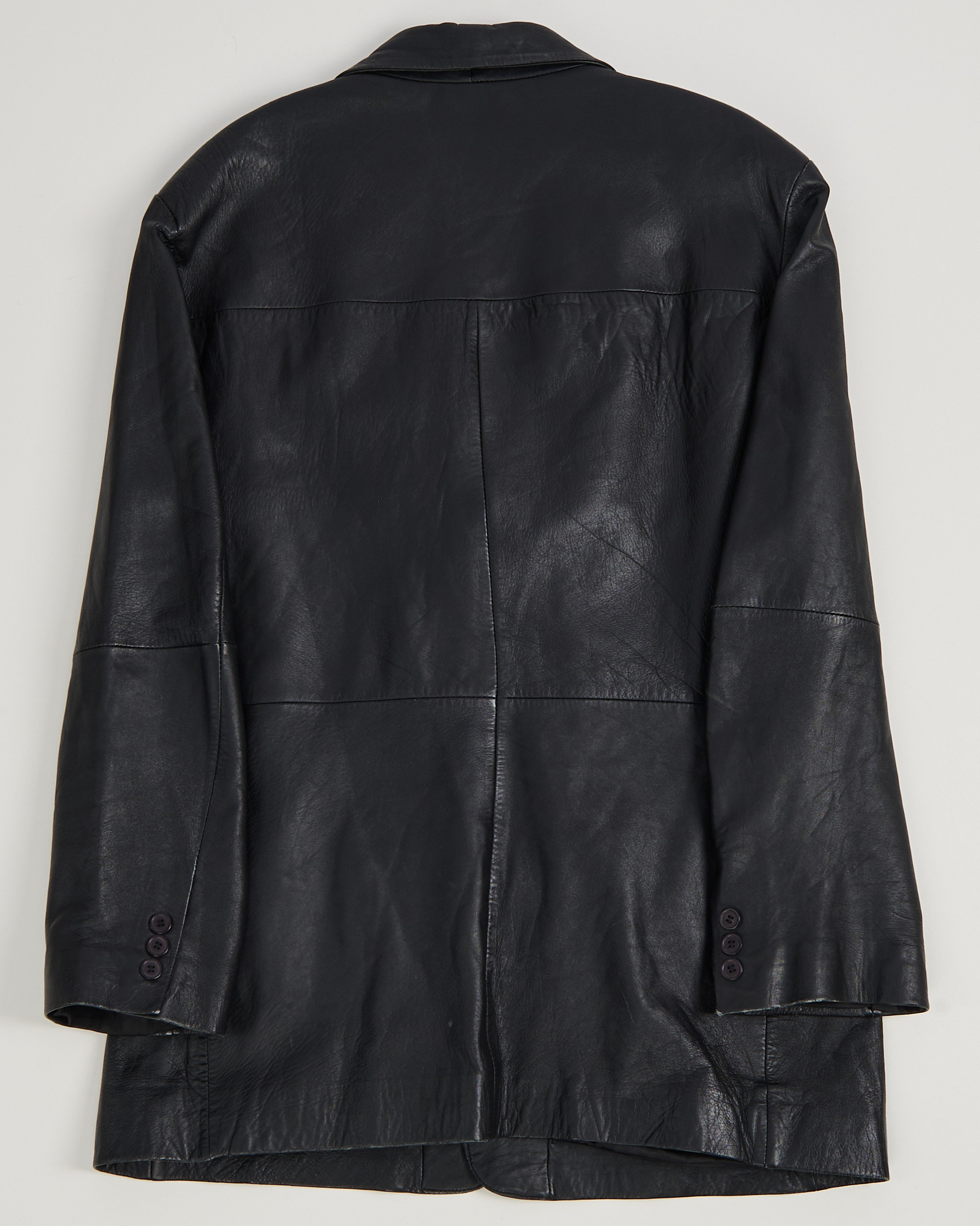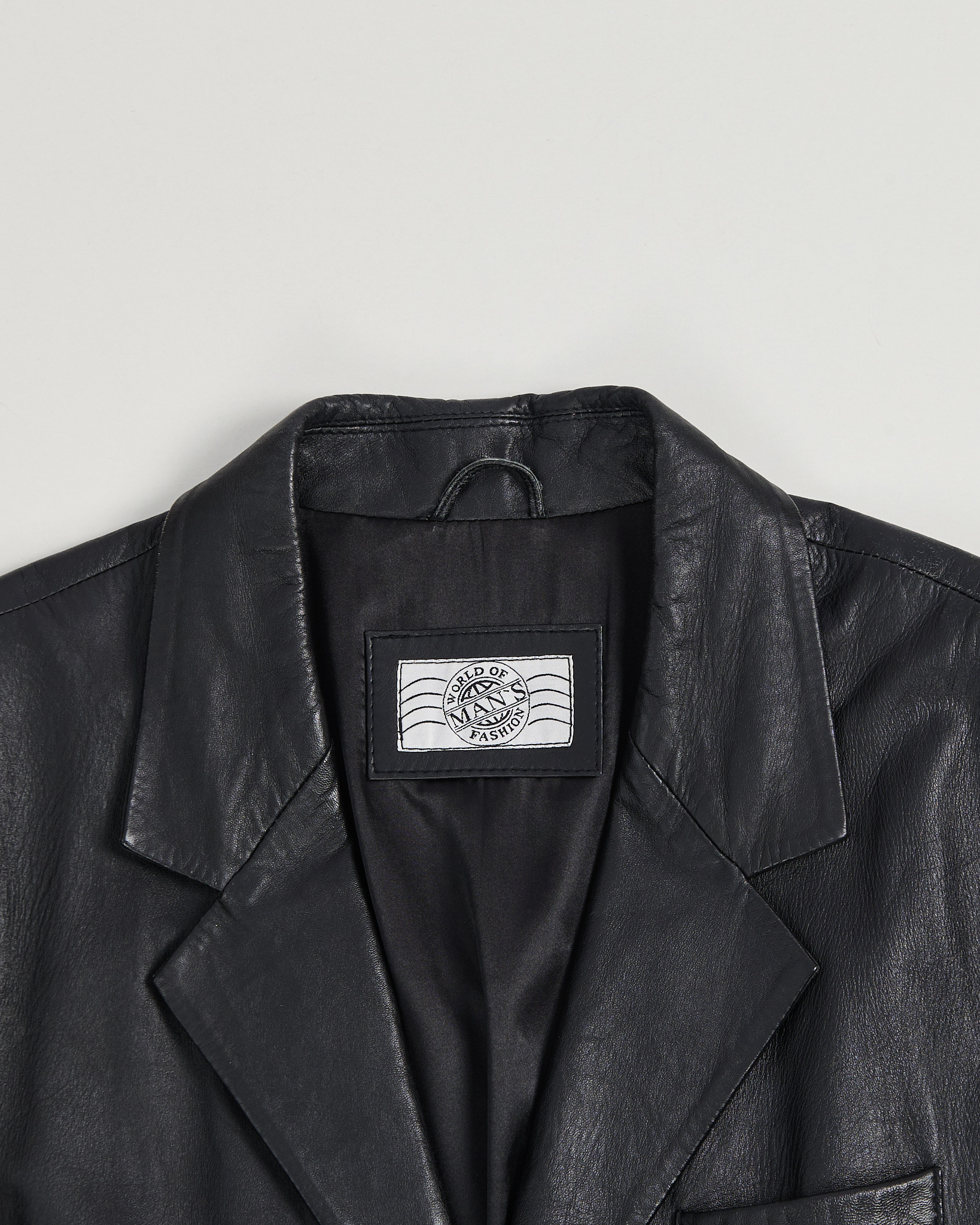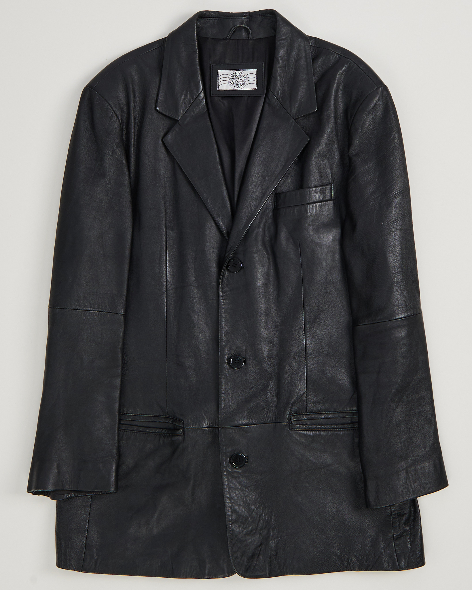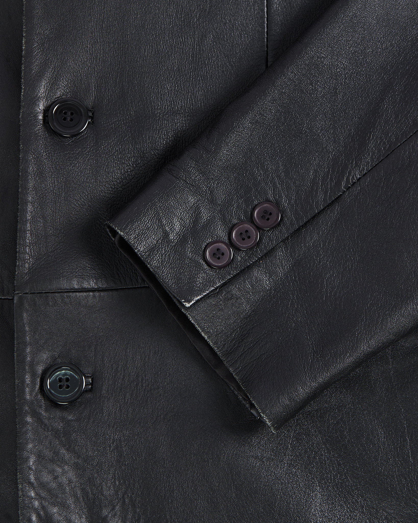 Пиджак из натуральной кожи глубокого чёрного цвета. Прямой крой, свободная посадка. Классические лацканы, нагрудный карман и аккуратные пуговицы.