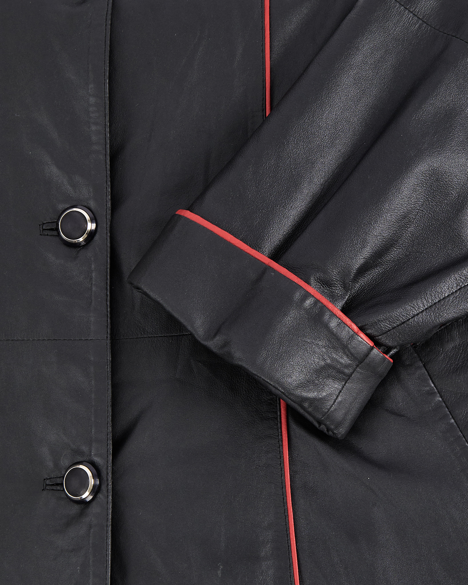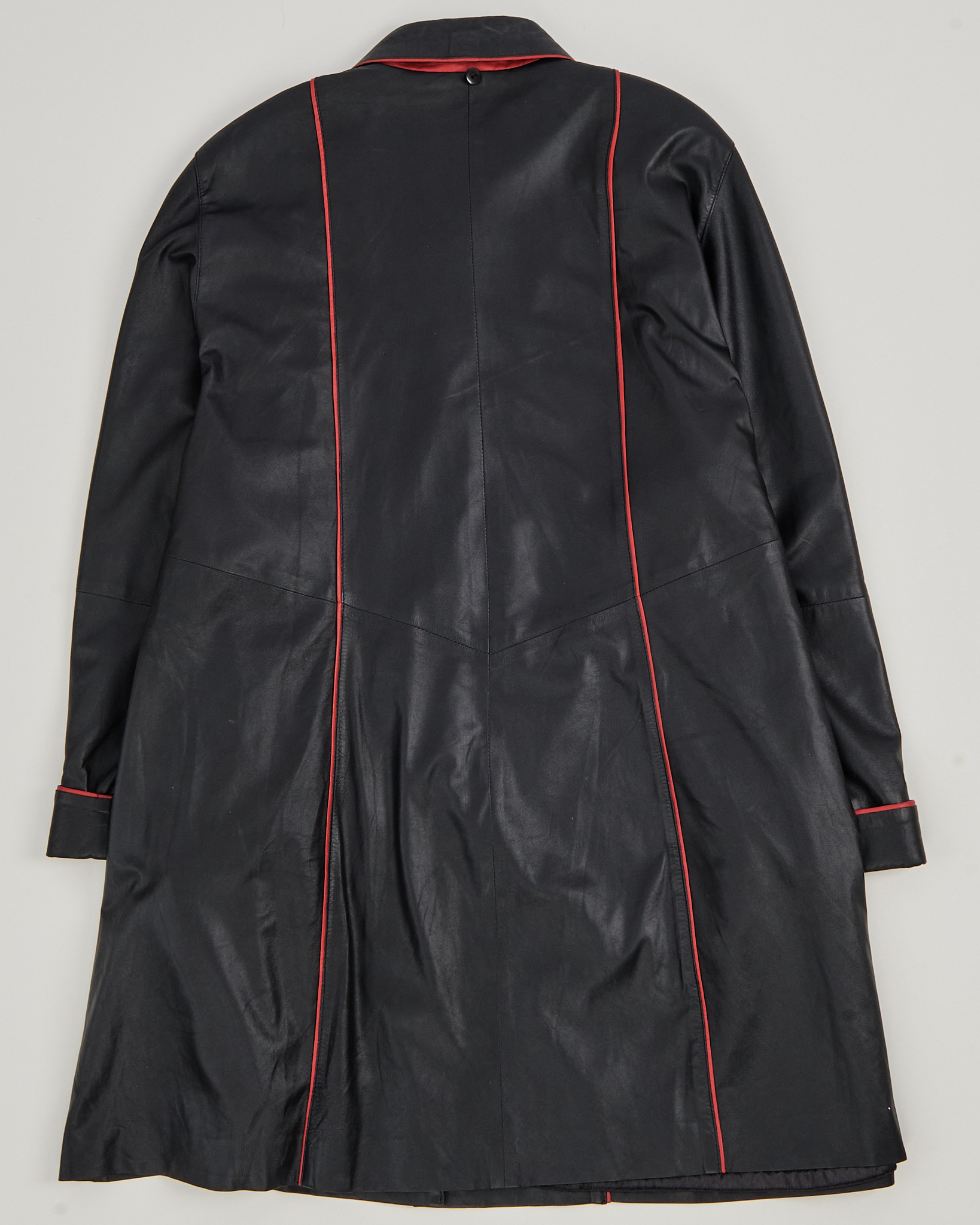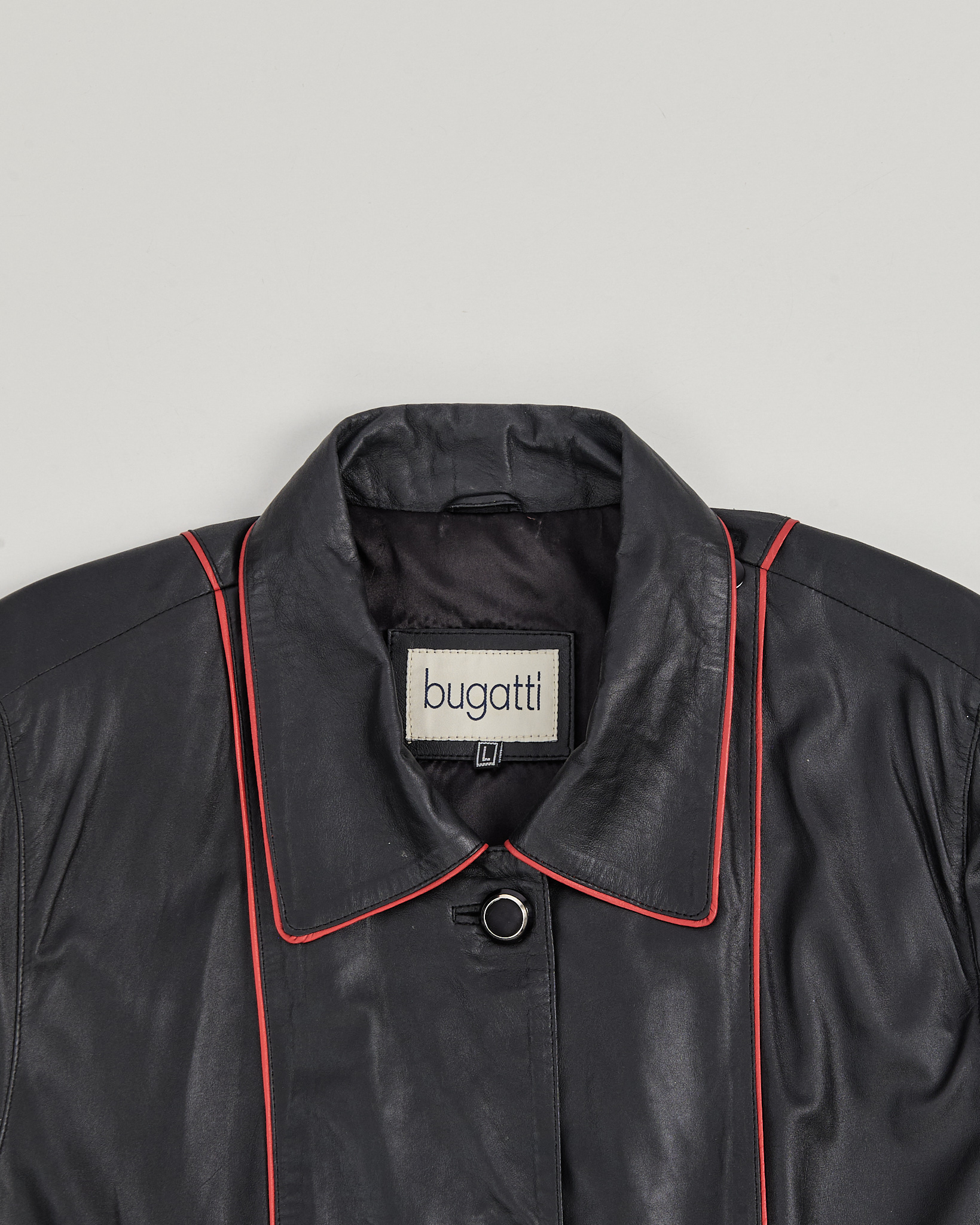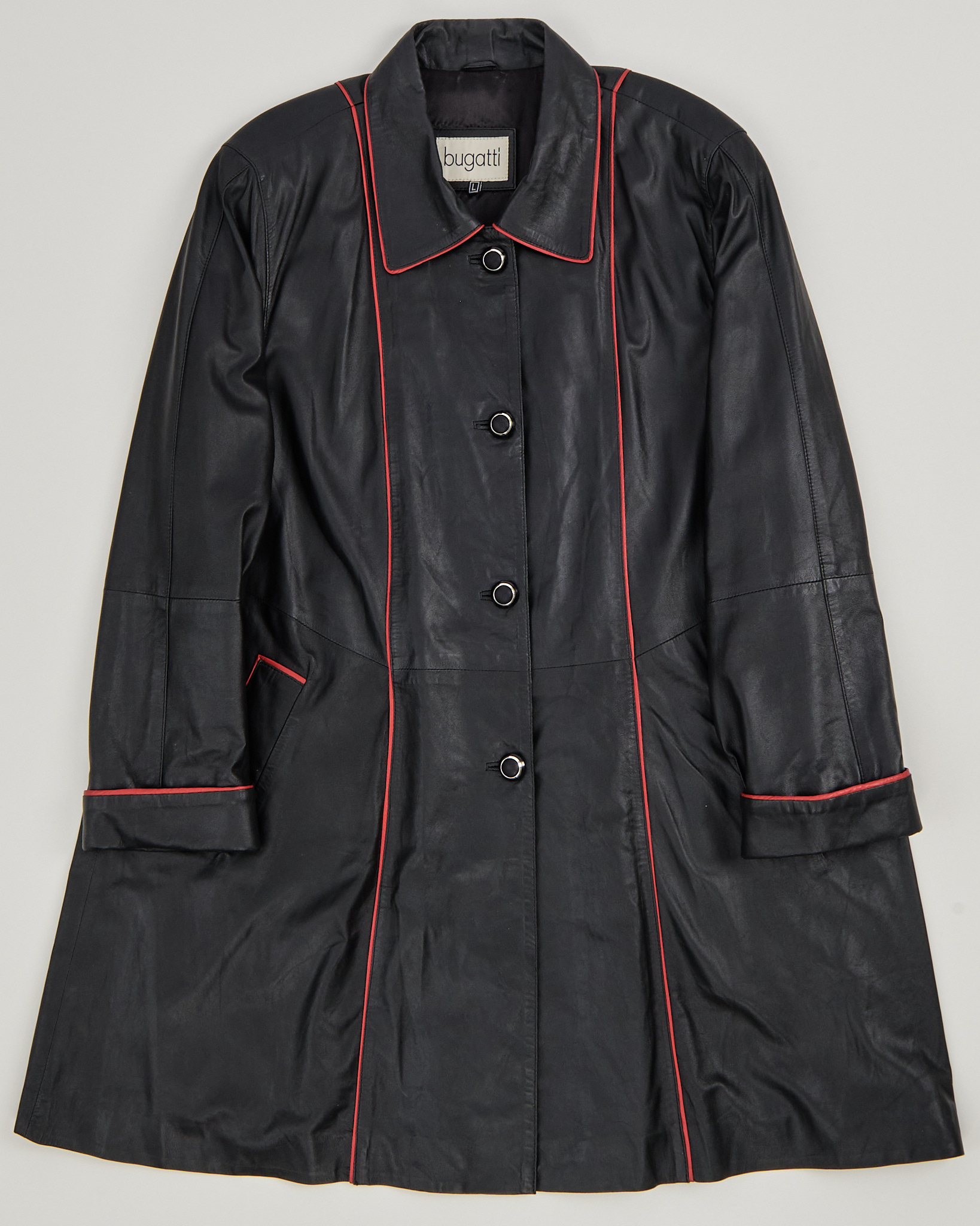 Плащ из 100% натуральной кожи Bugatti. Прямой крой, свободная посадка. Контрастная красна окантовка, посадку рукавов можно регулировать. Аккуратный воротник, функциональные карманы по бокам.