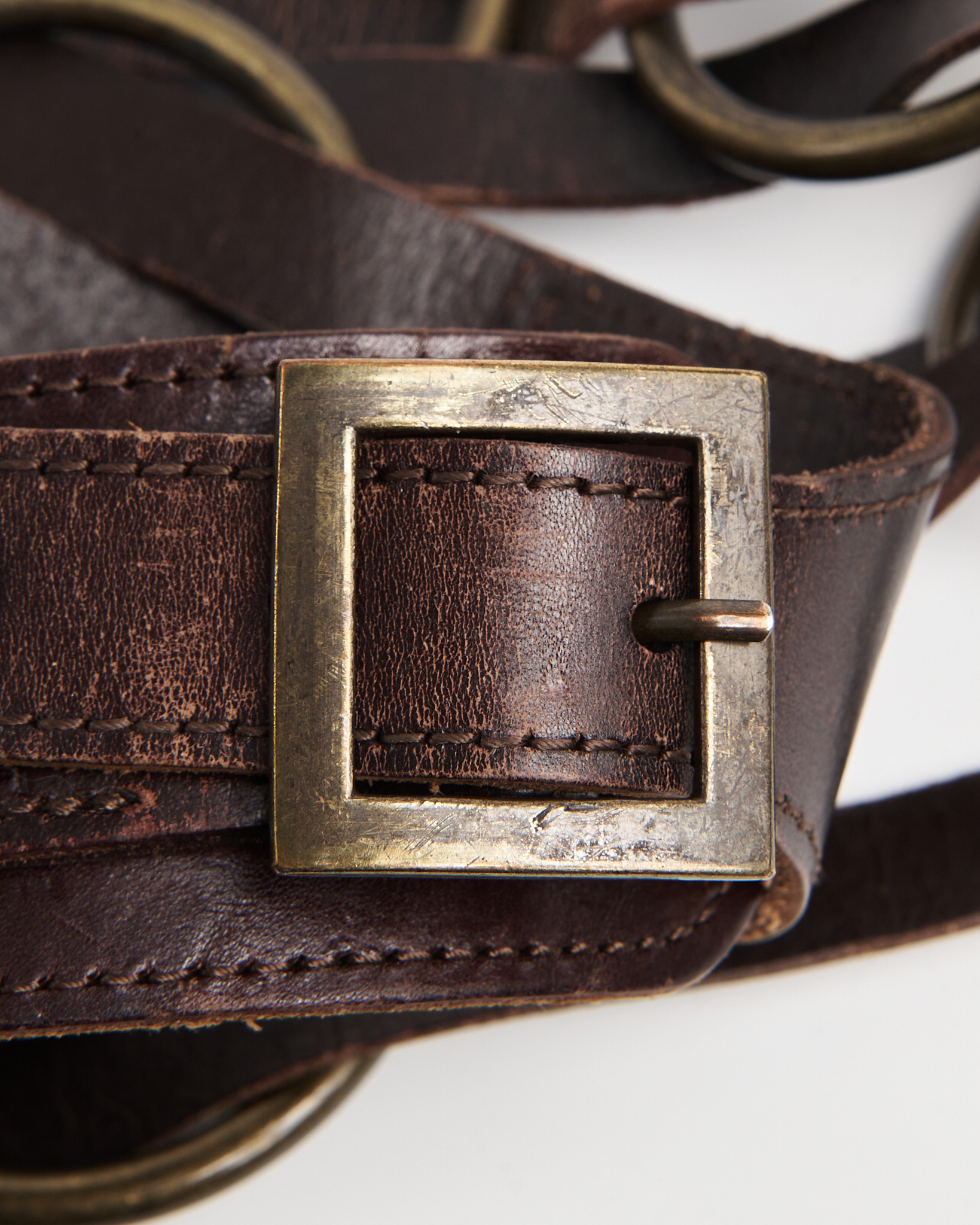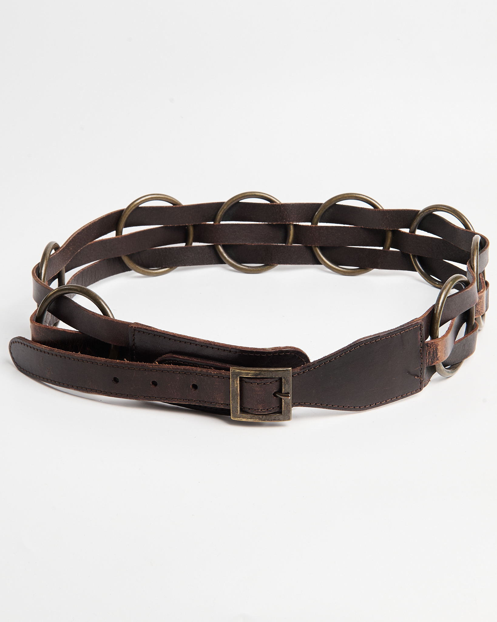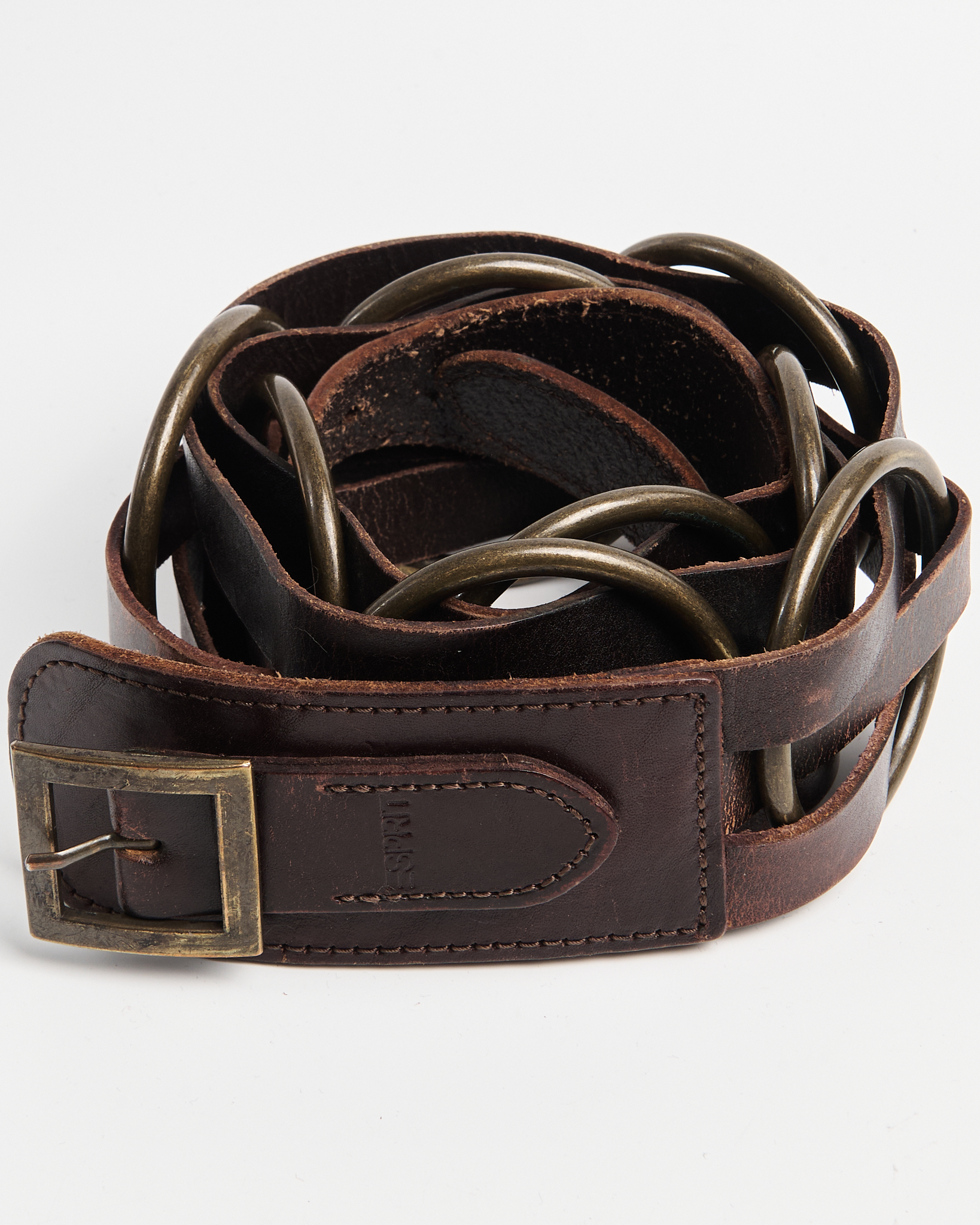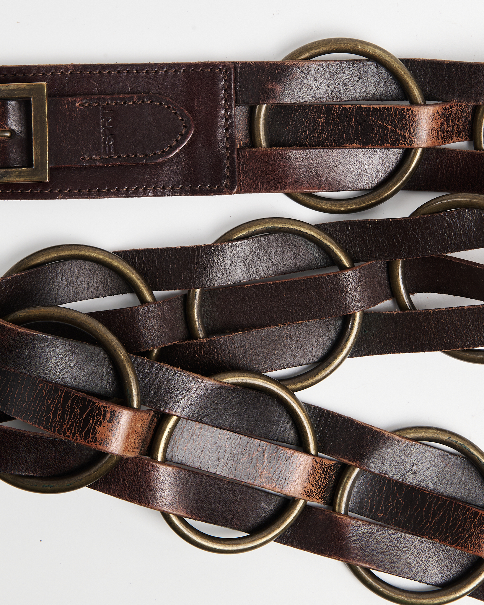 Ремень ESPRIT с металлическими кольцами. Ремень из плотной натуральной кожи глубокого коричневого оттенка. Посадка регулируется пряжкой, ремень хорошо фиксируется, следы естественной патины на коже и фурнитуре.