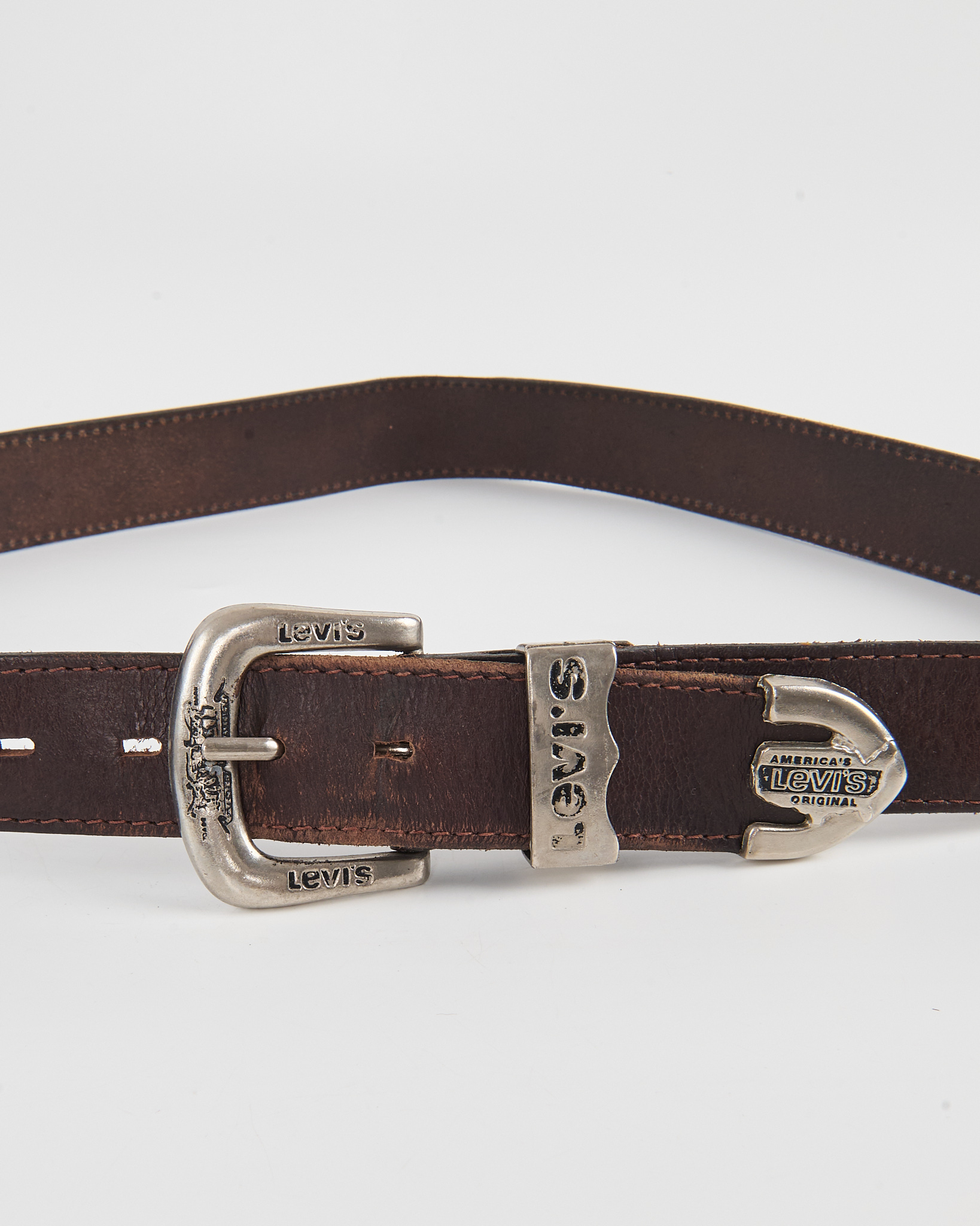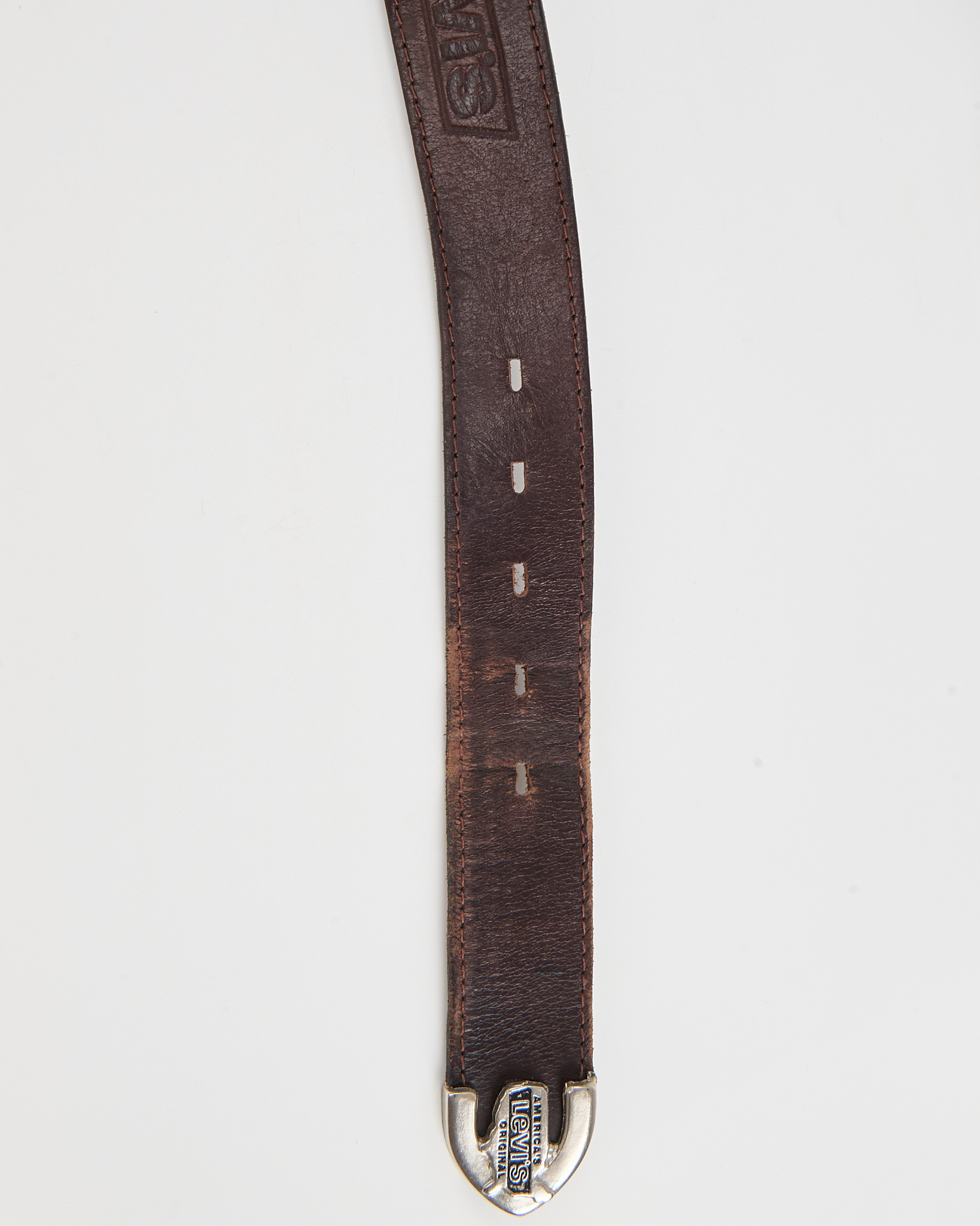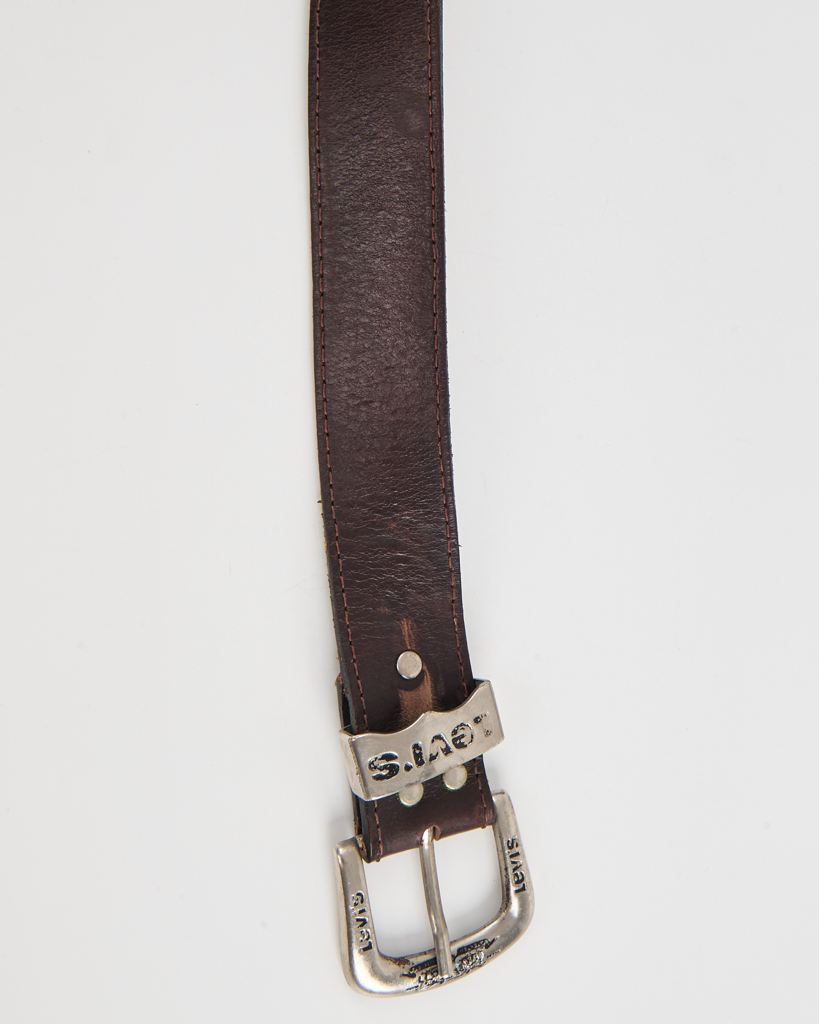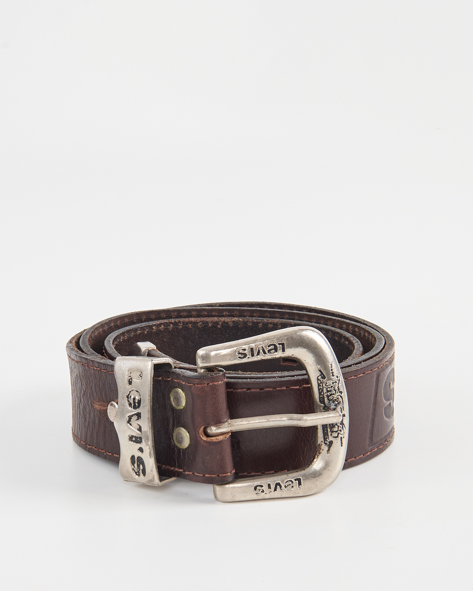 Кожаный ремень Levi’s с тиснёным логотипом. Ремень из плотной натуральной кожи тёмно-коричневого оттенка. Металлическая пряжка с фирменной гравировкой, тиснёный логотип.