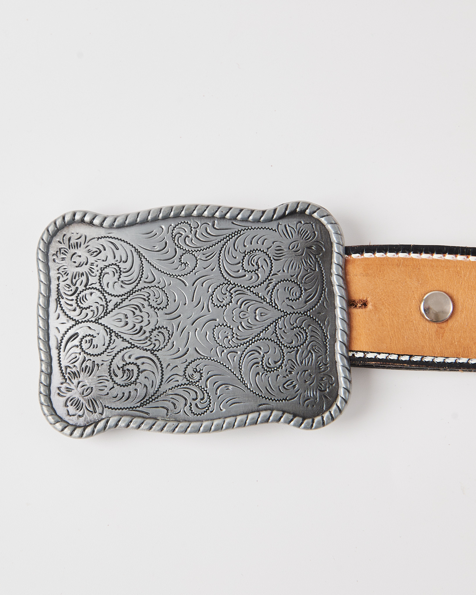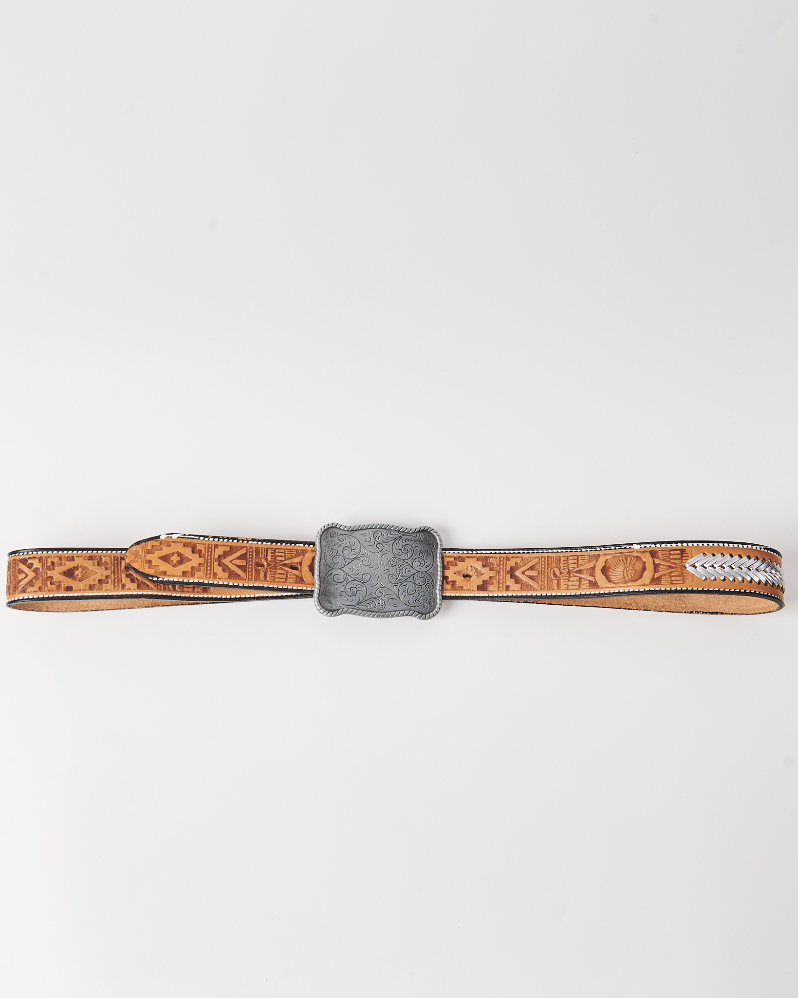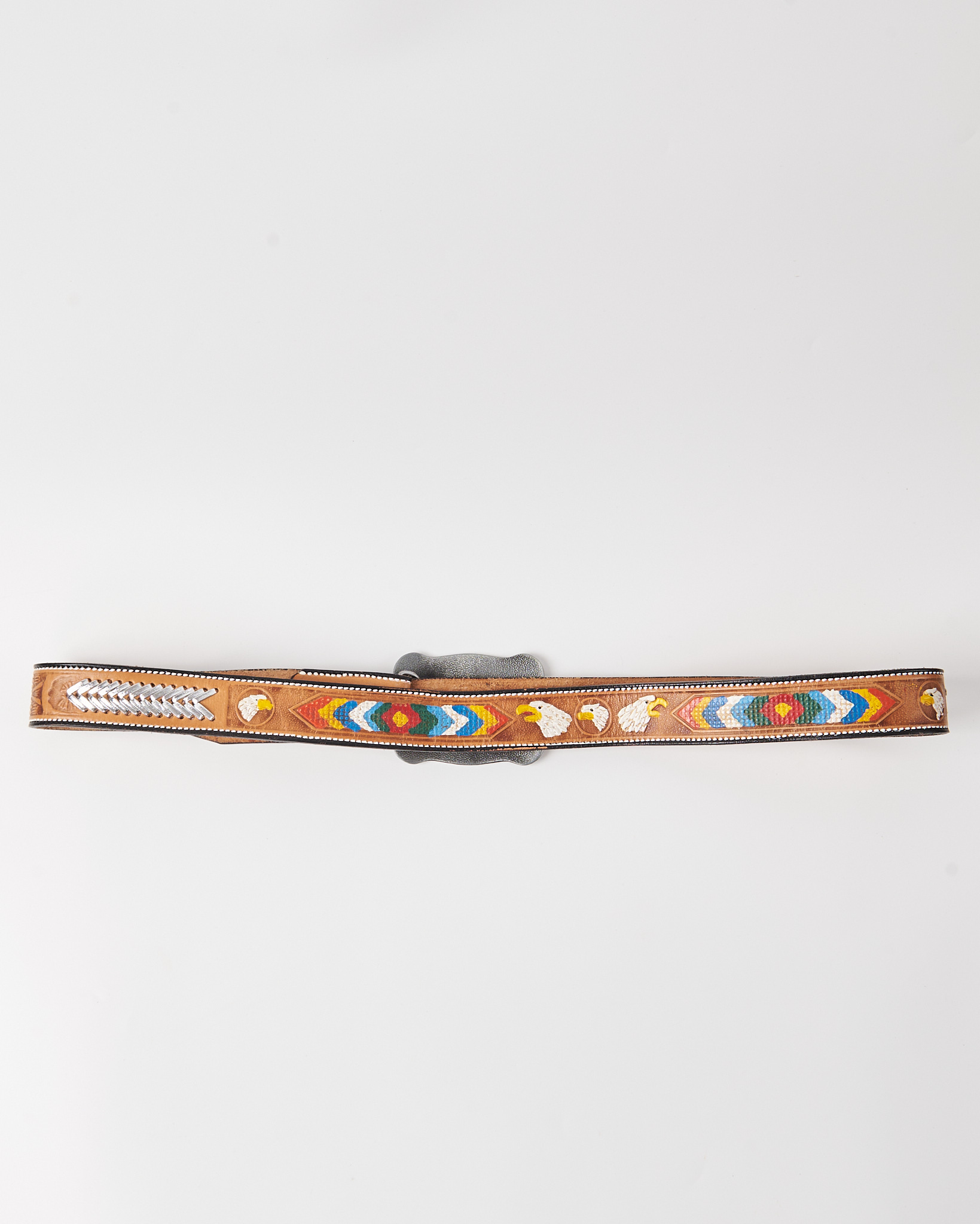 Ремень из плотной натуральной кожи. Посадка регулируется. Крупная металлическая пряжка с детальной гравировкой, орнамент и цветные вставки по всей длине.