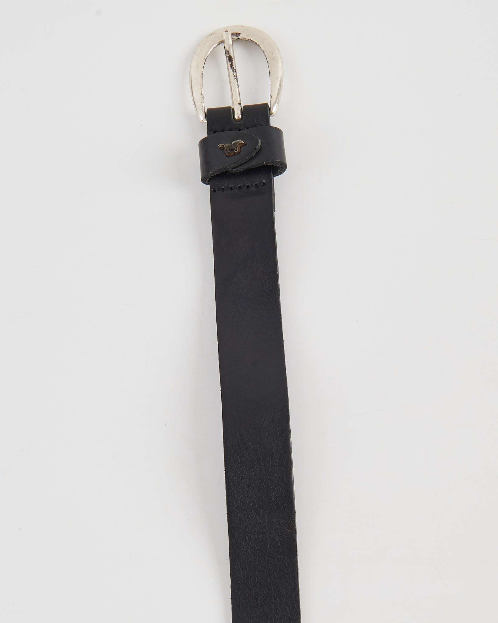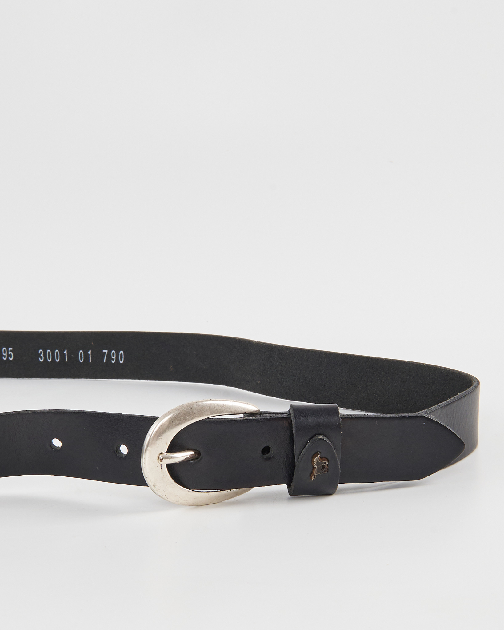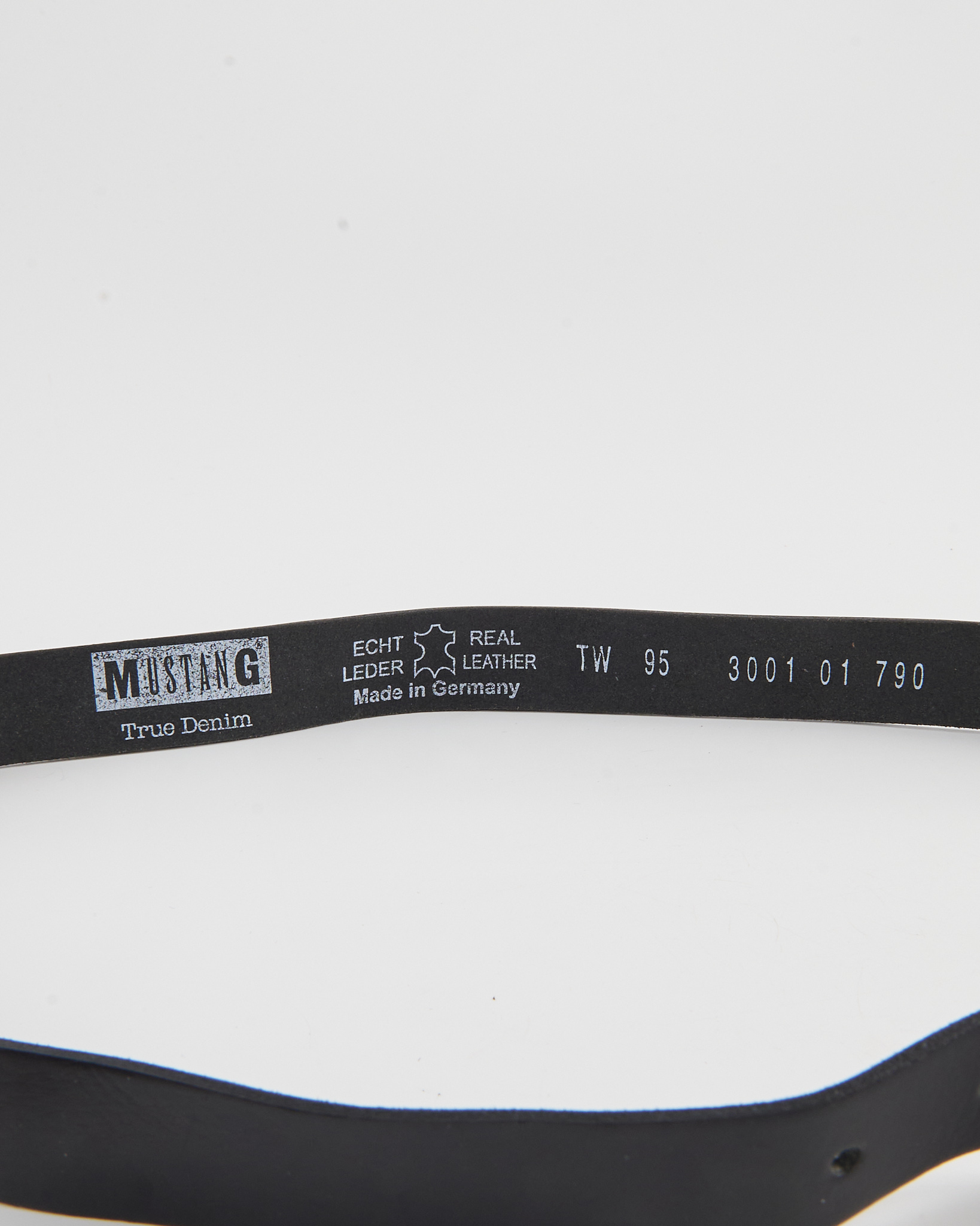 Кожаный ремень Mustang из плотной натуральной кожи чёрного цвета. Ремень уверенно фиксируется на талии благодаря прочной металлической пряжке с округлой формой. Маркировка Mustang и отметка Real Leather.