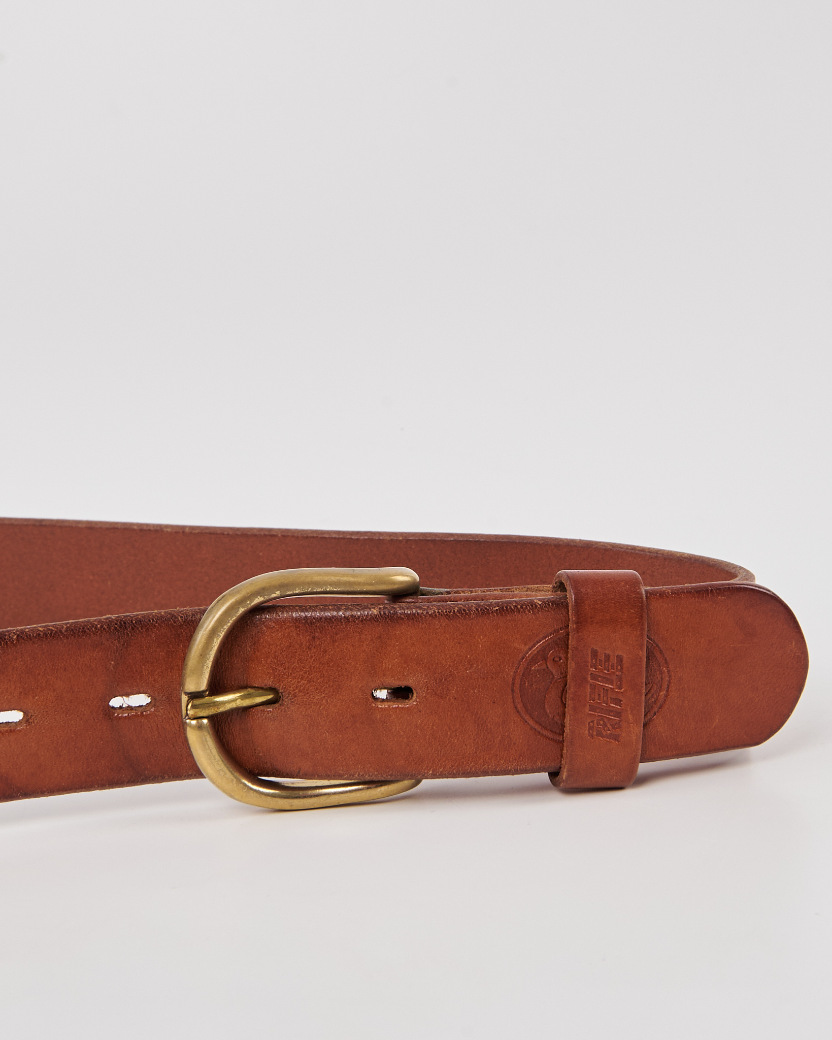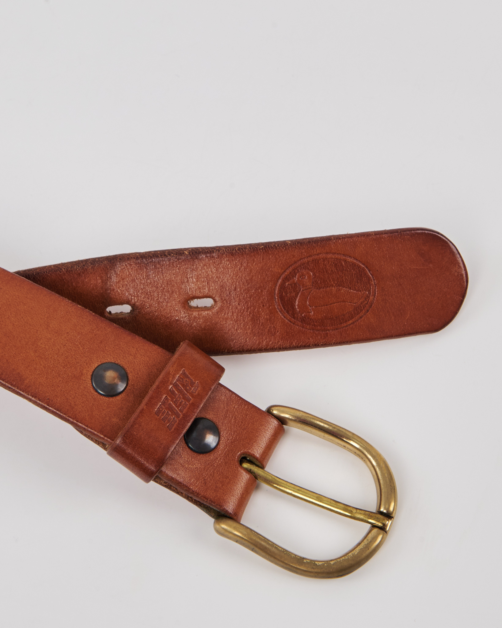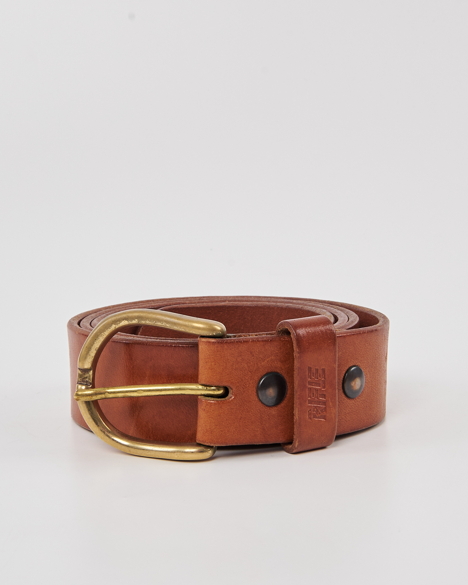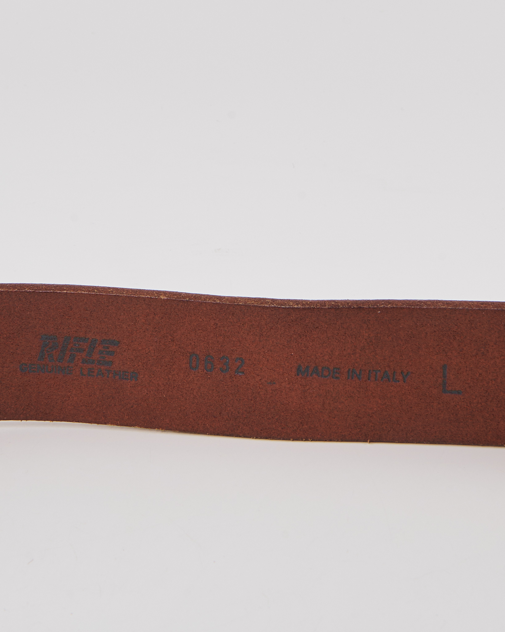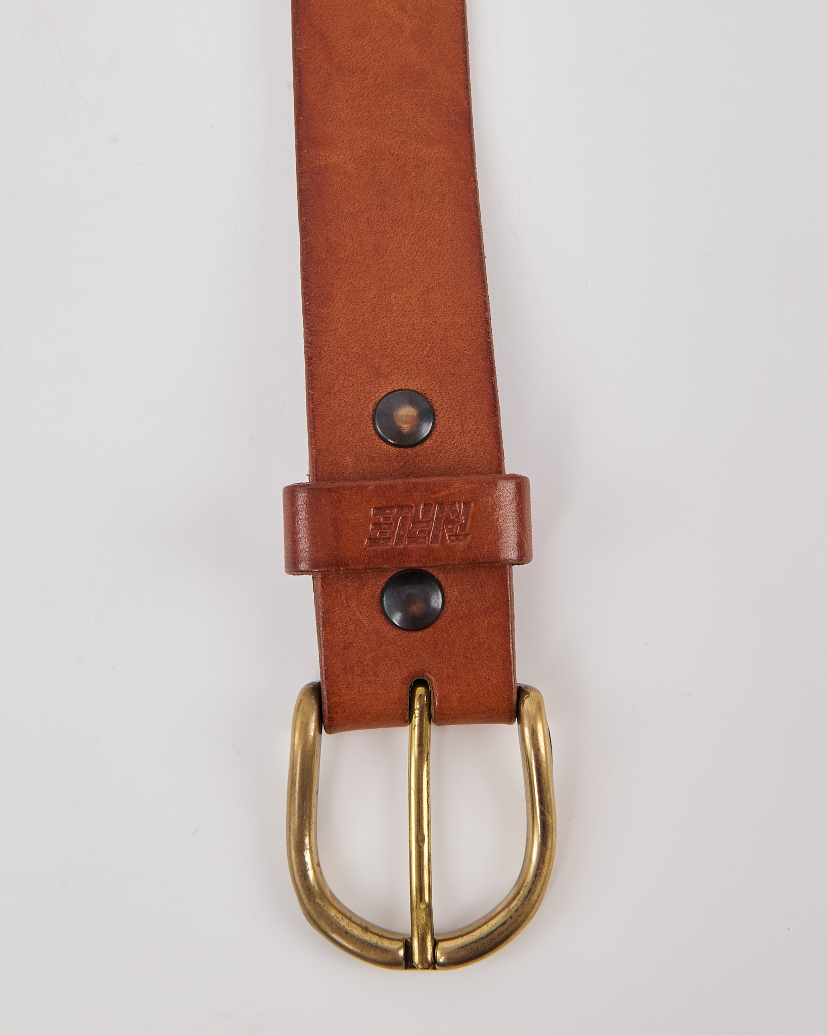 Ремень из плотной натуральной кожи тёплого коньячного оттенка с массивной металлической пряжкой. Латунная фурнитура и заклёпки, тиснёный логотип и маркировка Made in Italy.