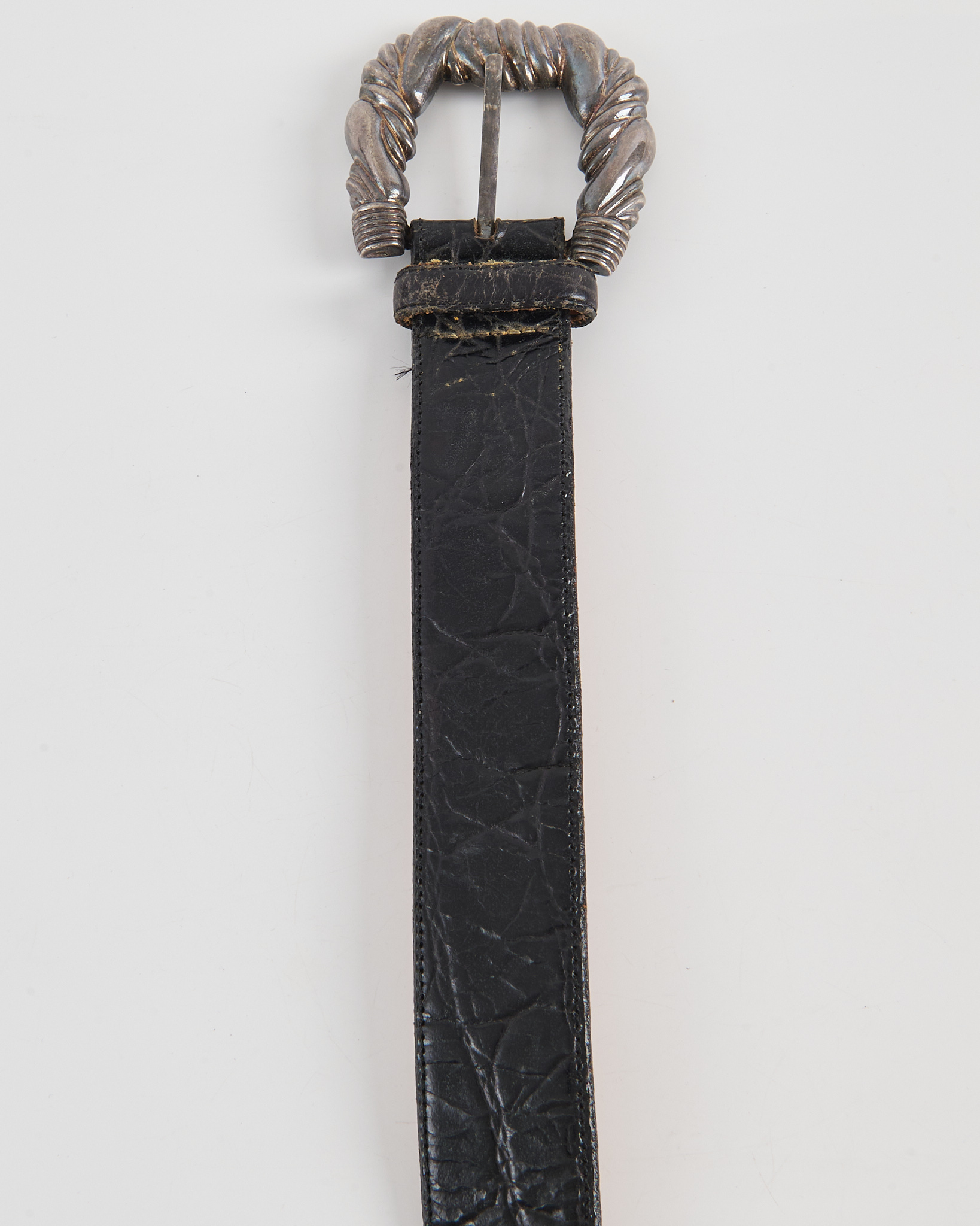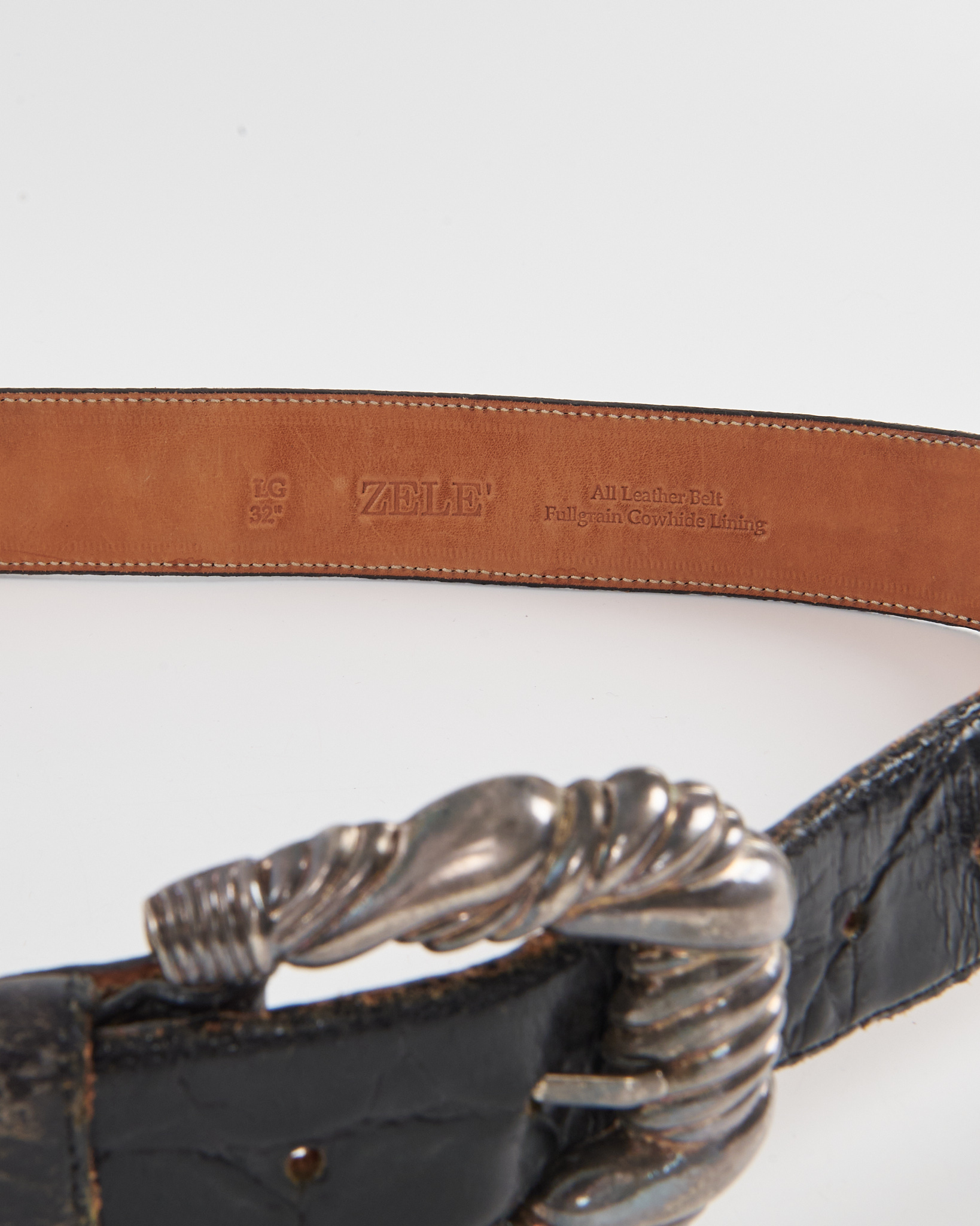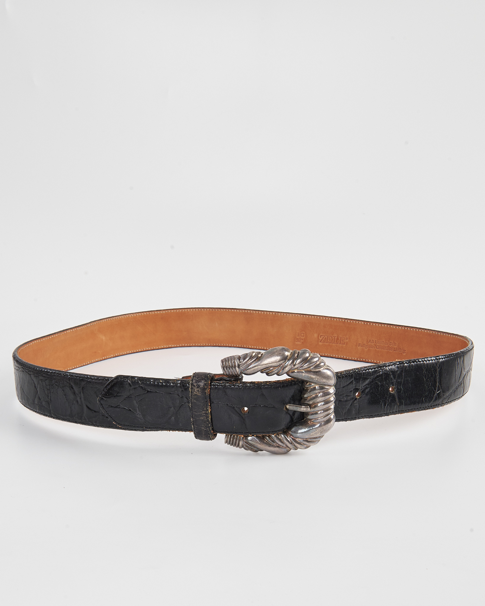 Ремень Zele из натуральной кожи чёрного цвета. Плотная кожа с выраженной фактурой, уверенная фиксация на талии. Главный акцент — массивная металлическая пряжка со скульптурной формой и витым рельефом.