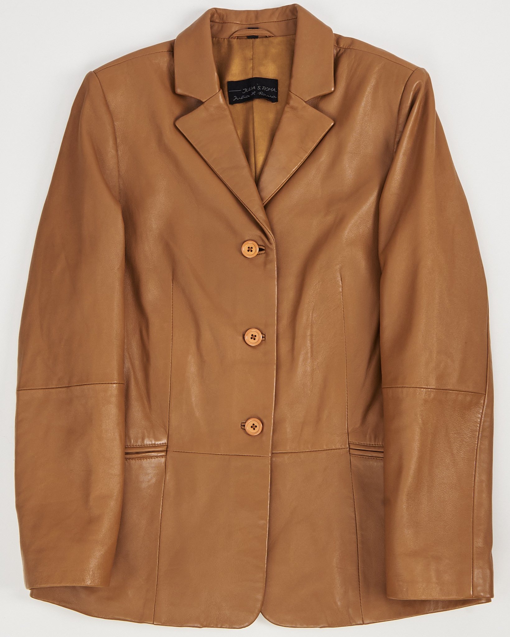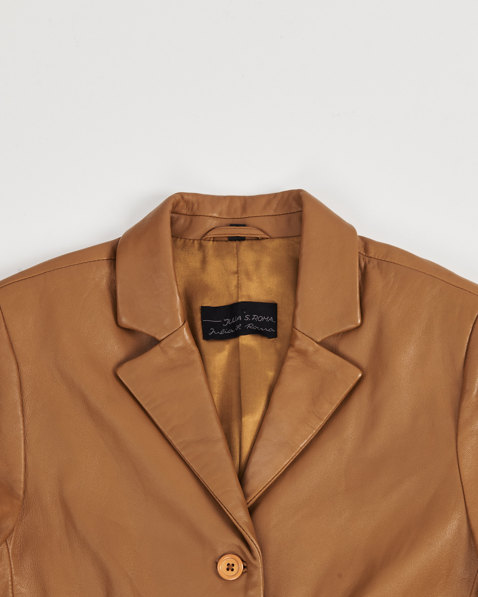 Винтажный жакет из 100% натуральной кожи Julia S. Roma. Приталенная посадка, аккуратные швы и минималистичная фурнитура. Модель выделяется редким оттенком кожи и качеством итальянского исполнения.