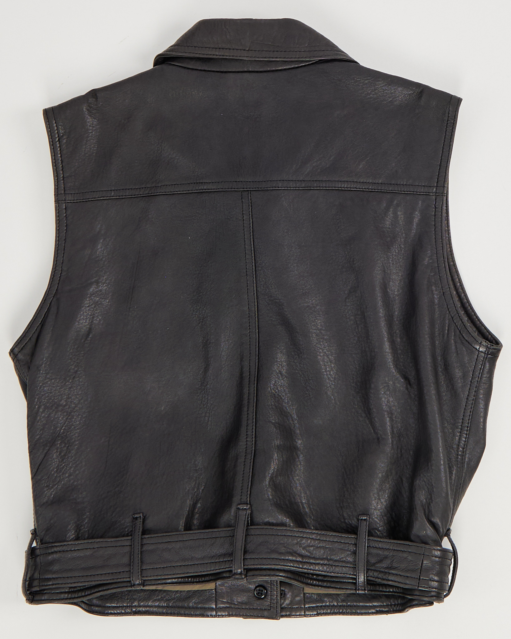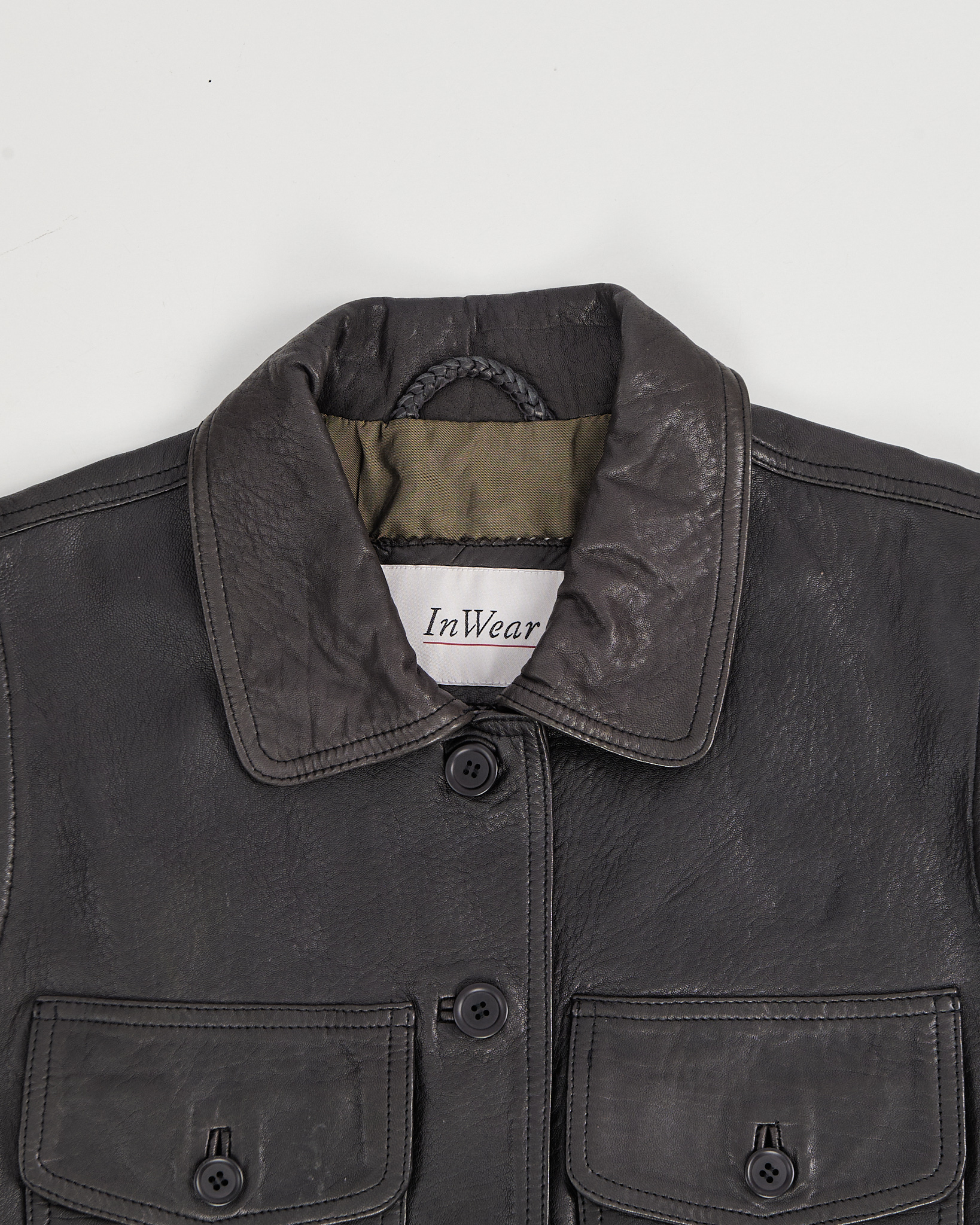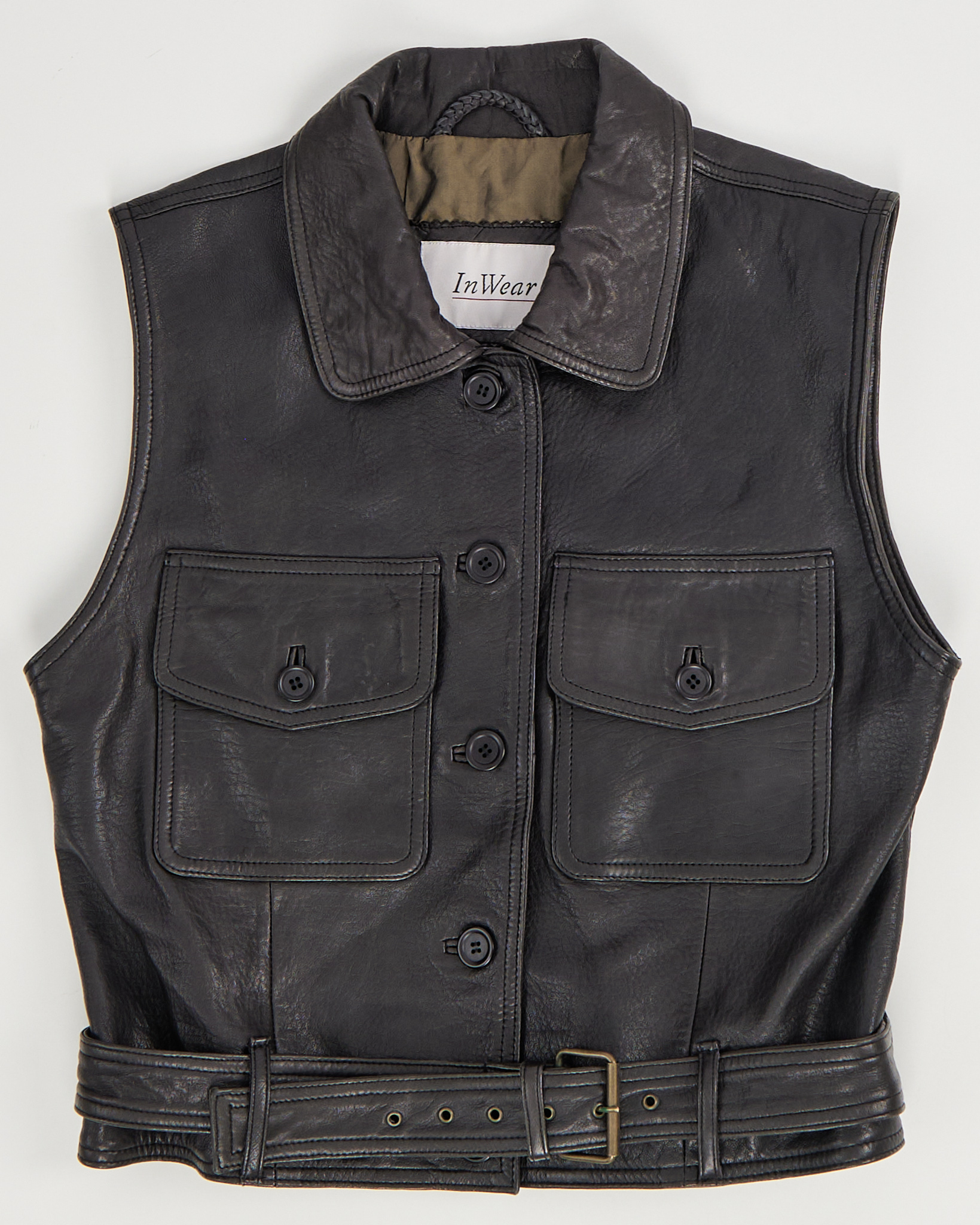 Жилет InWear из натуральной кожи глубокого тёмного оттенка. Прямой крой, модель дополнена крупными накладными карманами, пуговицами и ремнём по нижнему краю.