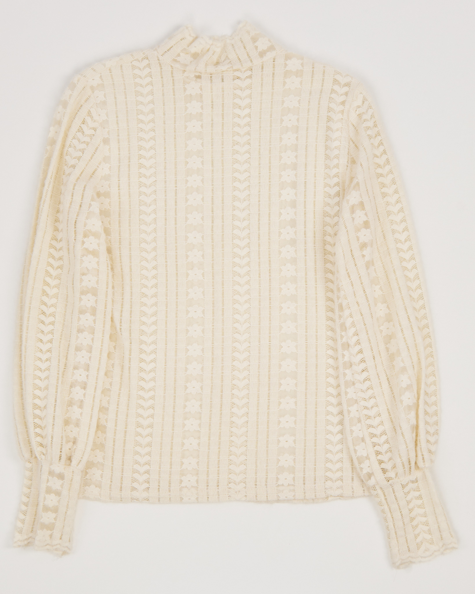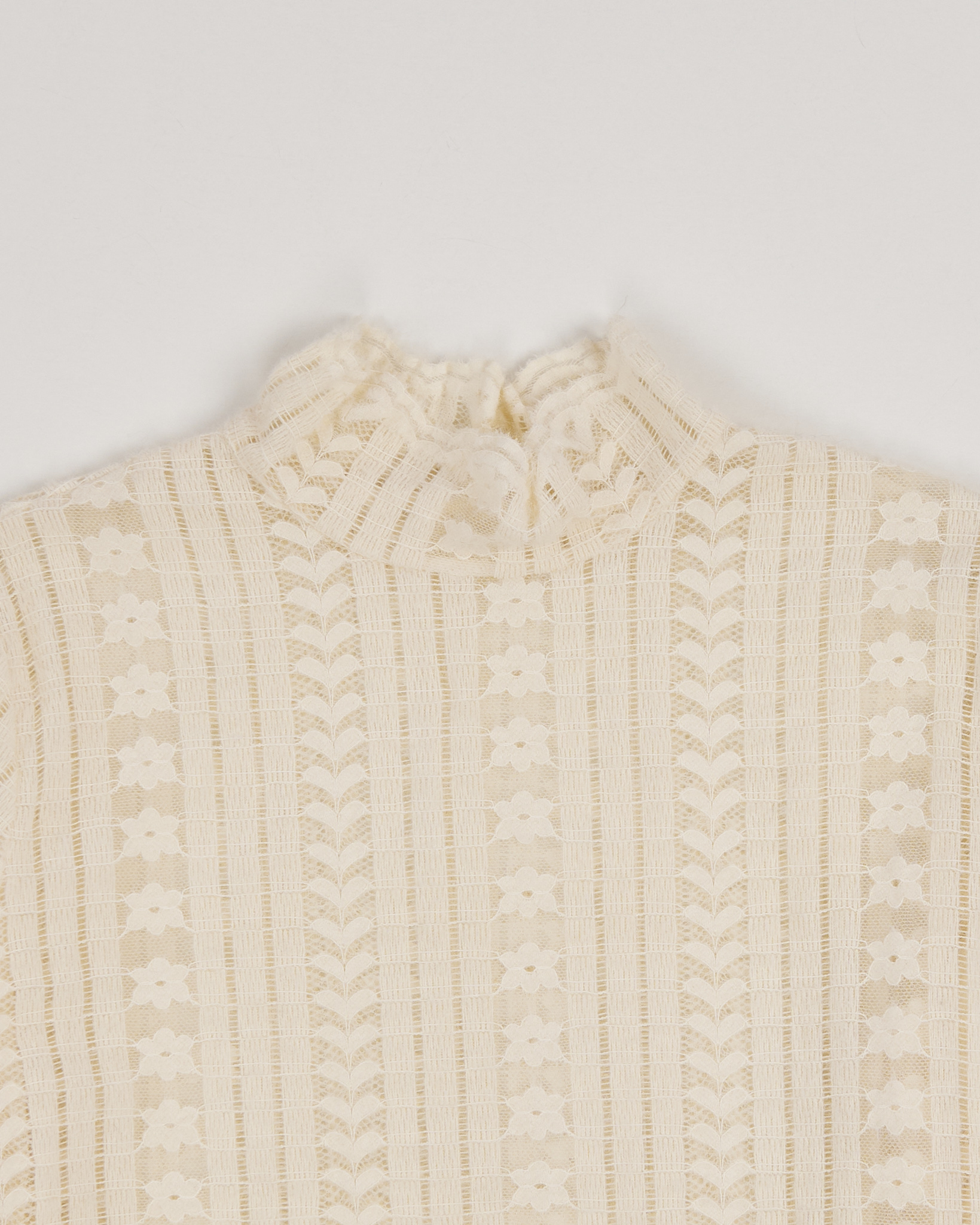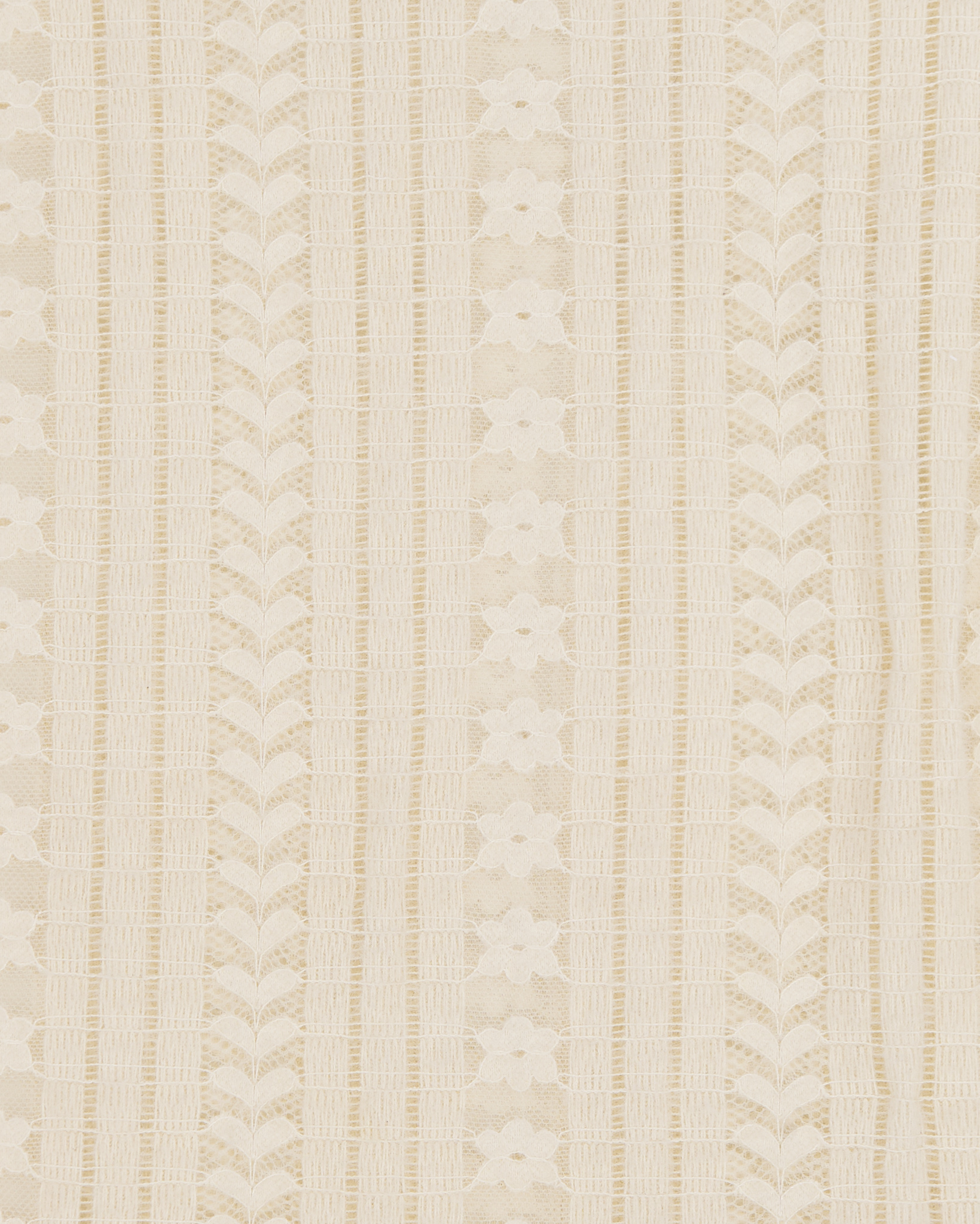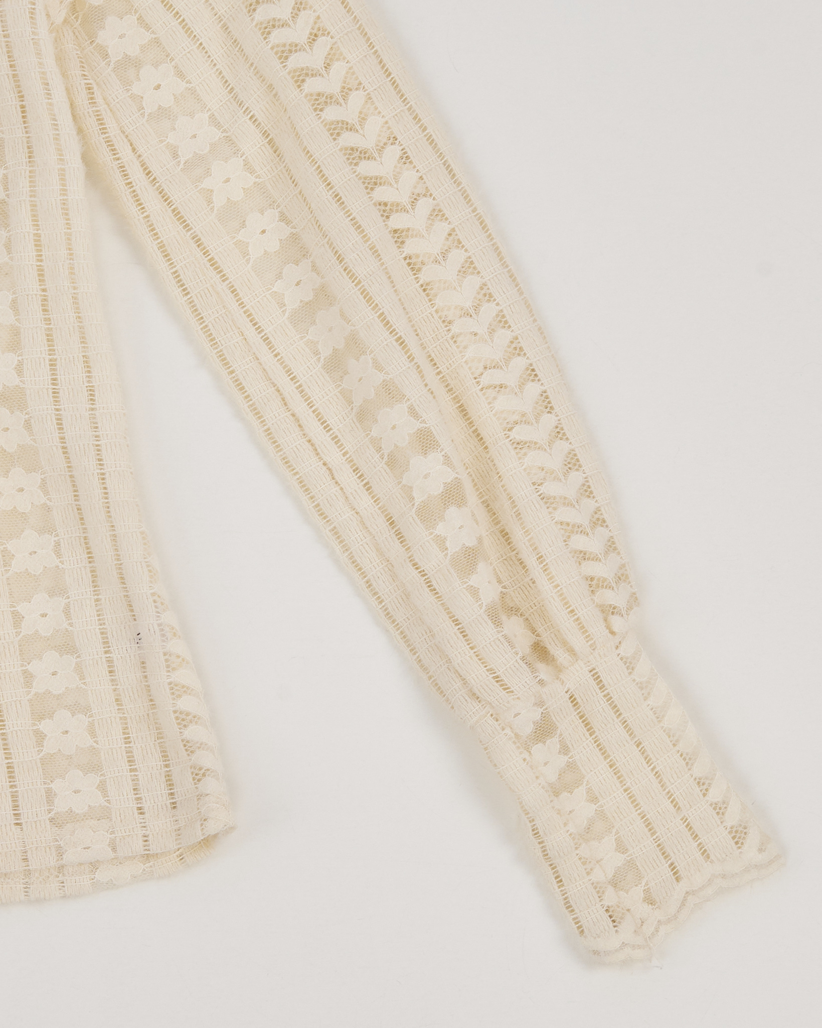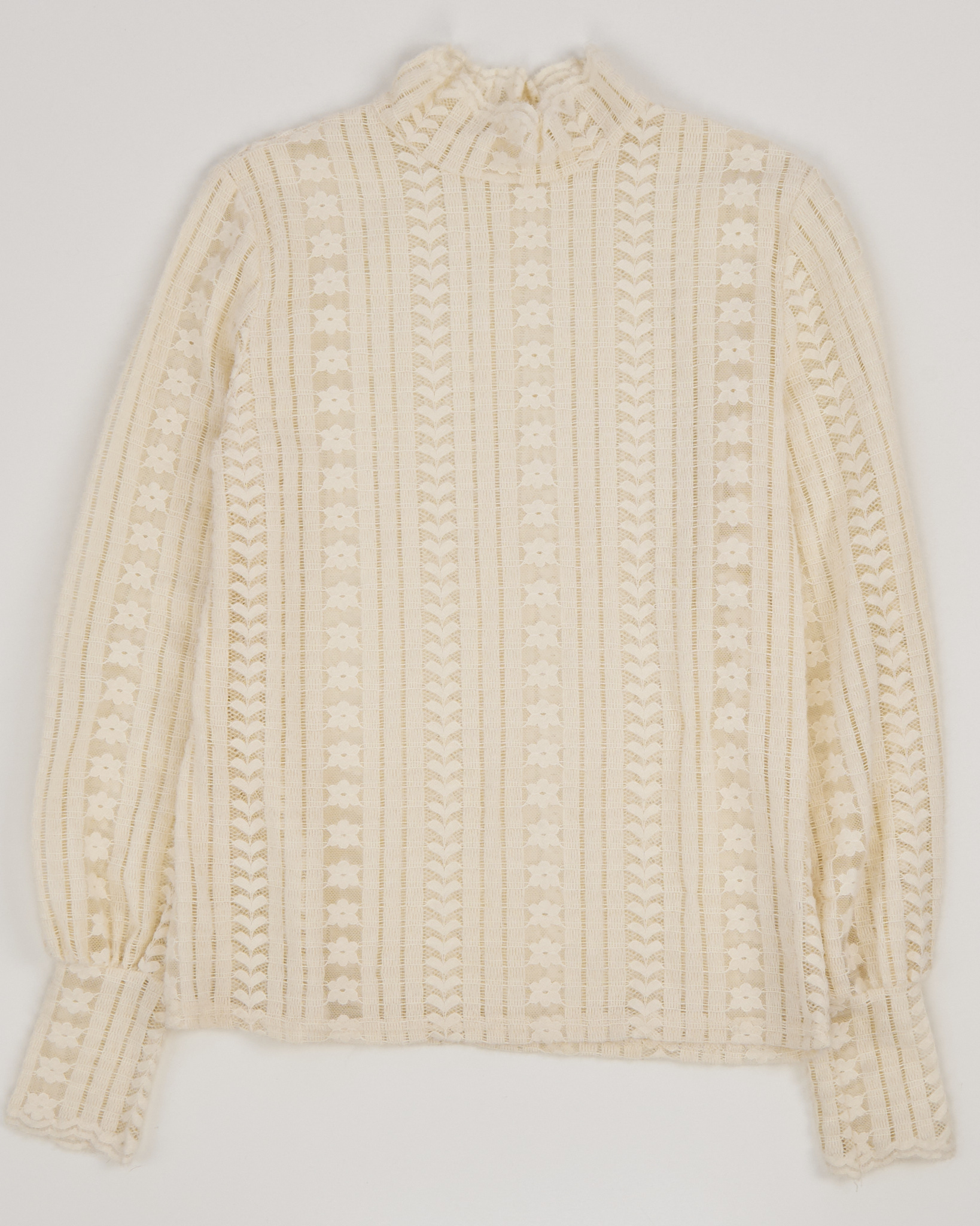Нежный джемпер выполнен из ажурного текстиля светло-кремового оттенка. Вертикальный орнамент с цветочными мотивами
