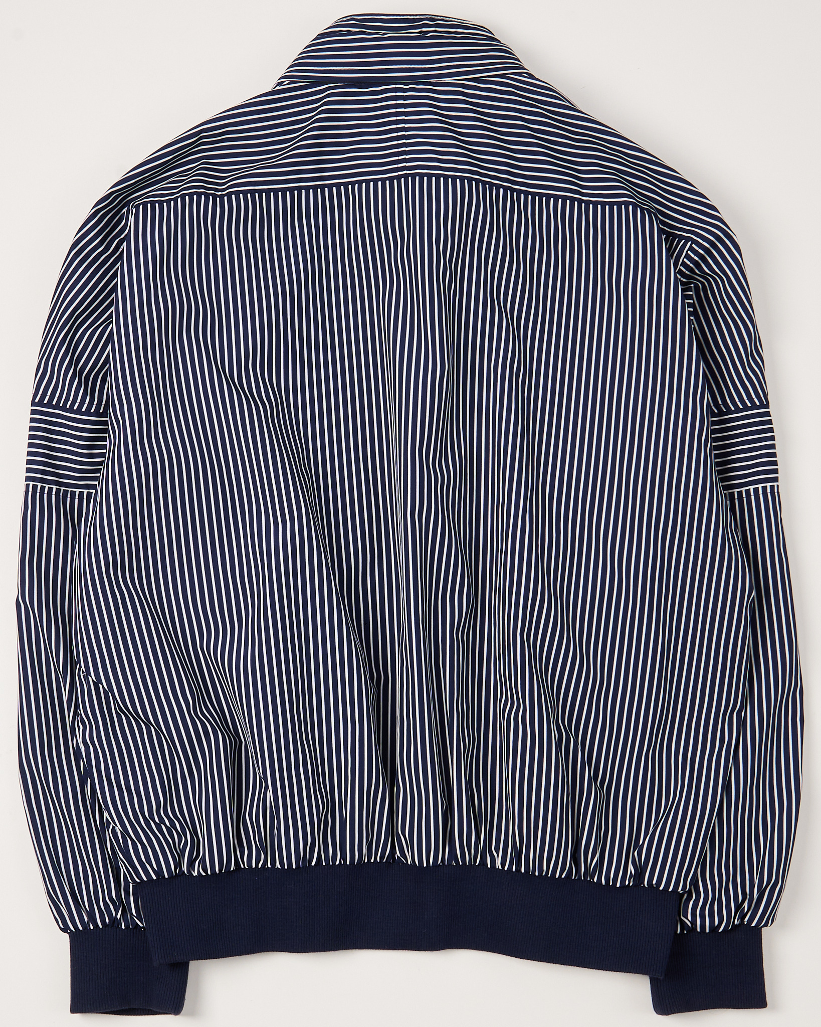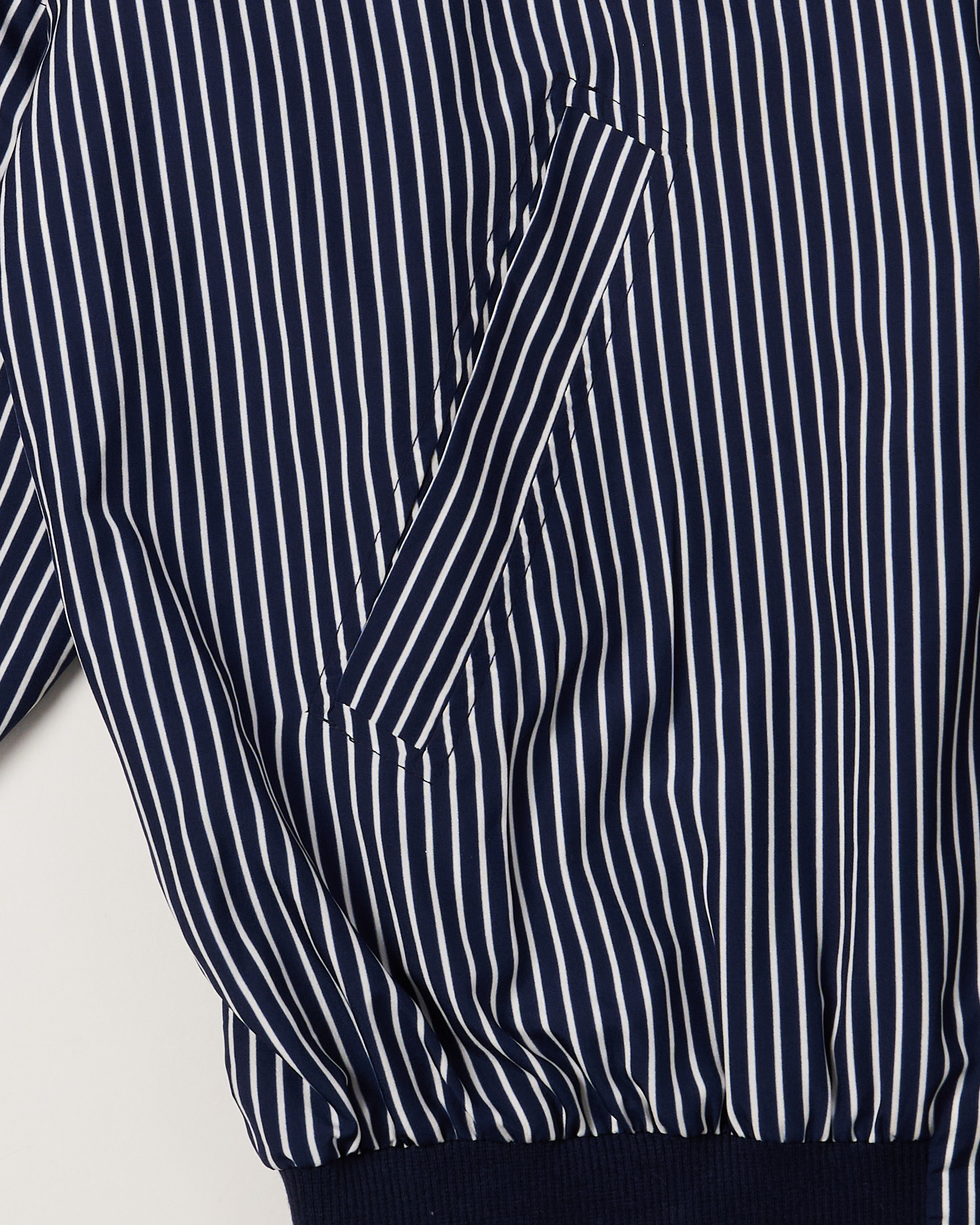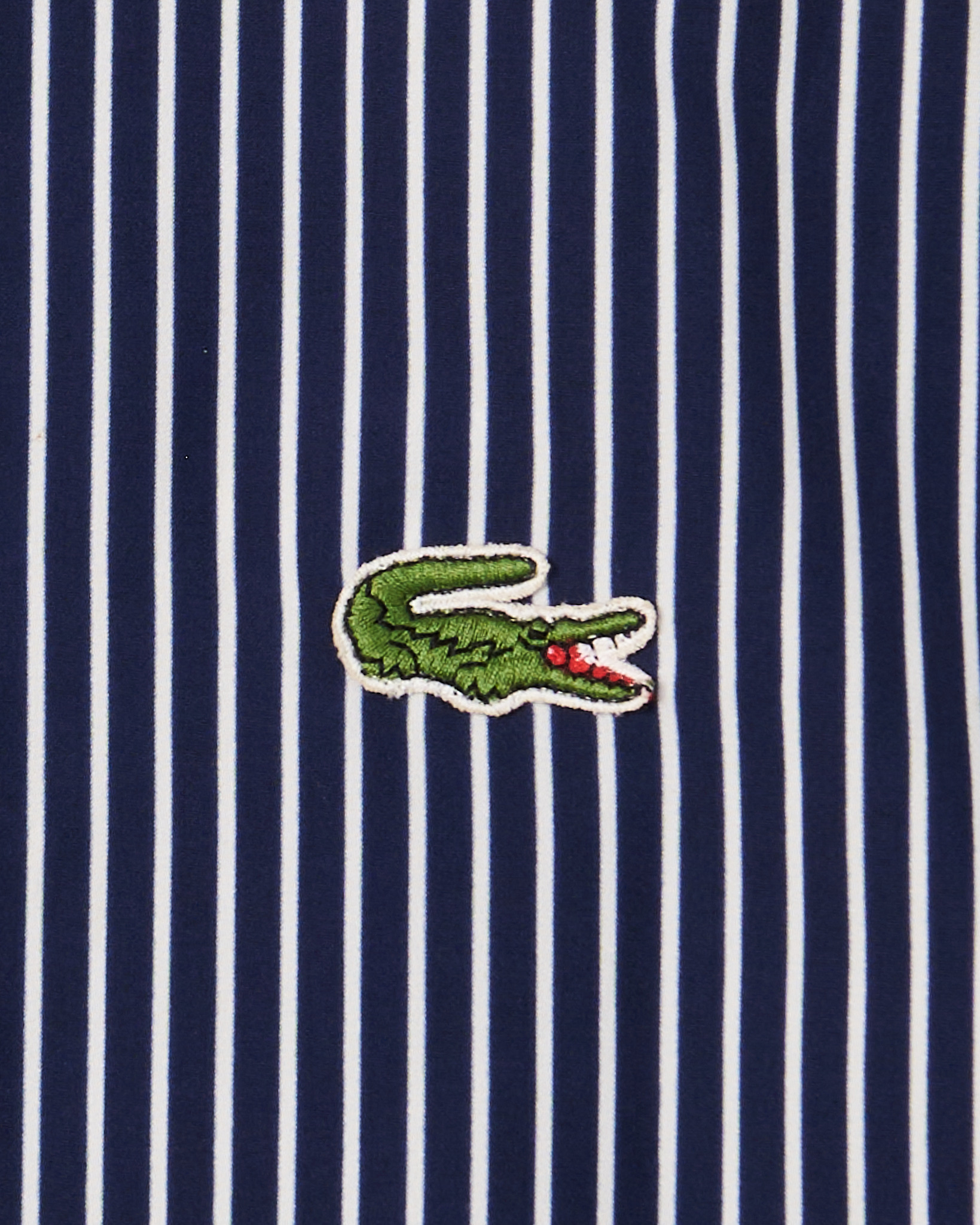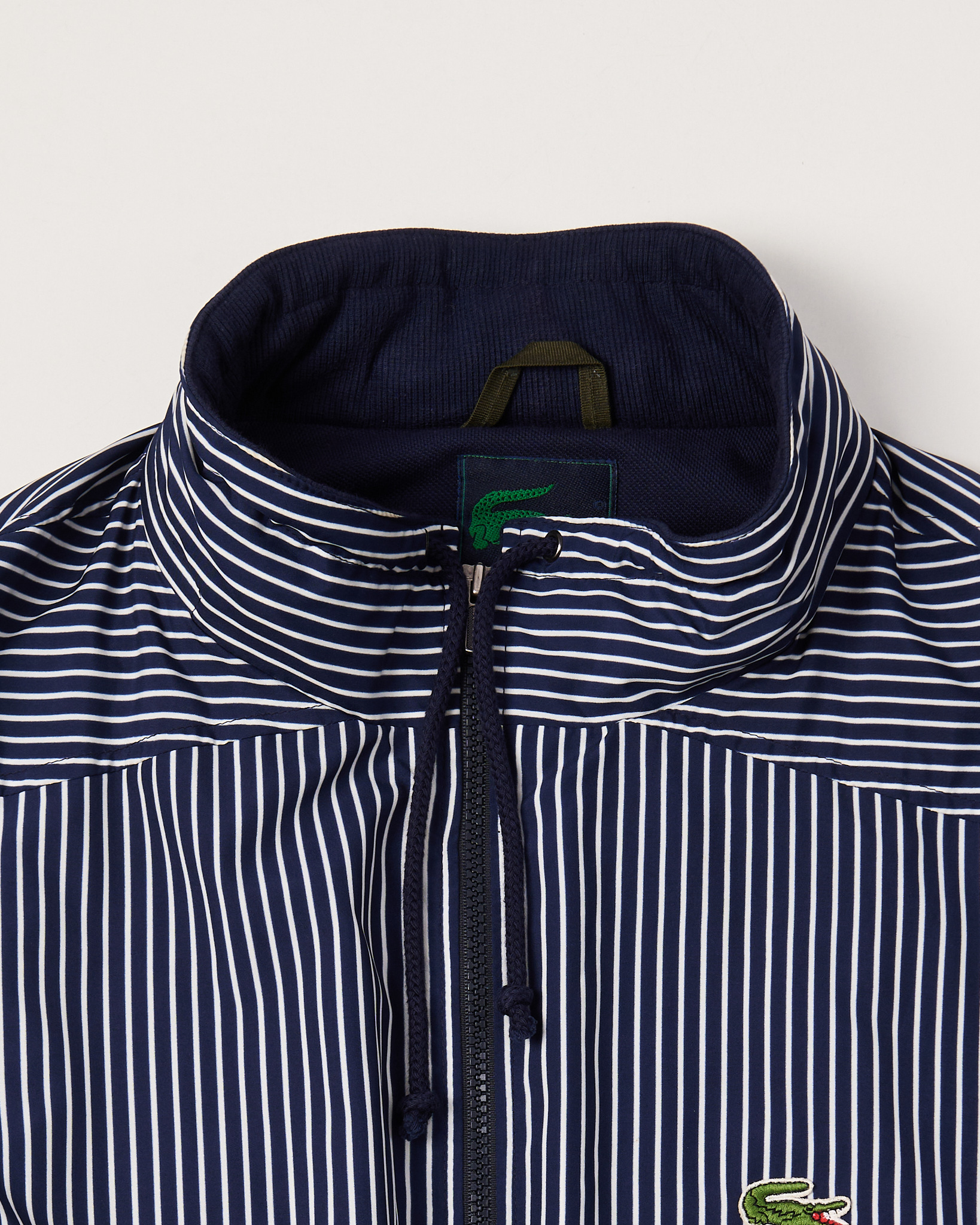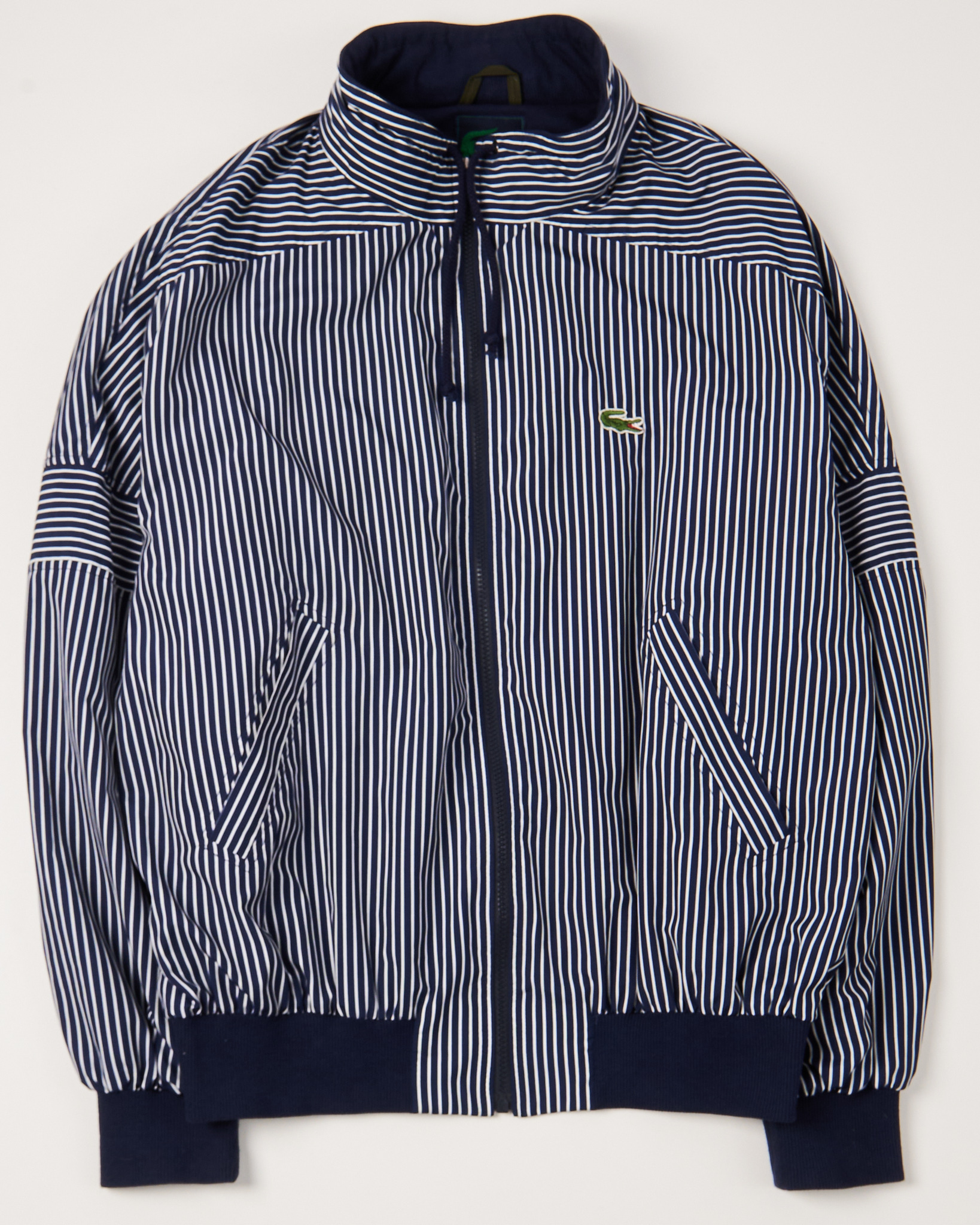 Куртка Lacoste из лёгкой ткани в тёмно-cинюю полоску. Материал гладкий и приятный на ощупь, воротник на кулиске, посадка свободная, низ и манжеты фиксирует плотная резинка. Вышитый логотип с крокодилом на груди, удобная застежка на молнию, функциональные карманы по бокам.