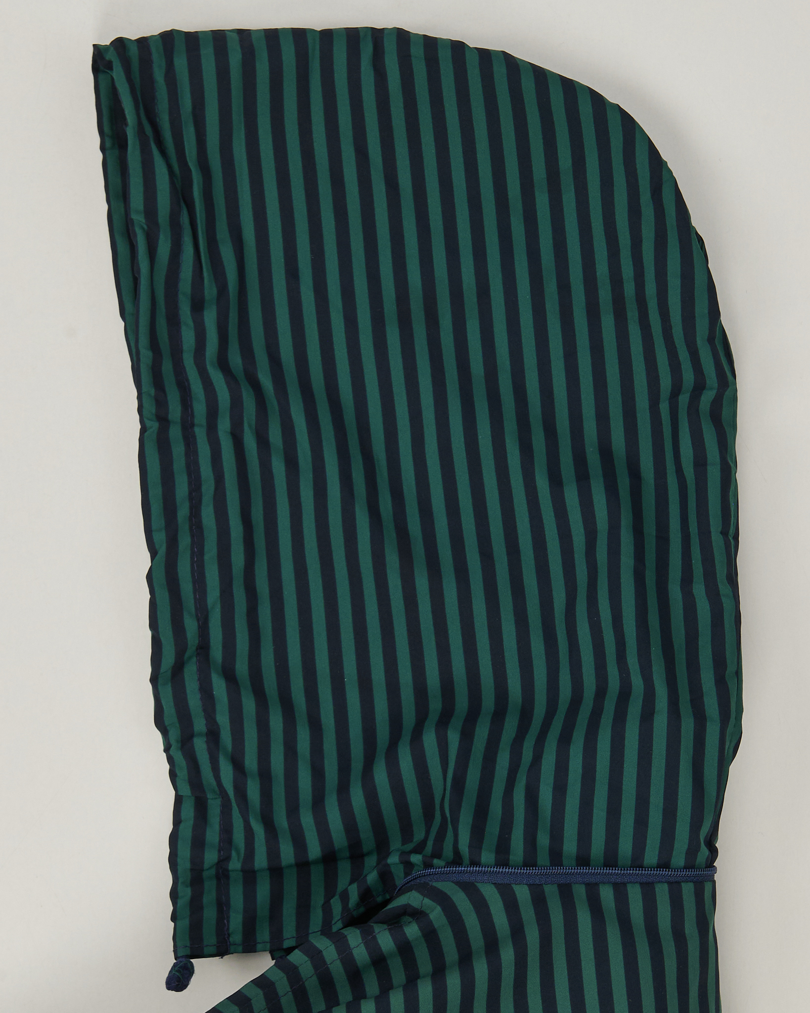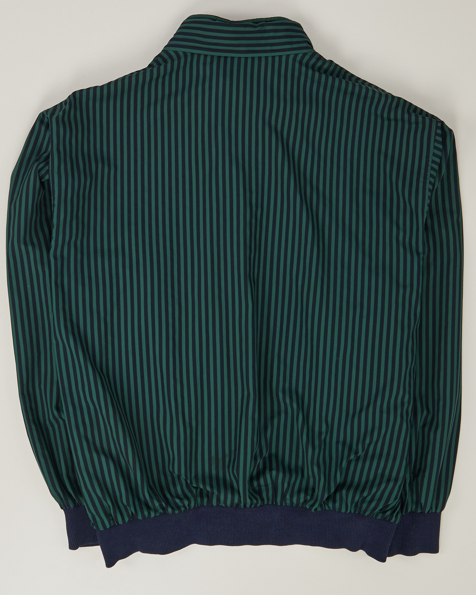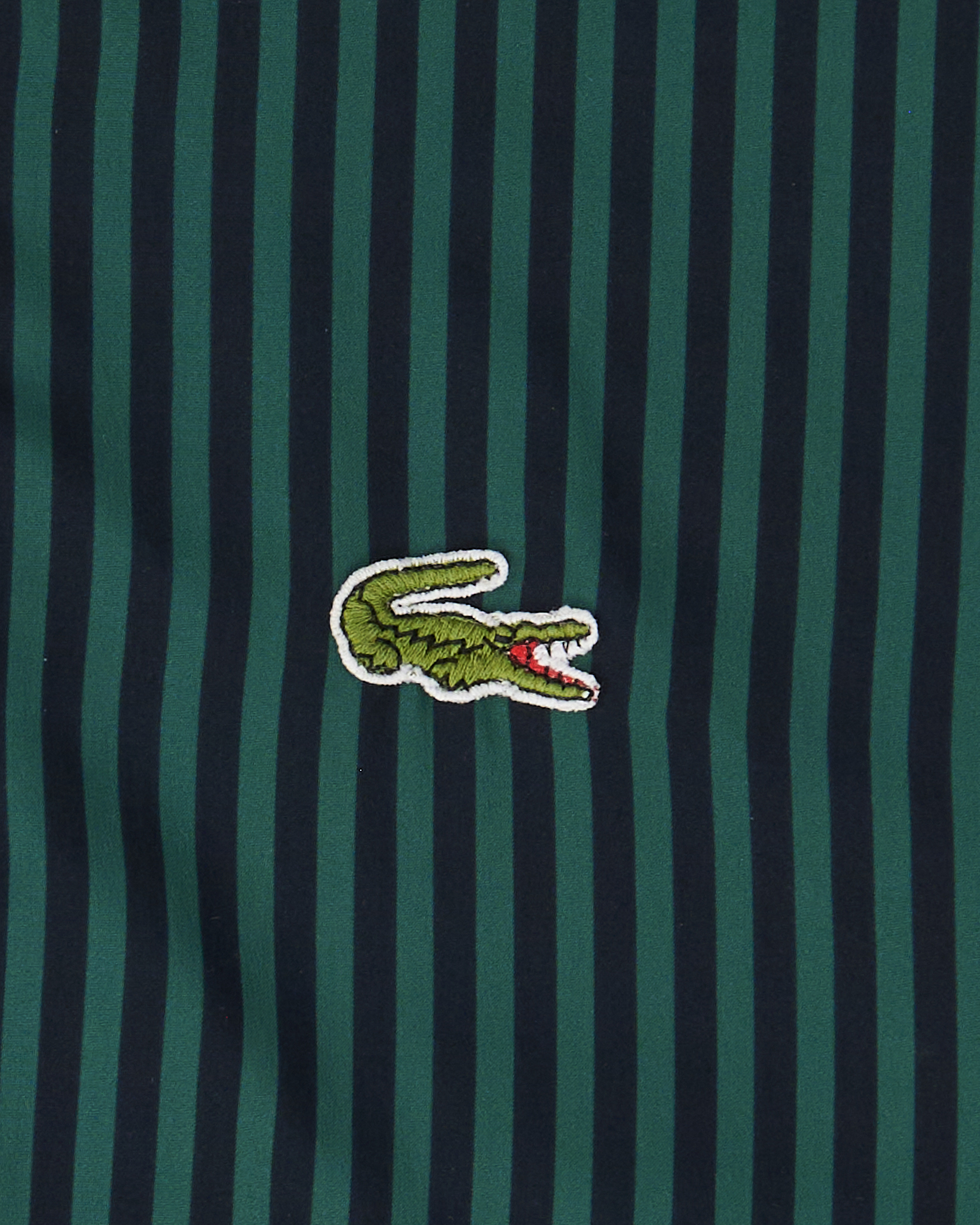 Куртка Lacoste из лёгкой ткани в тёмно-зелёную полоску. Материал гладкий и приятный на ощупь, посадка свободная, низ и манжеты фиксирует плотная резинка. Вышитый логотип с  крокодилом на груди, удобная застежка на молнию, функциональные карманы по бокам.