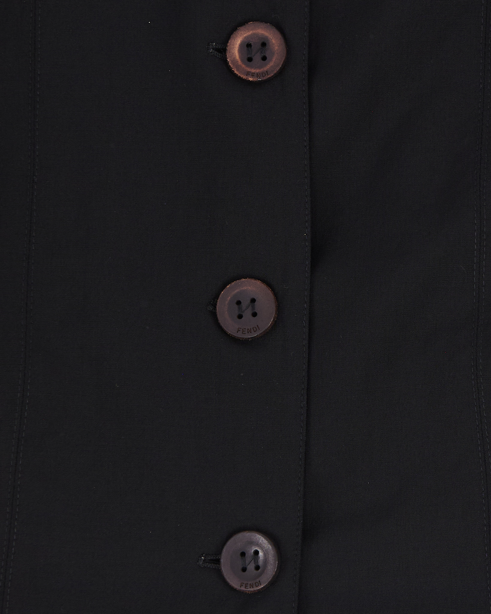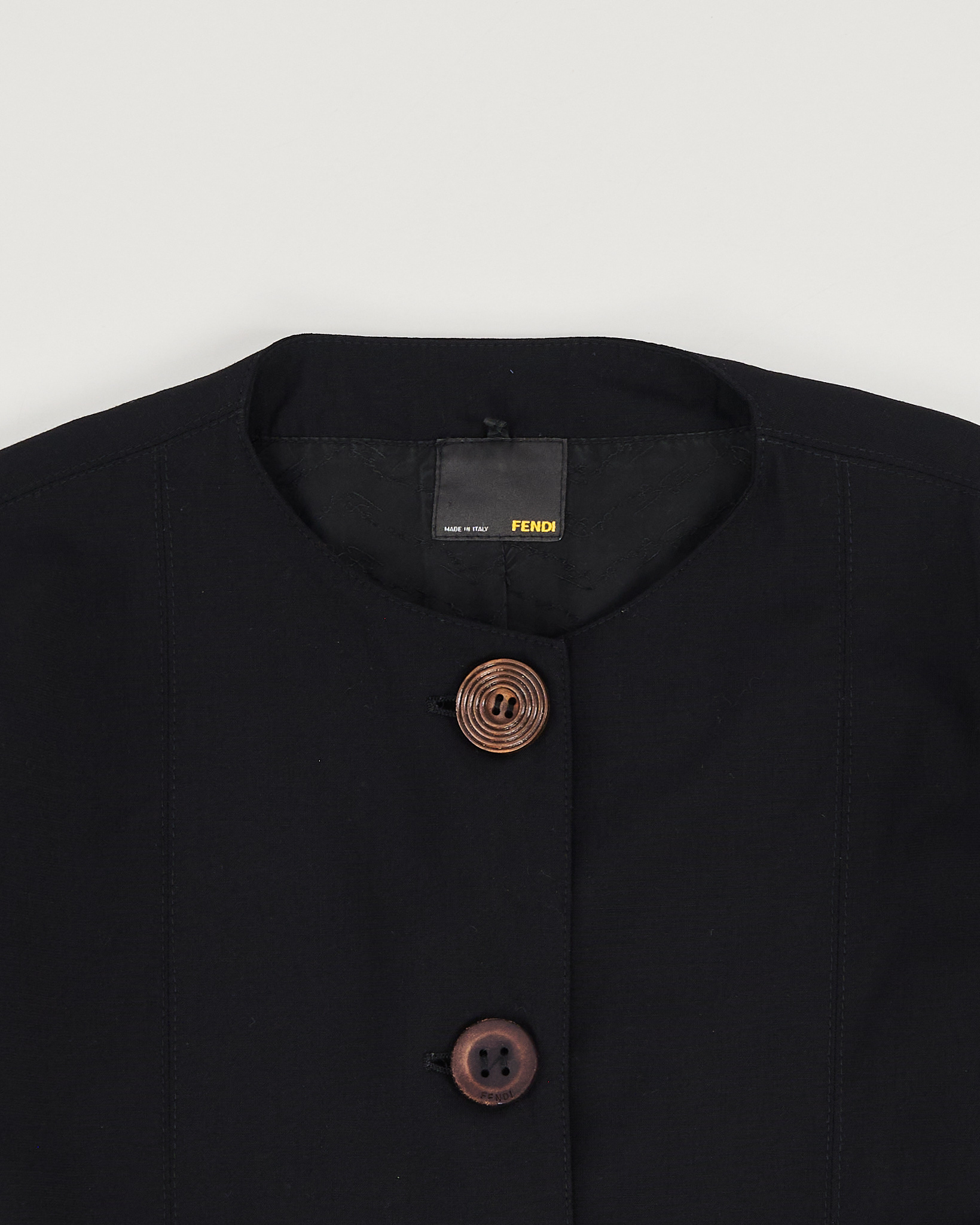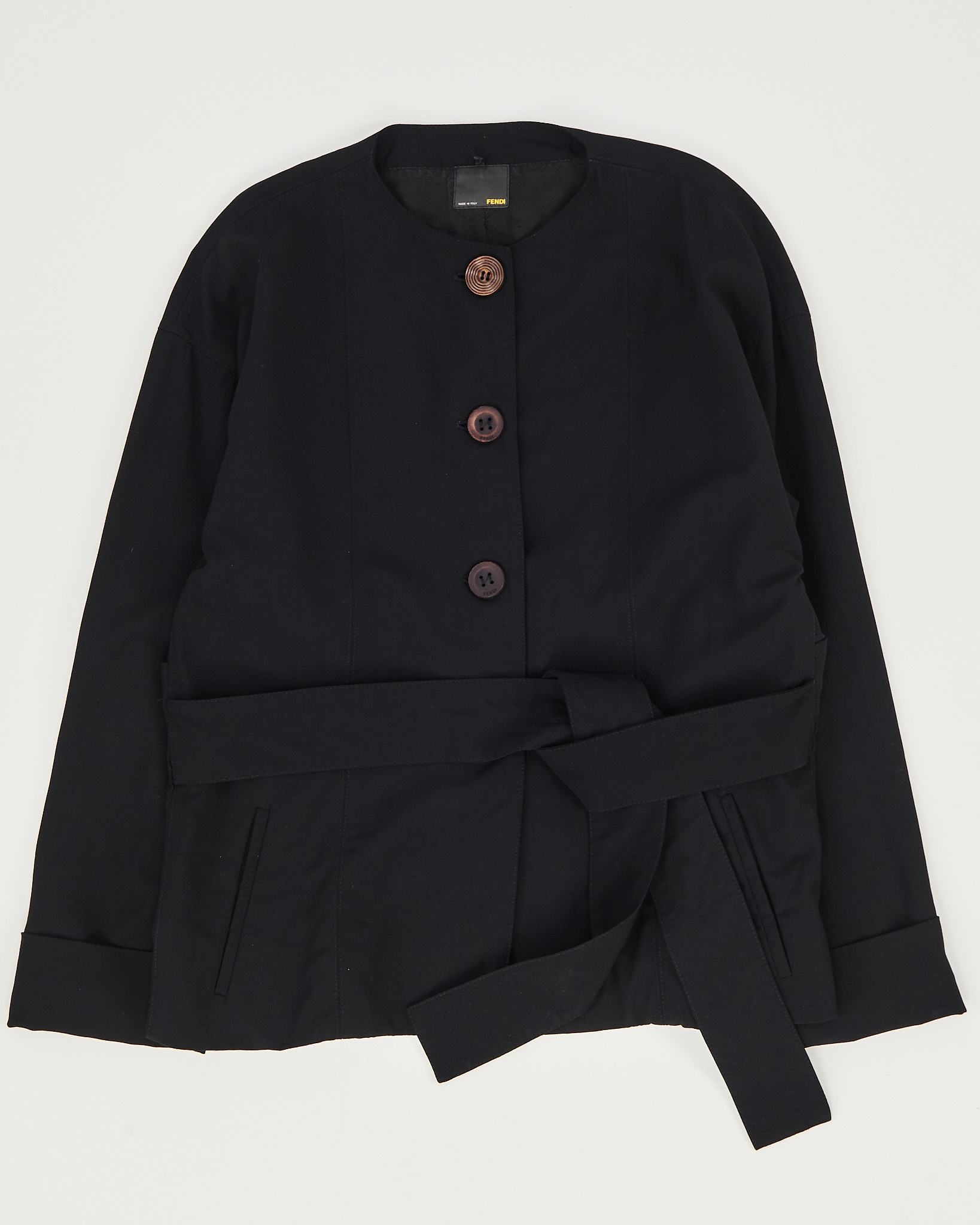 Винтажный жакет от культового бренда Fendi с поясом. Посадка свободная, линия талии регулируется поясом. Крупные пуговицы, акцентные рукава.