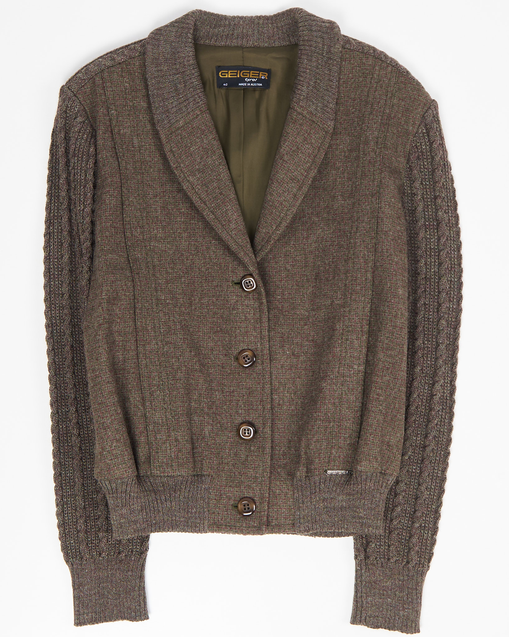 Кардиган с вязанными рукавами made in Austria. Приталенная посадка, плотная резинка по низу, функциональные карманы по бокам.