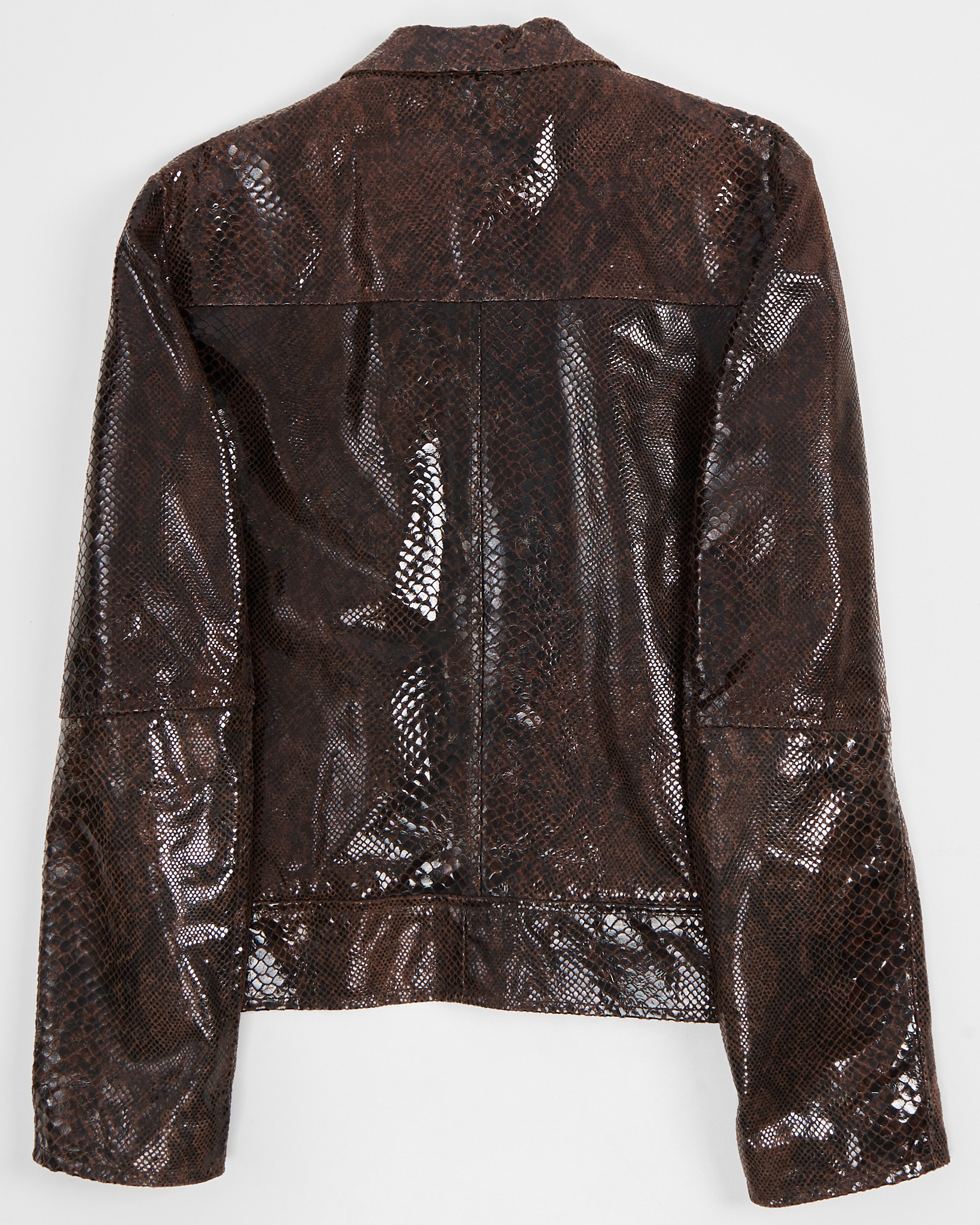 Винтажная куртка Imperial из натуральной кожи с выделкой под рептилию. Темно-коричневый цвет с глянцевым эффектом, классический воротник и застежка на кнопки. Карманы по бокам и на груди. Итальянское производство.