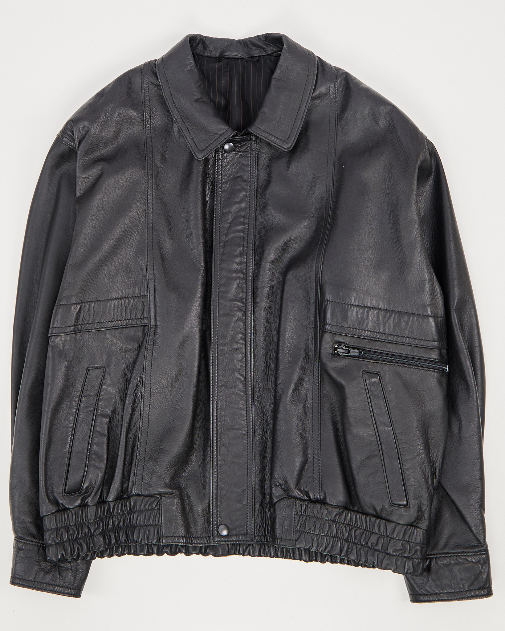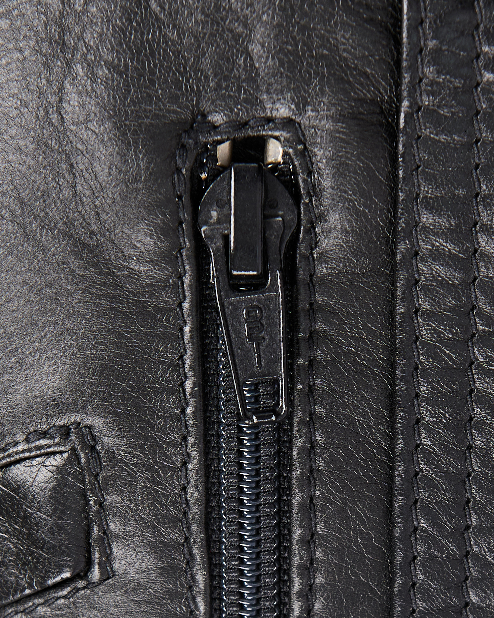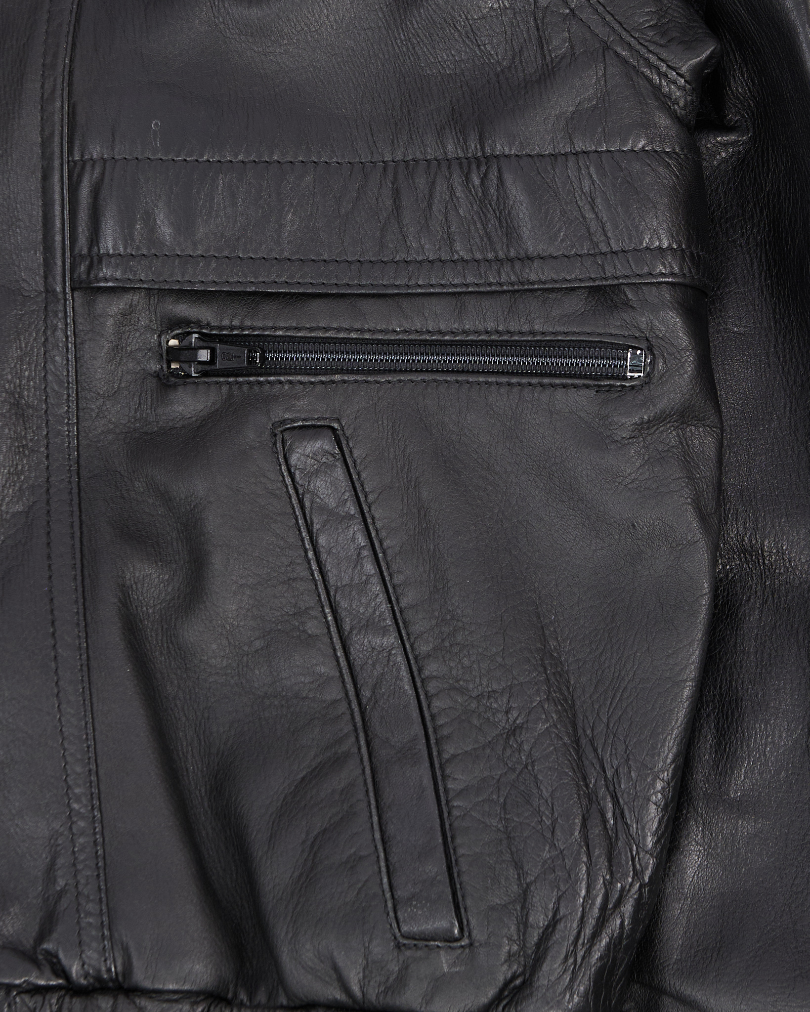 Куртка из 100% натуральной кожи глубокого чёрного цвета. Посадка свободная, акцентные вертикальные швы и карманы на молнии, плотная резинка внизу.