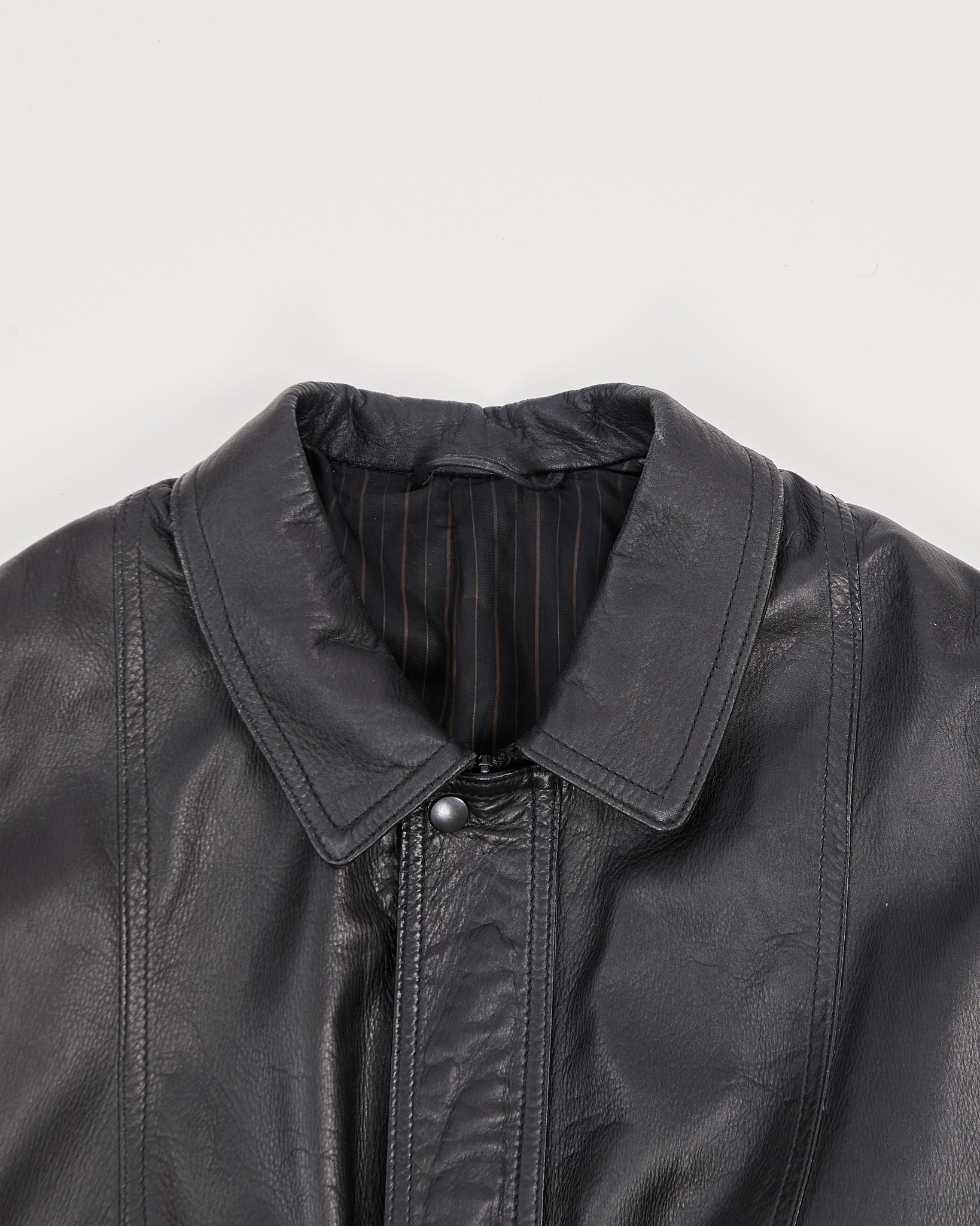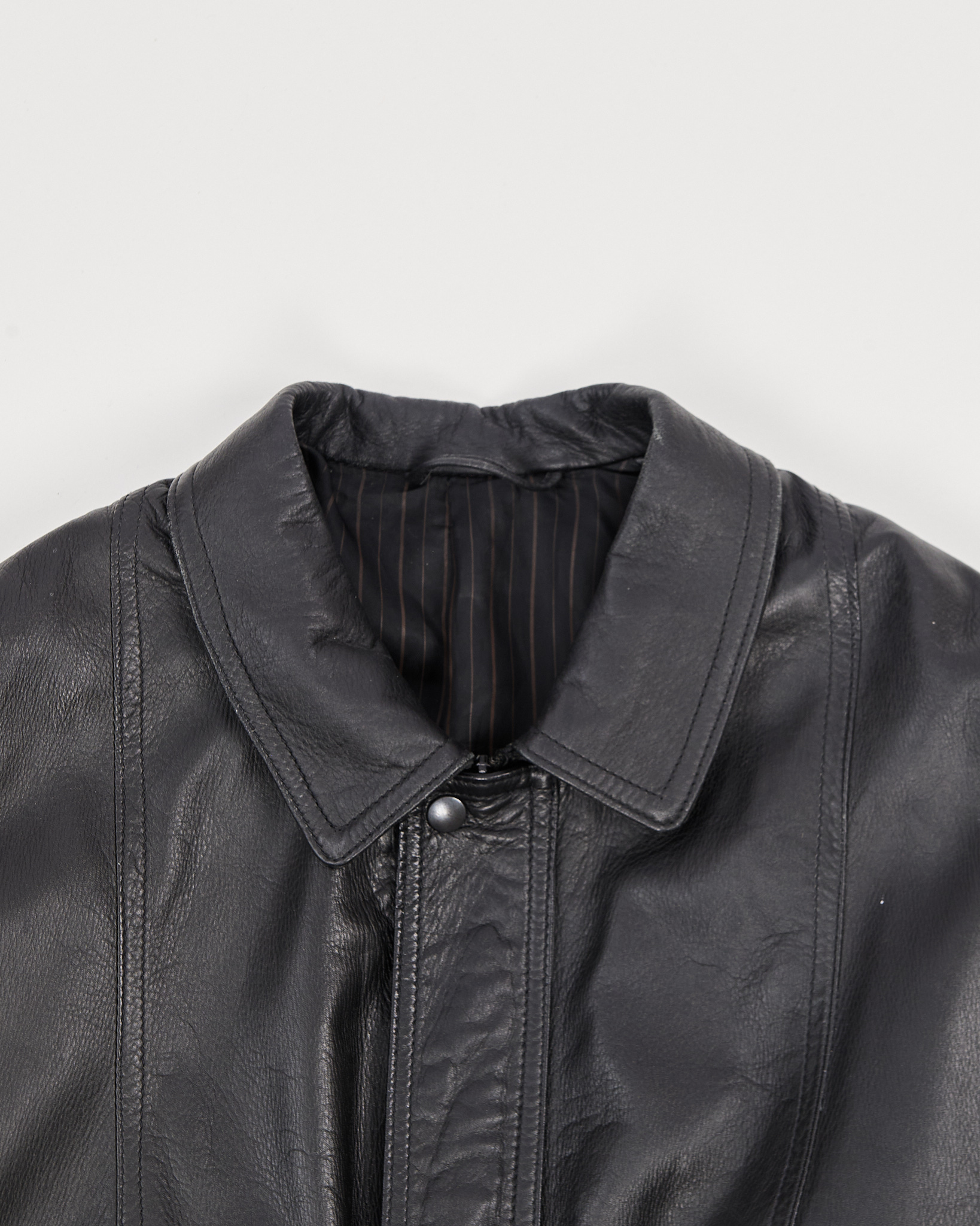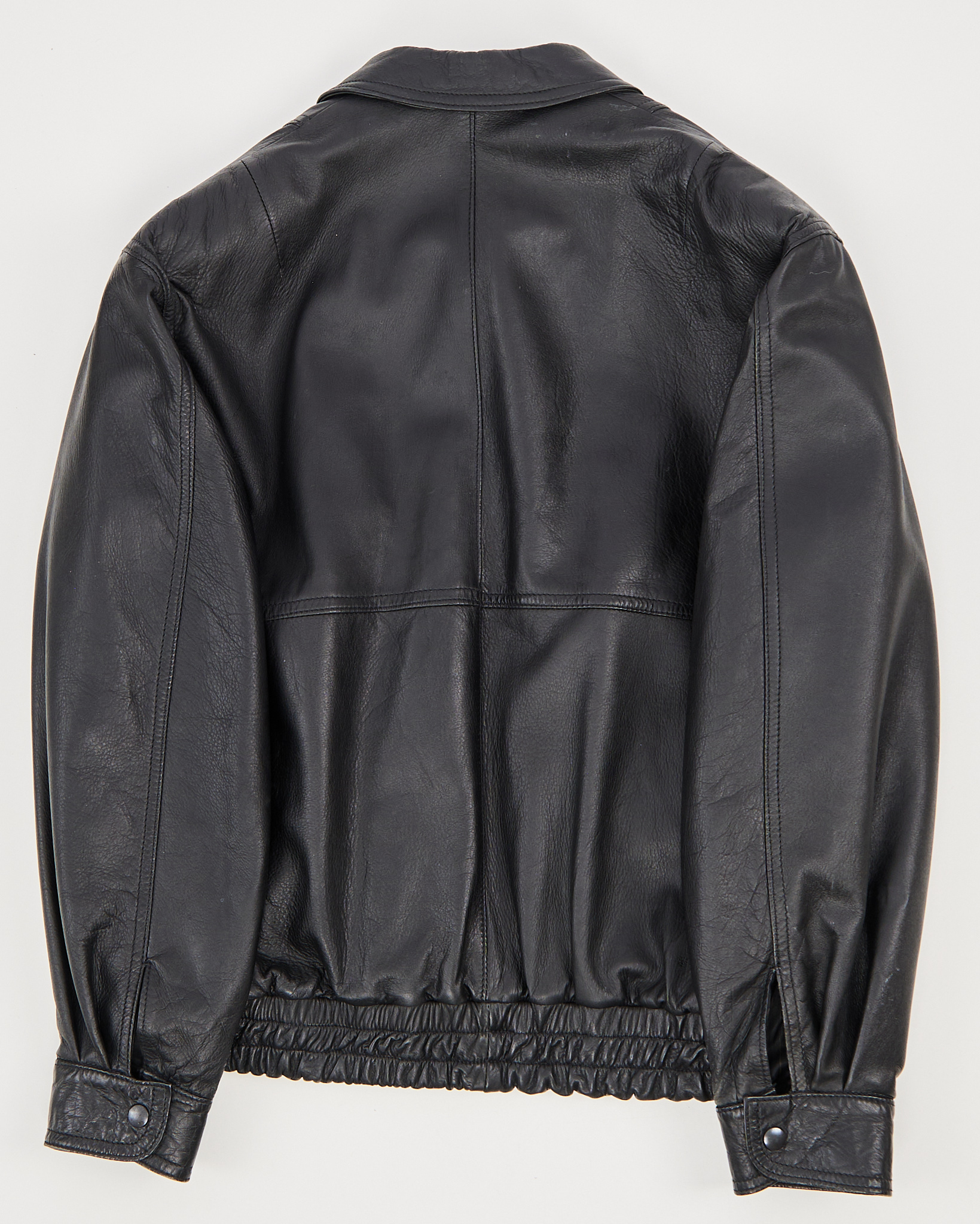 Куртка из 100% натуральной кожи глубокого чёрного цвета. Посадка свободная, акцентные вертикальные швы и карманы на молнии, плотная резинка внизу.