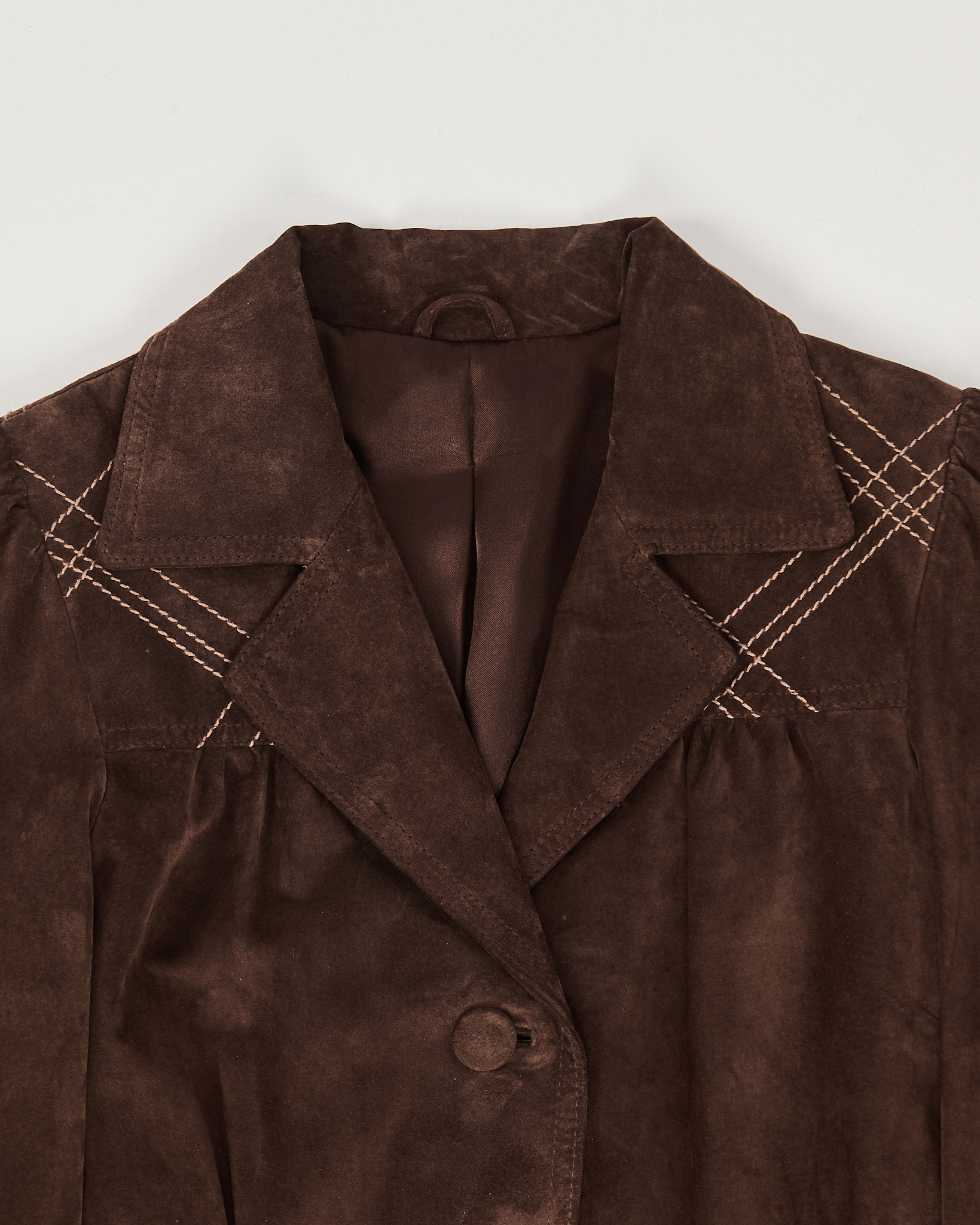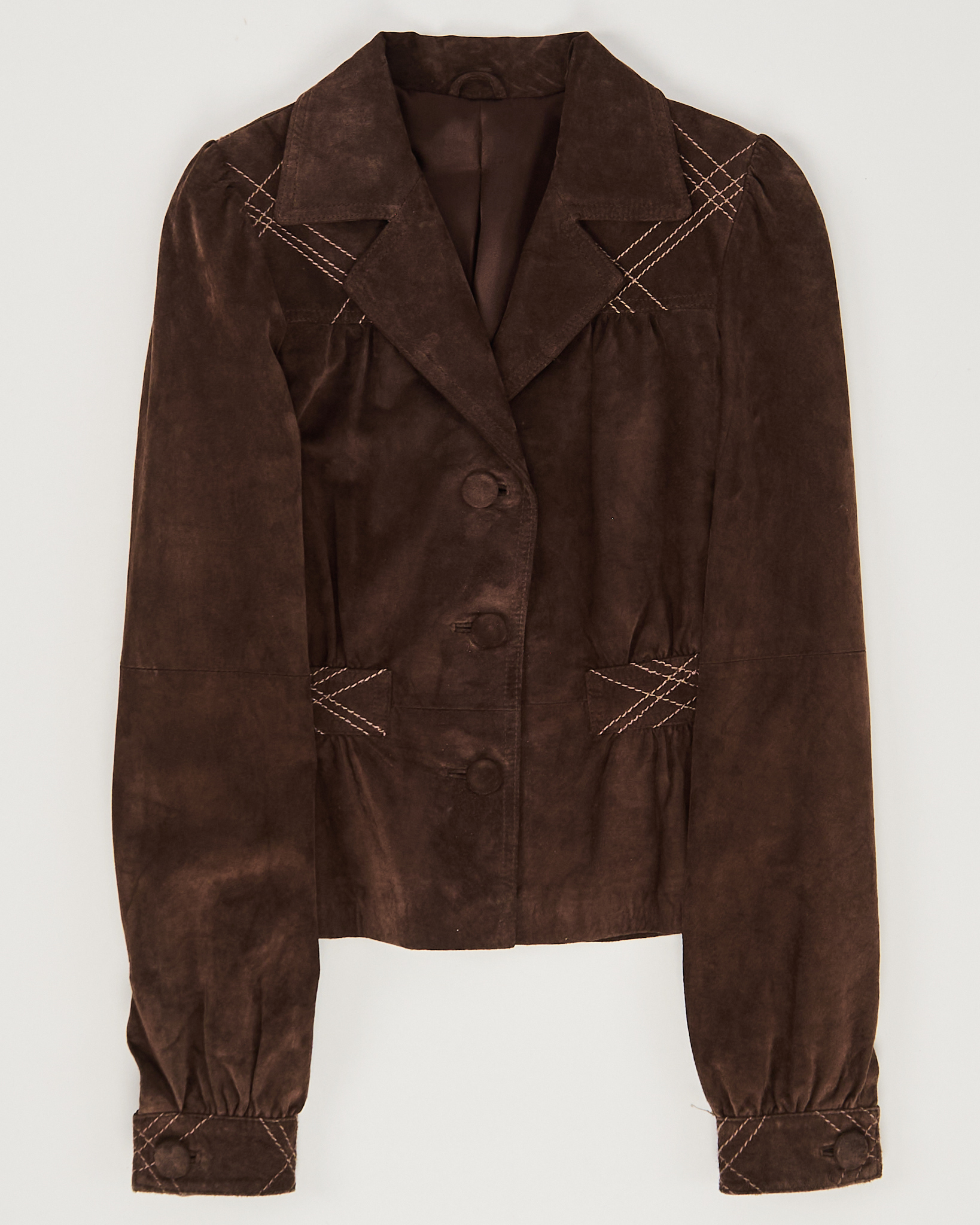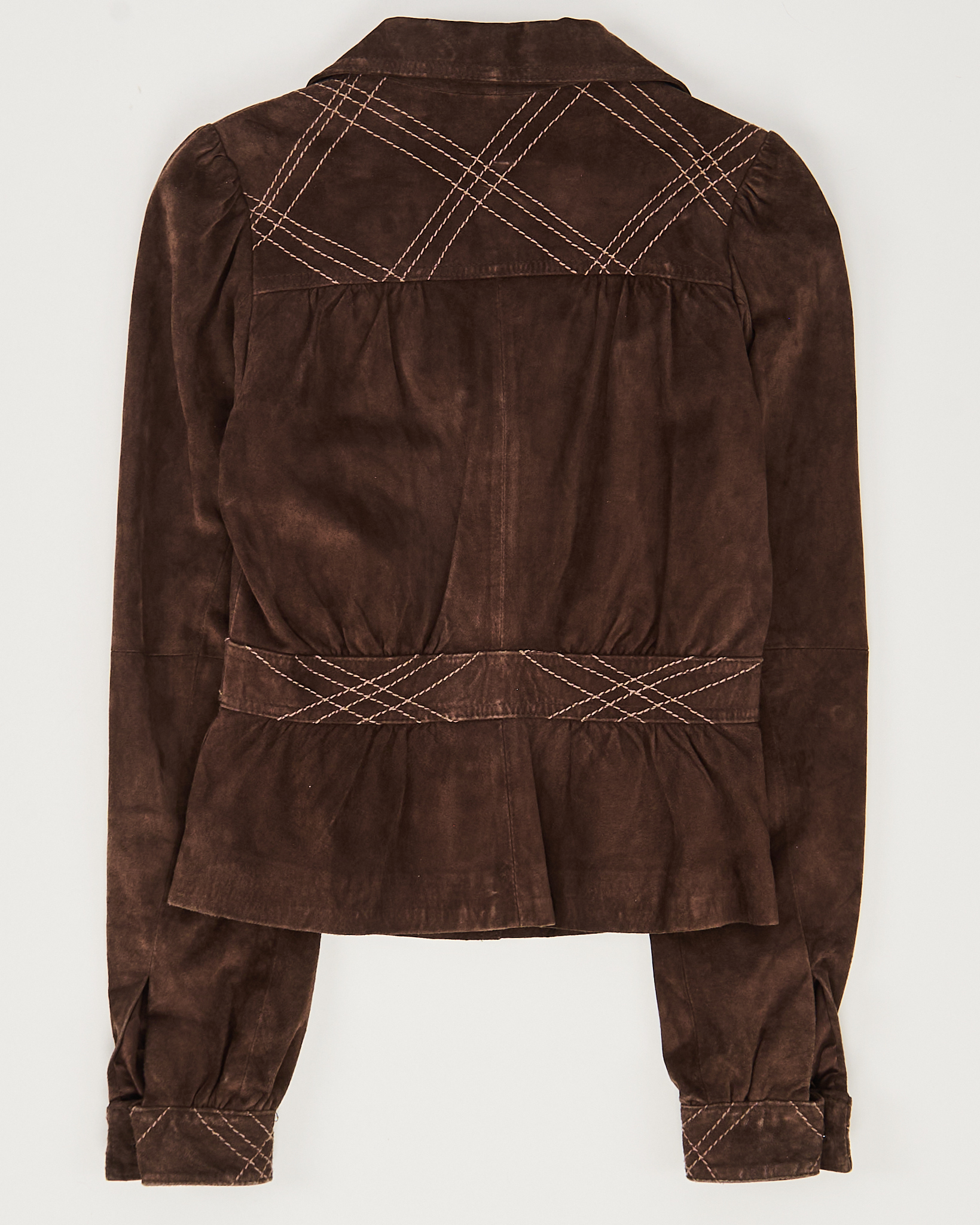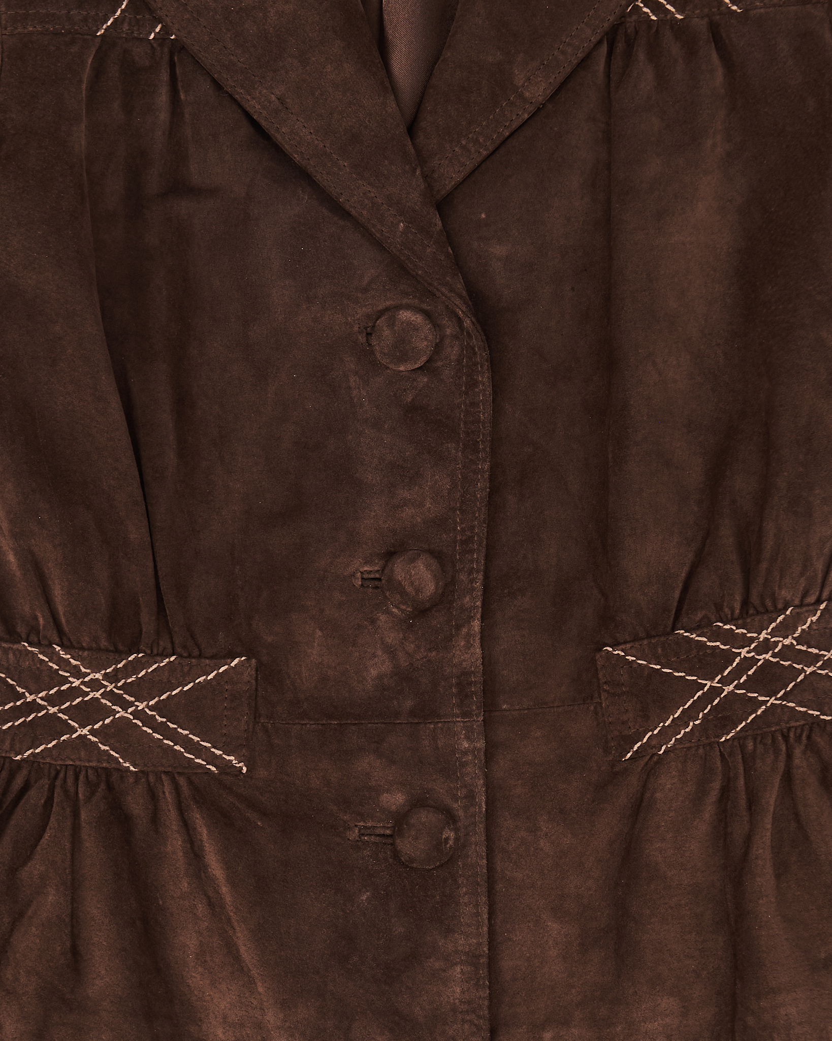 Куртка из натуральной замши в стиле бохо. Двубортный воротник, приталенная посадка, контрастная строчка на вставках на талии.