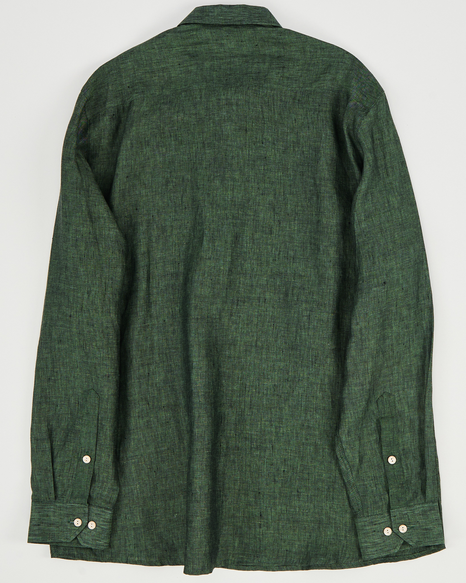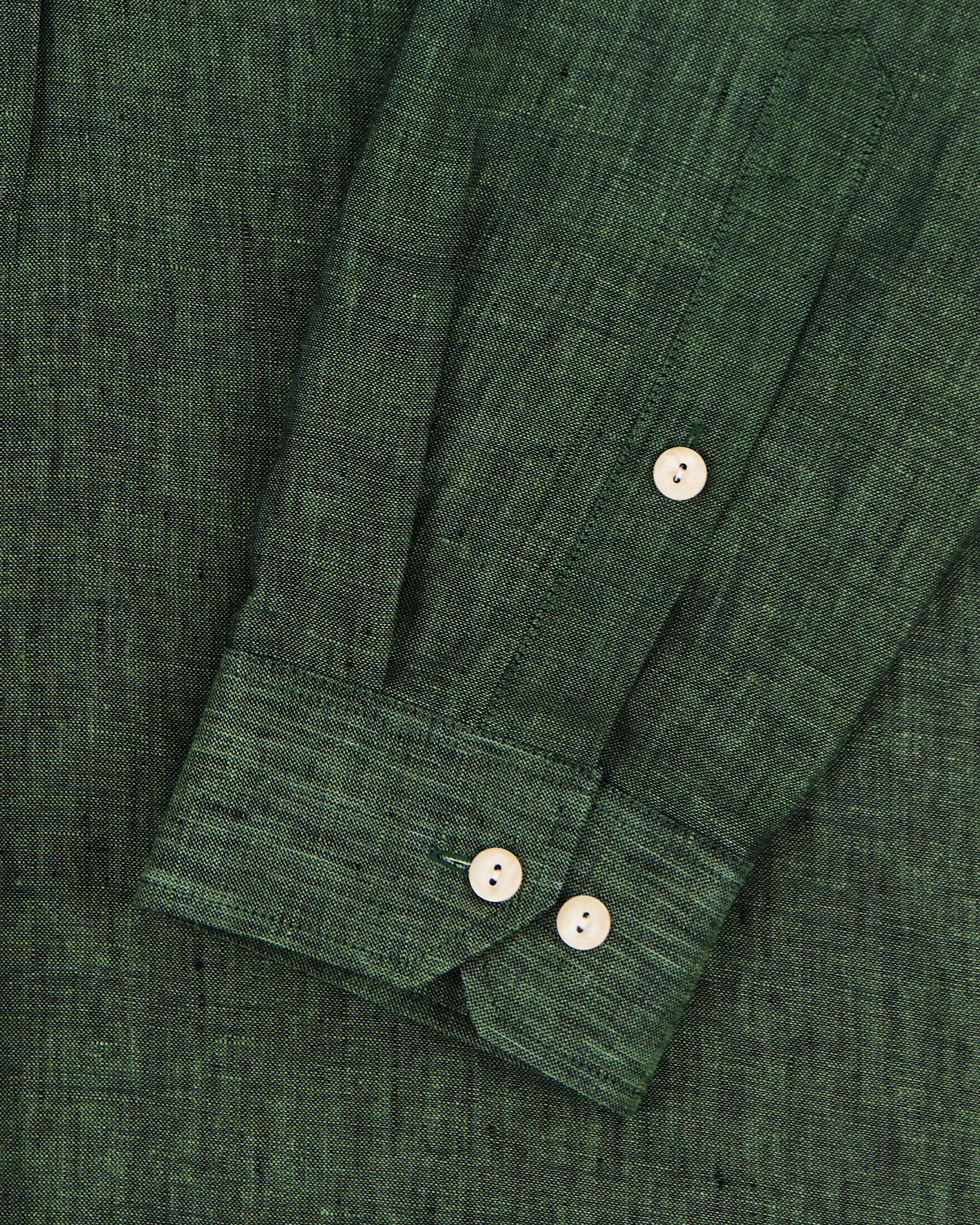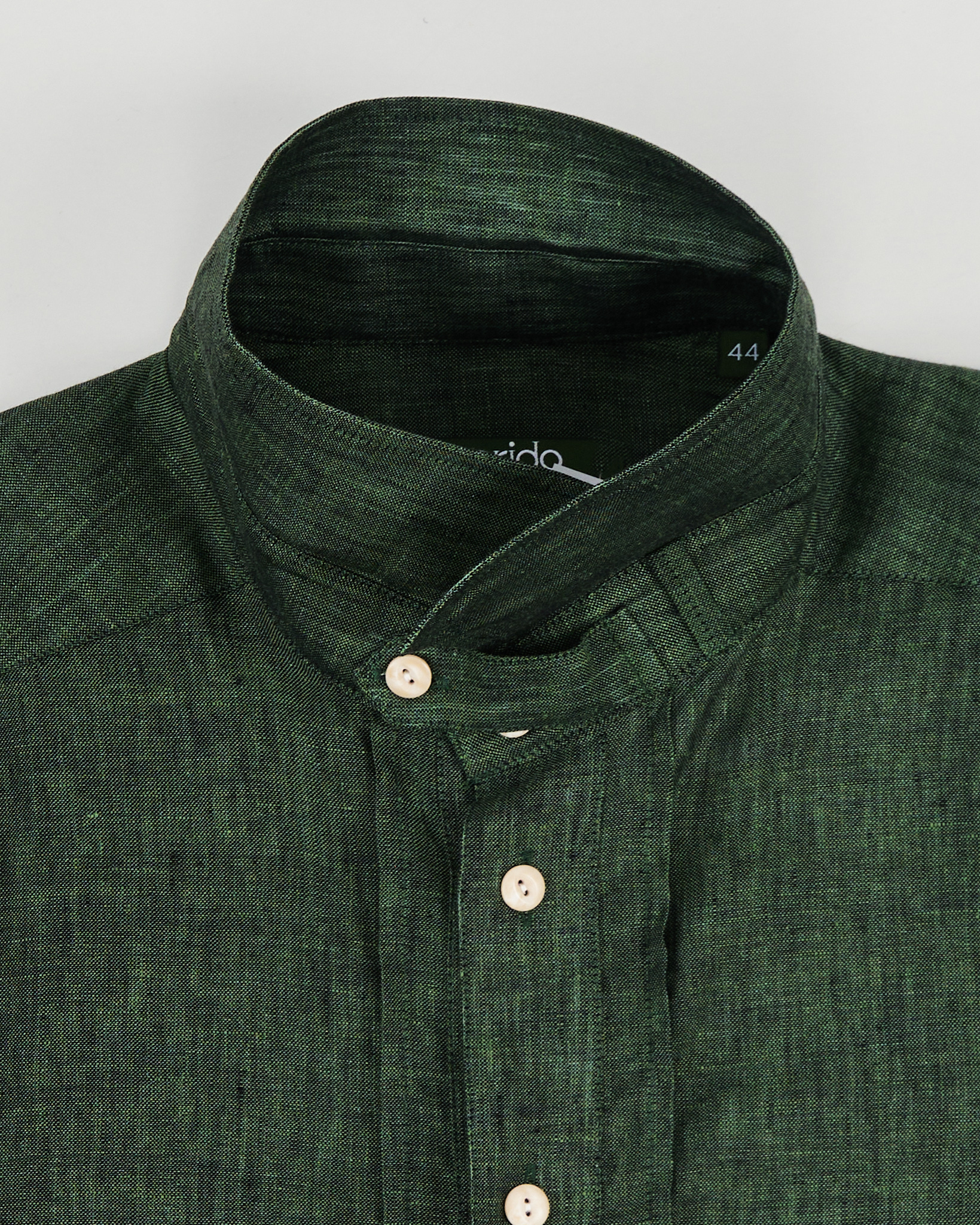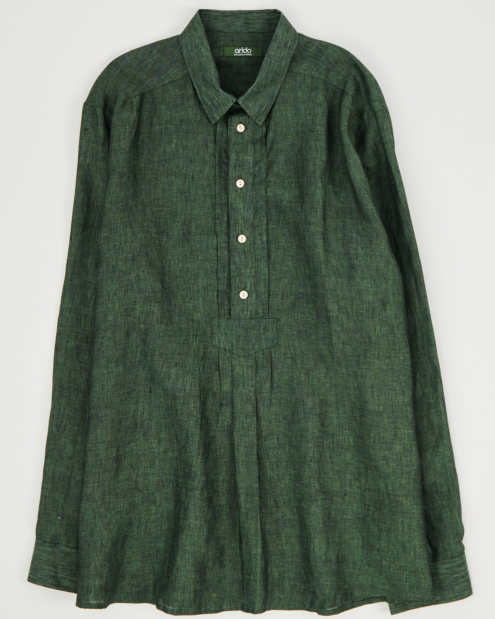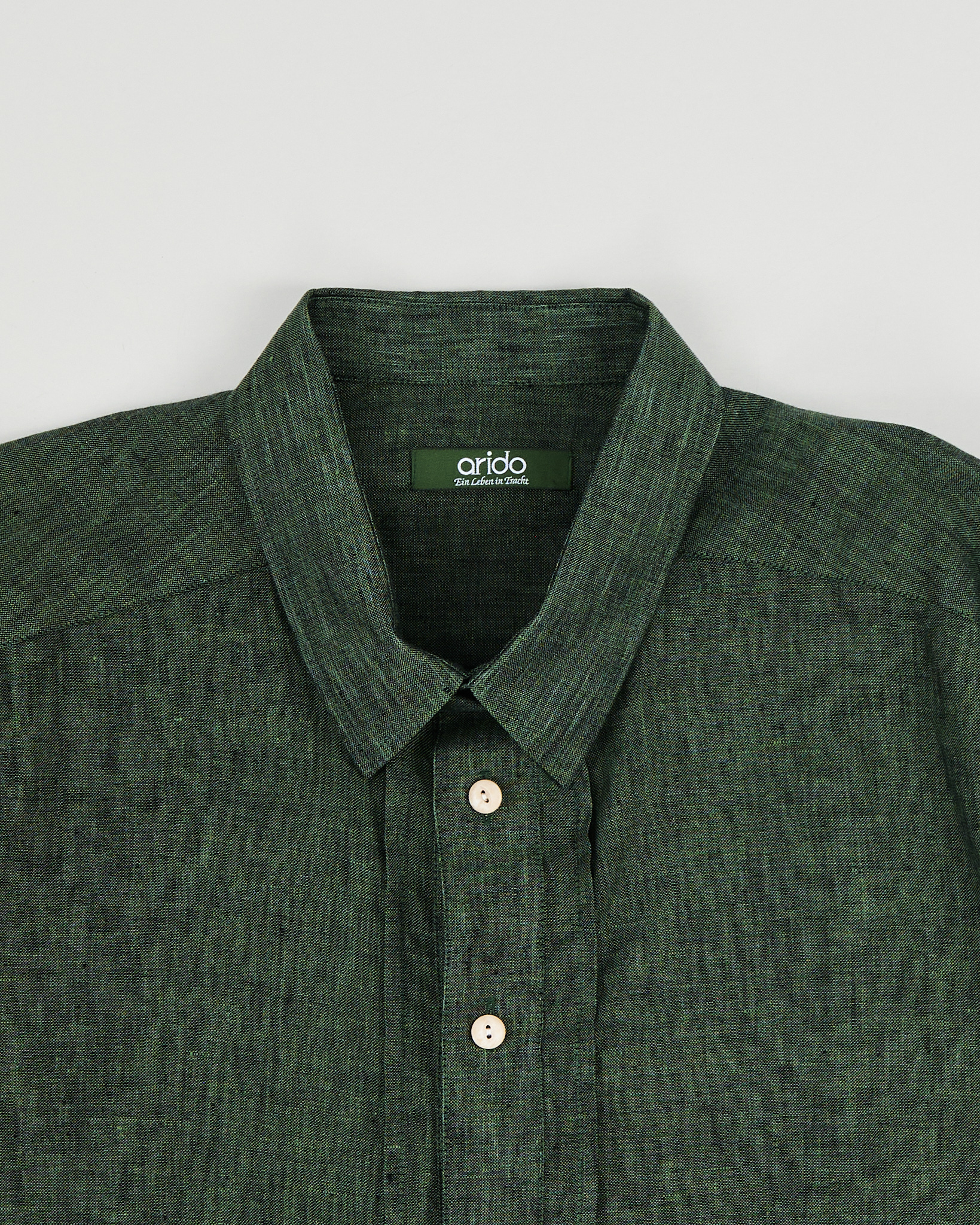 Рубашка из льна глубокого зелёного оттенка от Arido. Посадка свободная, силуэт прямой. Акцентная планка с пуговицами и мягкий воротник.