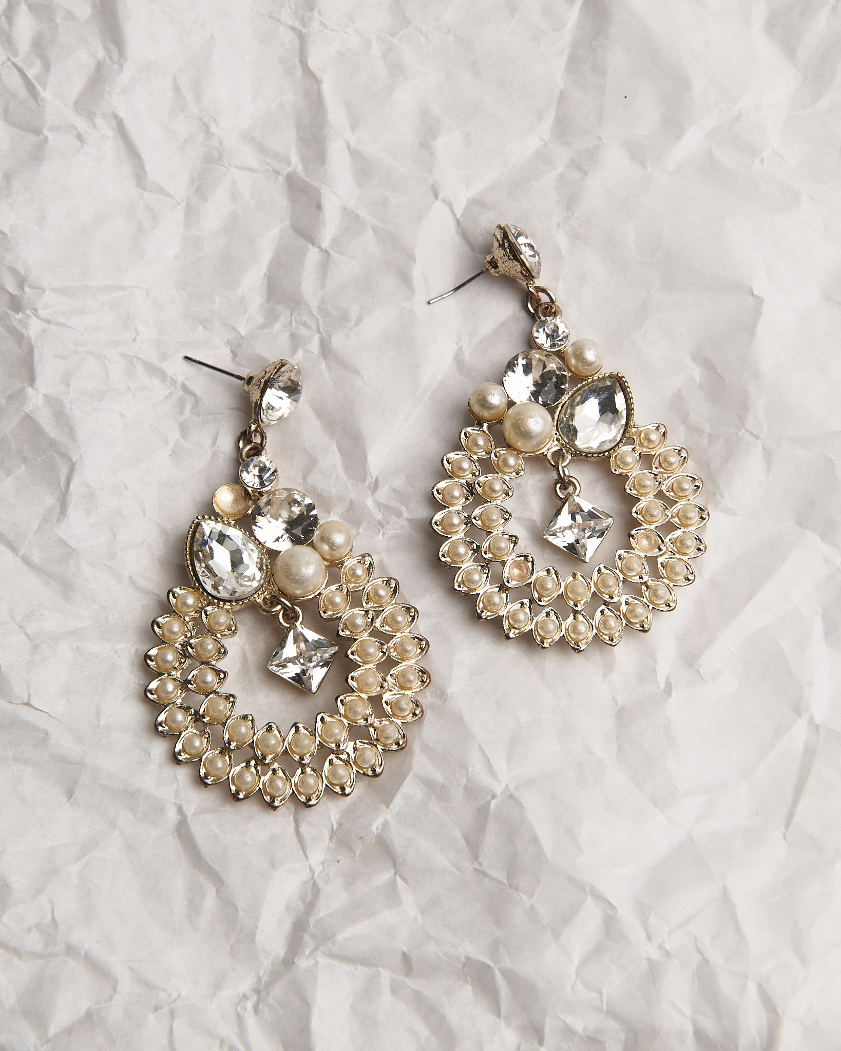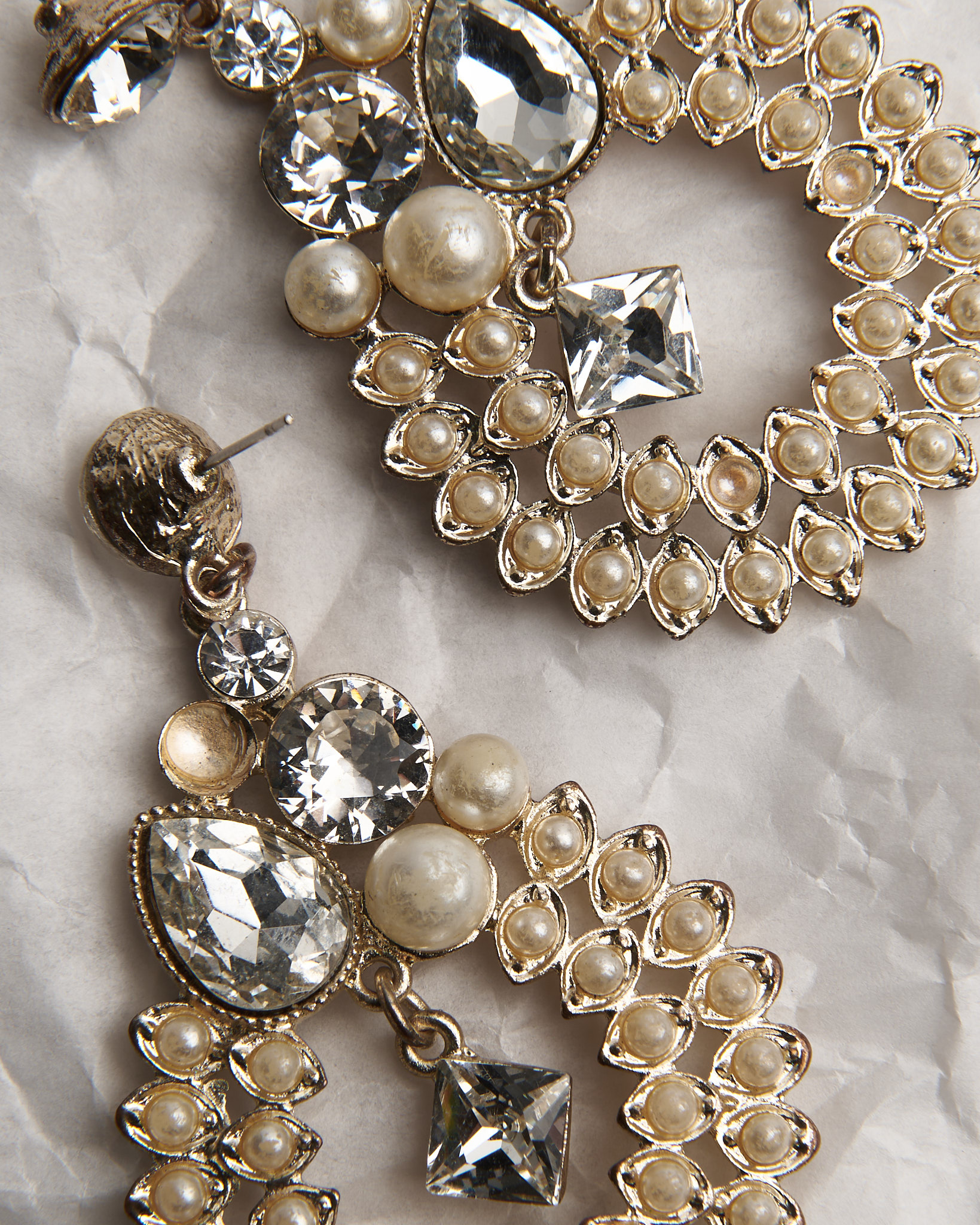 Крупные серьги с прозрачными кристаллами и жемчужными вставками. Застежка-гвоздик обеспечивает плотную посадку.
