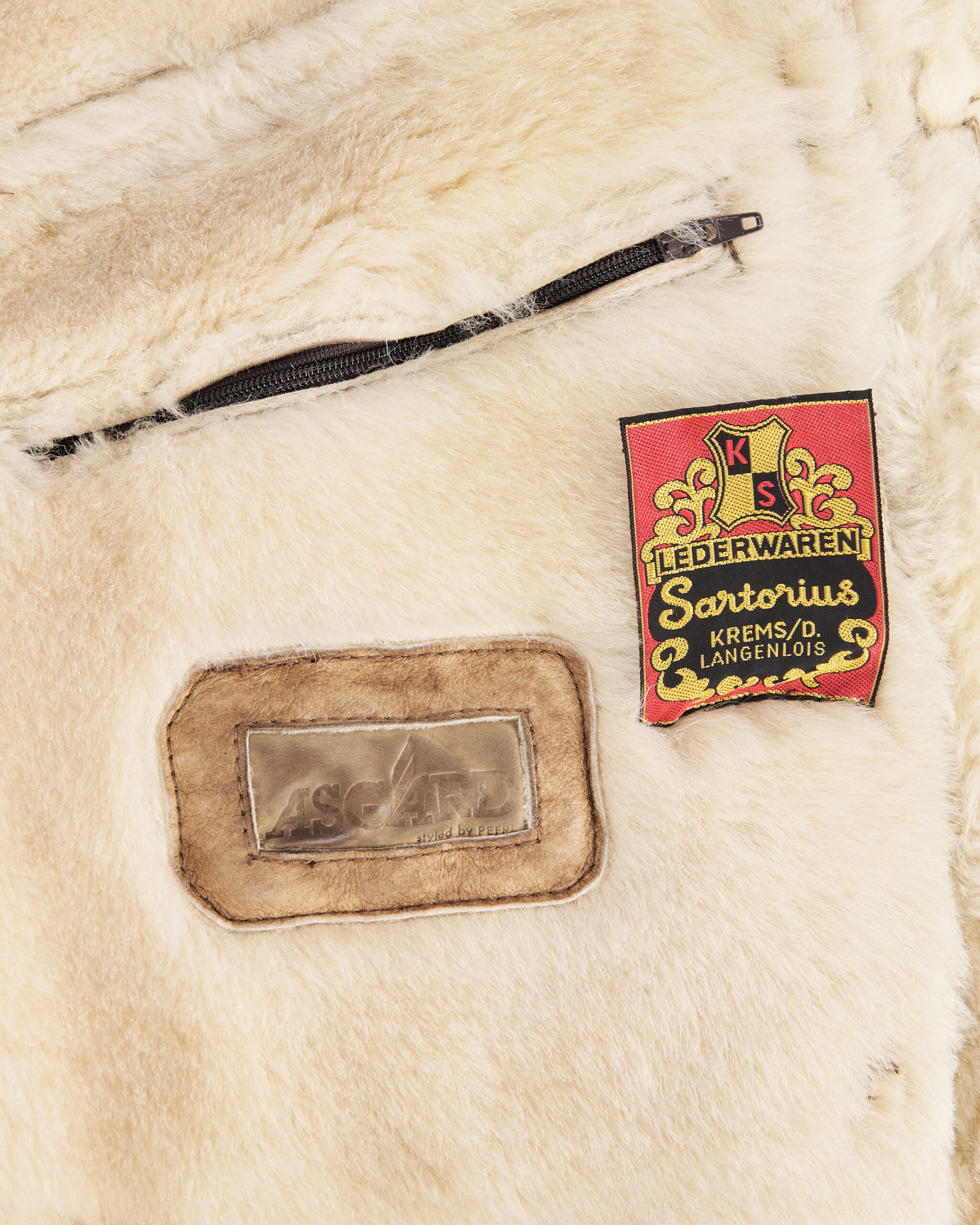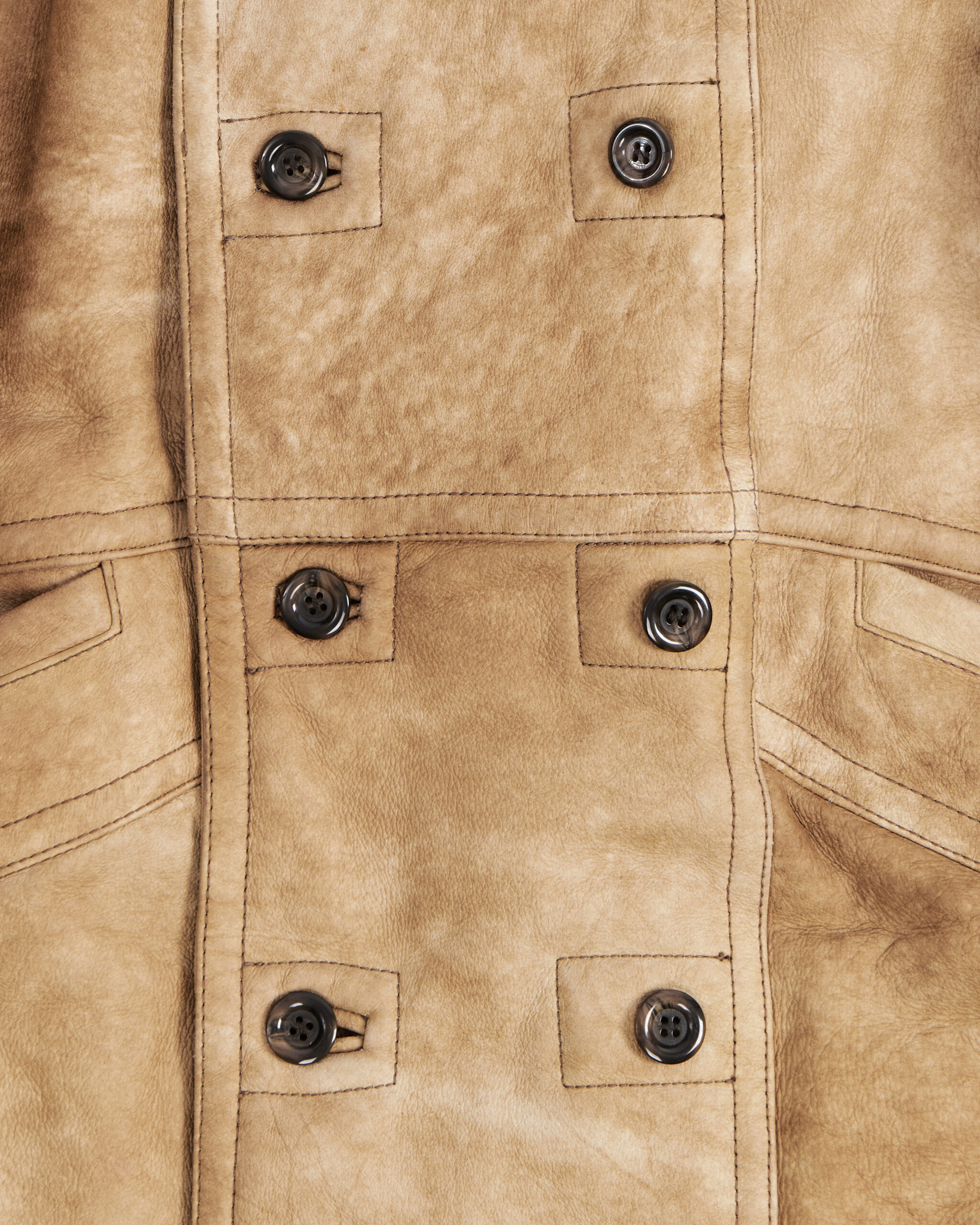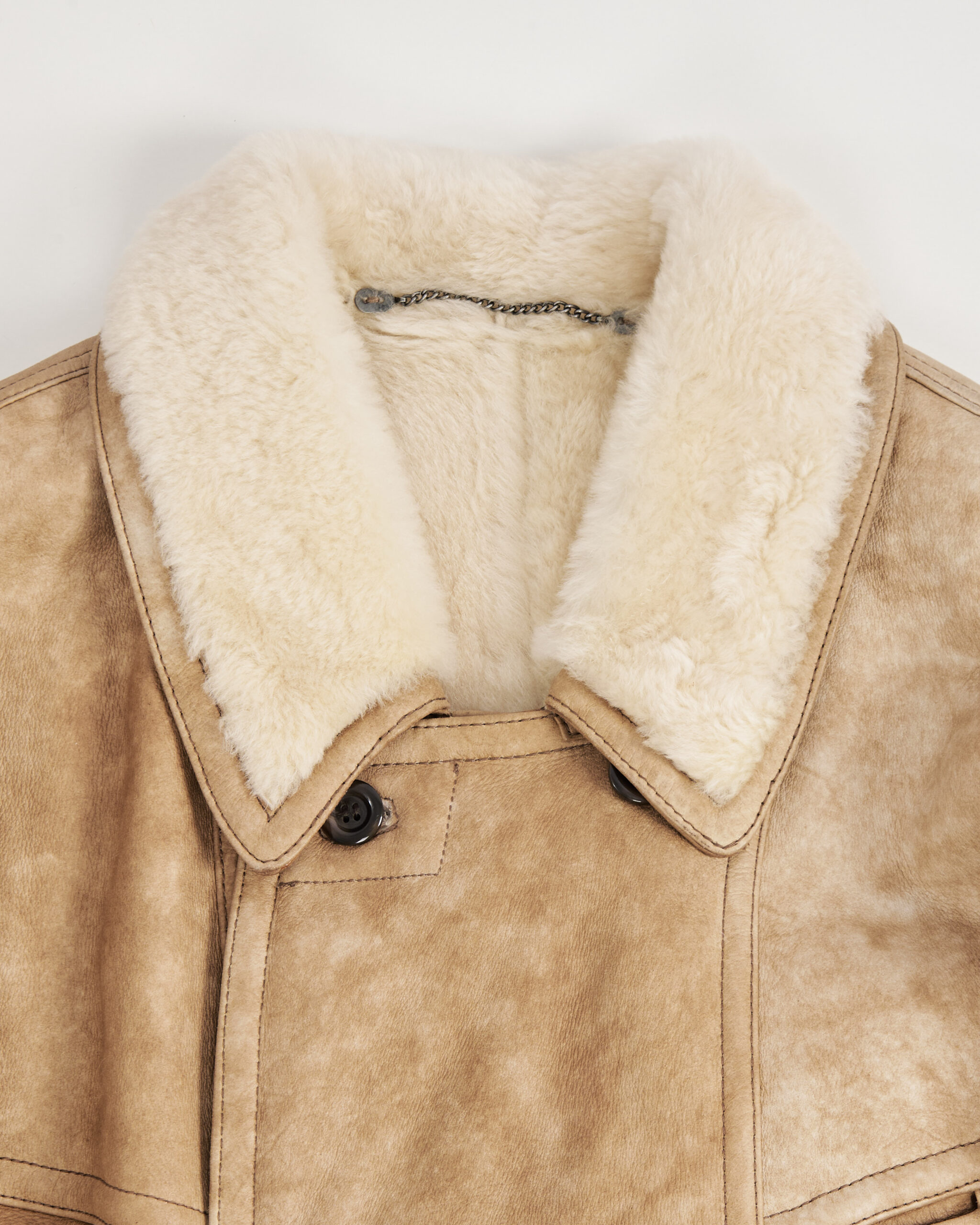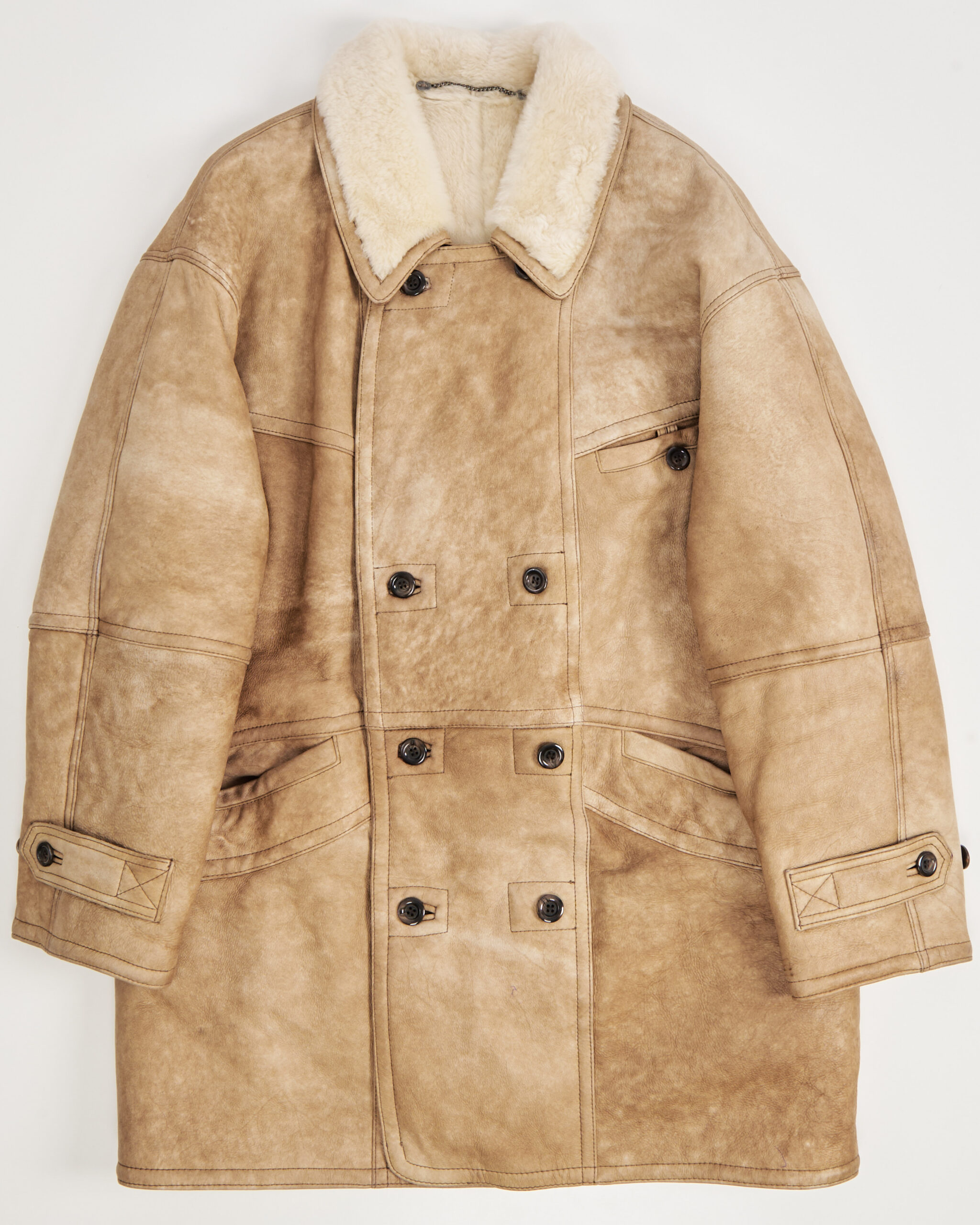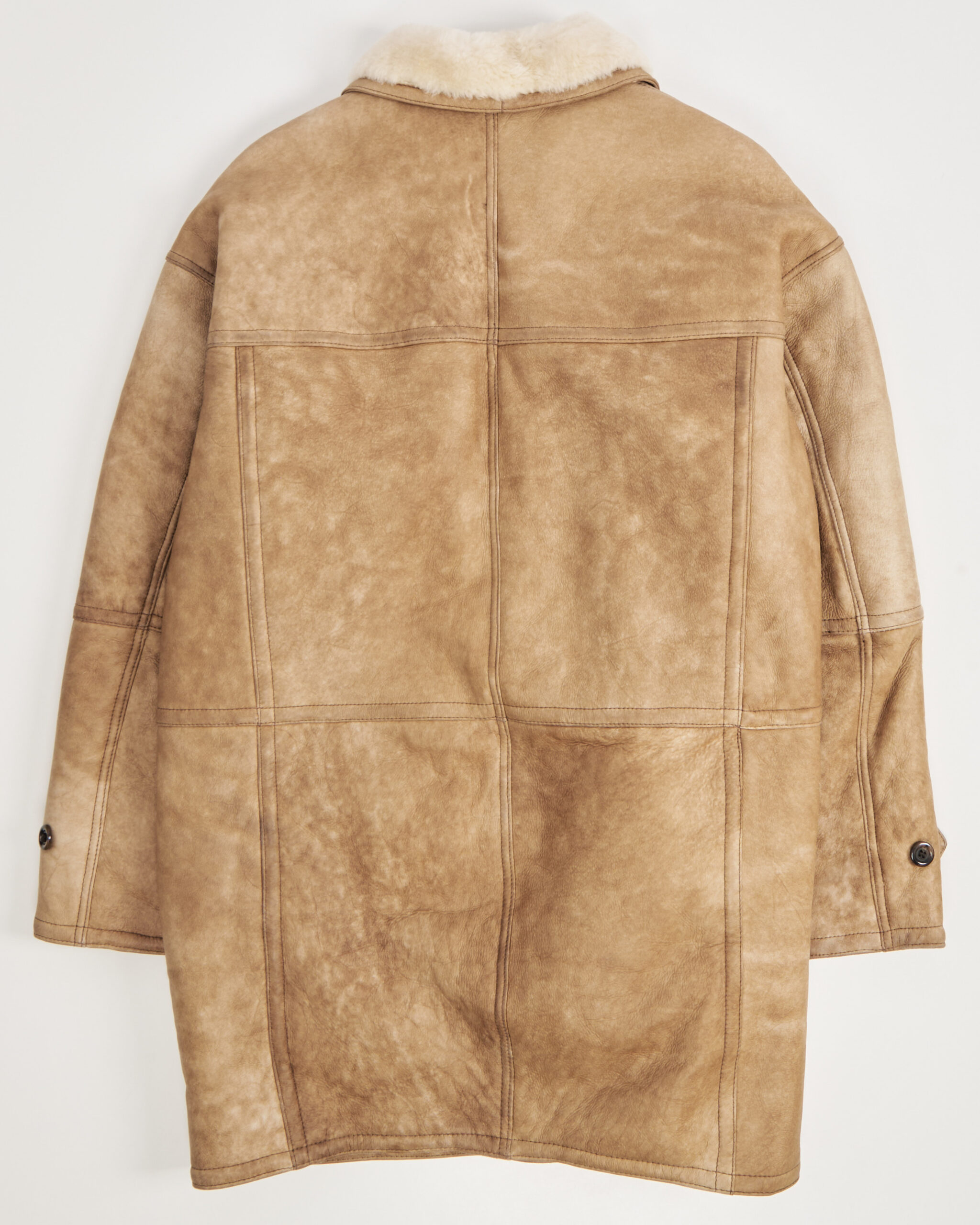 Дублёнка из натуральной овчины в бежевом оттенке с патиной, мягкой фактурой и густым мехом внутри. Посадка объёмная, с широкими плечами и прямым силуэтом. Материал плотный, но податливый.Есть два функицональных кармана по бокам.