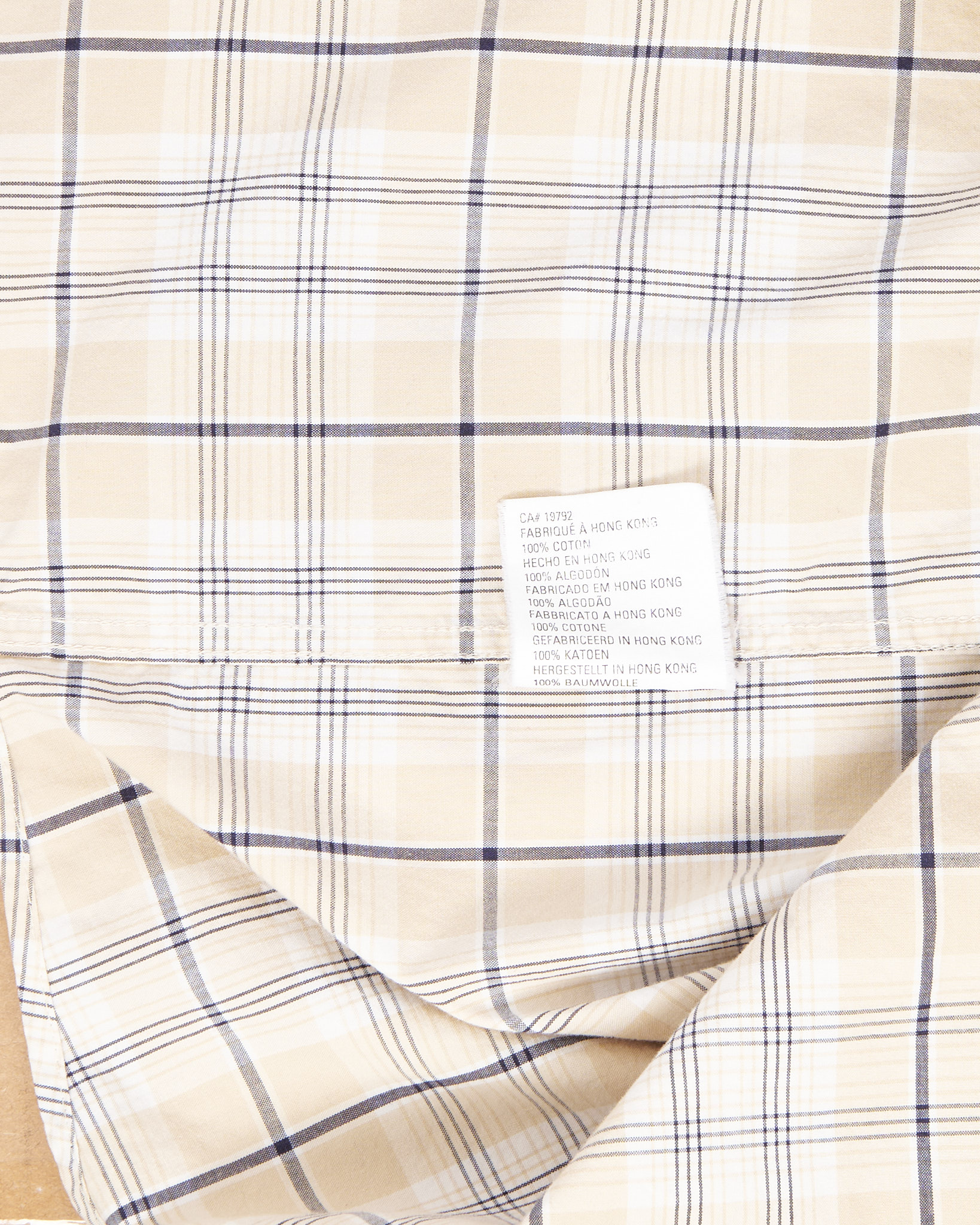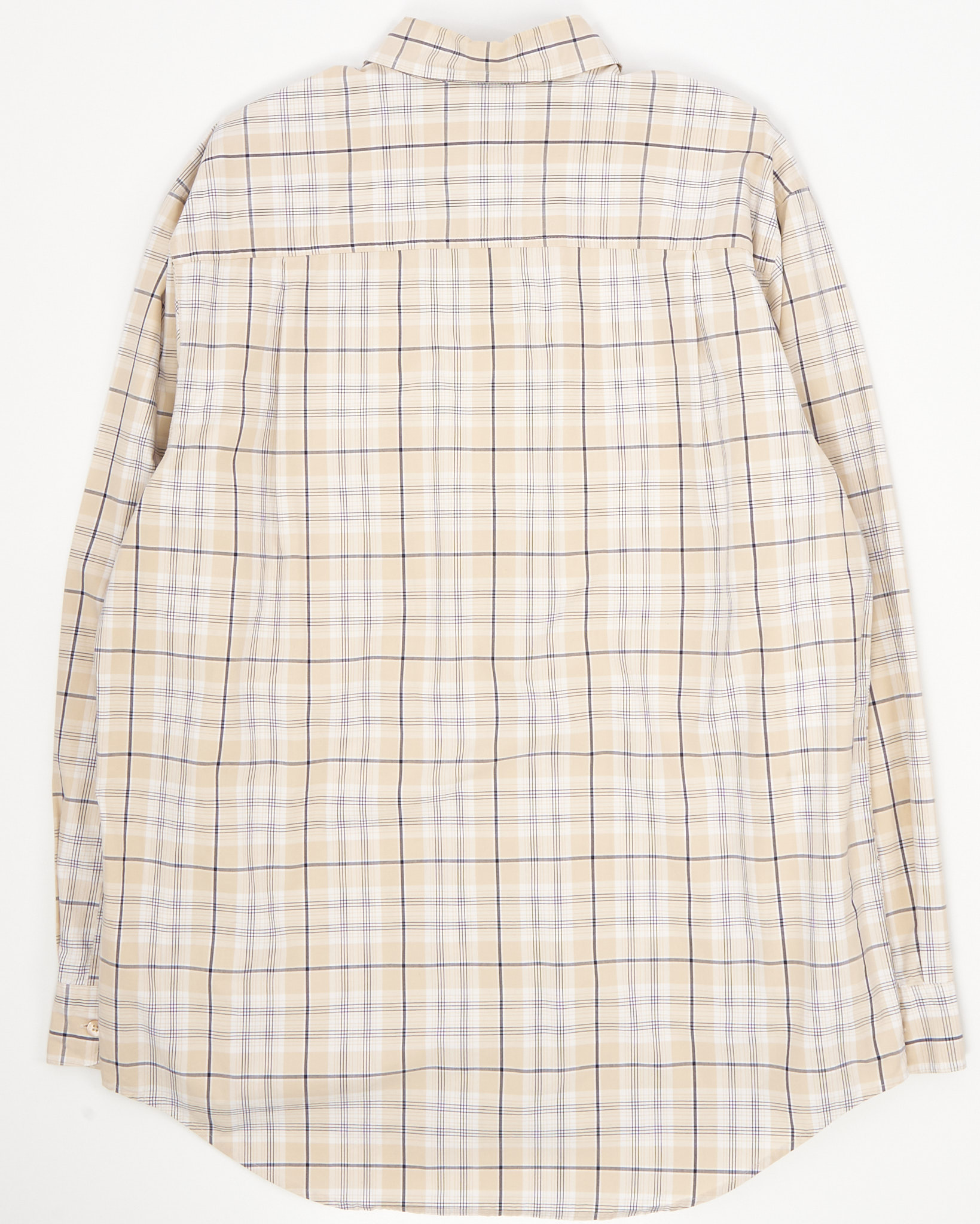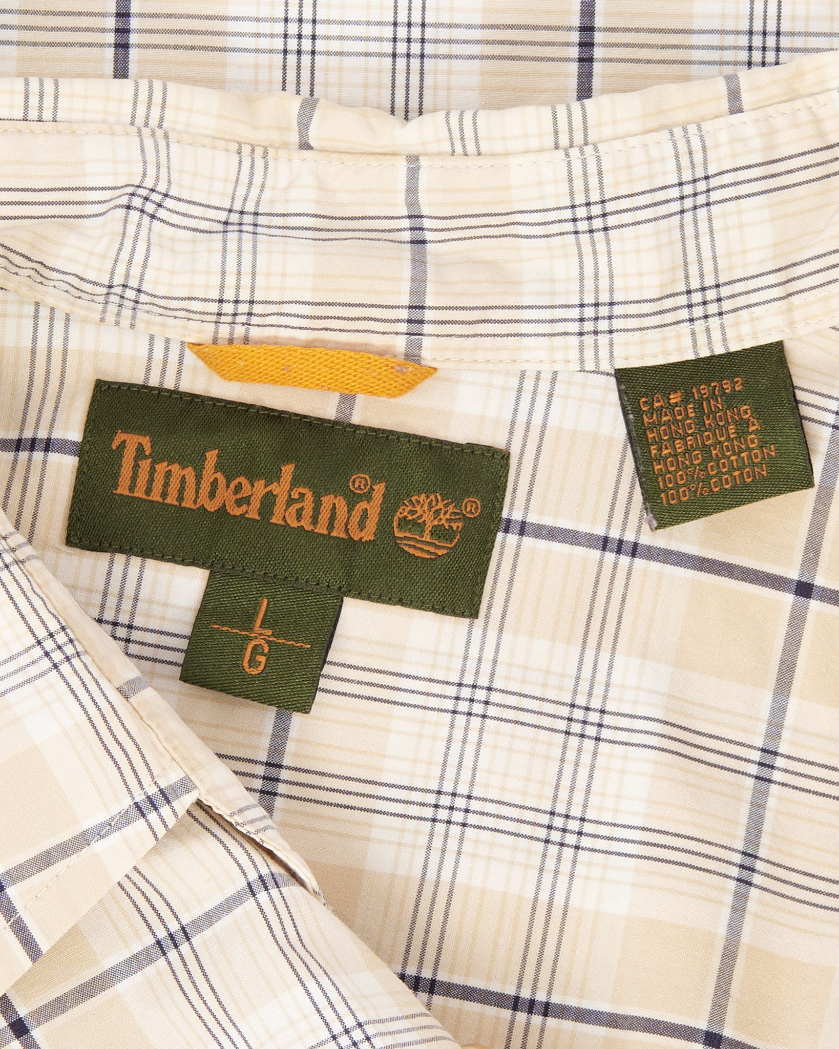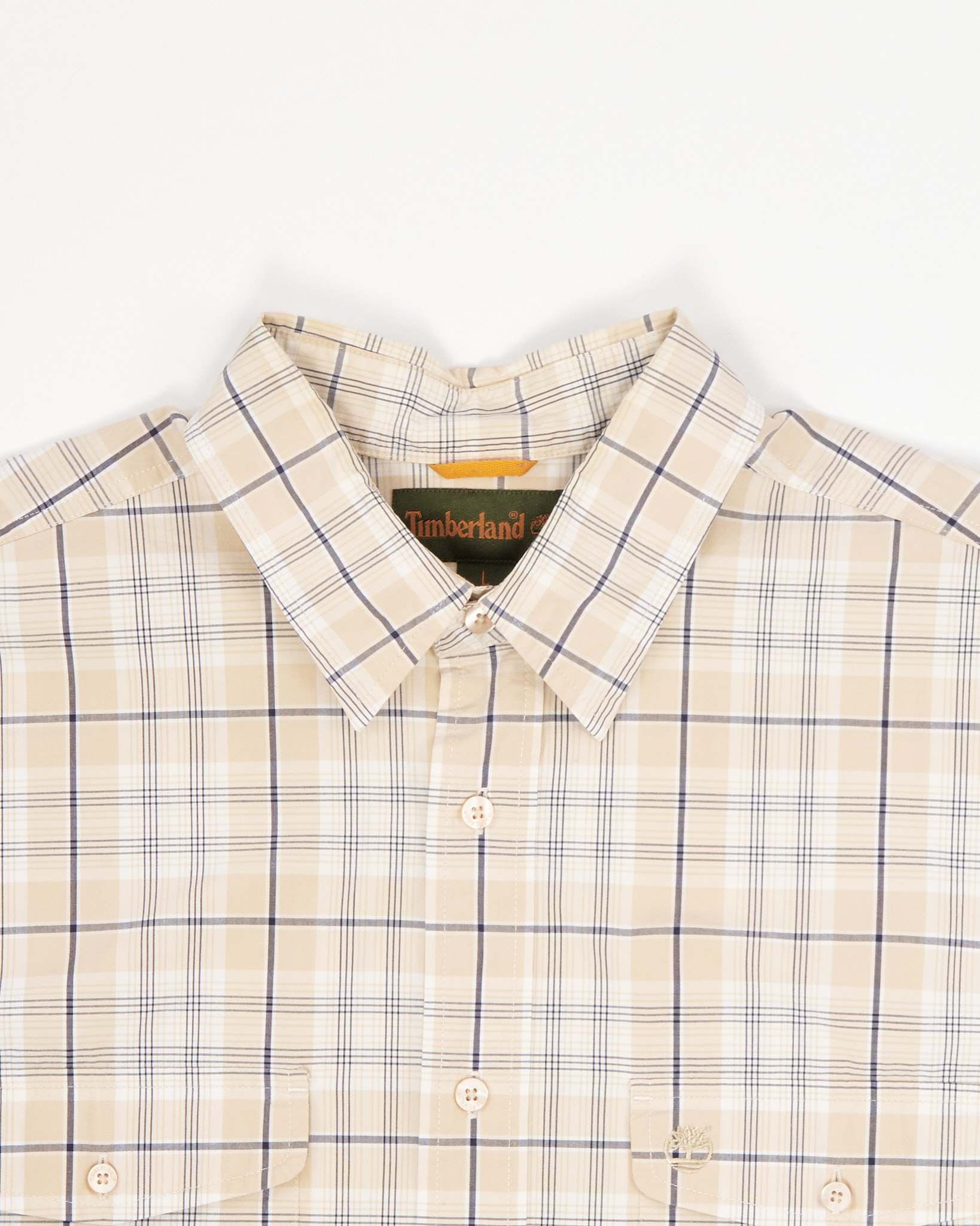 Рубашка от из 100% хлопка от бренда Timberland. Классическая бежевая клетка. Прямой крой, два нагрудных кармана с клапанами и пуговицами, вышитый логотип Timberland на левом кармане.