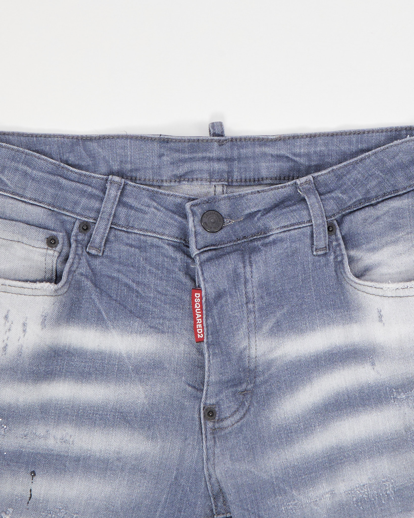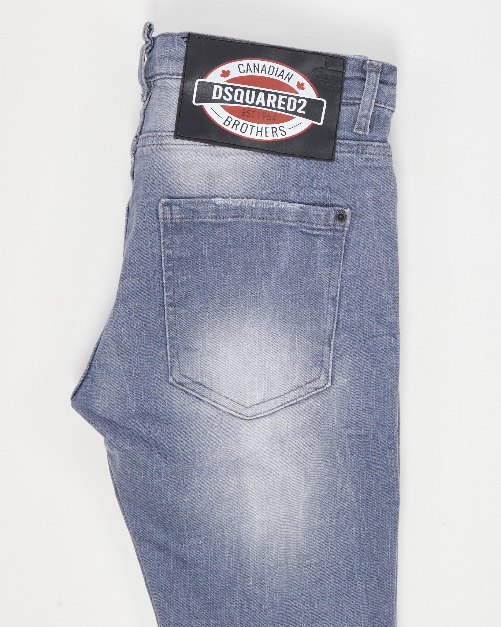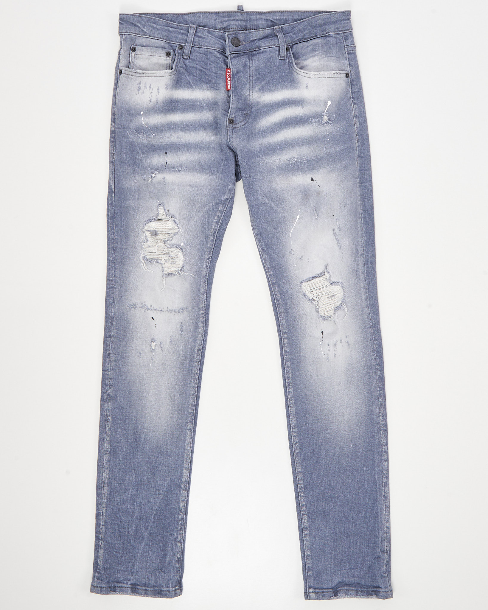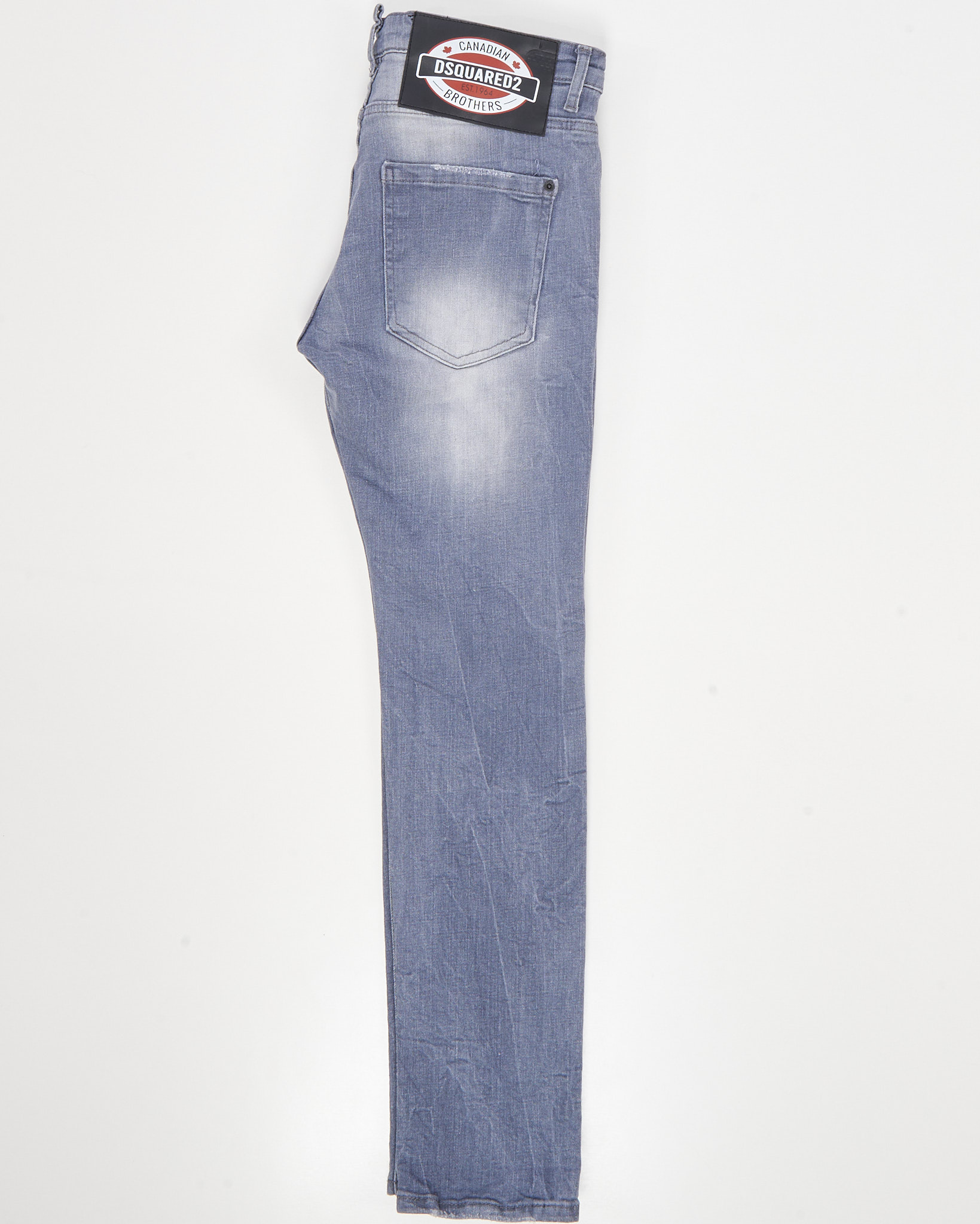 Стильные серые мужские джинсы от культового итальянского бренда Dsquared2. Эффектом потертости, некоторые места порваны. Зауженный крой и характерная посадка. Фирменный патч Dsquared2 на ширинке.