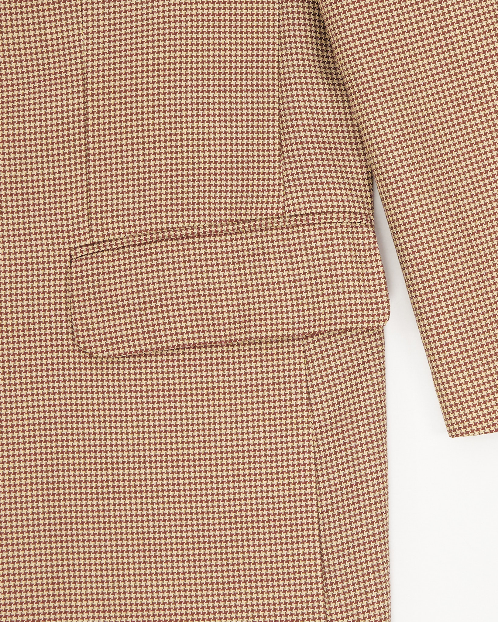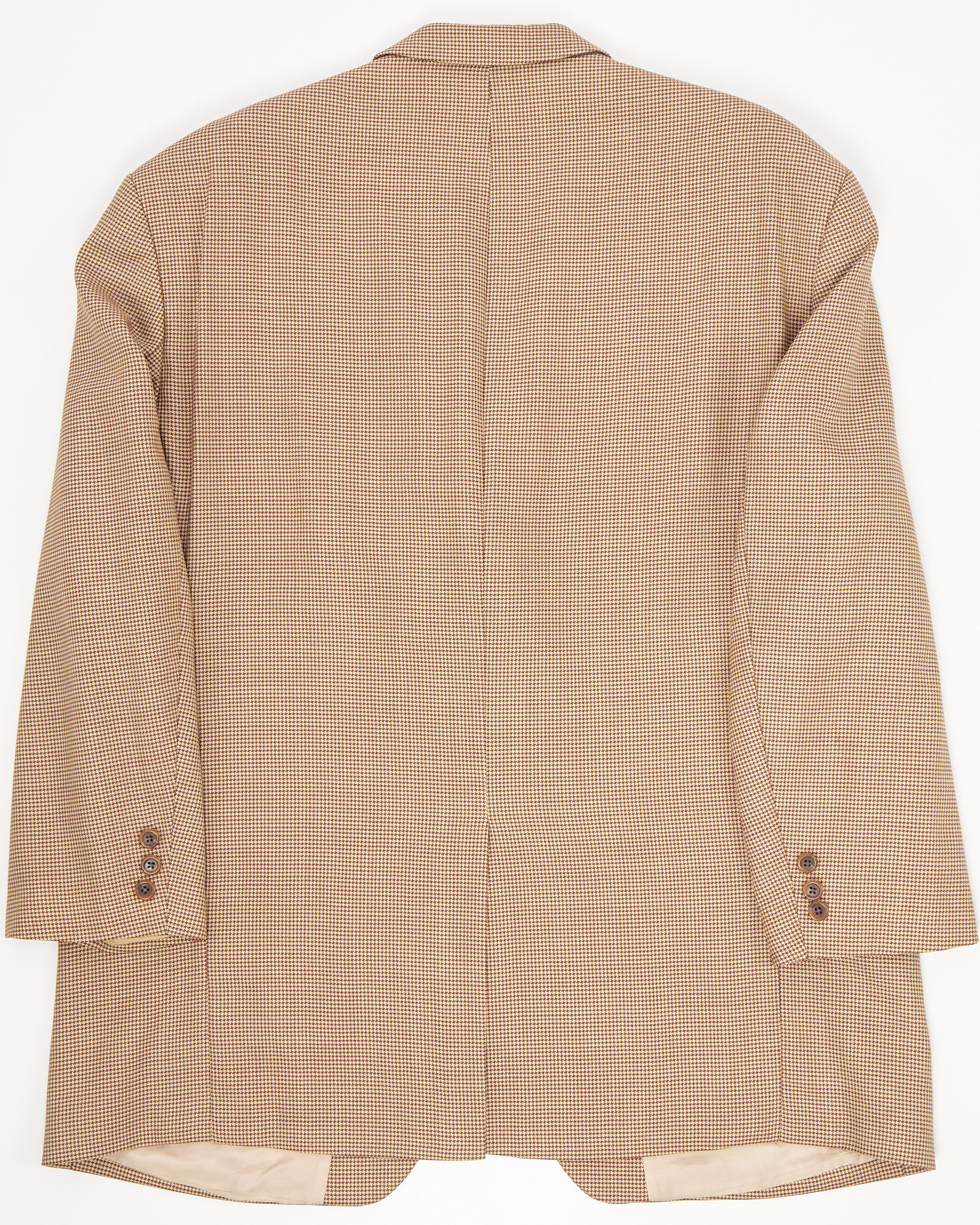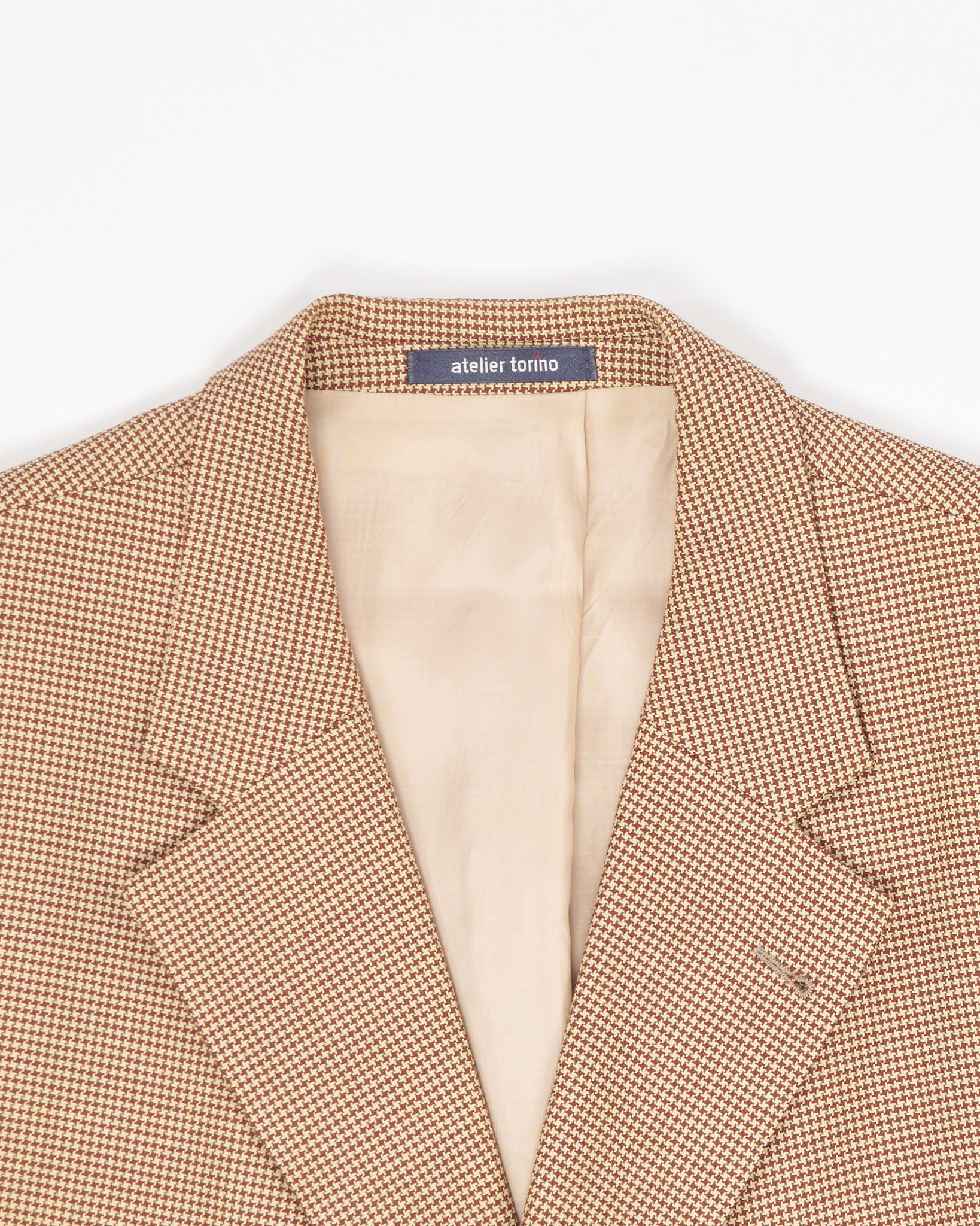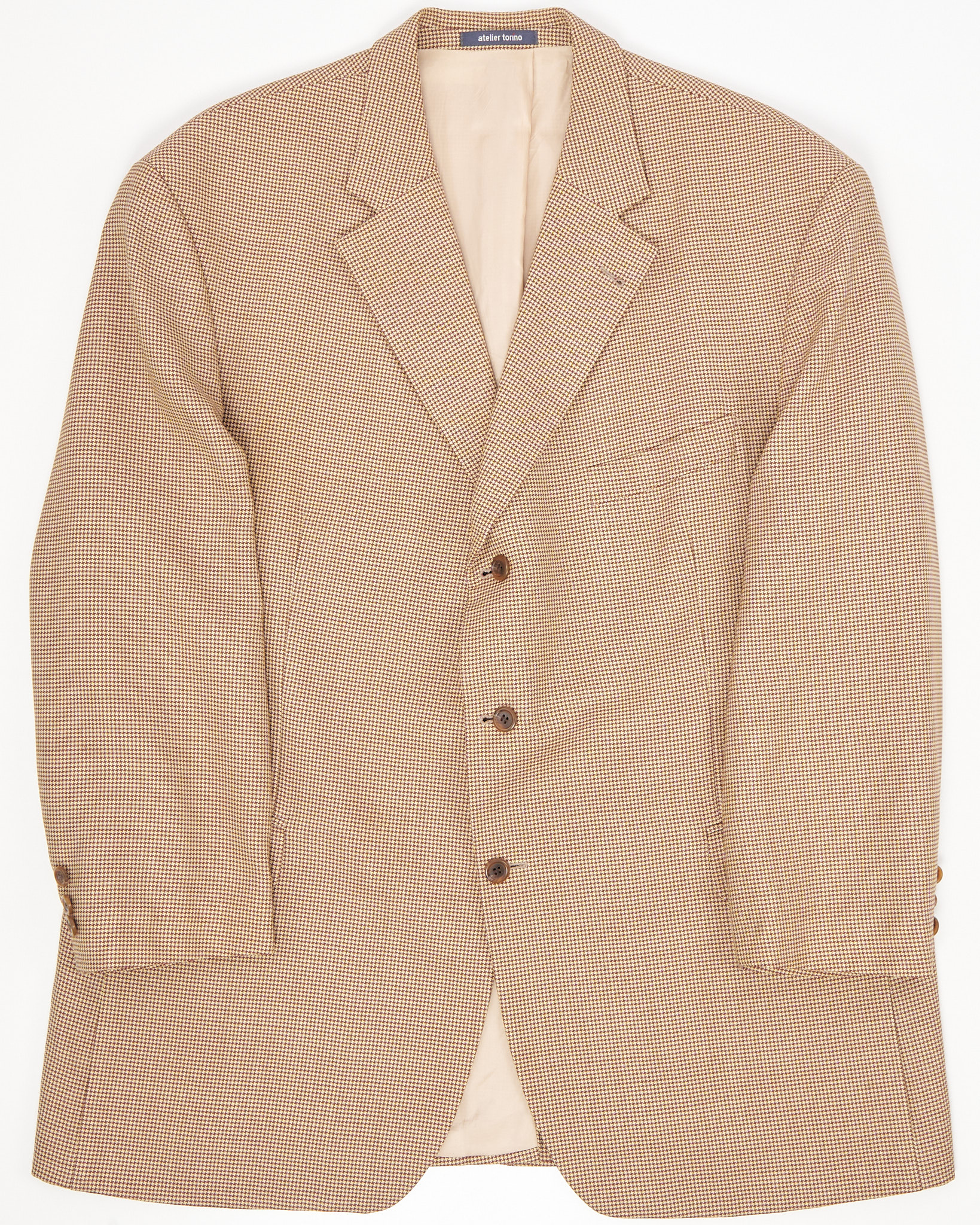 Классический мужской пиджак от немецкого бренда Atelier Torino, выполненный из 100% шерсти, отмечен знаком woolmark. Мелкий клетчатый узор в бежево-коричневой гамме. Внутренняя часть оформлена гладкой бежевой подкладкой, по бокам карманы с клапанами.Классические лацканы.