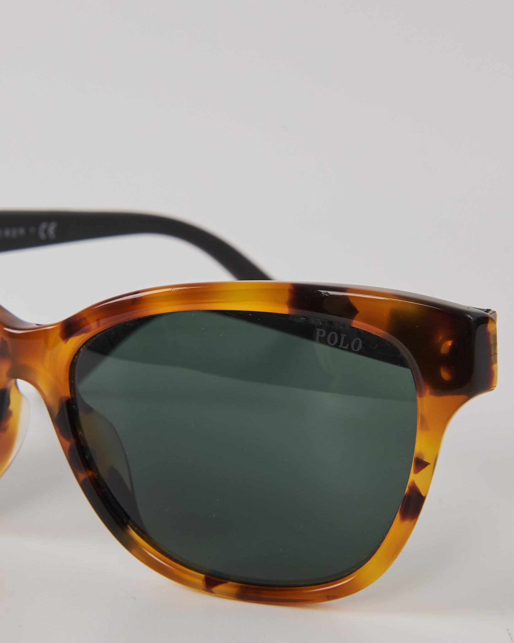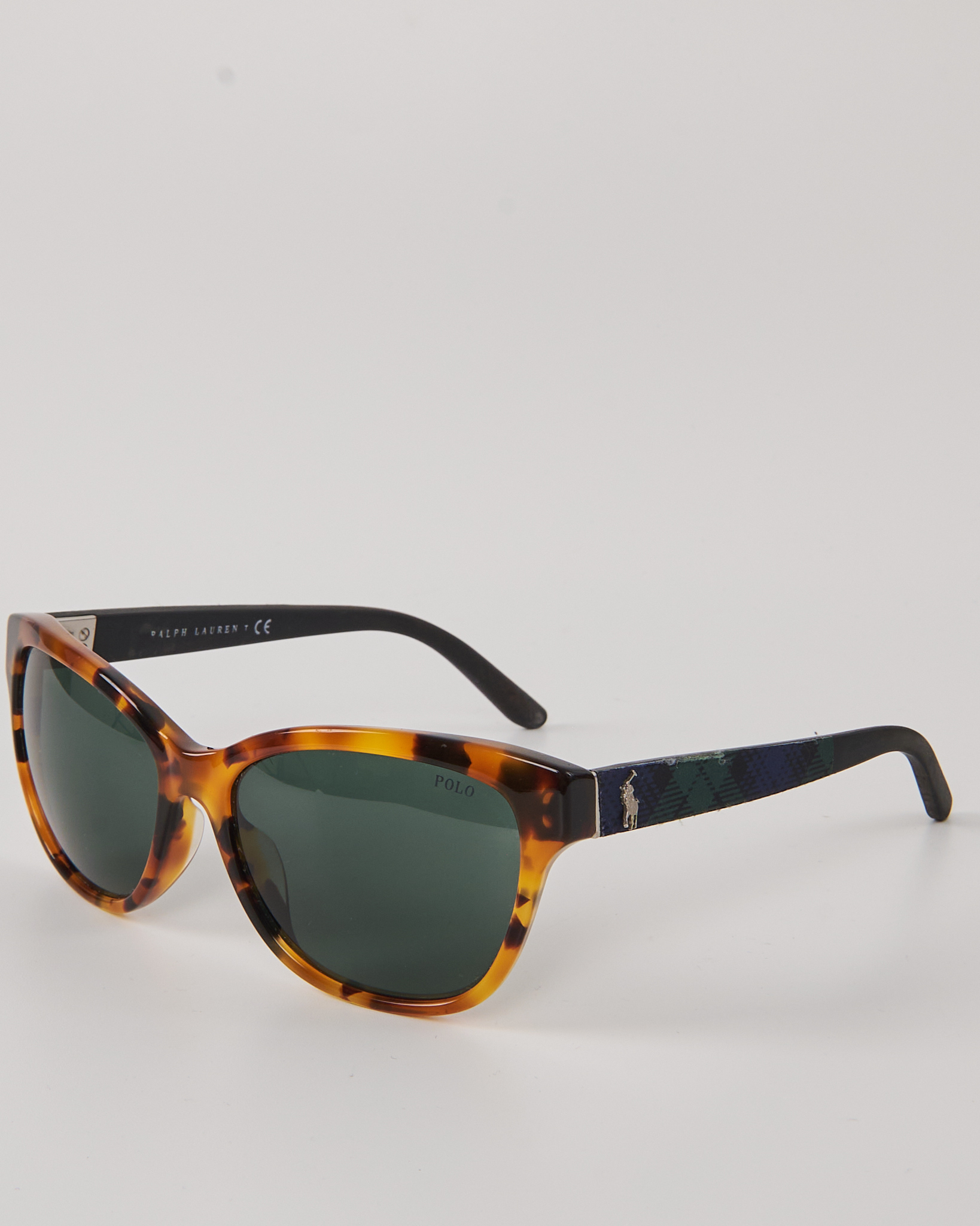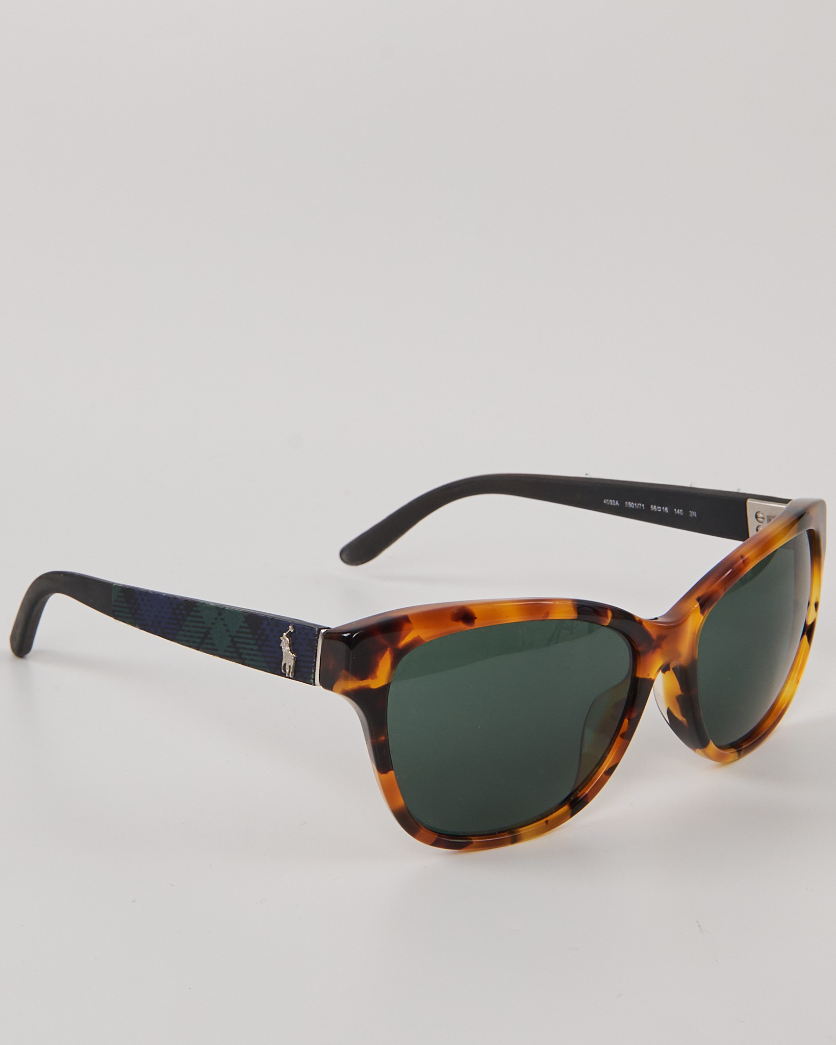 Солнцезащитные очки Polo Ralph Lauren в оправе тёплого черепахового оттенка. Комфортная посадка, зелёные линзы создают глубокий контраст с тёплым тоном оправы. Дужки украшены клетчатым рисунком и металлическим всадником Polo.