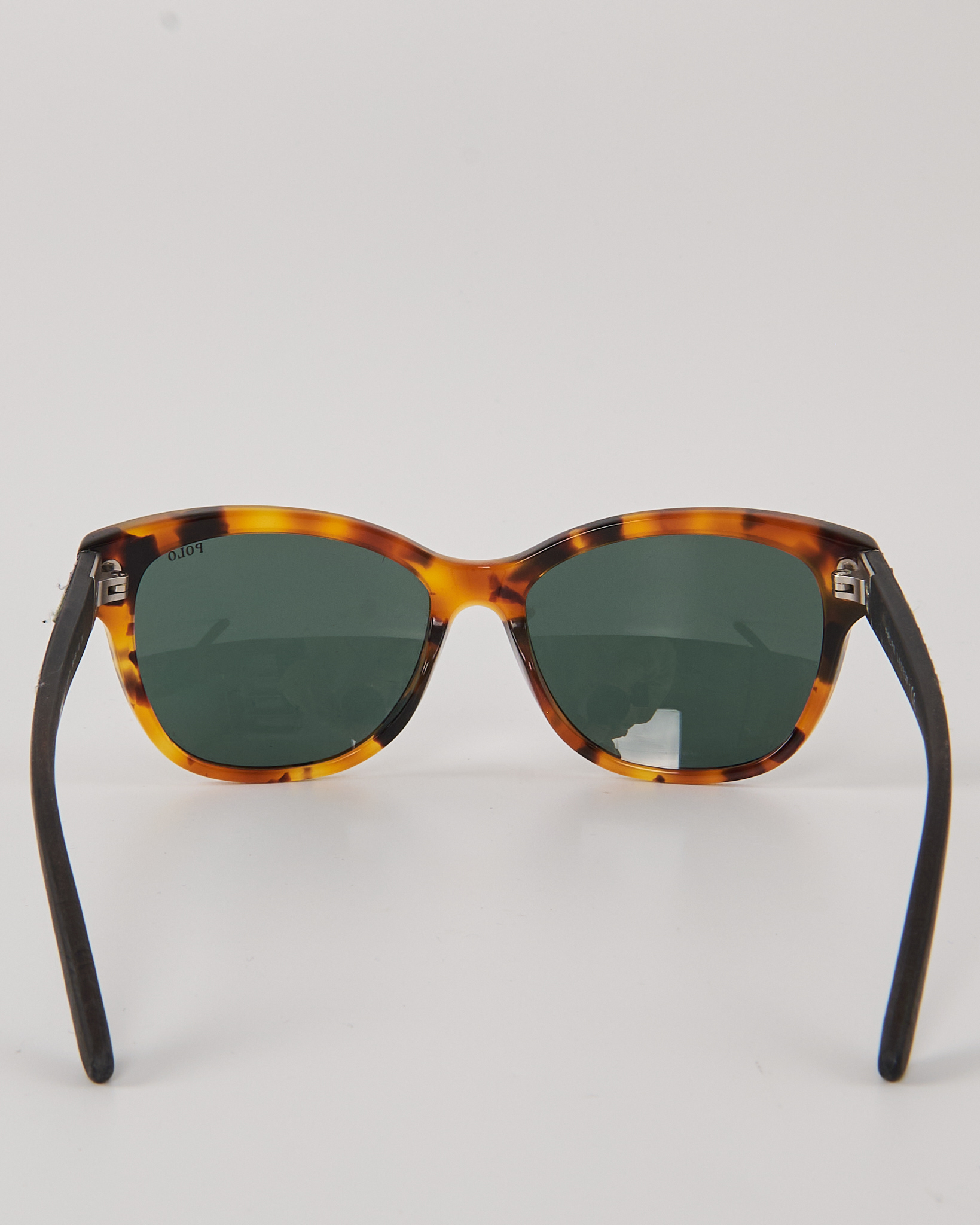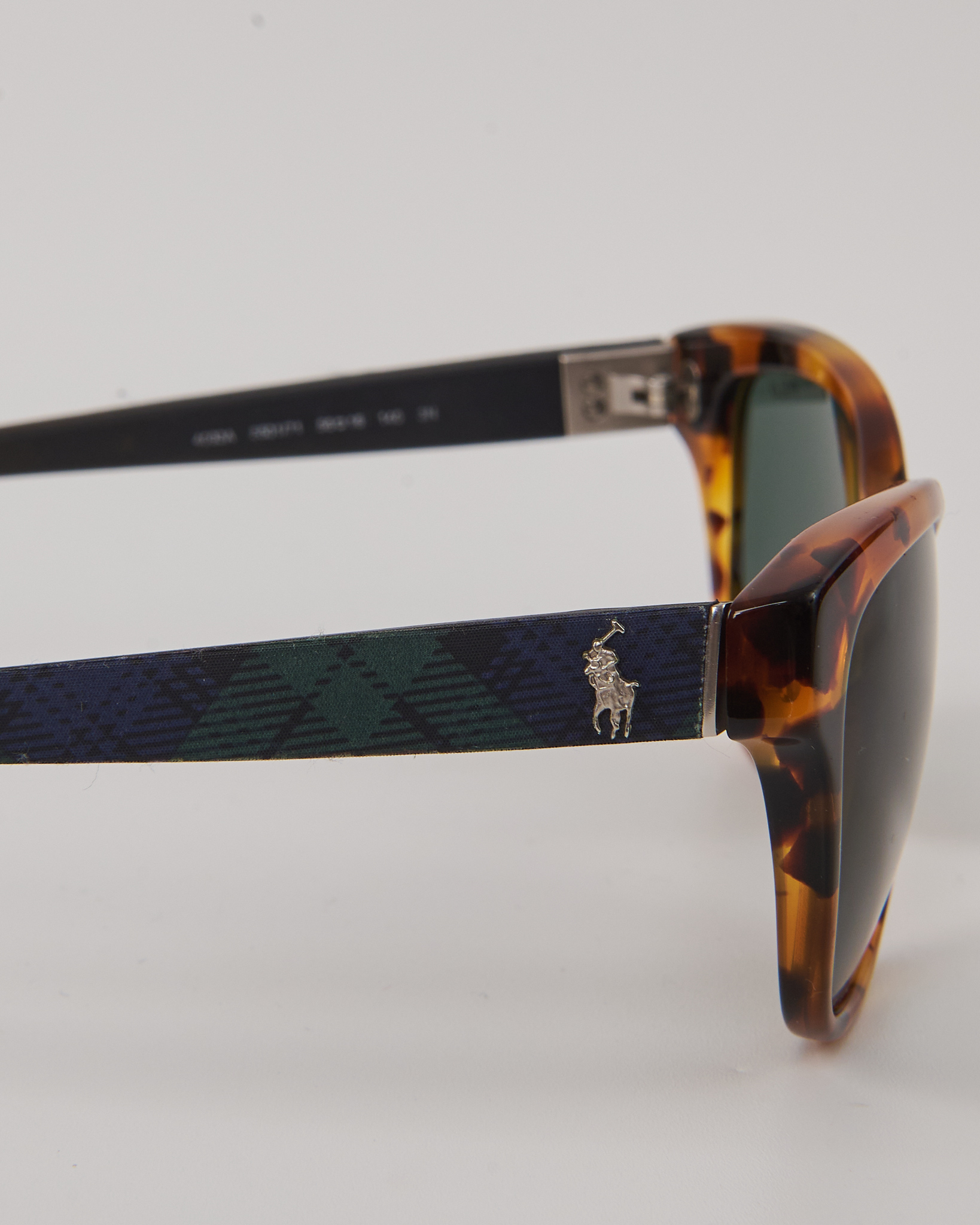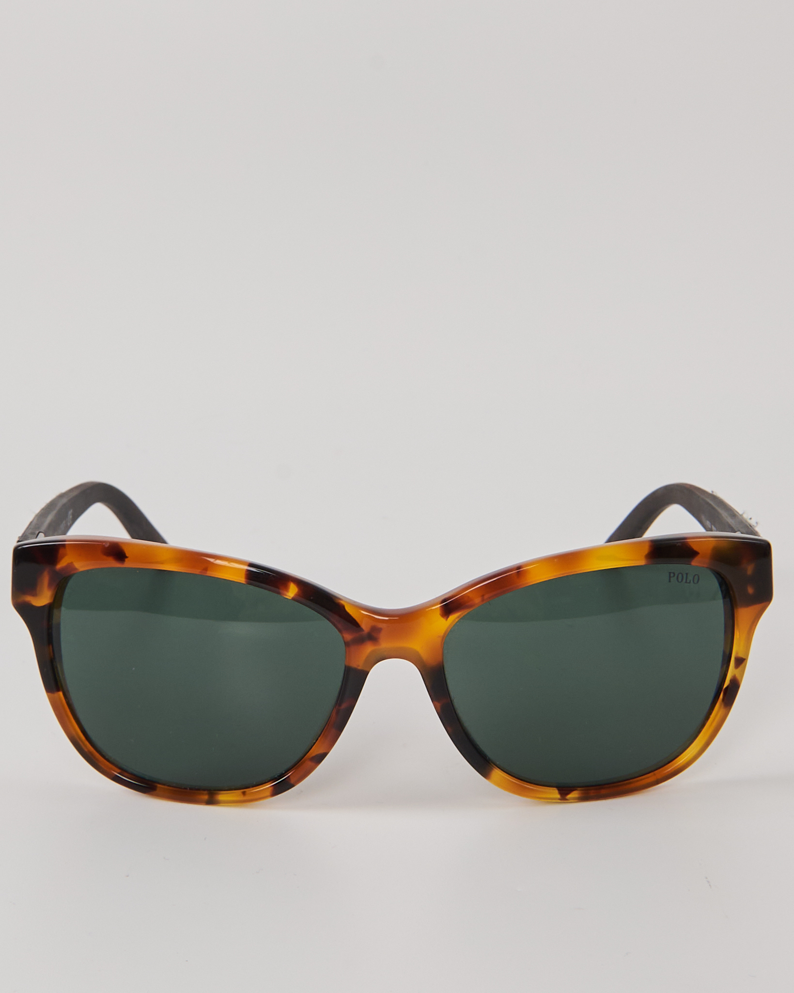 Солнцезащитные очки Polo Ralph Lauren в оправе тёплого черепахового оттенка. Комфортная посадка, зелёные линзы создают глубокий контраст с тёплым тоном оправы. Дужки украшены клетчатым рисунком и металлическим всадником Polo.