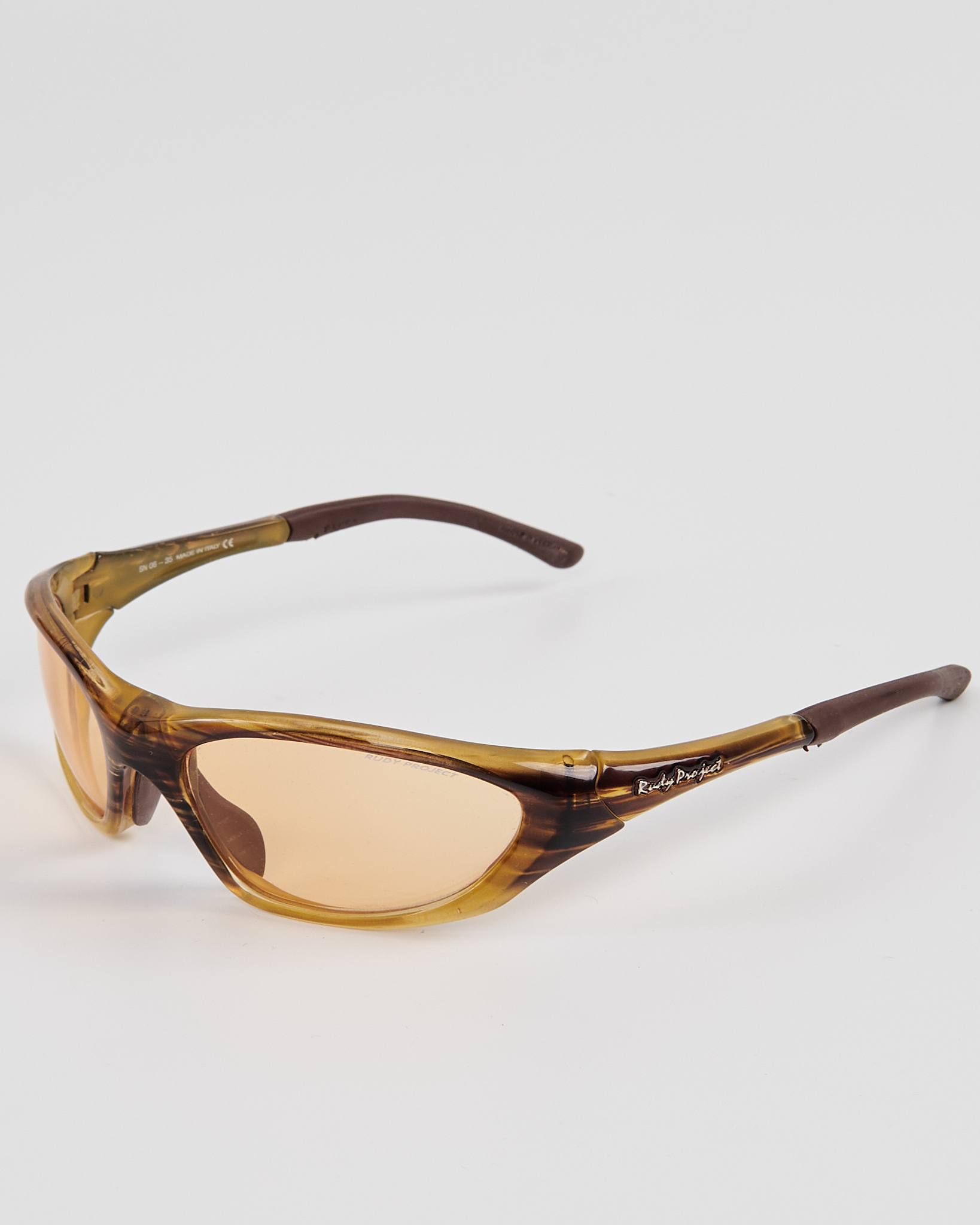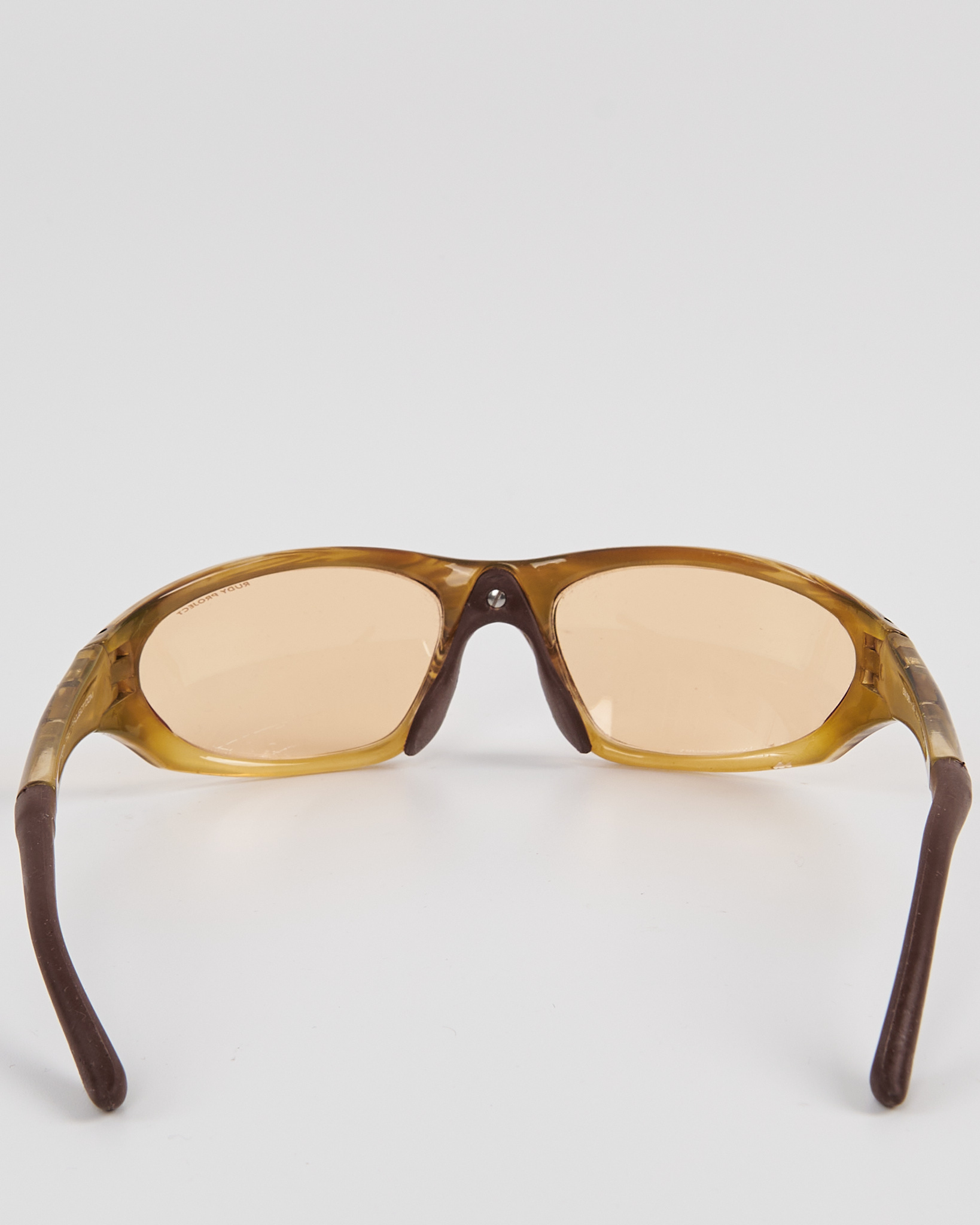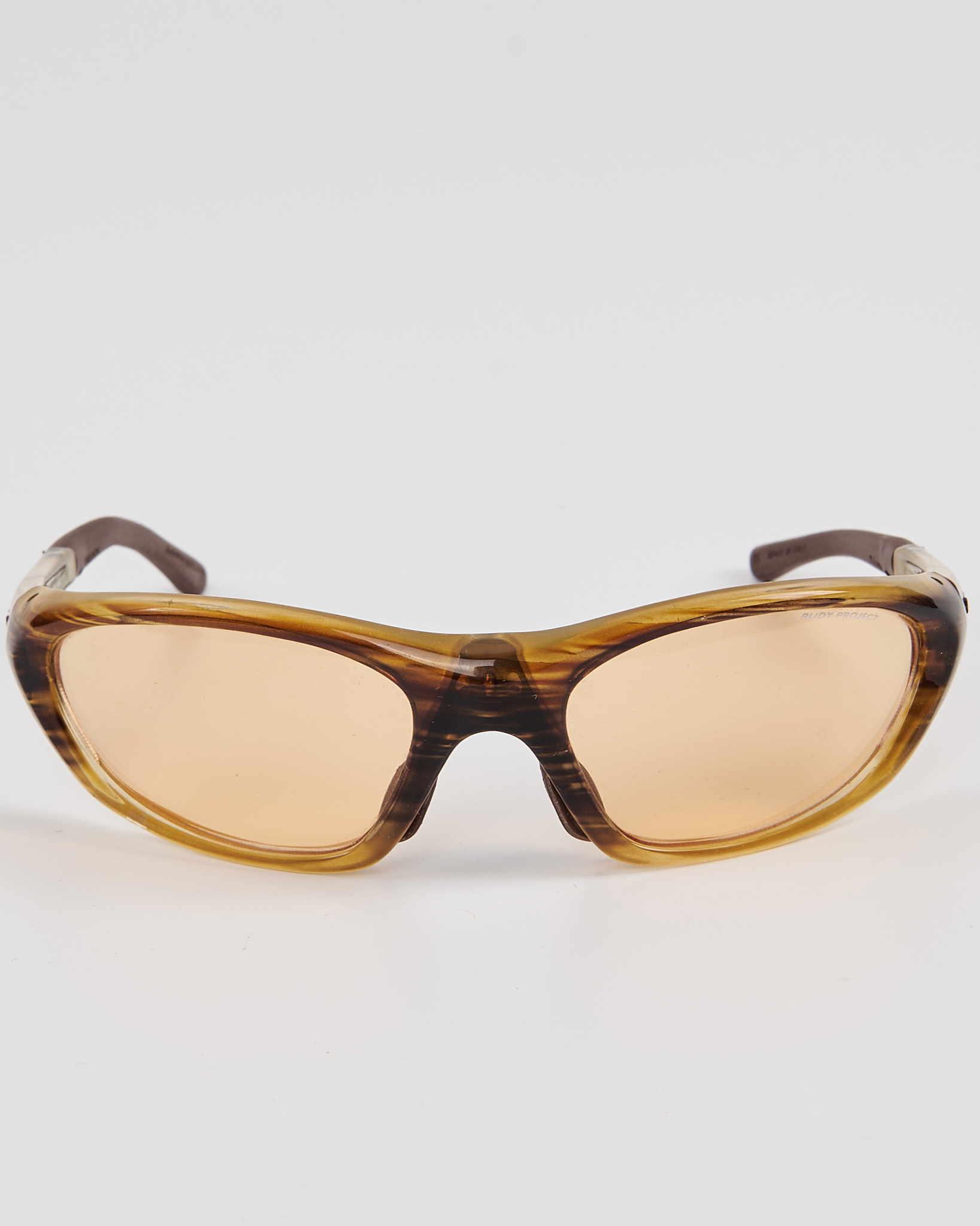 Очки Rudy Project в выразительной оправе из плотного полупрозрачного пластика тёплого янтарного оттенка. Комфортная посадка, линзы мягкого карамельного оттенка, в комплекте съемные линзы.