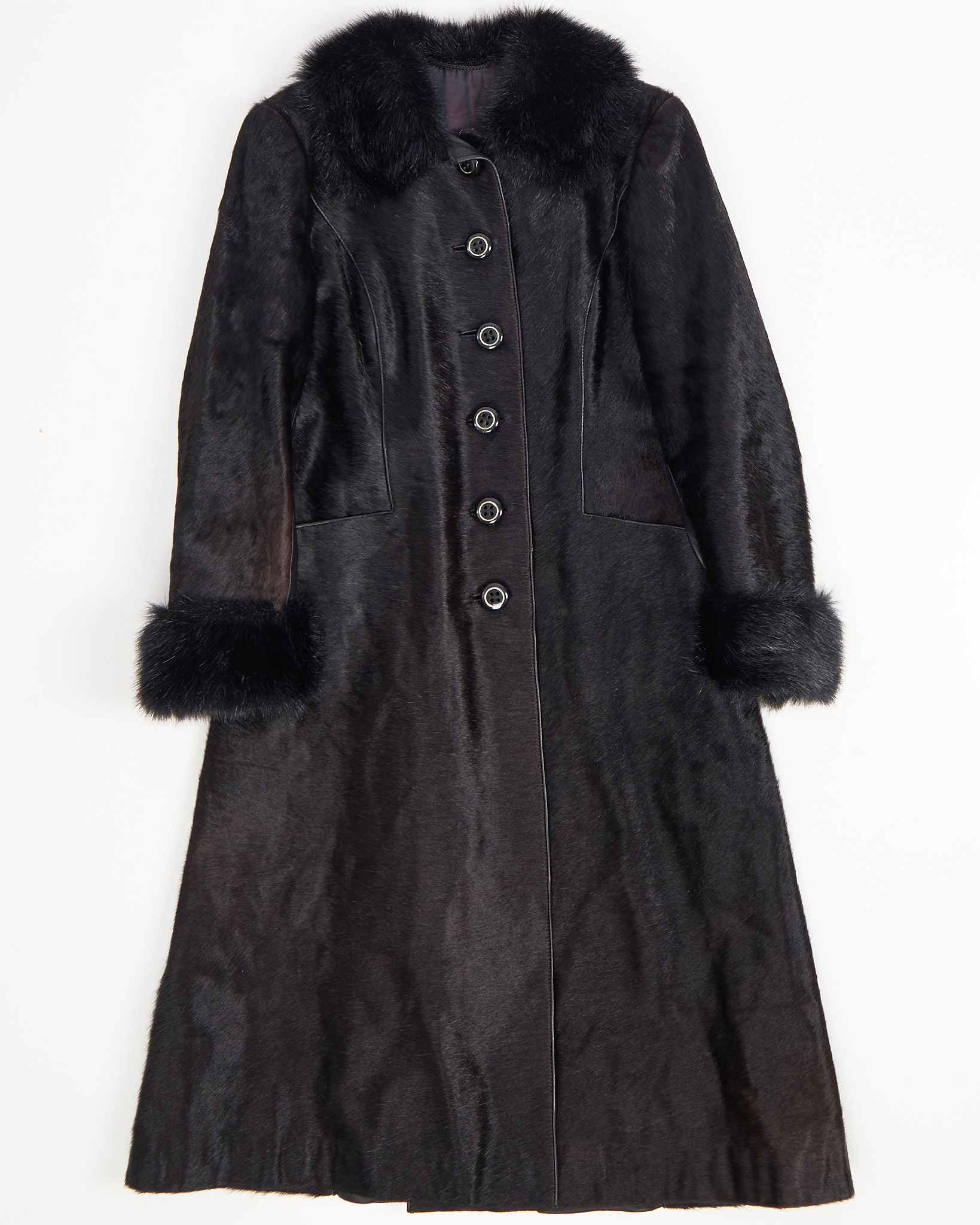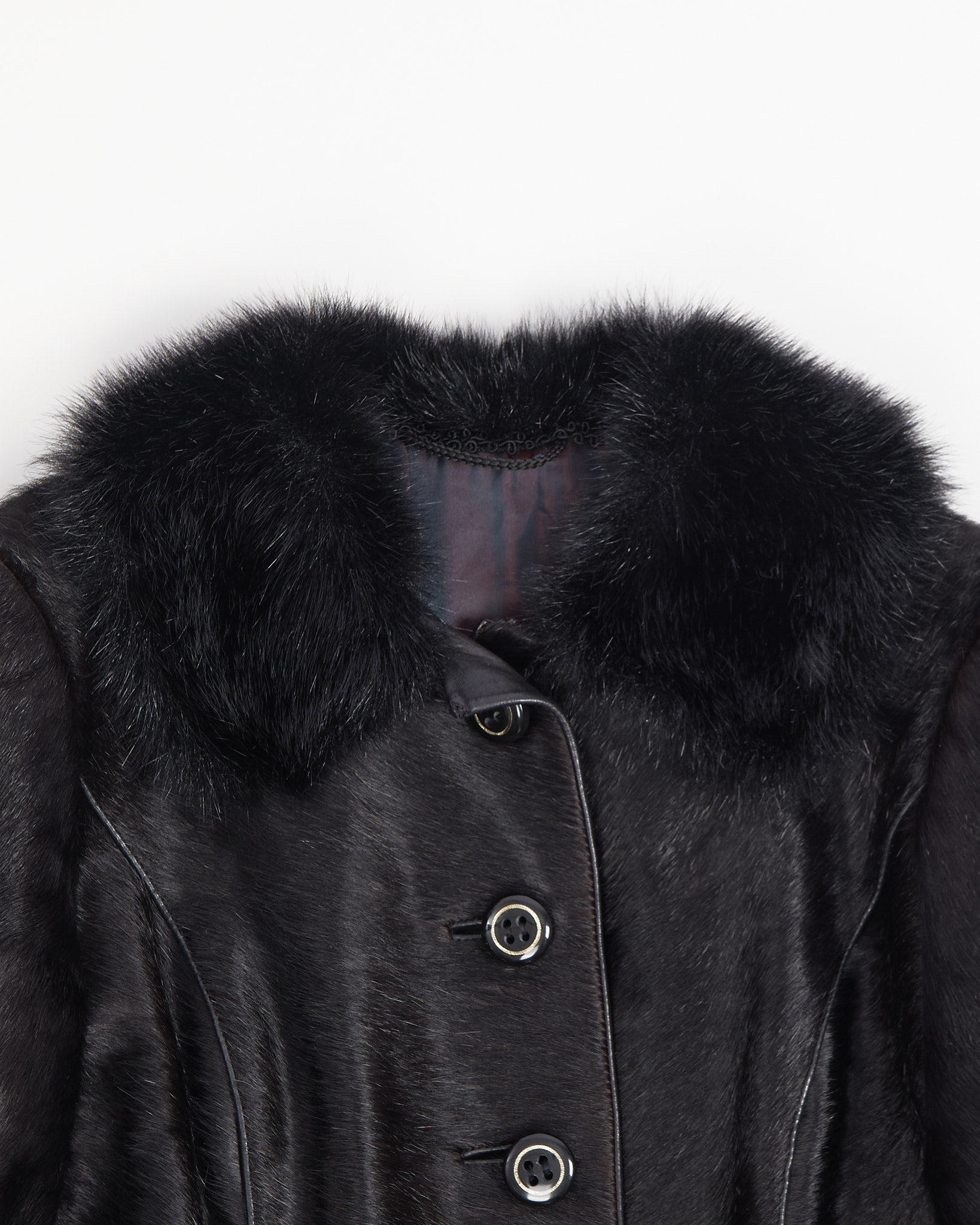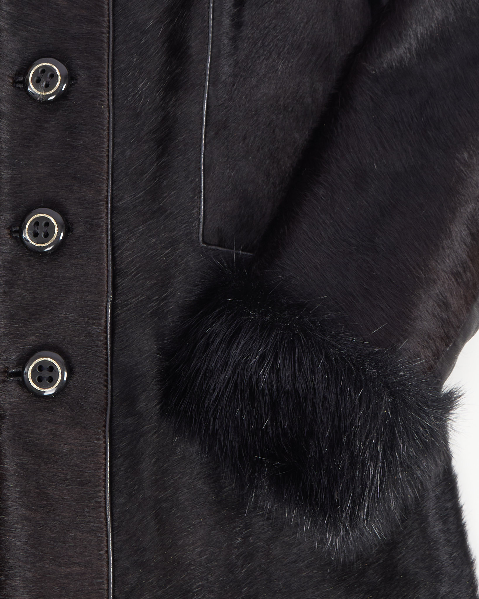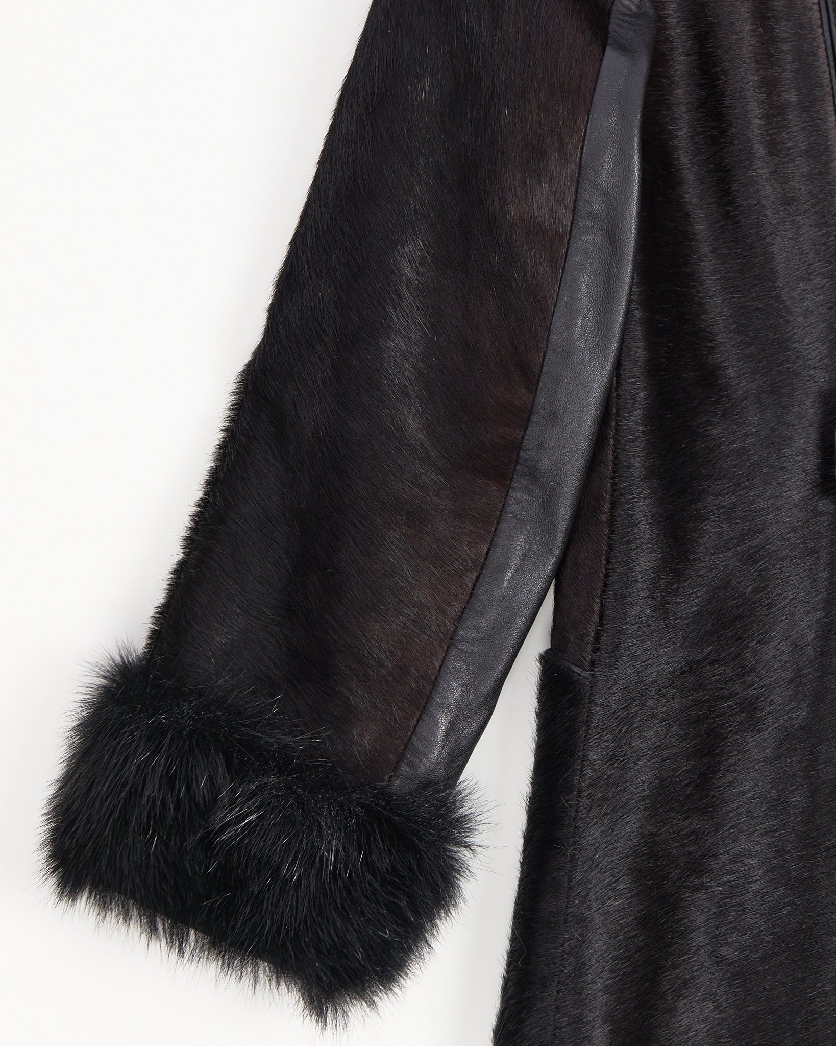 Черное пальто из меха пони. Короткий и блестящий ворс, объемная пушистая оторочка на воротнике и манжетах. Приталенный крой четко, вертикальные кожаные вставки по бокам и на рукавах визуально вытягивают силуэт.
