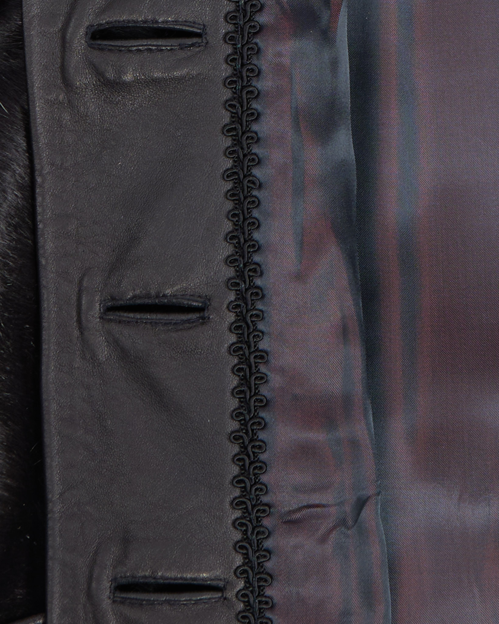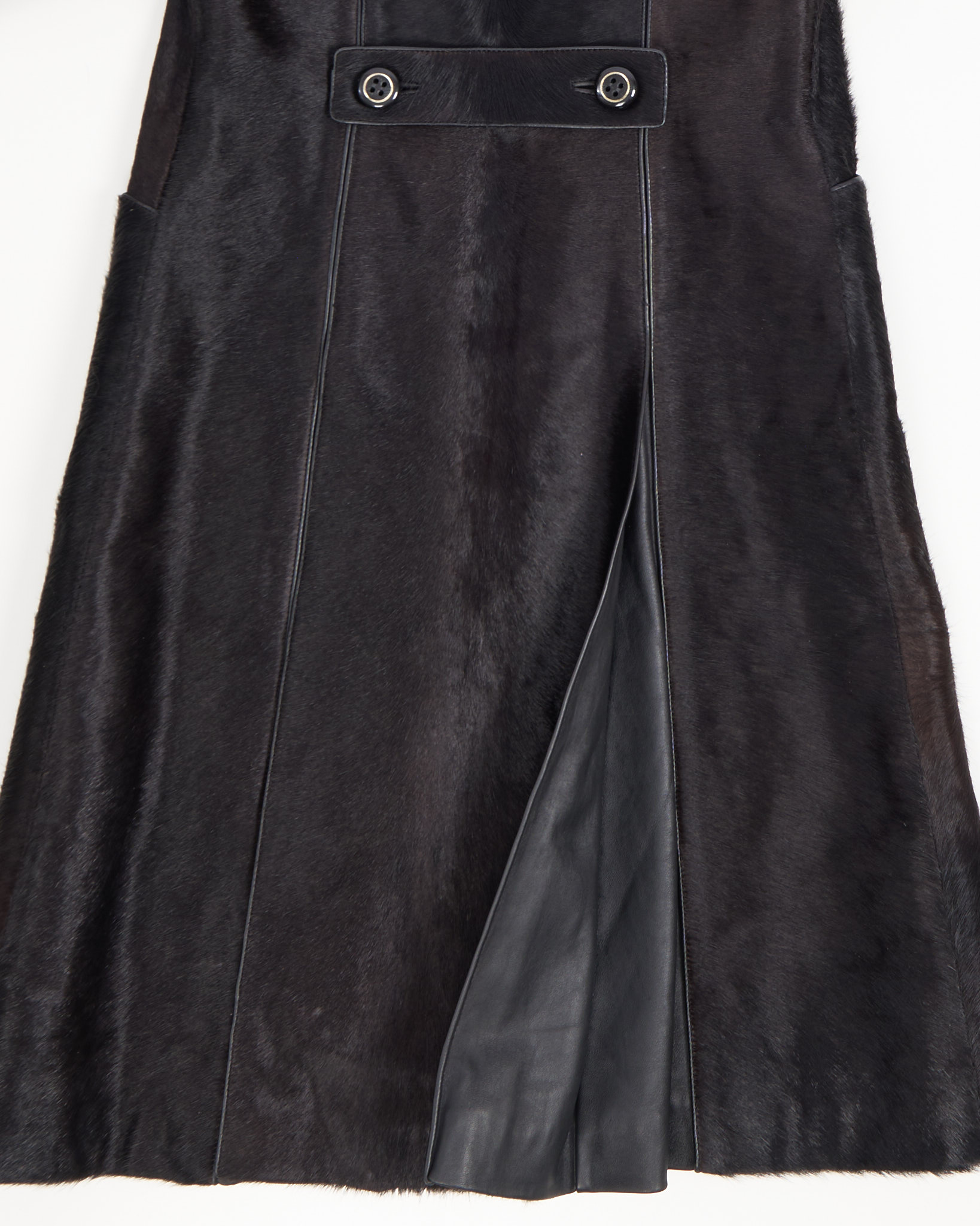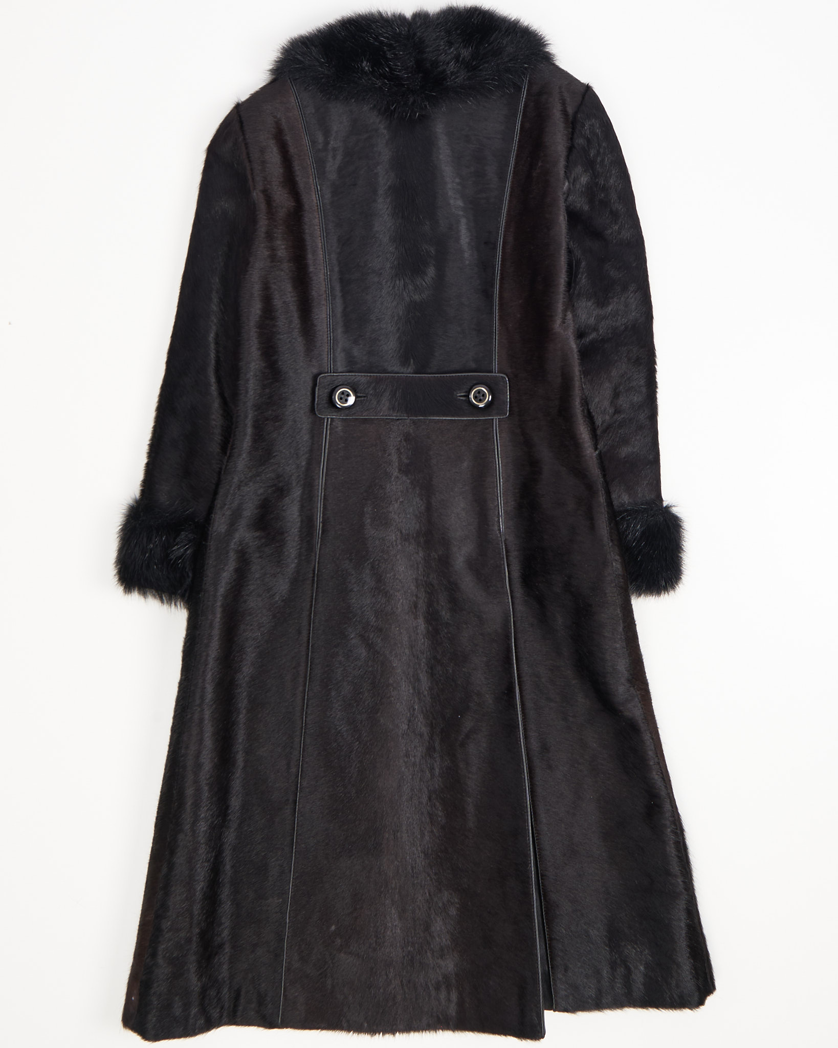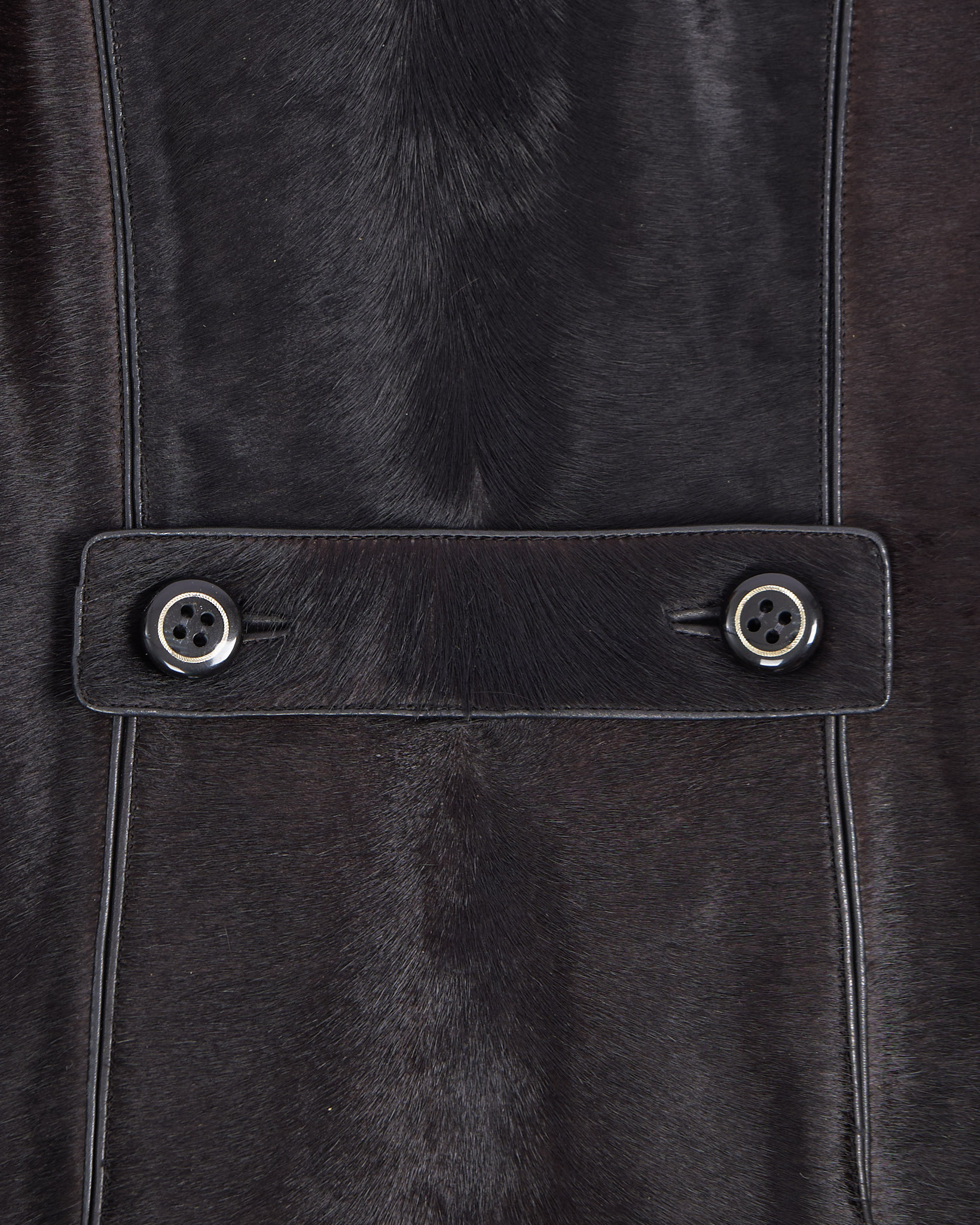 Черное пальто из меха пони. Короткий и блестящий ворс, объемная пушистая оторочка на воротнике и манжетах. Приталенный крой четко, вертикальные кожаные вставки по бокам и на рукавах визуально вытягивают силуэт.