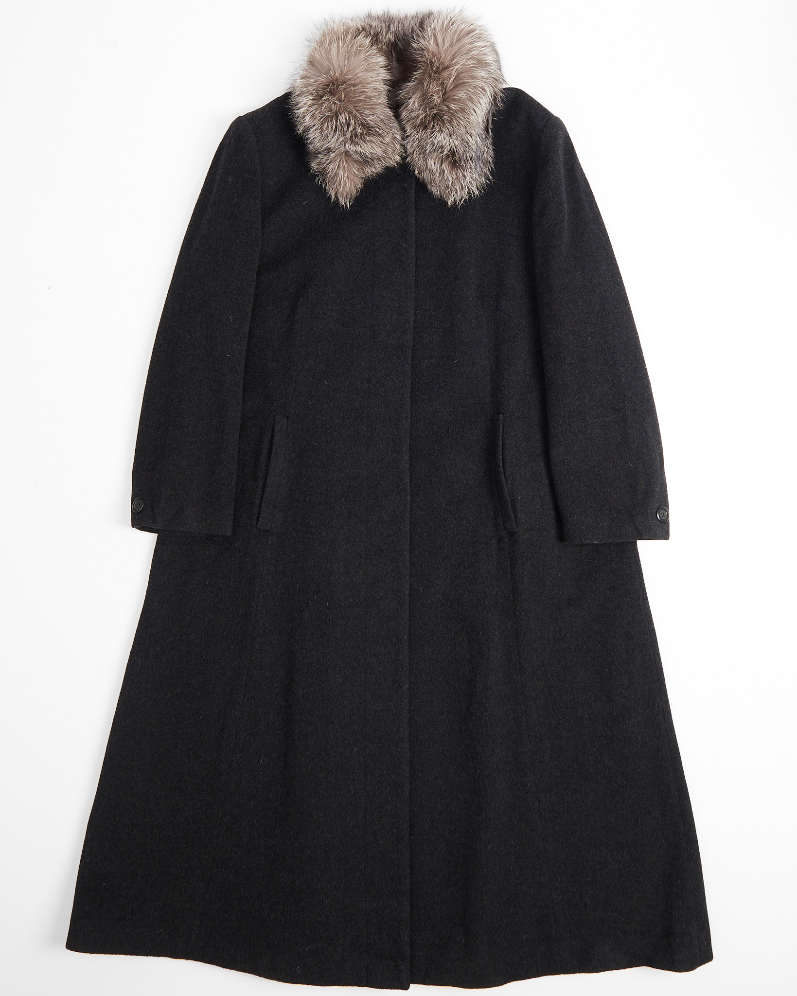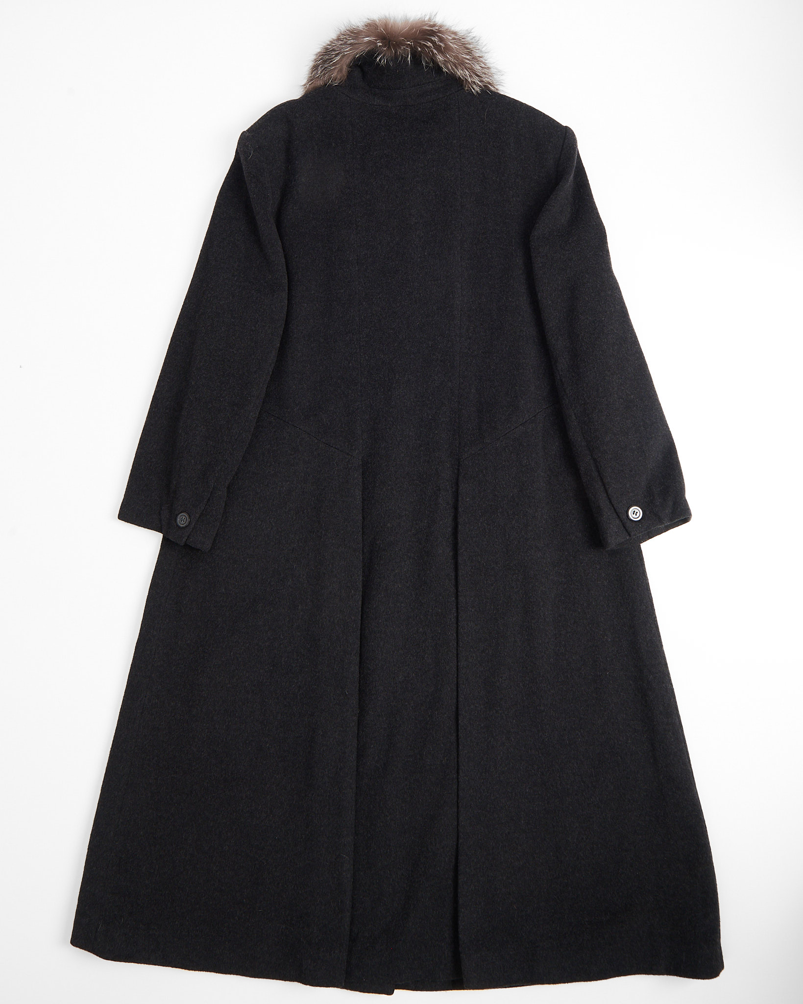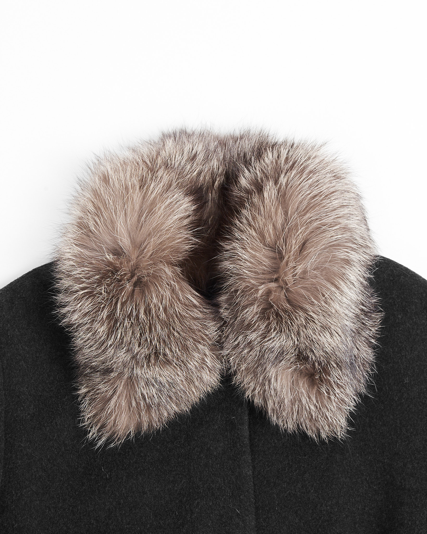 Пальто из шерсти и кашемира с меховым воротником. Прямой крой, свободная посадка по фигуре. Натуральный мех на воротнике, скрытая застежка.