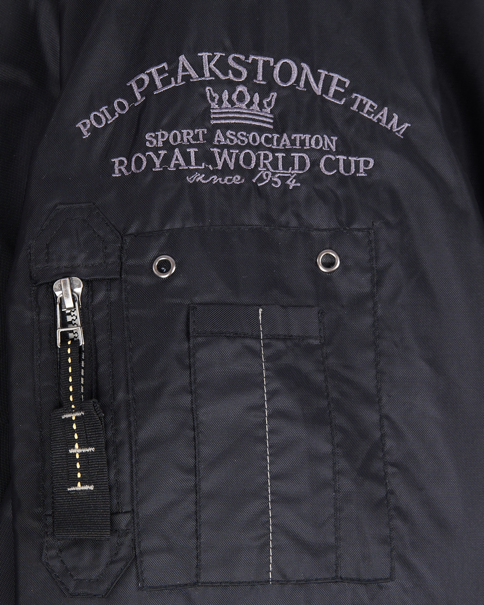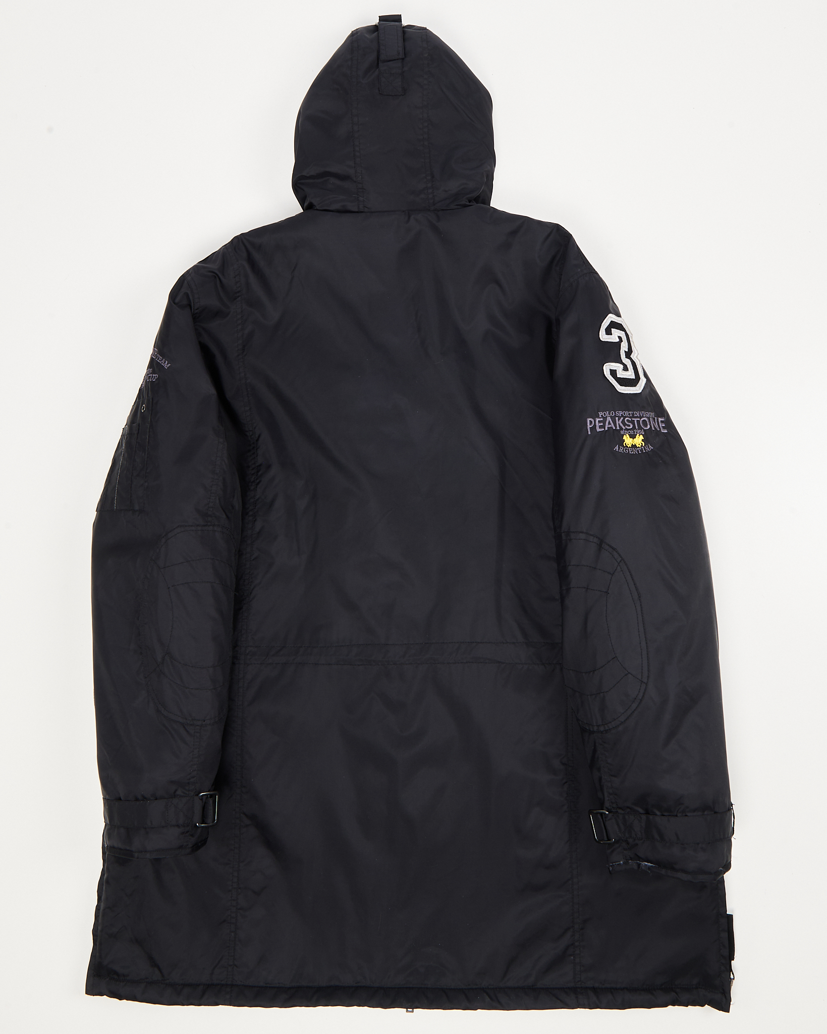 Парка Peakstone Polo Sport Division. Черная парка в спортивном стиле, прямой крой, свободная посадка. Детали в виде нашивок, вышивка и контрастные строчки. Множество карманов, утепленный капюшон.