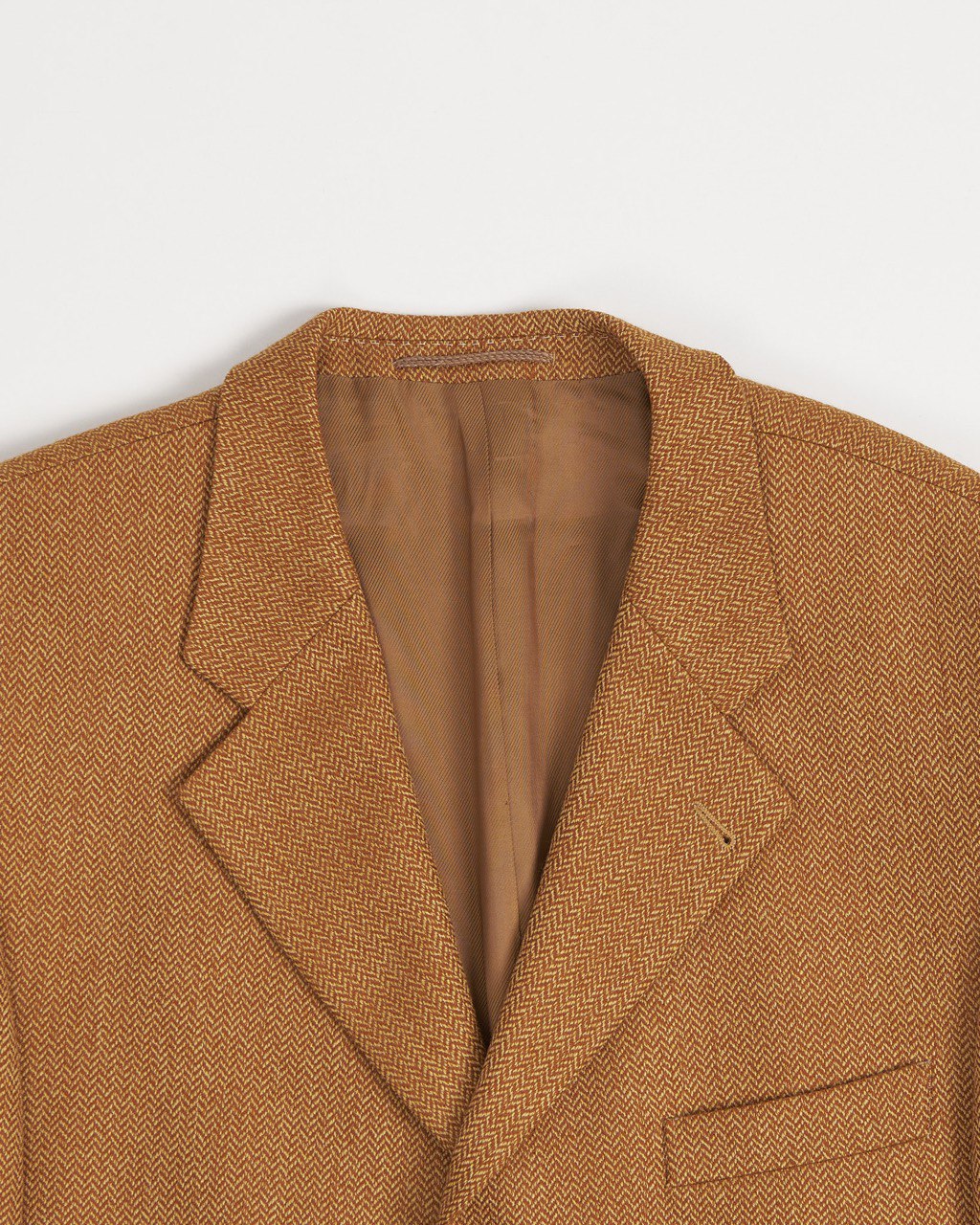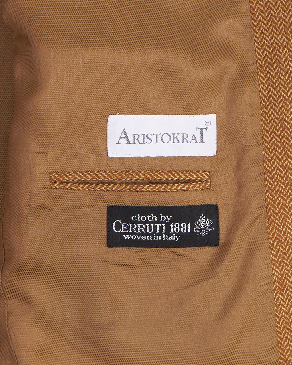 Горчичный пиджак из итальянской шерсти Cerruti 1881. Однобортный пиджак, прямой силуэт, свободная посадка по фигуре.