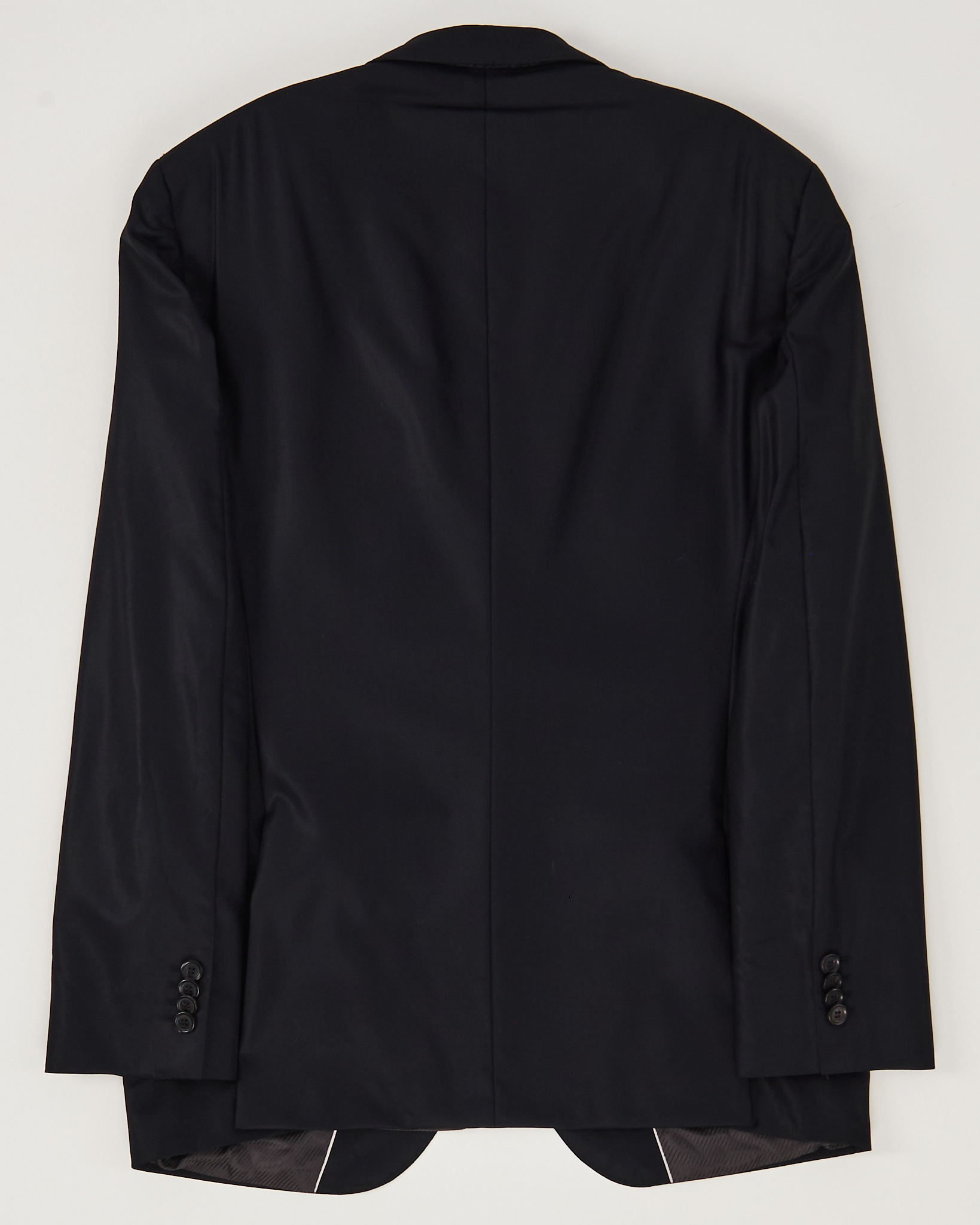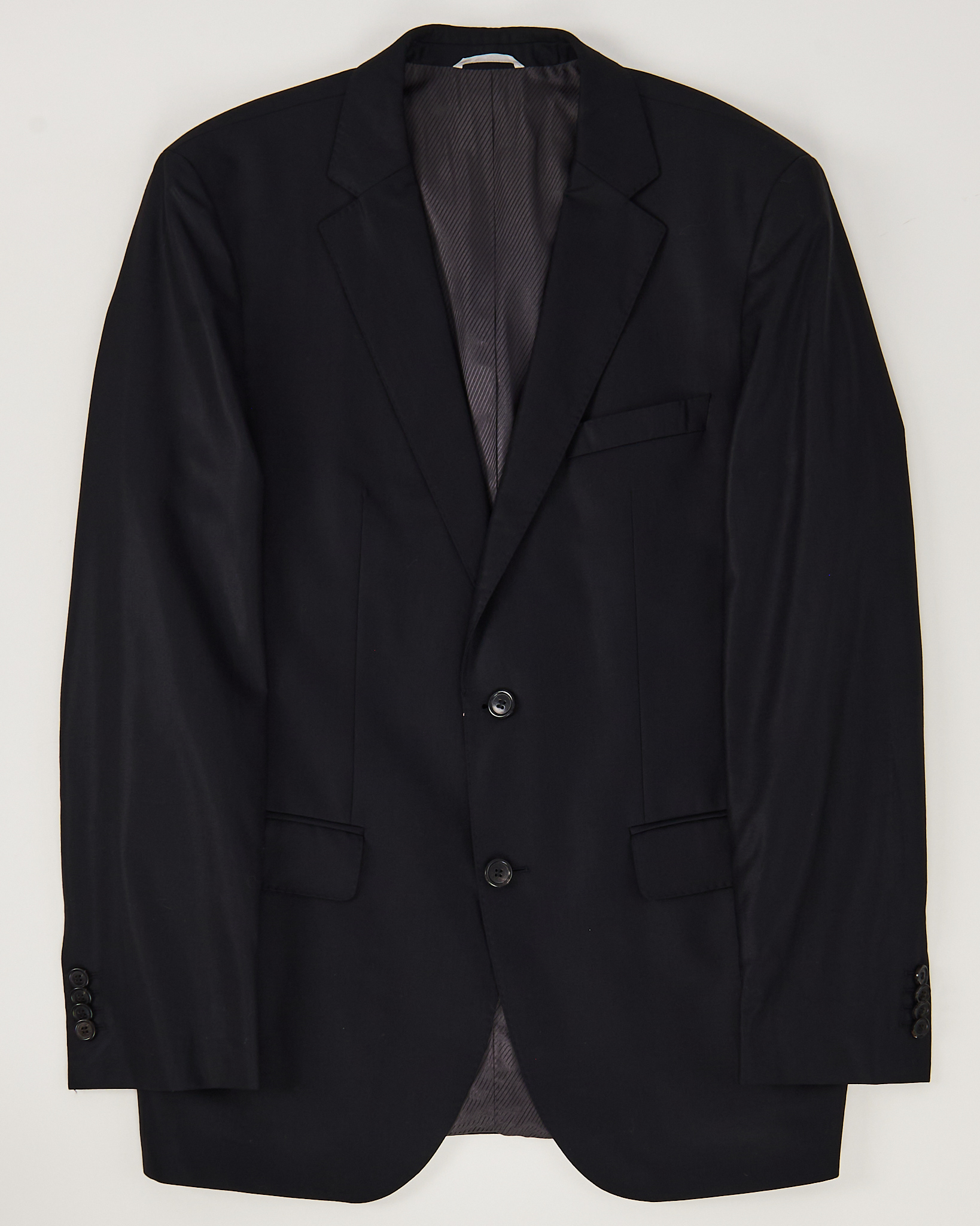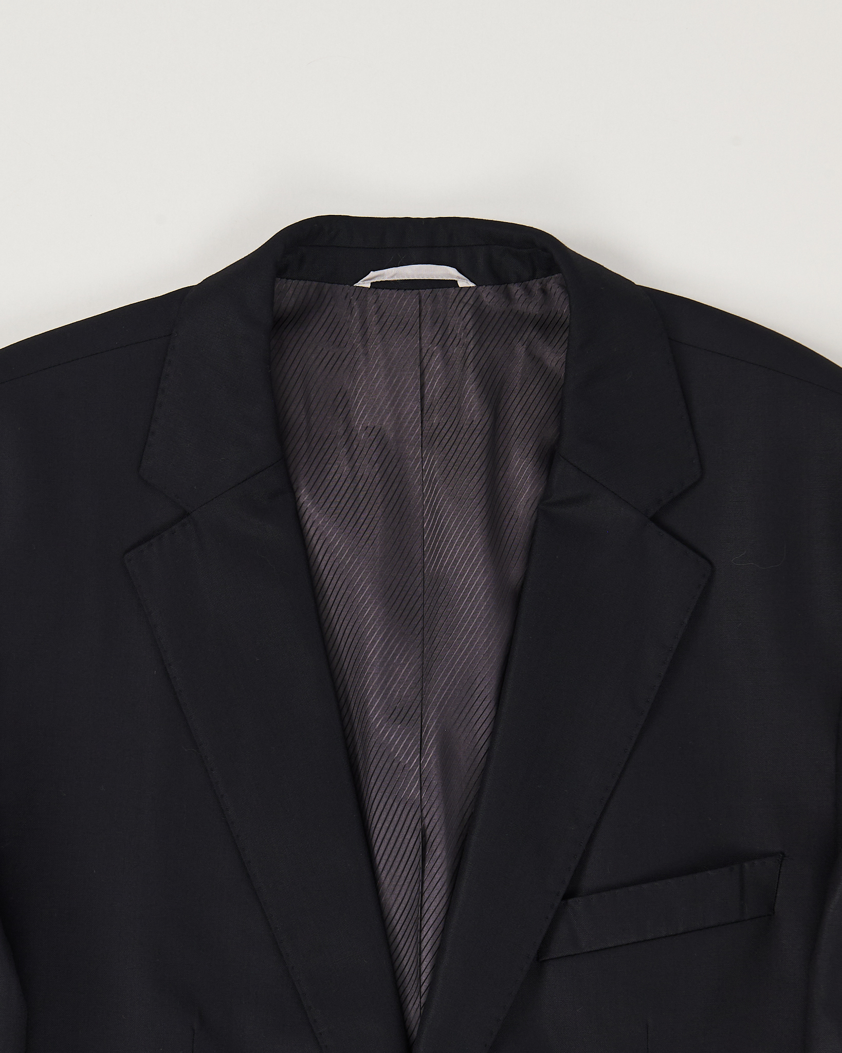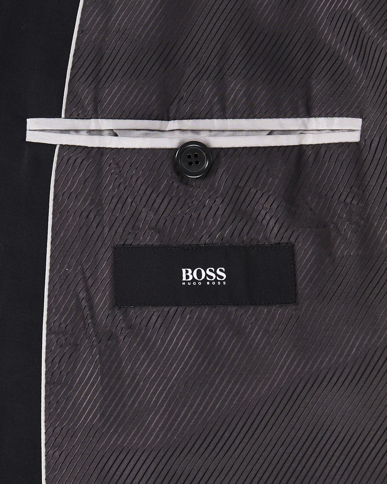 Пиджак из шерсти Hugo Boss. Двубортный воротник, прямой крой, свободная посадка. Контрастная подкладка в полоску, функциональные карманы.