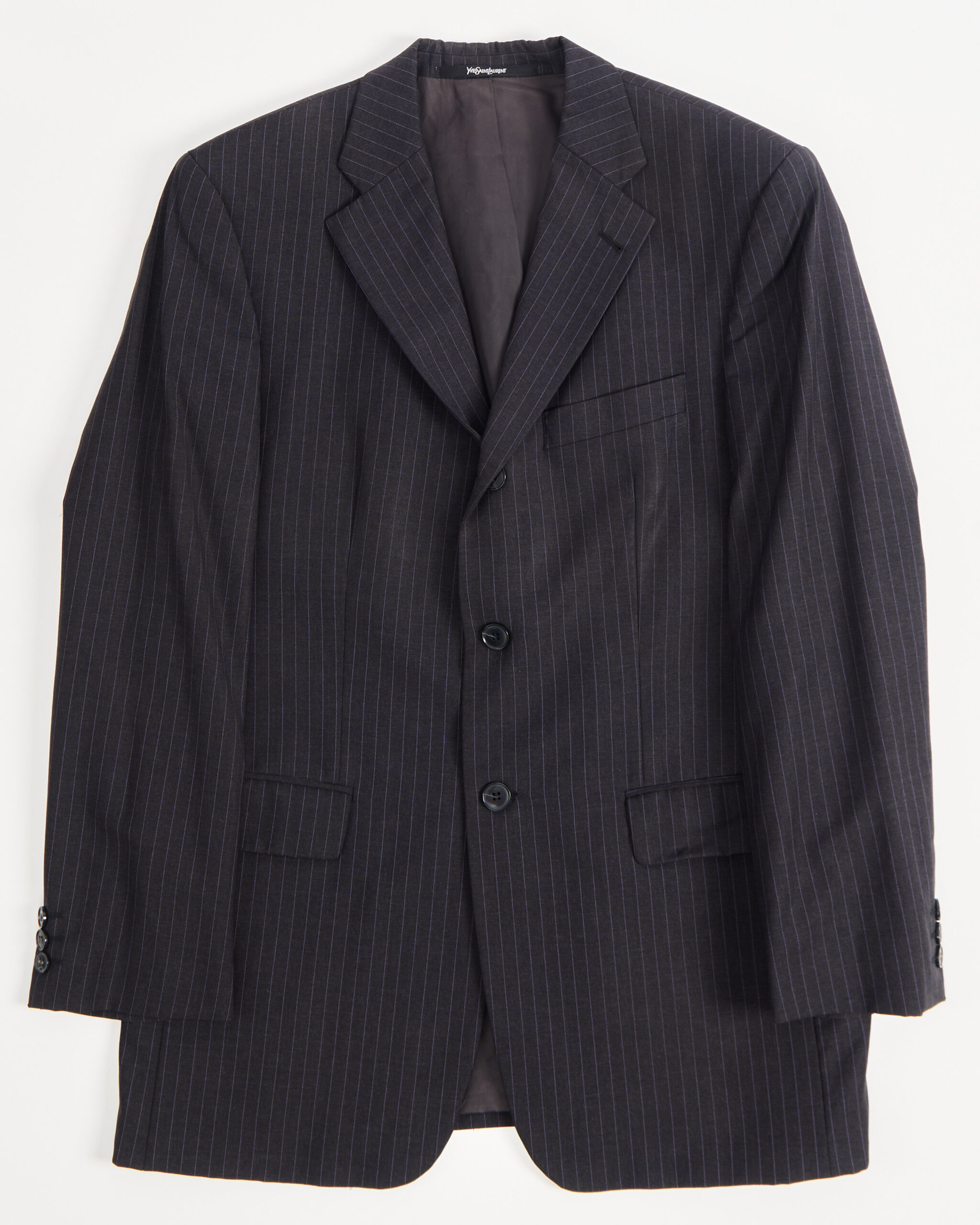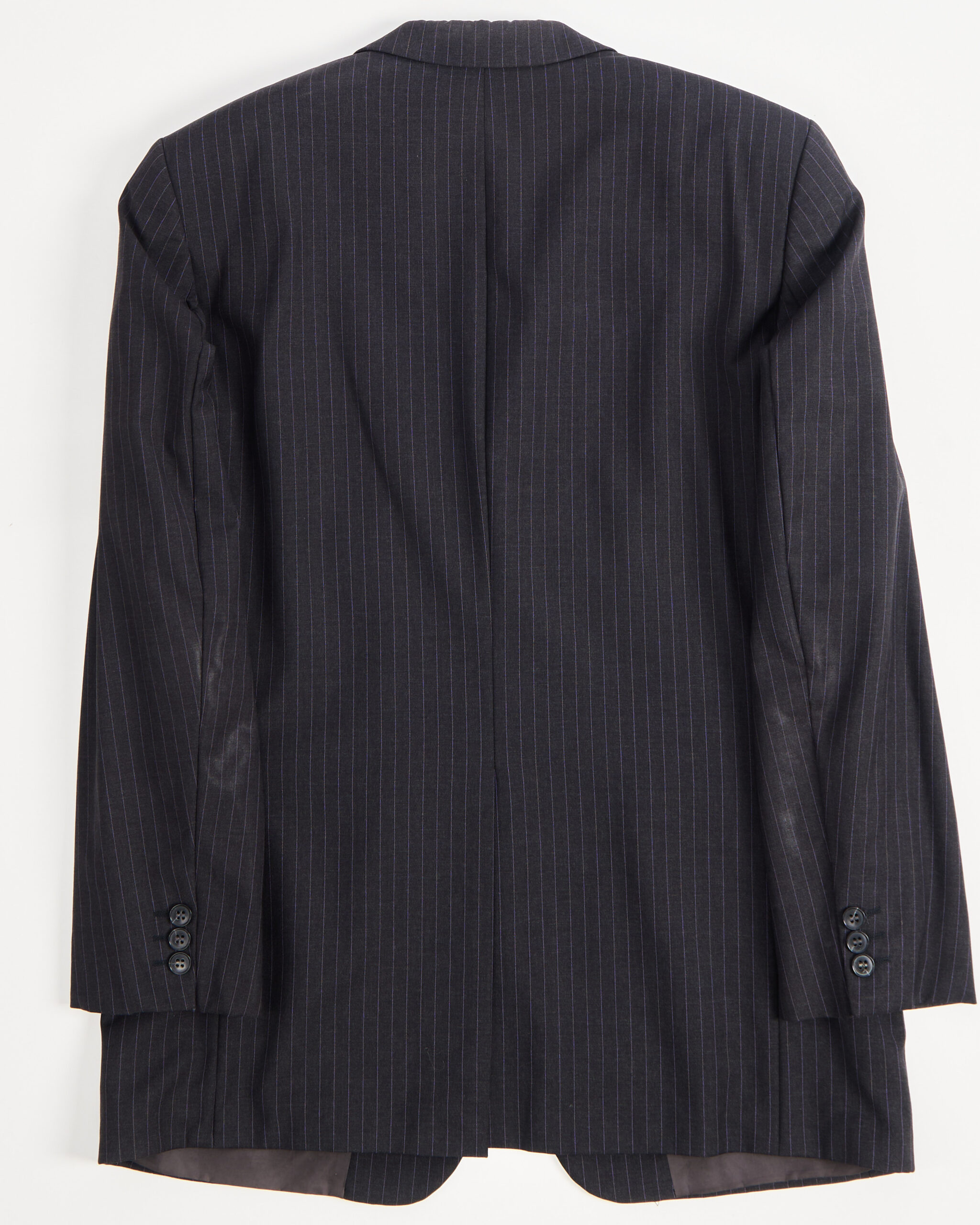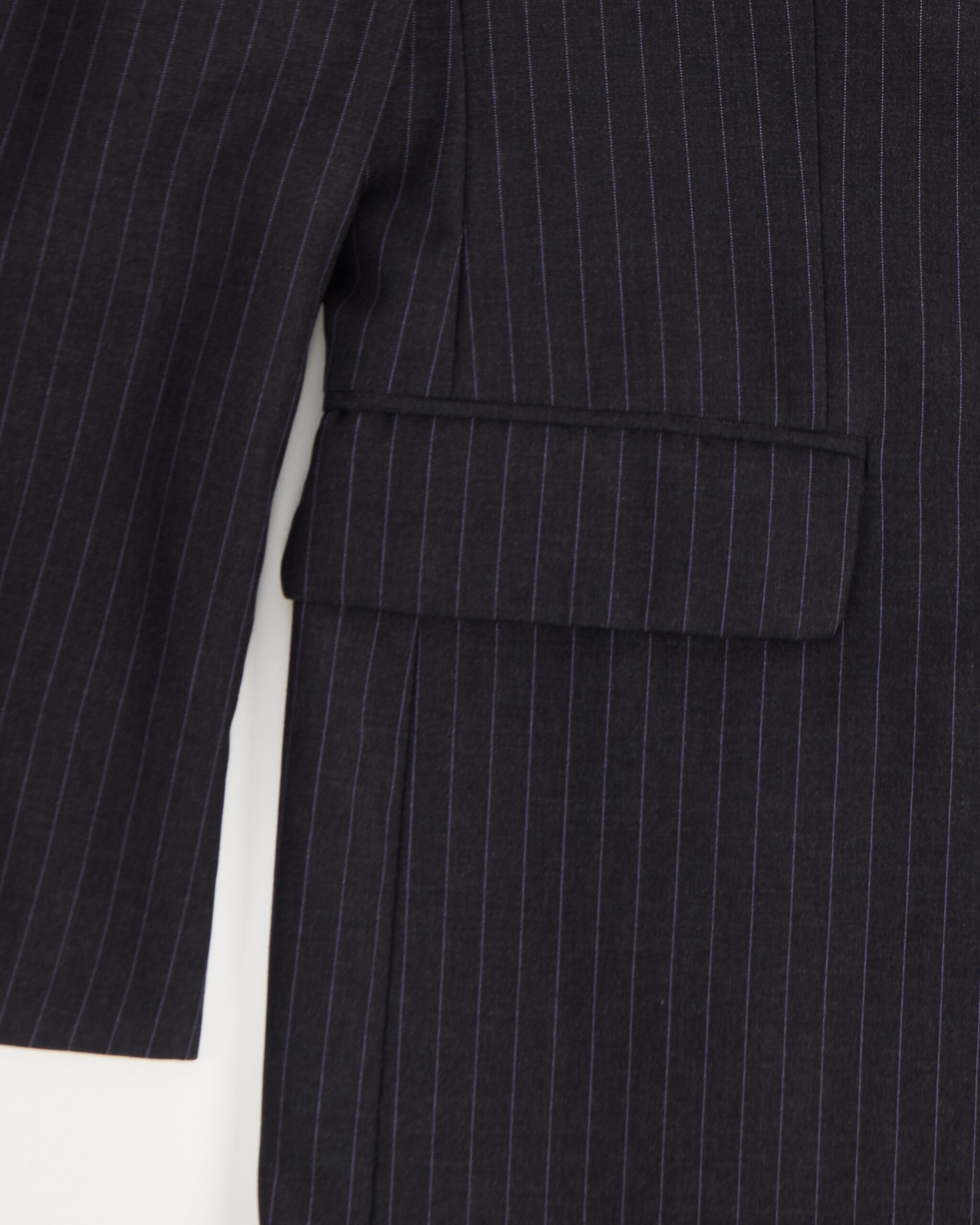 Пиджак из премиальной шерсти цвета графит в тонкую фиолетовую полоску. Вещь с мужского плеча, классического прямого силуэта. Сядет как небольшой oversize на девушек размера S/M