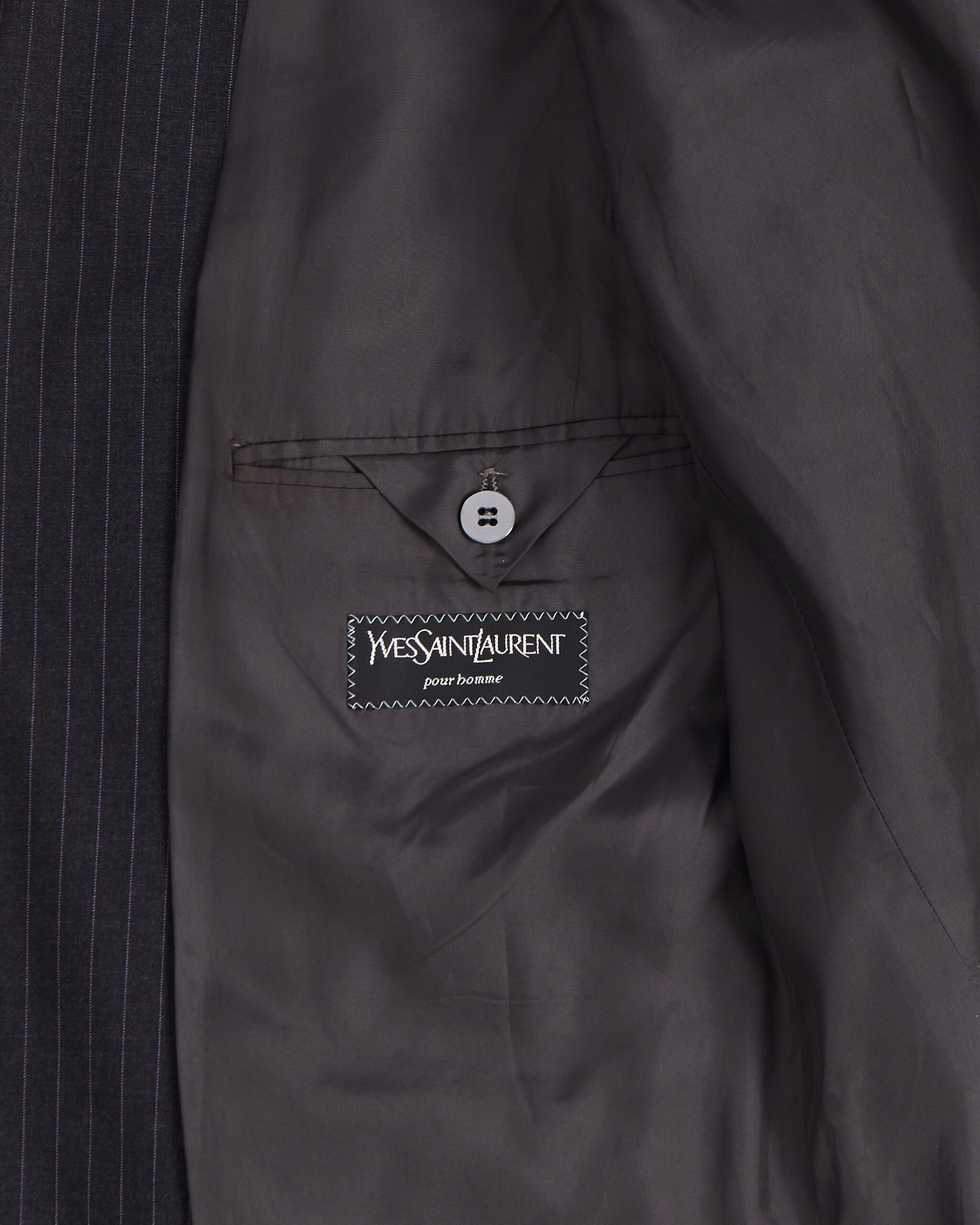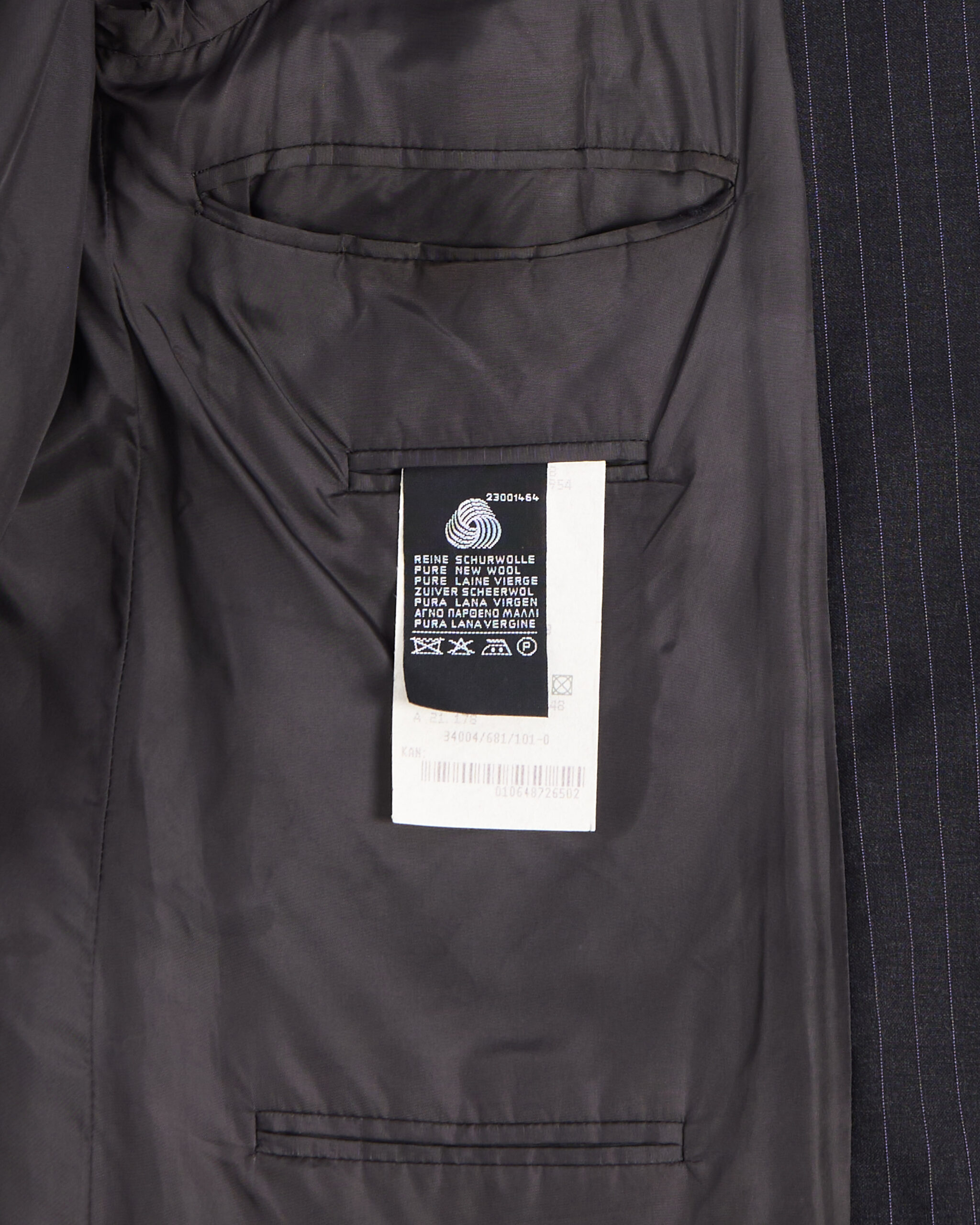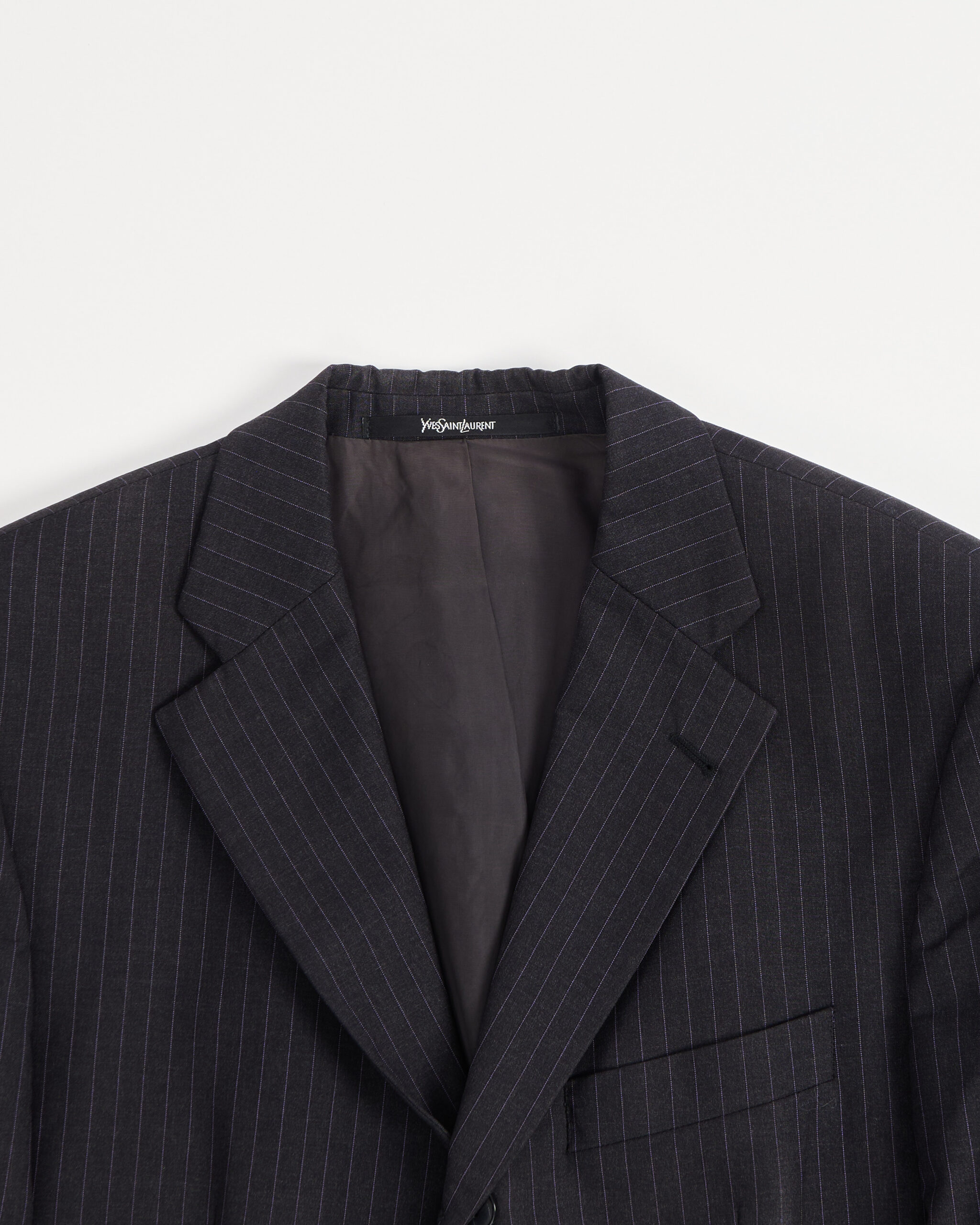 Пиджак из премиальной шерсти цвета графит в тонкую фиолетовую полоску. Вещь с мужского плеча, классического прямого силуэта. Сядет как небольшой oversize на девушек размера S/M
