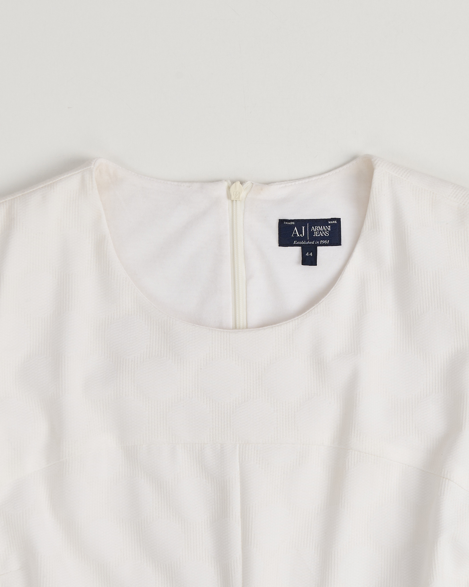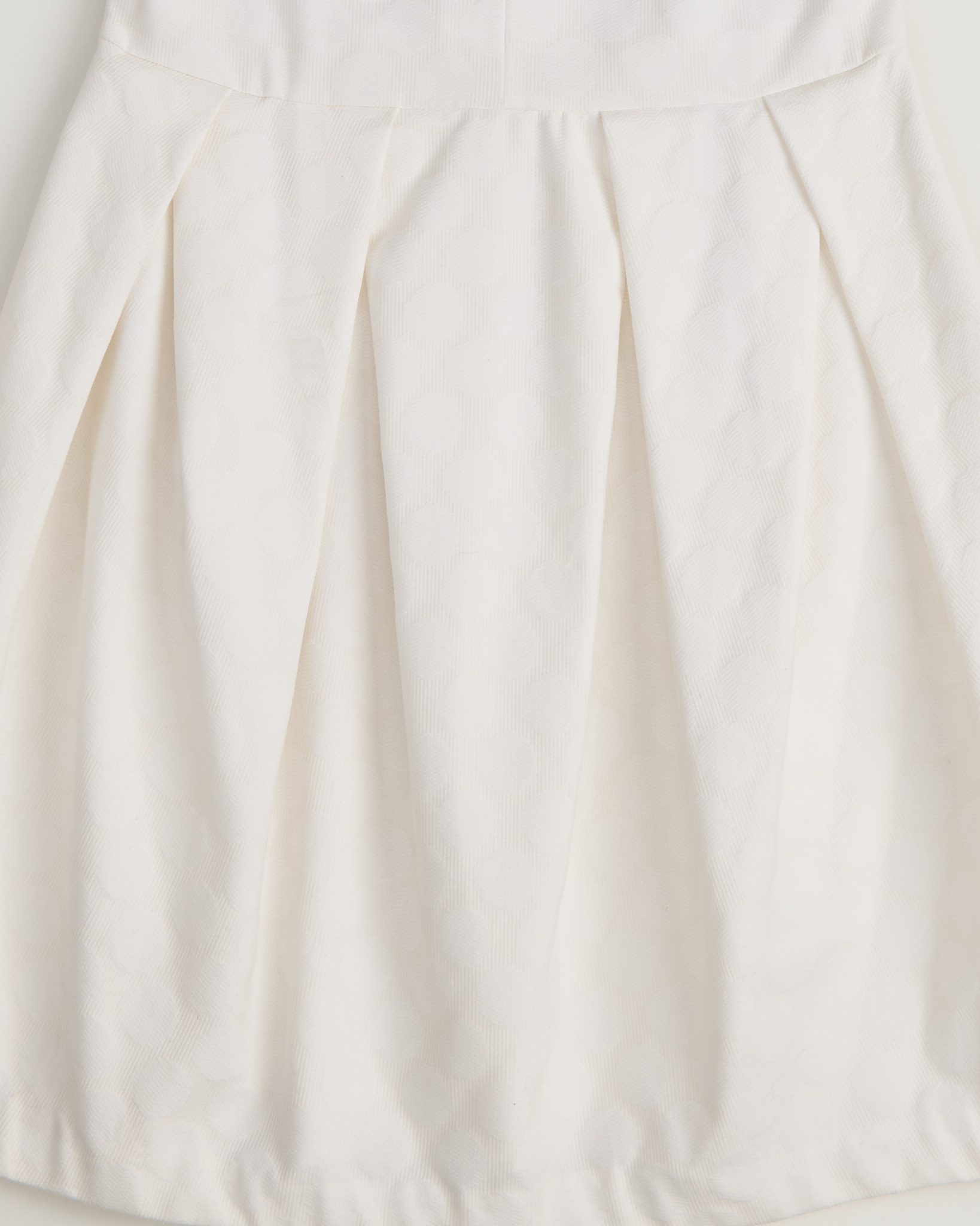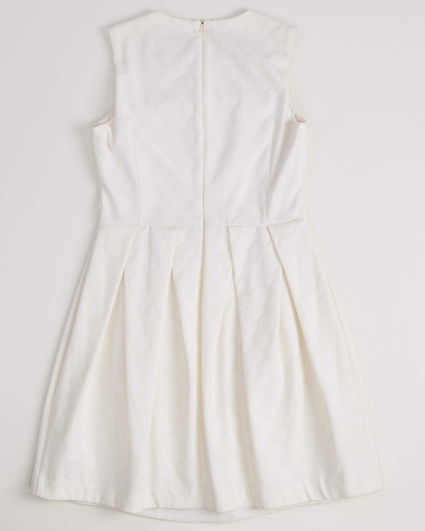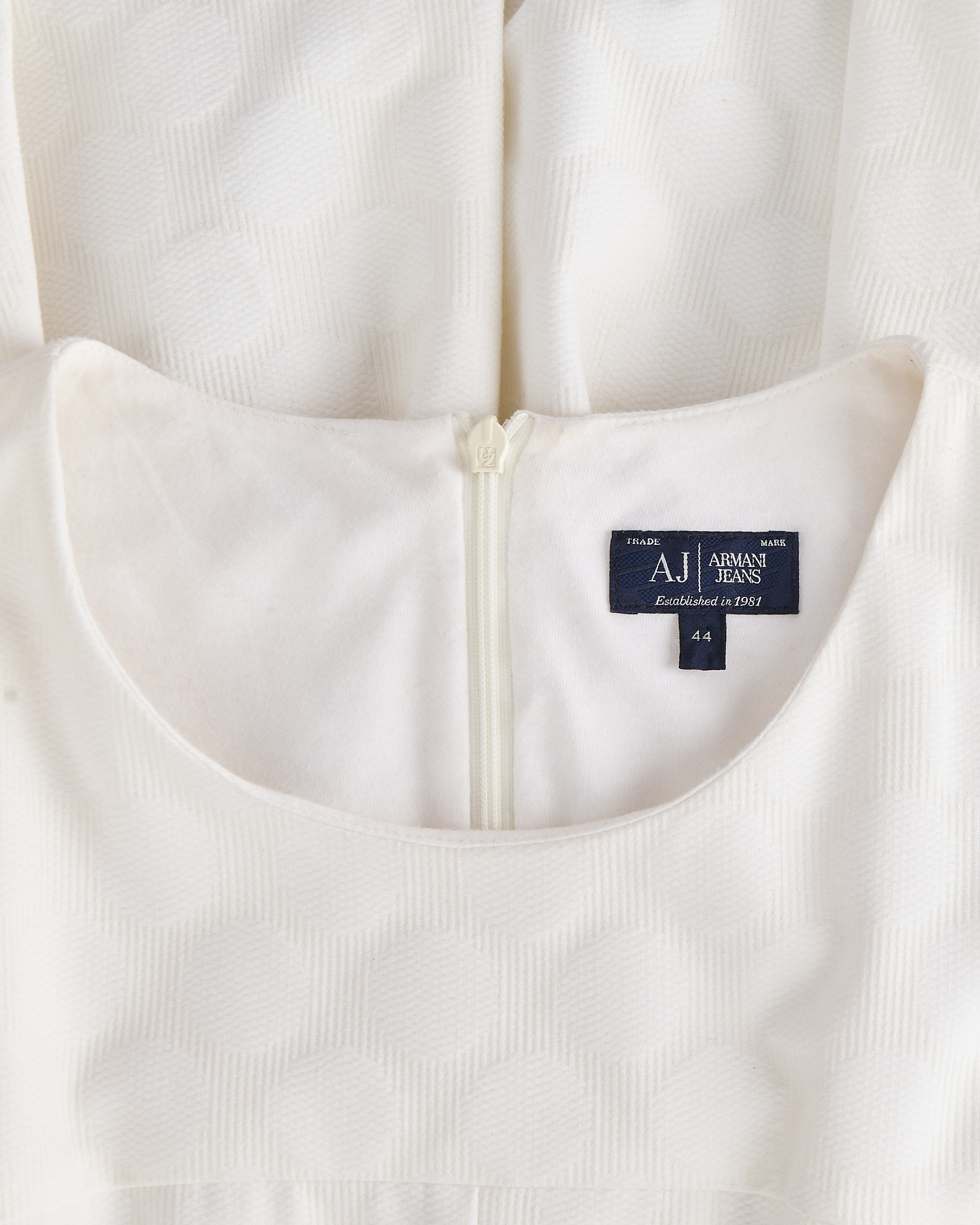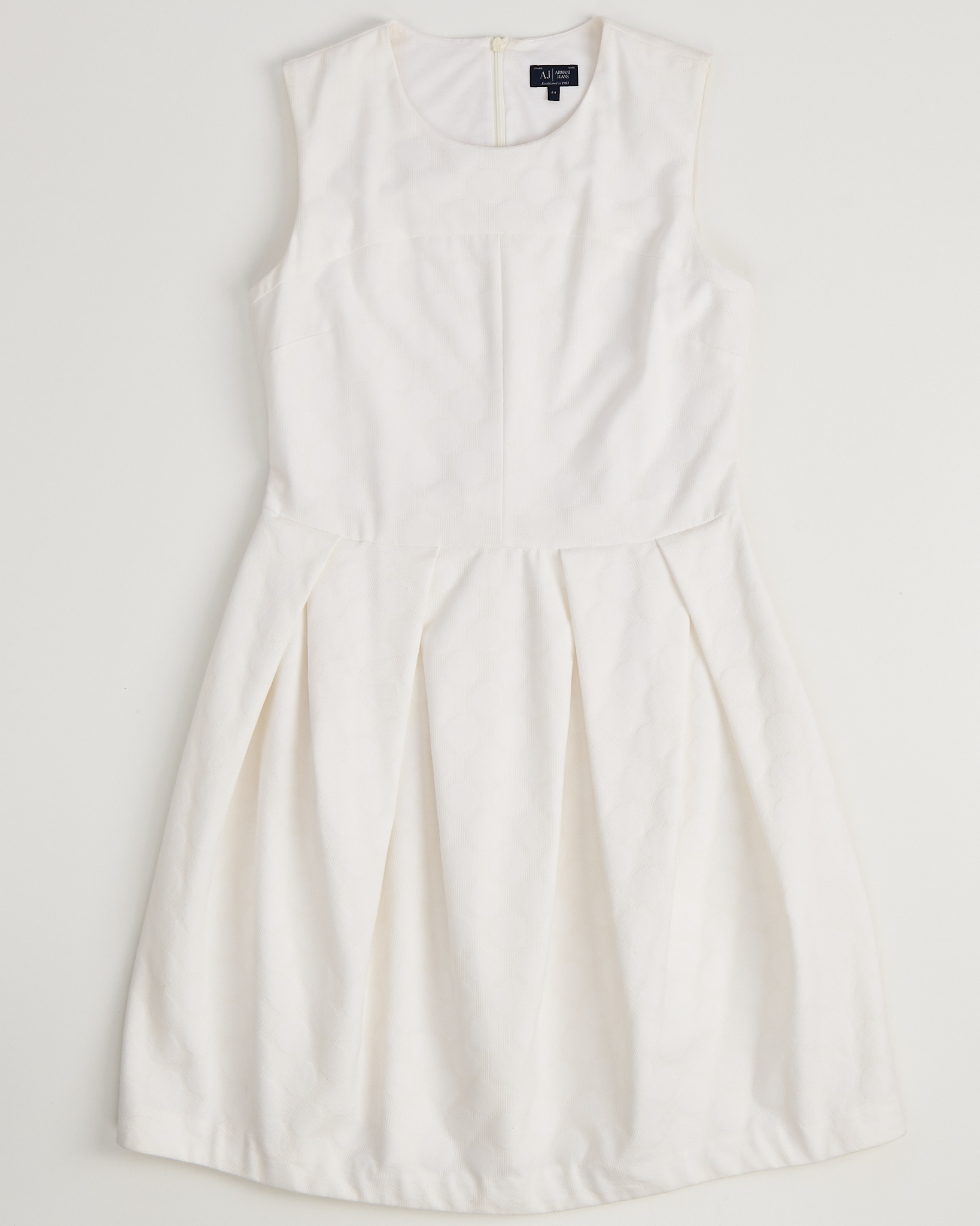 Платье из плотной фактурной ткани молочного оттенка от Armani Jeans. Материал держит форму, поверхность с мягким рельефом, приятная на ощупь. Посадка приталенная, линия талии подчёркнута, юбка-колокол с объёмными складками, ткань с геометрическим рисунком.