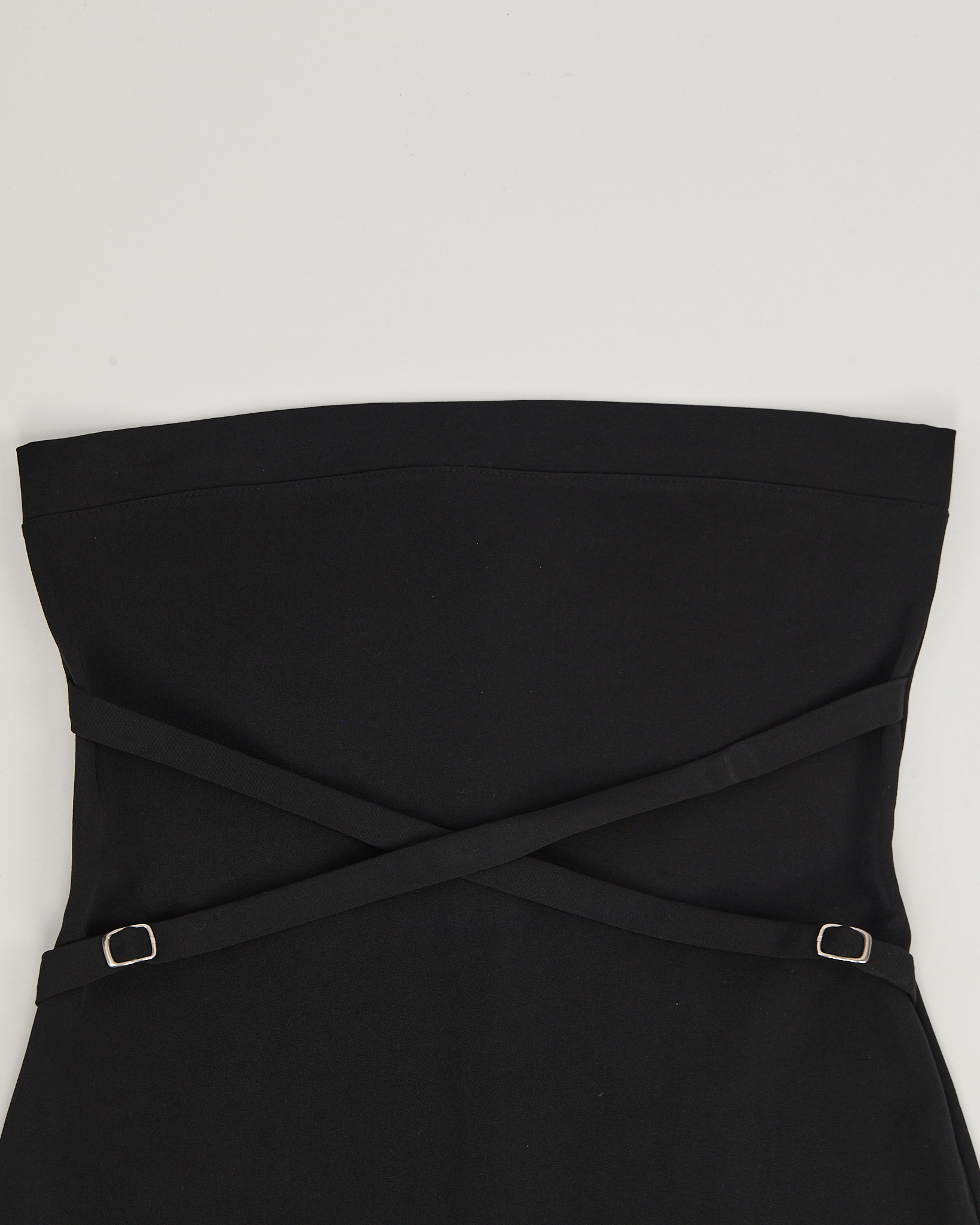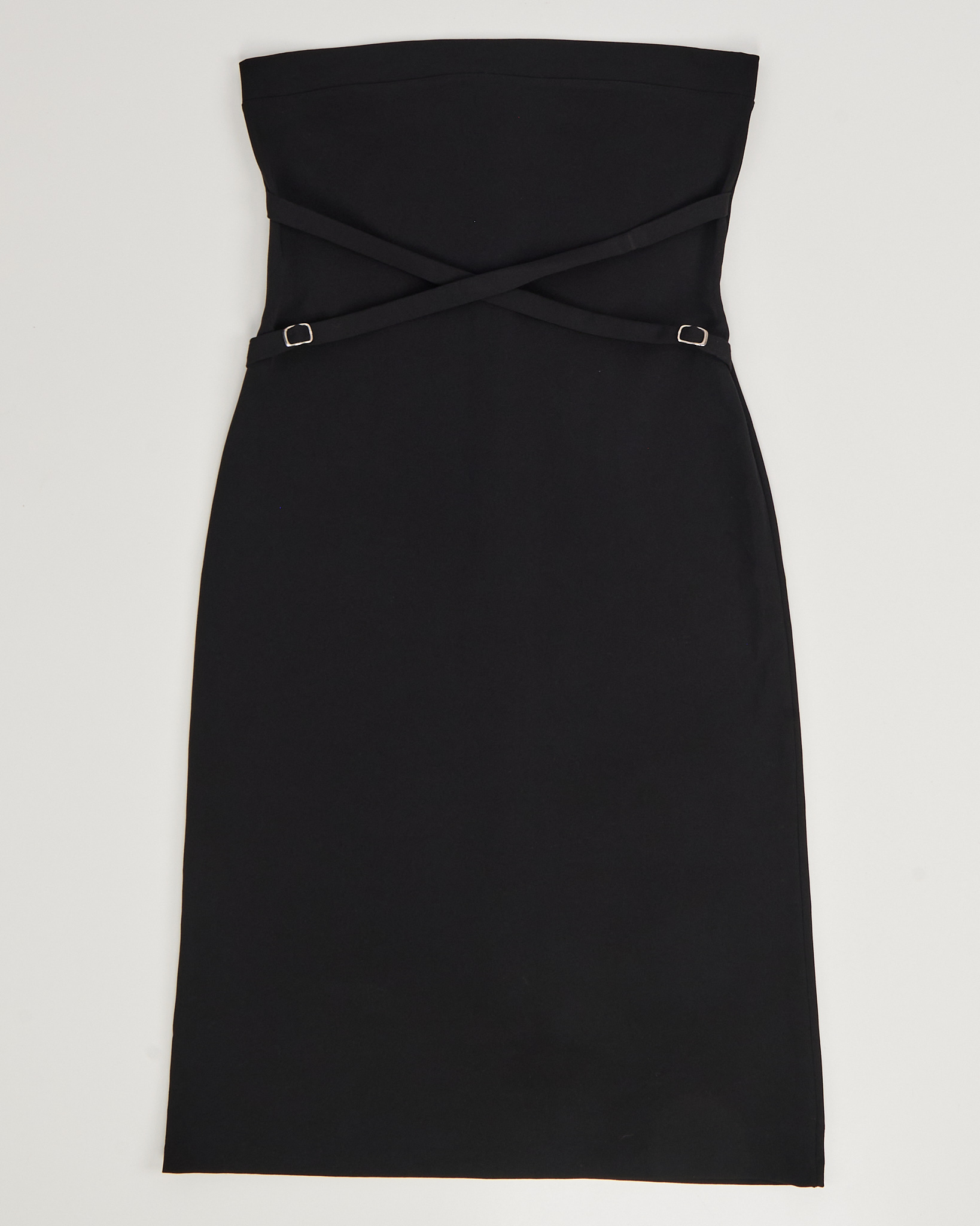 Платье SASCH глубокого чёрного цвета из плотной гладкой ткани. Приталенный силуэт, узкие ремешки с металлическими пряжками придают платью акцент. Удобная застежка на молнию сзади.