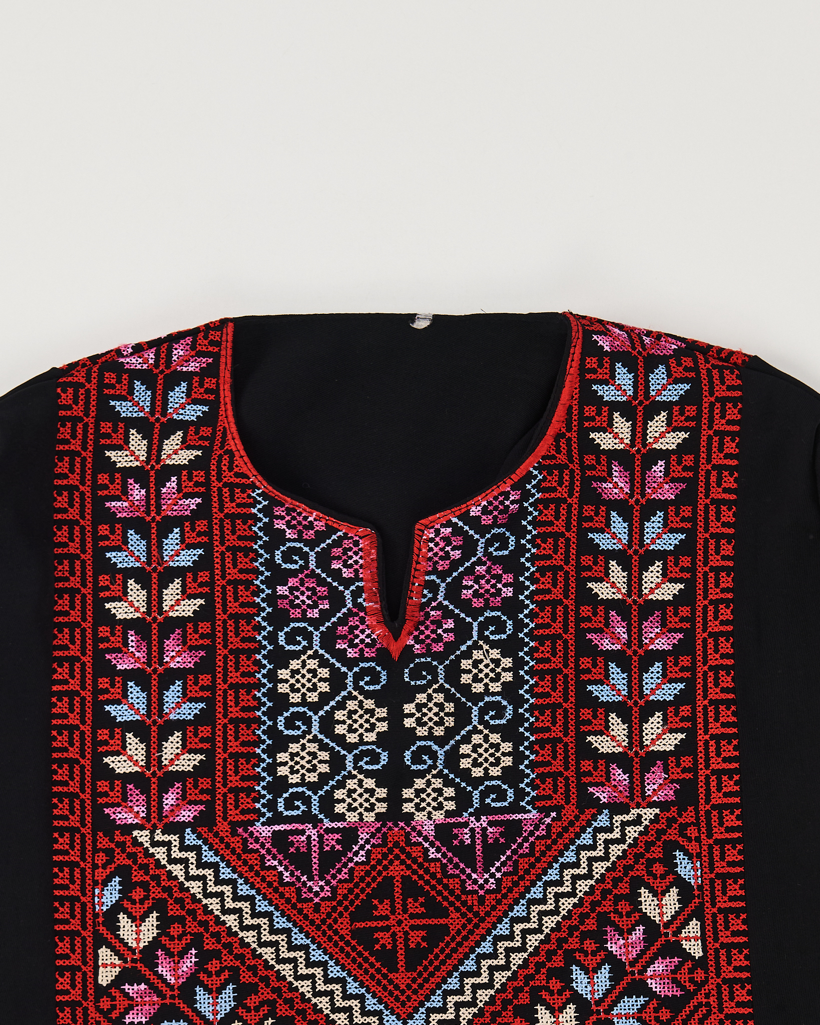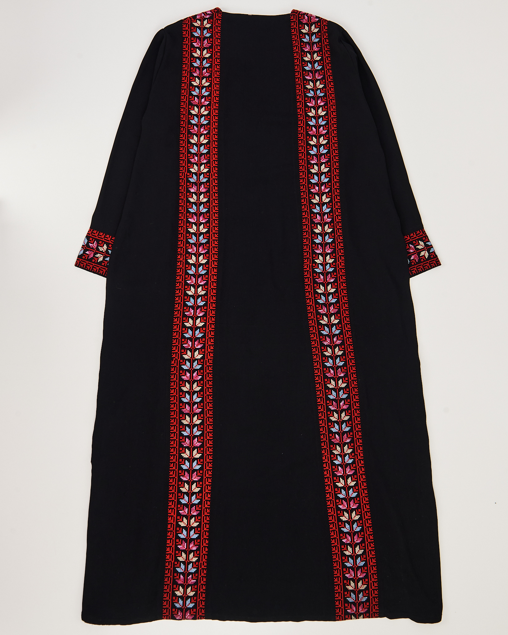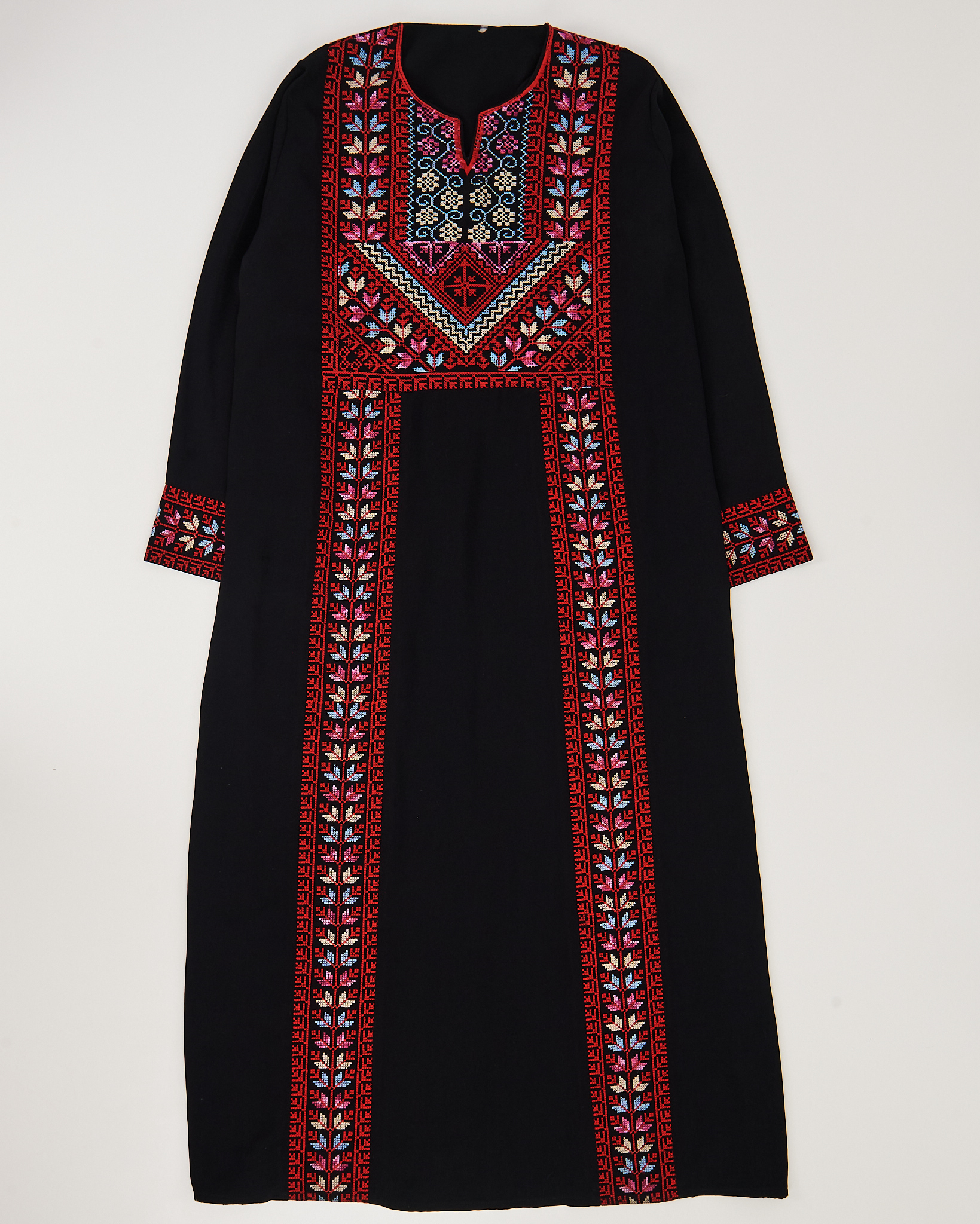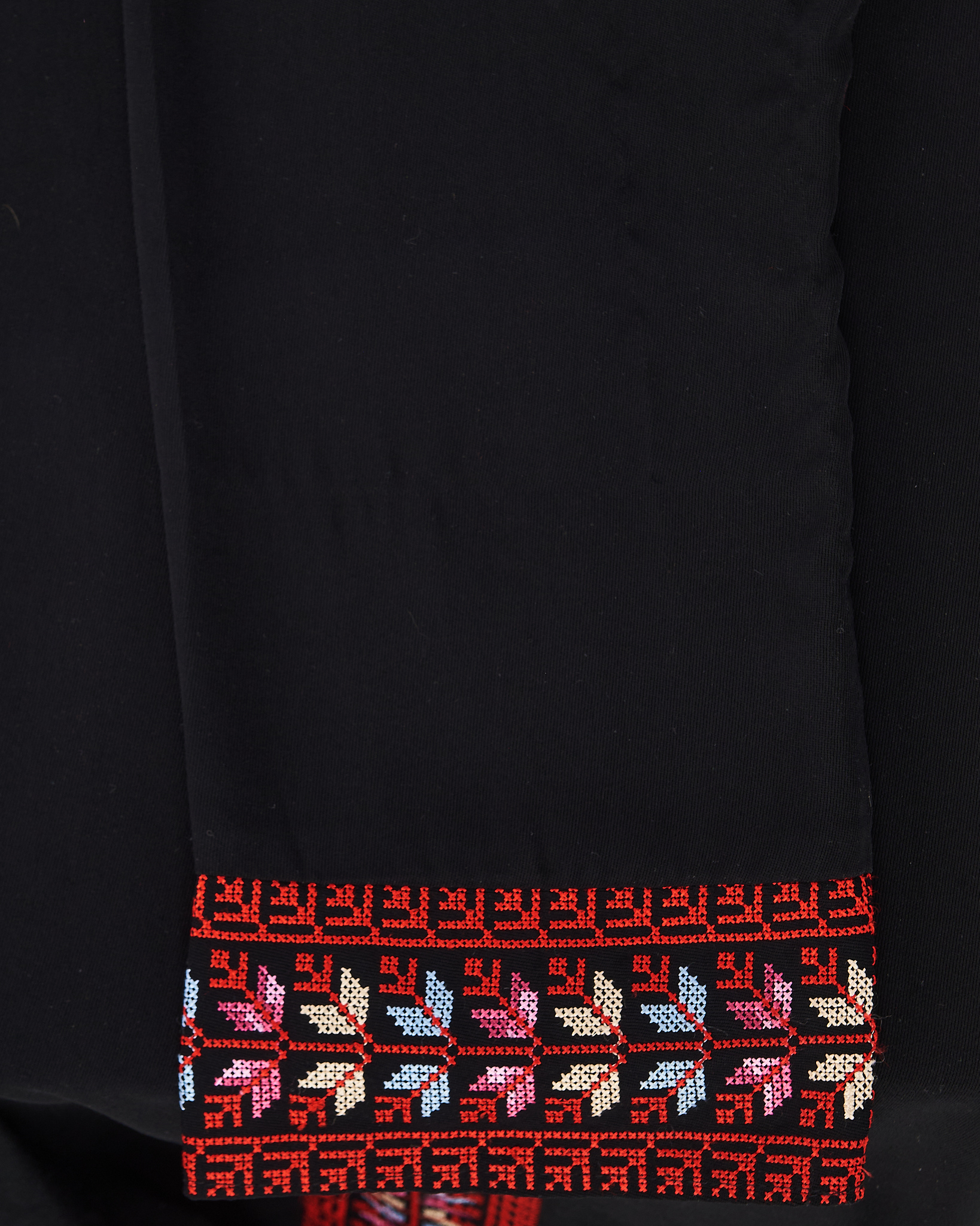 Платье из плотной гладкой ткани чёрного цвета. Материал мягкий на ощупь, держит форму и ощущается комфортно в носке. Посадка свободная, прямой крой. Вышитый орнамент в насыщенных оттенках придает платью акцент.