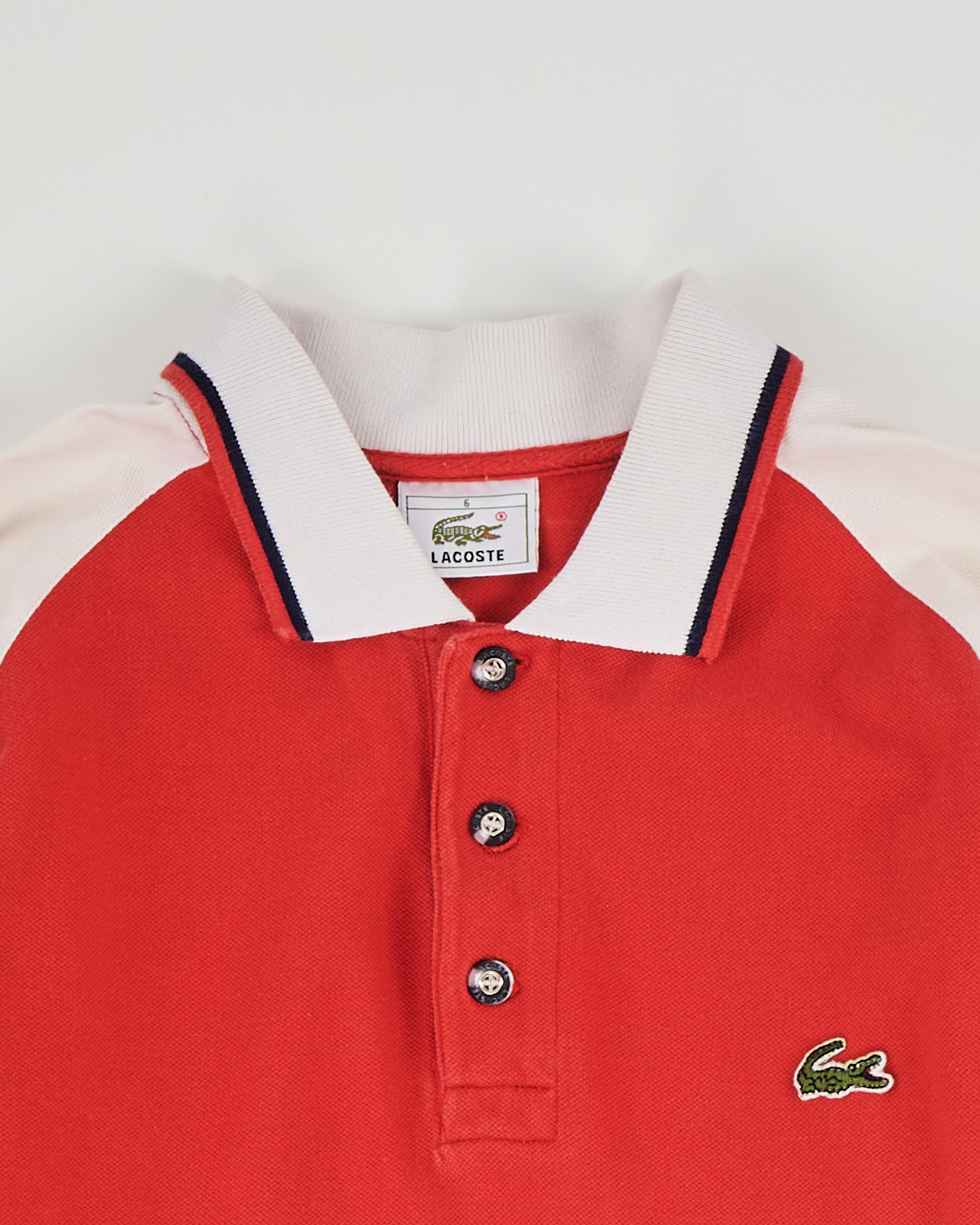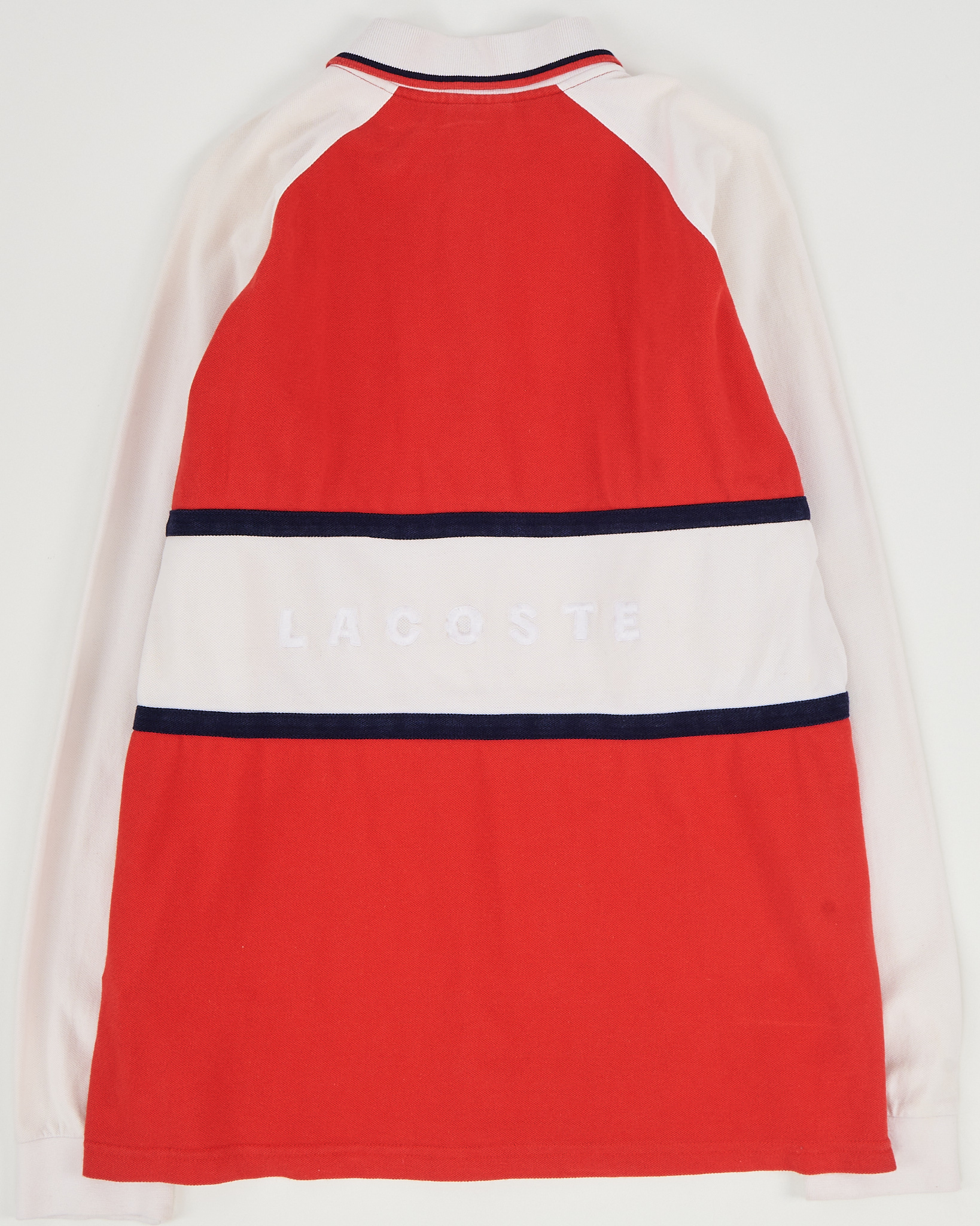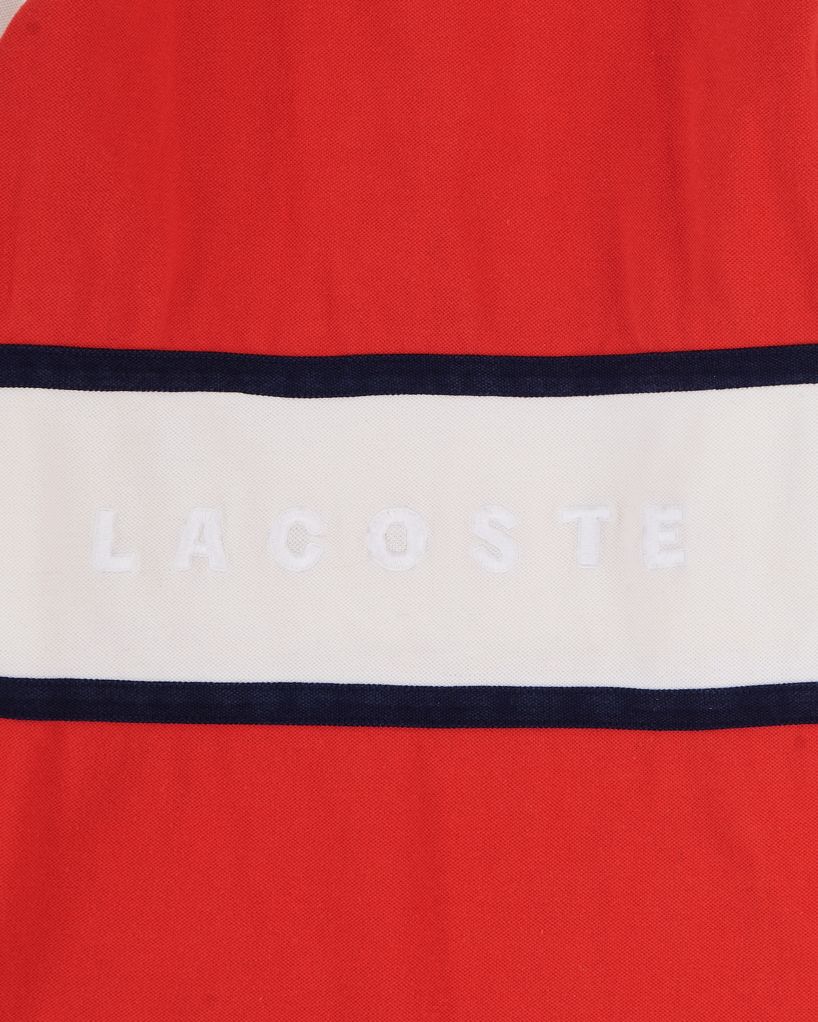 Поло Lacoste из плотного хлопка красного цвета. Посадка свободная, контрастное сочетание белого и красного цвета, на спине вышивка с названием бренда. Фирменный патч крокодила на груди.