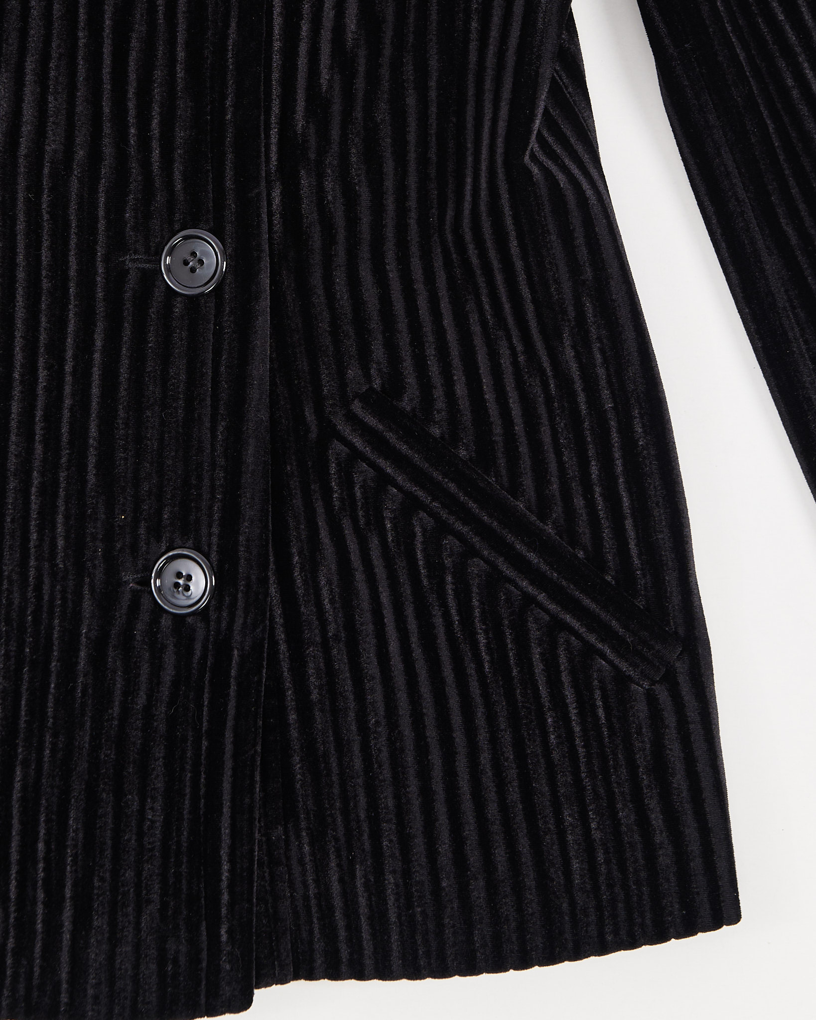 Винтажный жакет со стильными и продуманными деталями. Два варианта застежки для разных вариантов стилизации: на шесть пуговиц с одной стороны и на одну пуговицу с другой. Жакет дополнен двумя аккуратными карманами снизу, внутри есть запасная пуговица. Утонченный силуэт и идеальная посадка.
