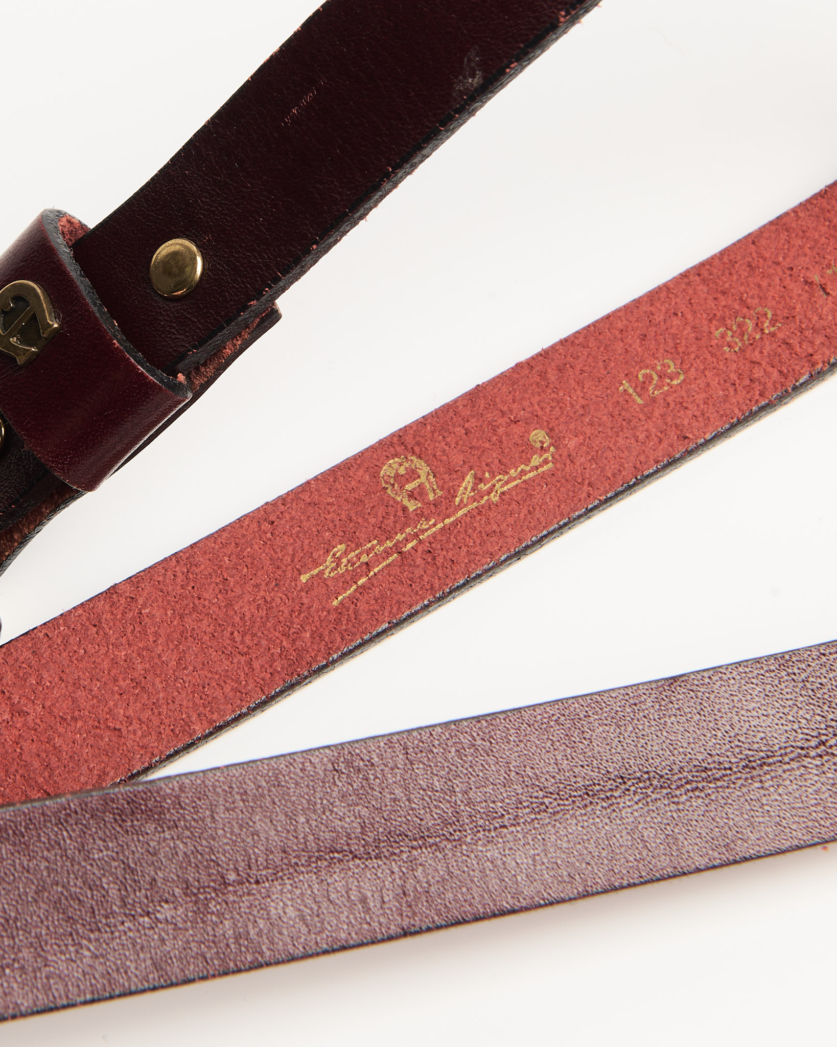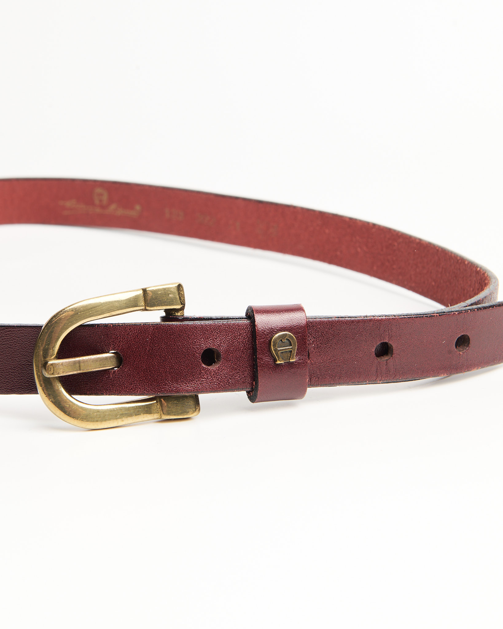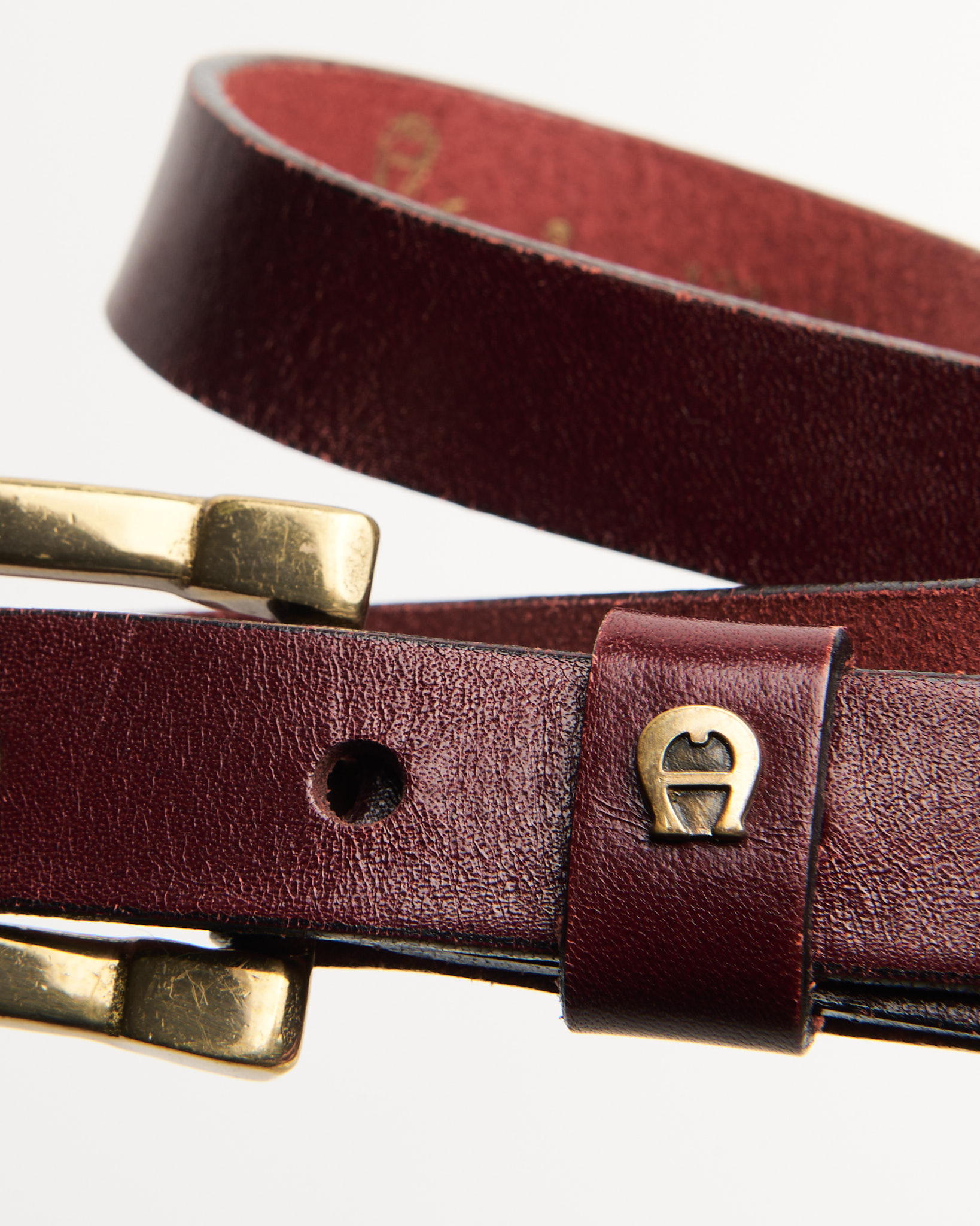 Ремень Aigner из натуральной кожи глубокого бордового оттенка. Итальянское качество. Ремень хорошо держит форму. Латунная пряжка и фирменный знак Aigner на шлевке.