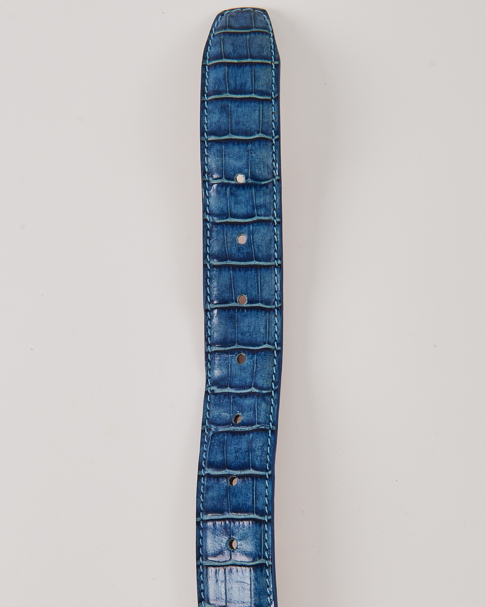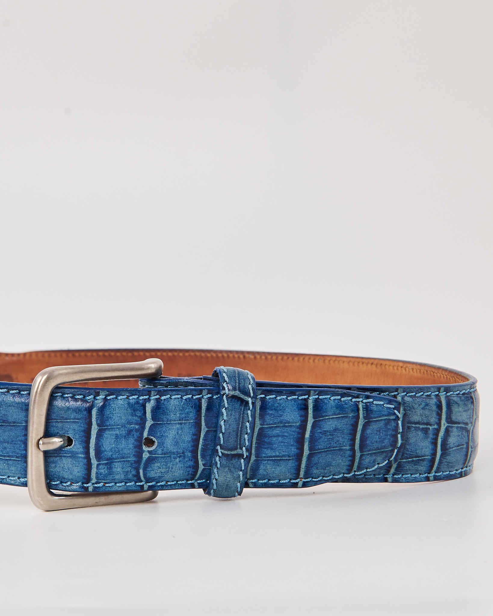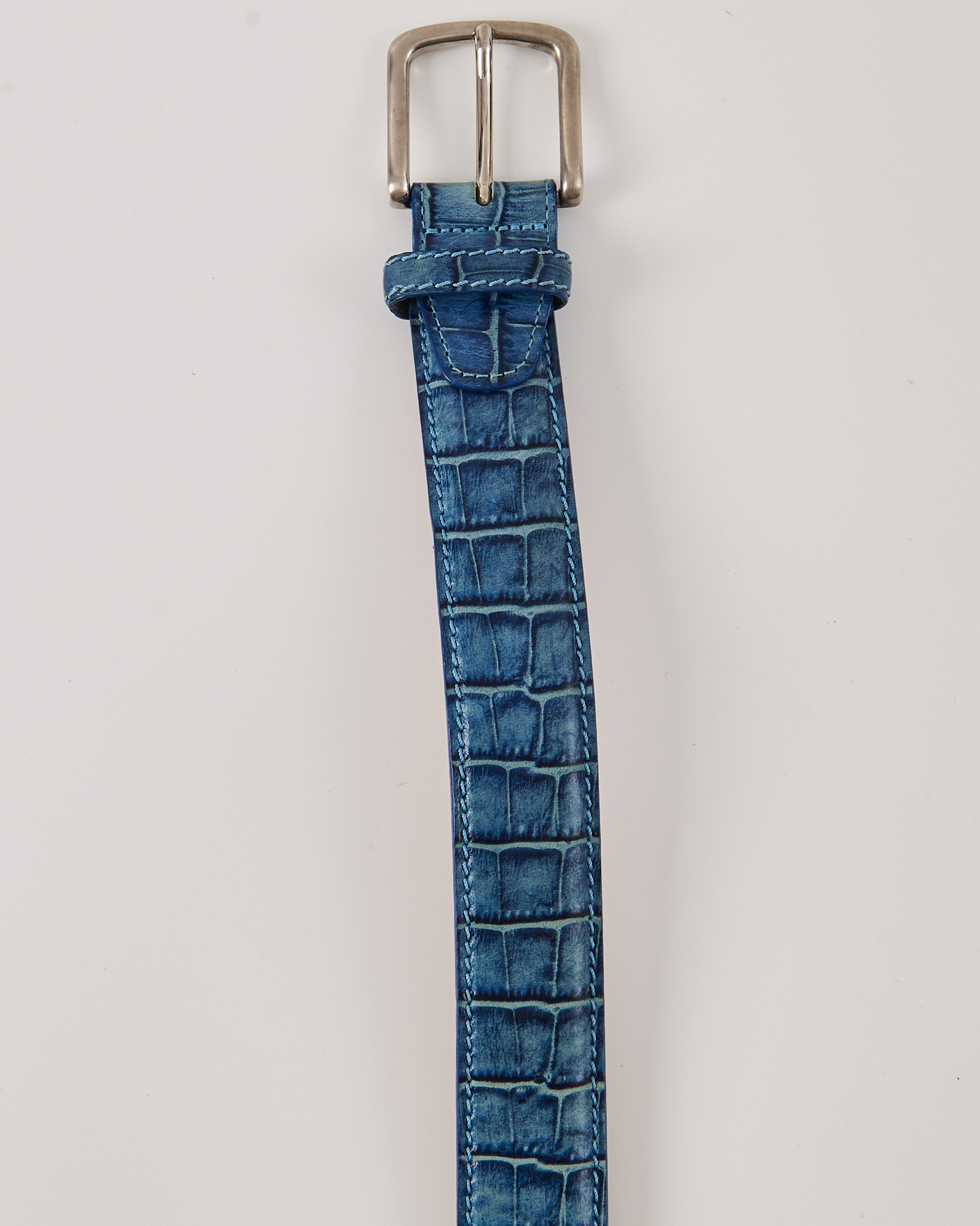 Винтажный ремень из натуральной кожи с тиснением под рептилию. Ремень удобно фиксируется на талии. Яркий голубой цвет, серебряная пряжка.