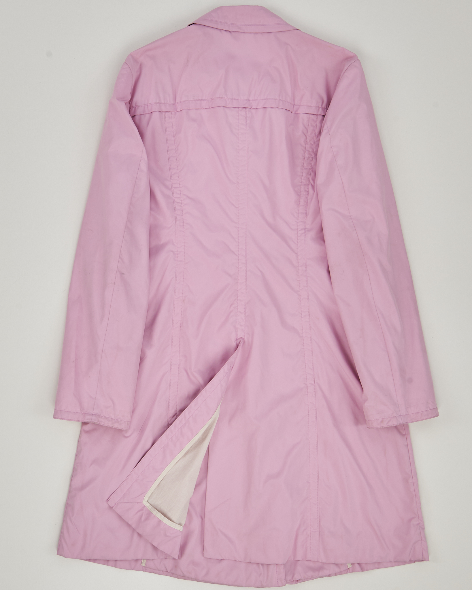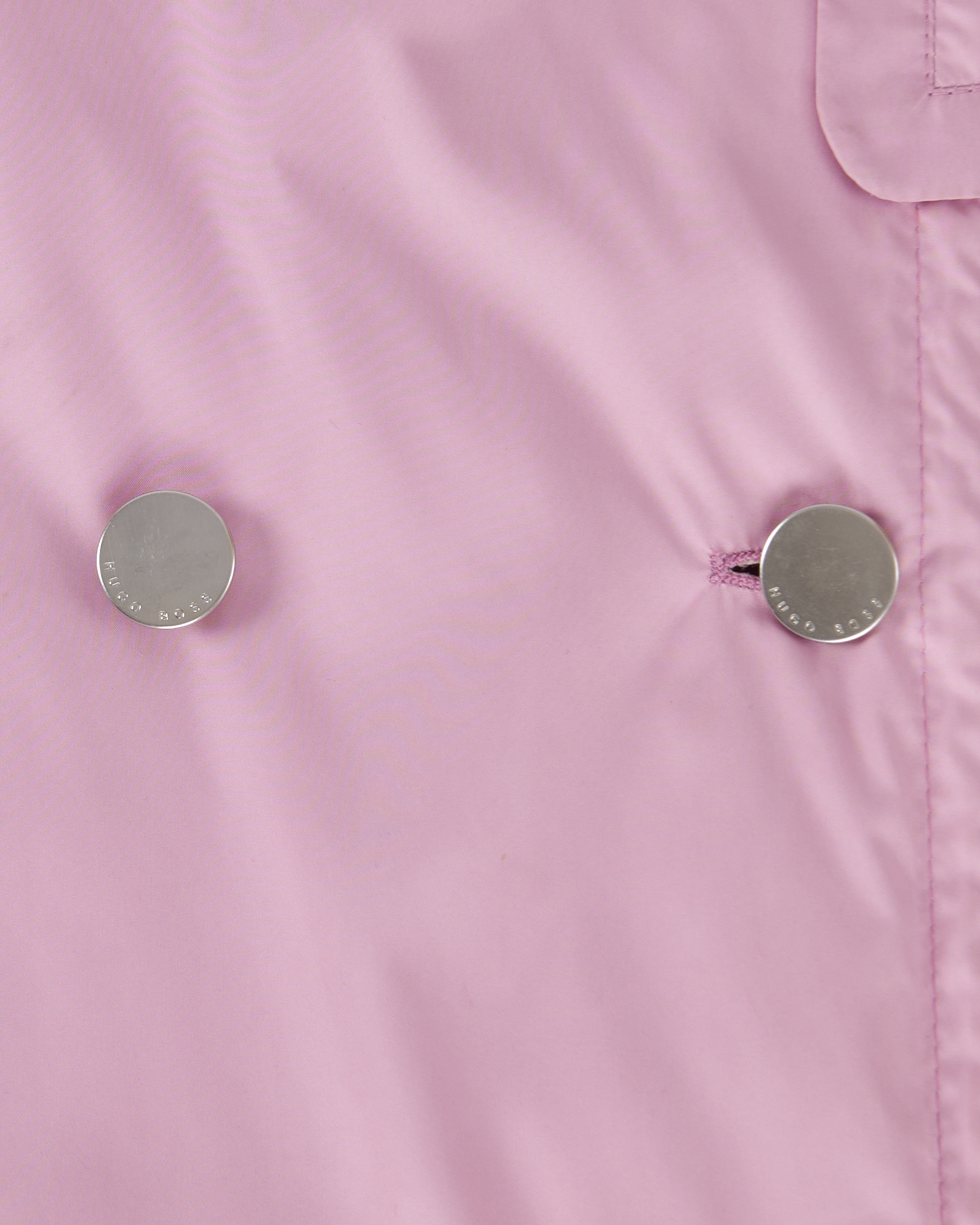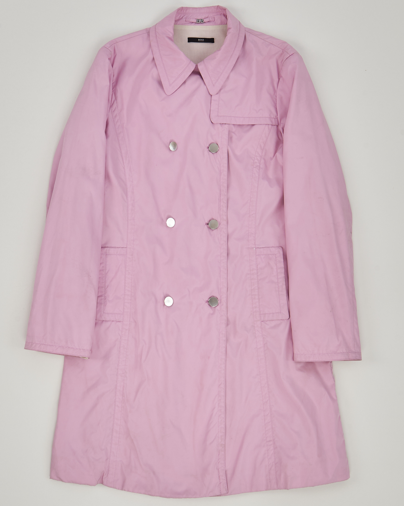 Тренч от Hugo Boss в светло-розовом оттенке. Материал лёгкий, посадка прямая. Двубортная застёжка на металлические кнопки с гравировкой бренда и чёткая линия плеч. Внутри хлопковая подкладка, комфортная к телу.