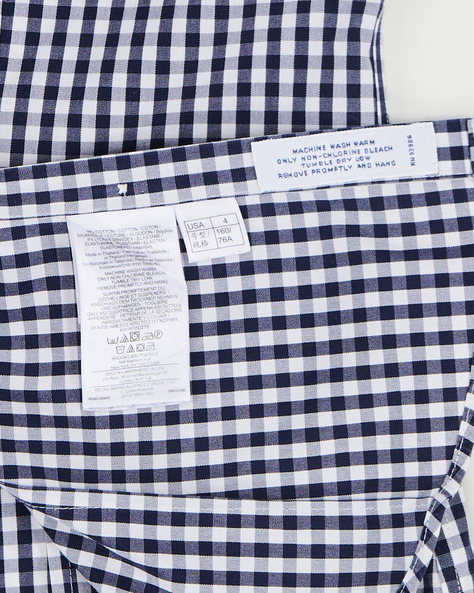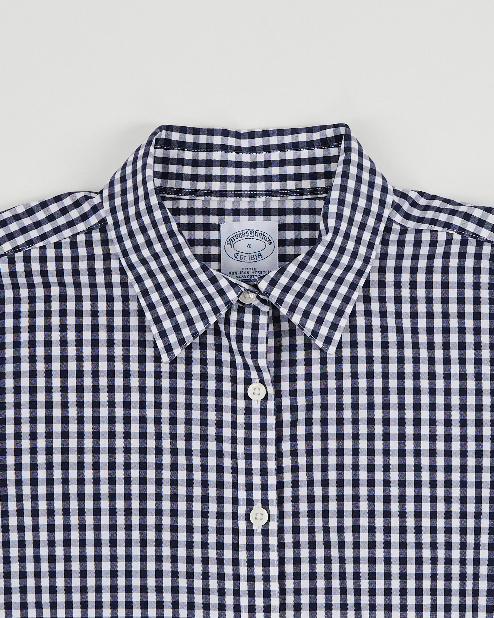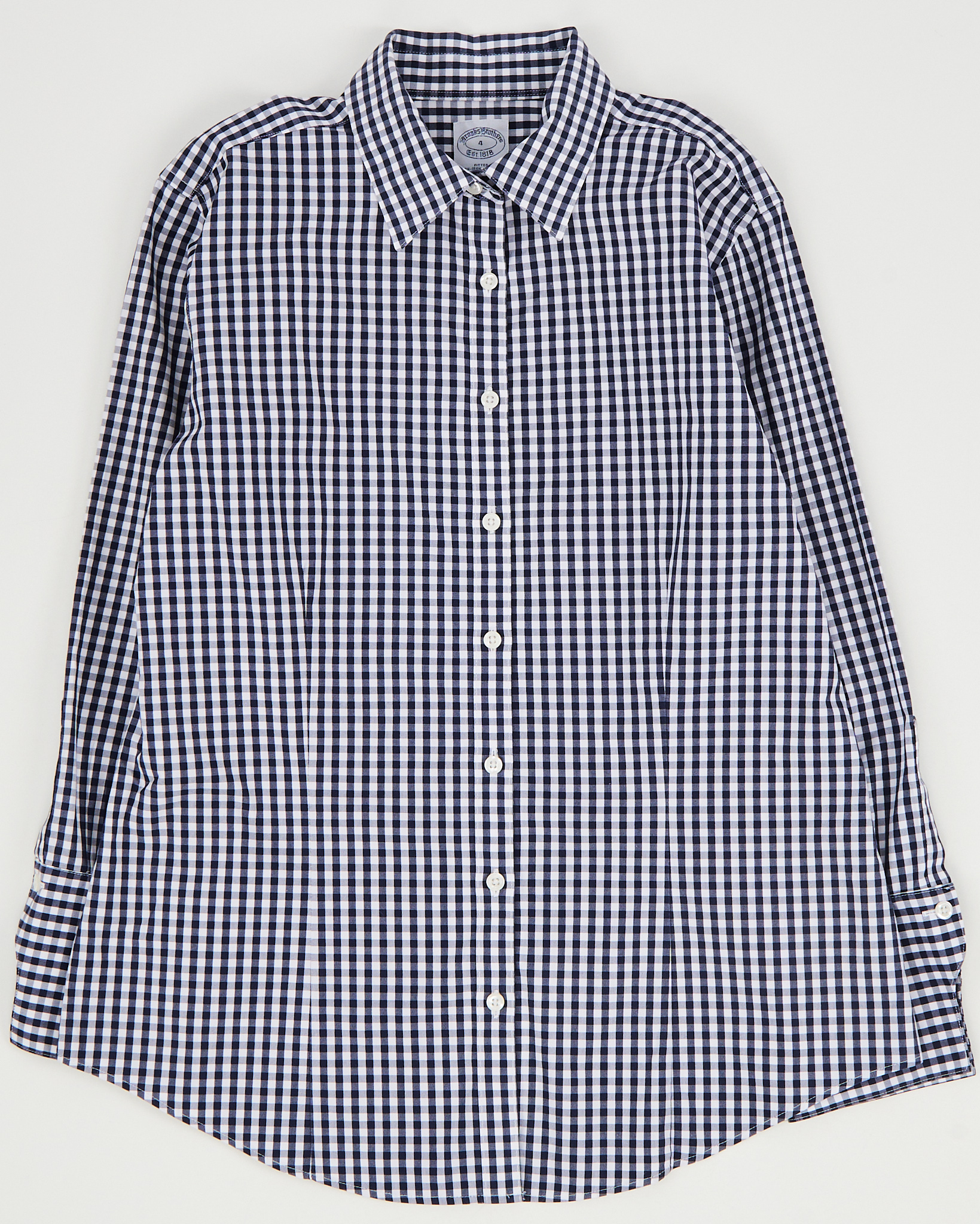 Рубашка Brooks Brothers из хлопковой ткани в мелкую сине-белую клетку. Материал мягкий и гладкий на ощупь, ткань лёгкая и приятная к телу. Посадка прямая. Модель подойдёт для образов в классическом стиле.