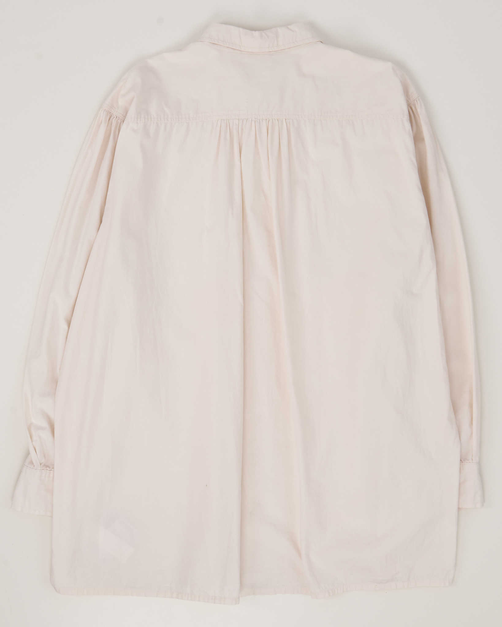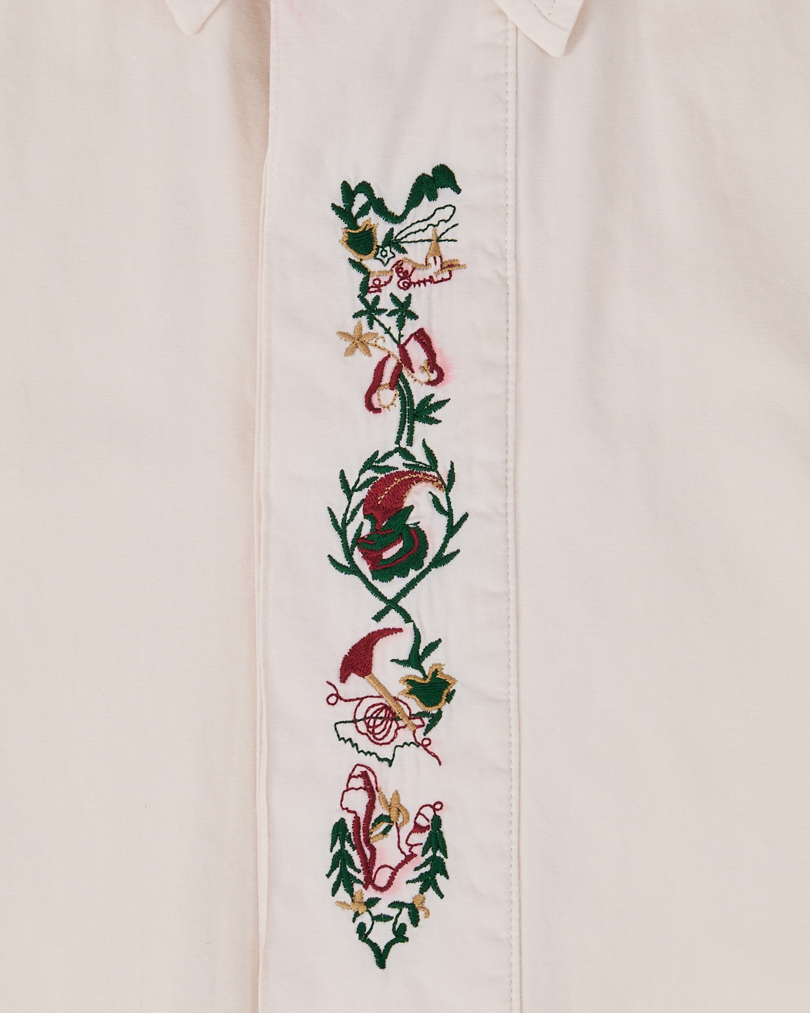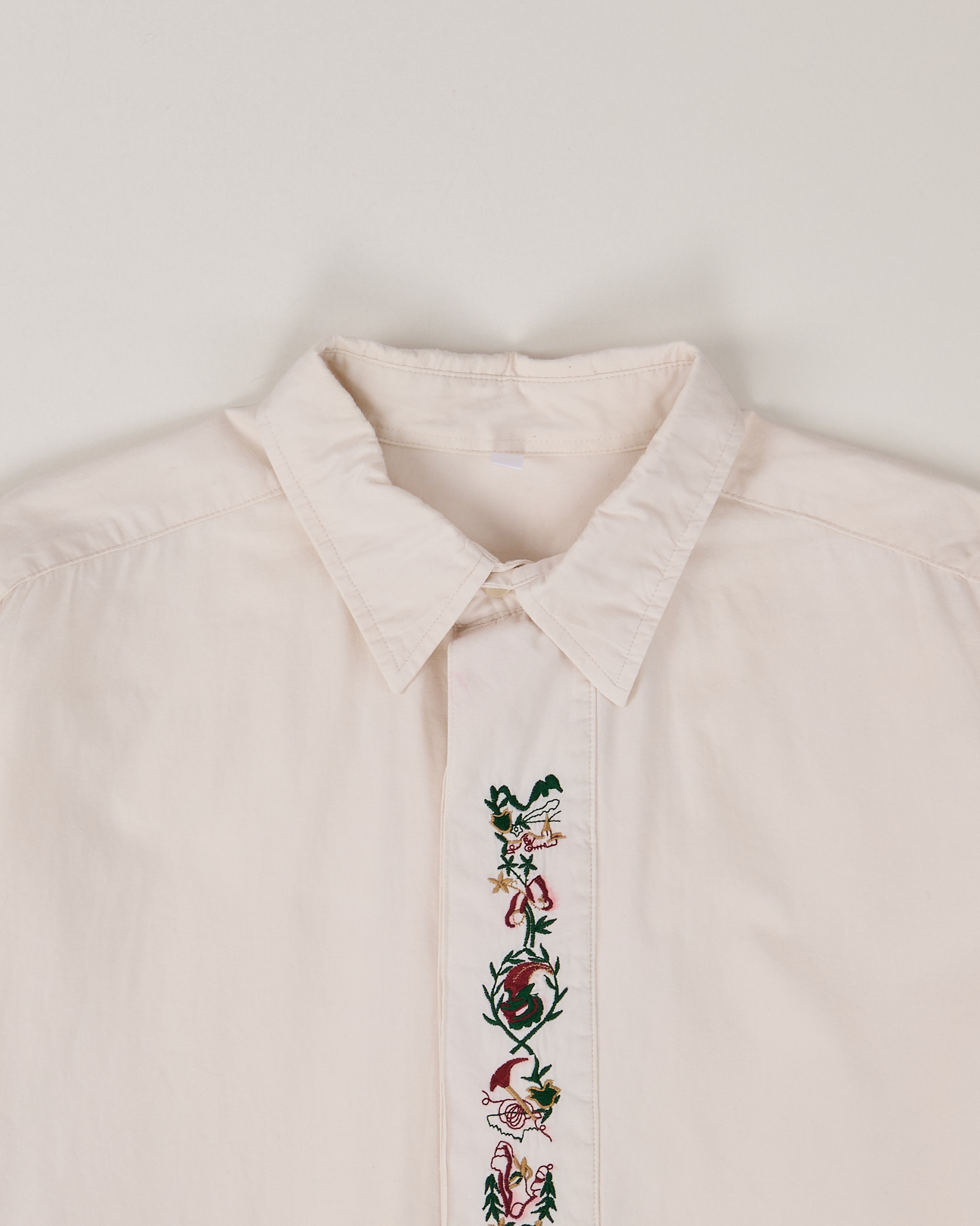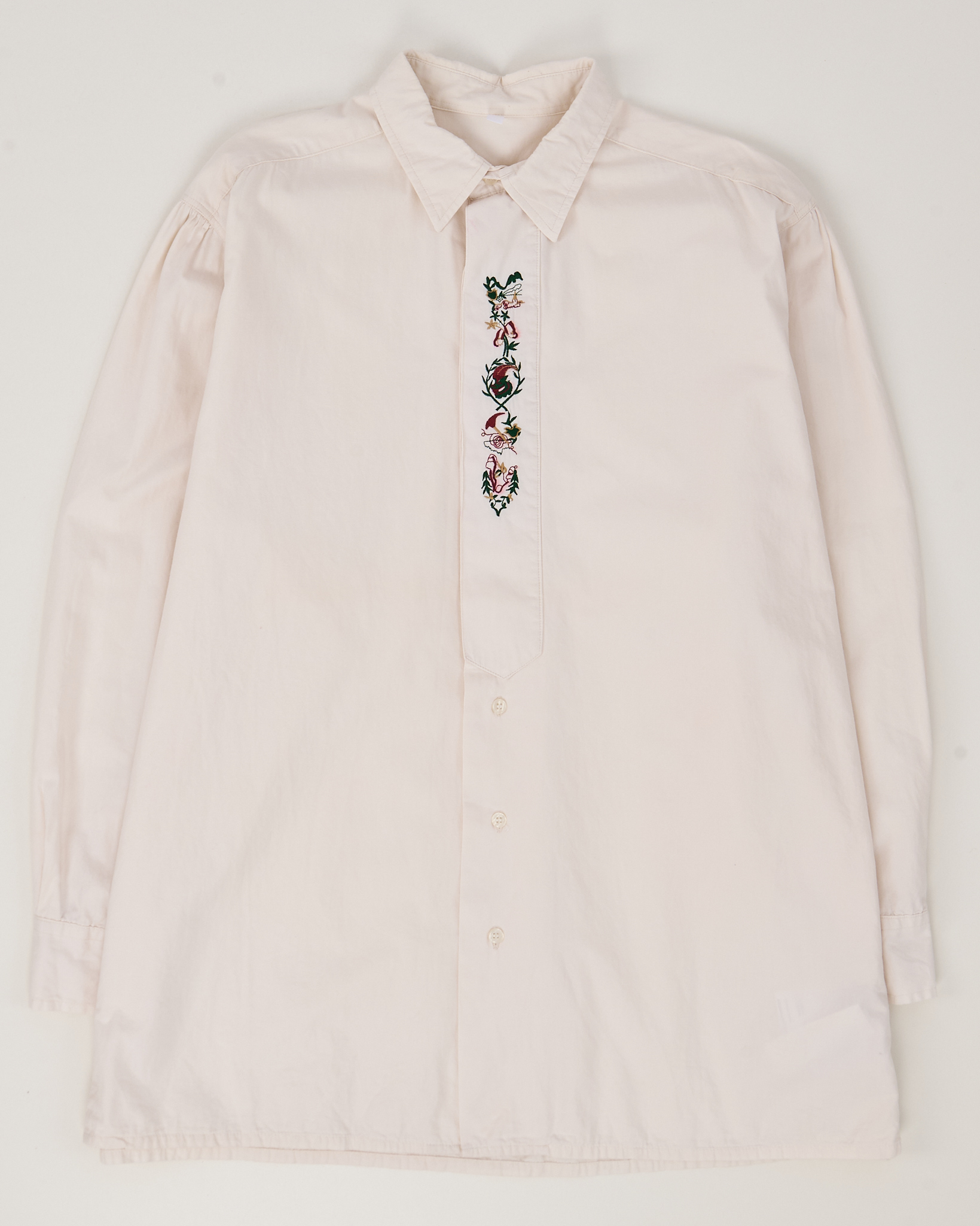 Рубашка светло-кремового оттенка с акцентной вышивкой на планке. Хлопковая ткань, гладкая и приятная к телу, держит форму. Посадка свободная, вышивка с растительным орнаментом на планке.