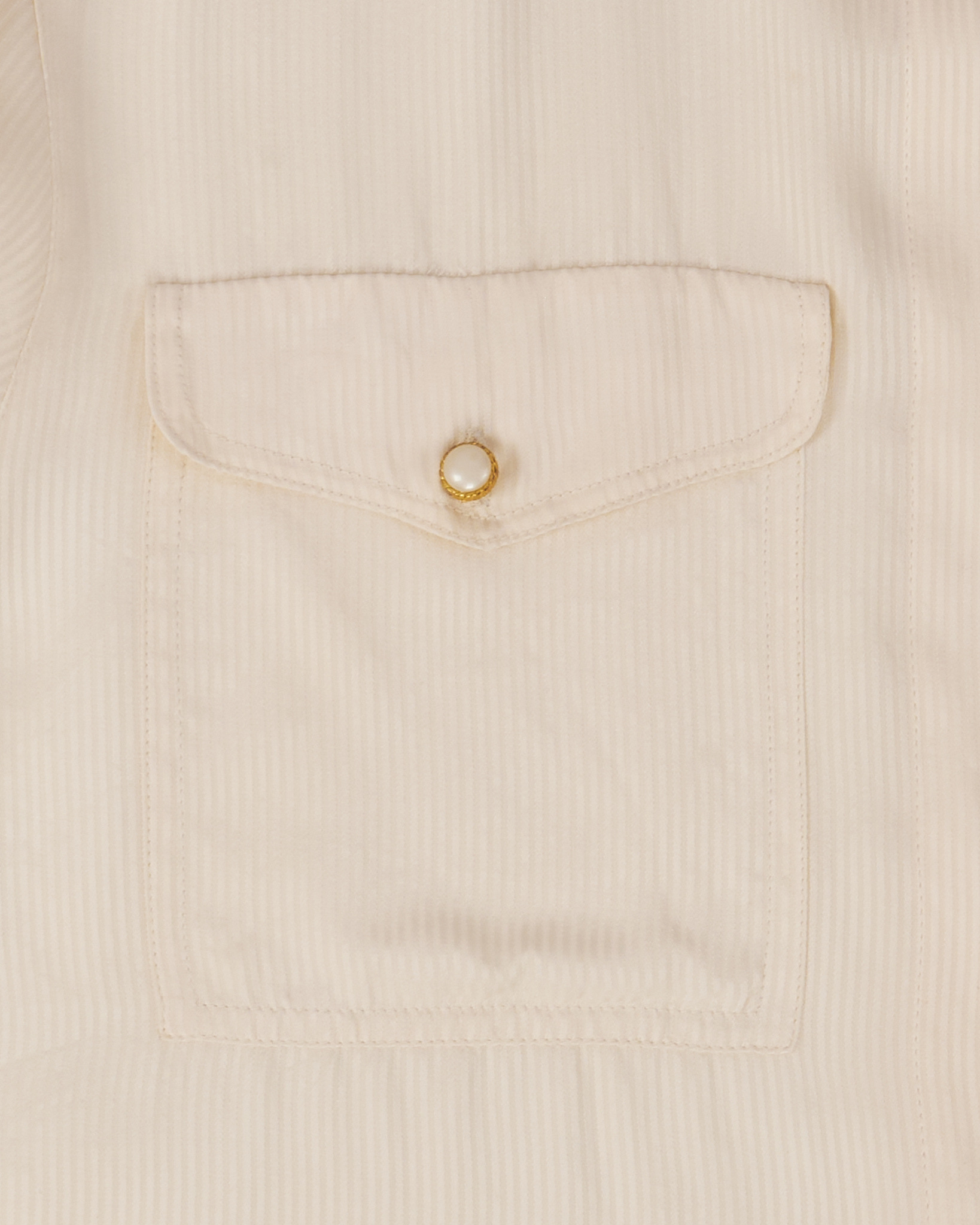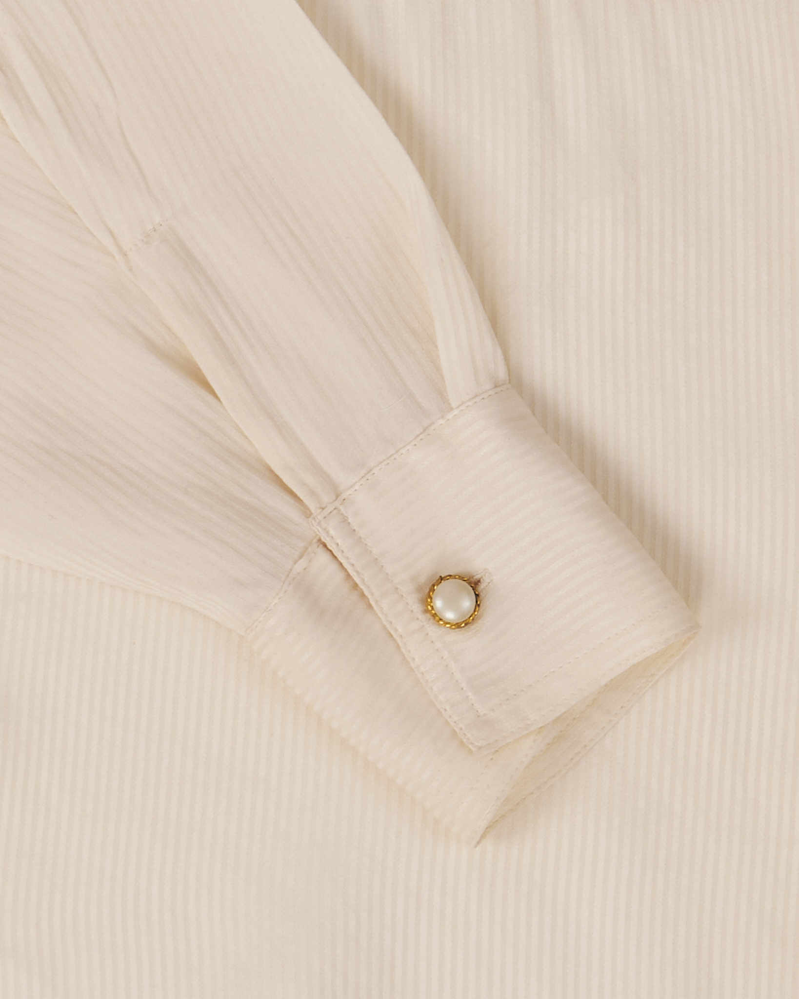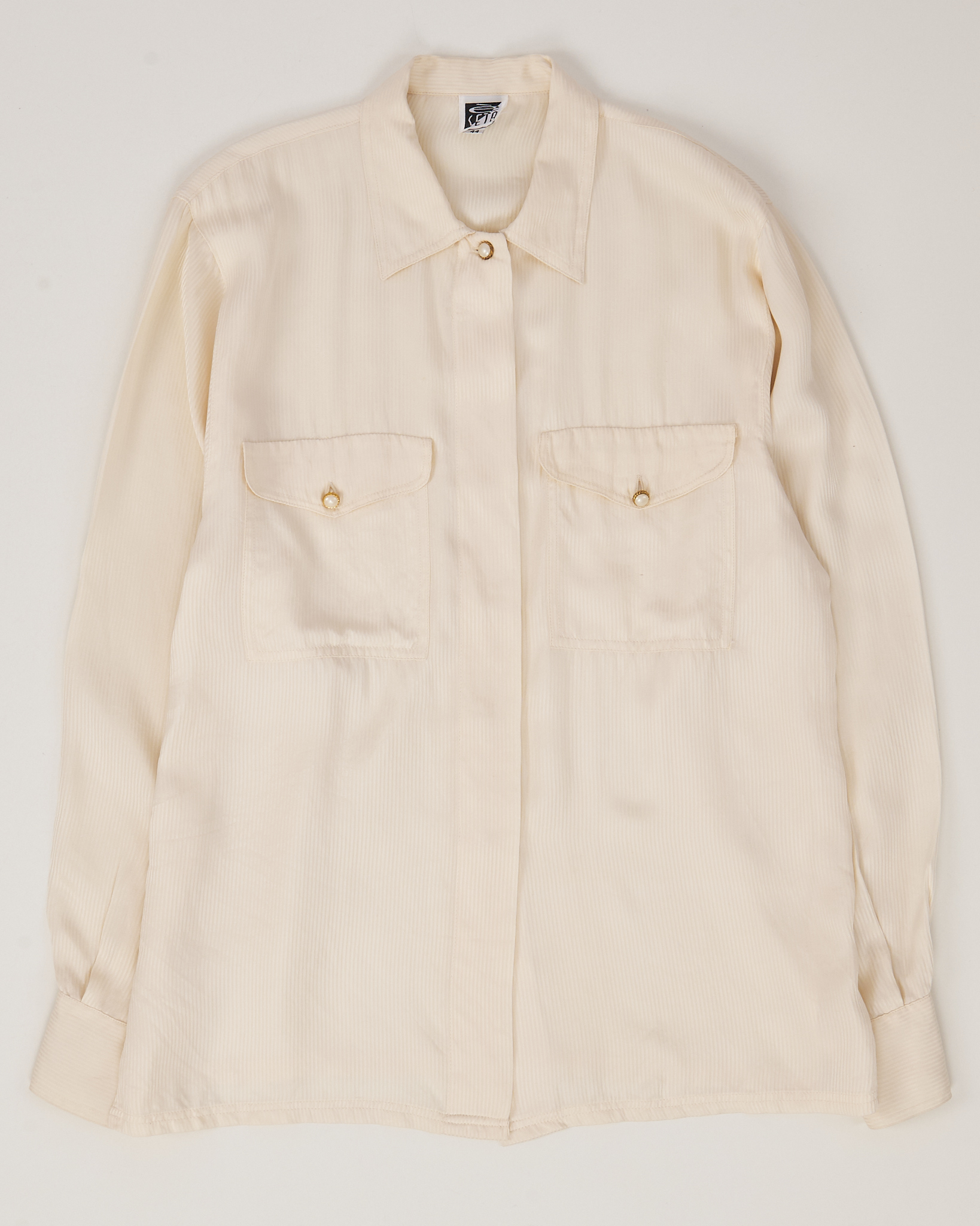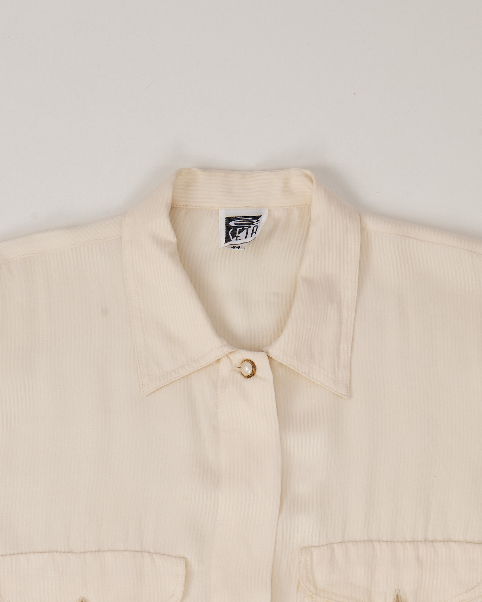 Рубашка из мягкого шелка с фактурной полоской в кремовом оттенке. Материал гладкий, лёгкий. Посадка свободная, акцент на нагрудных карманах с декоративными пуговицами.