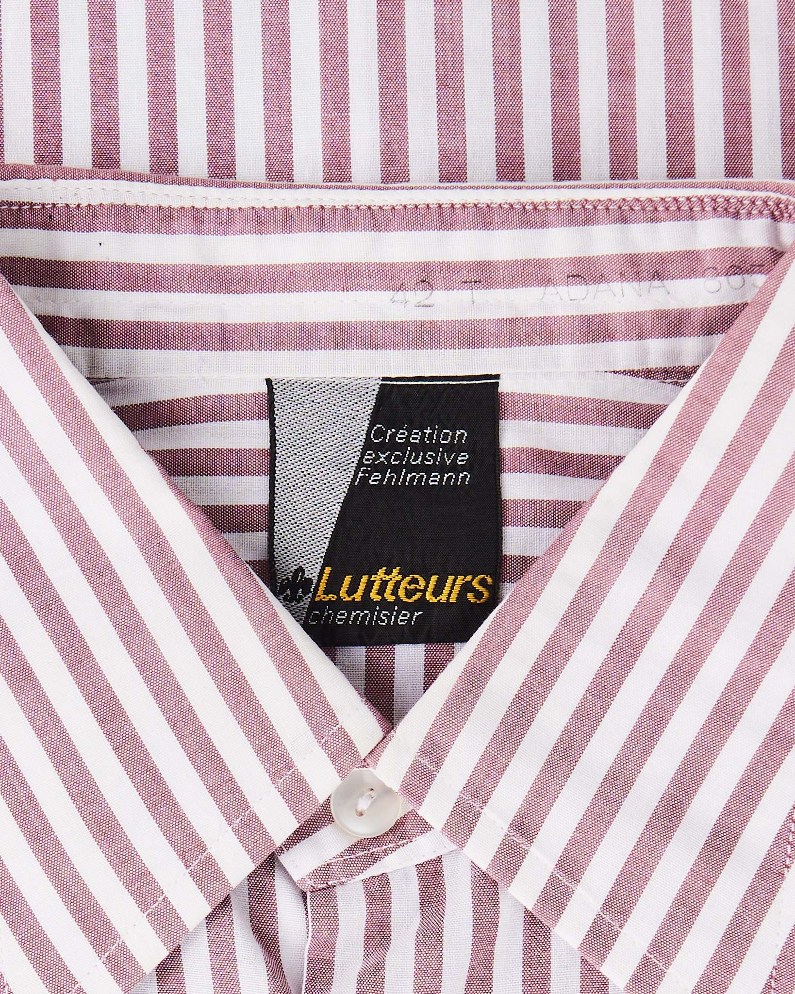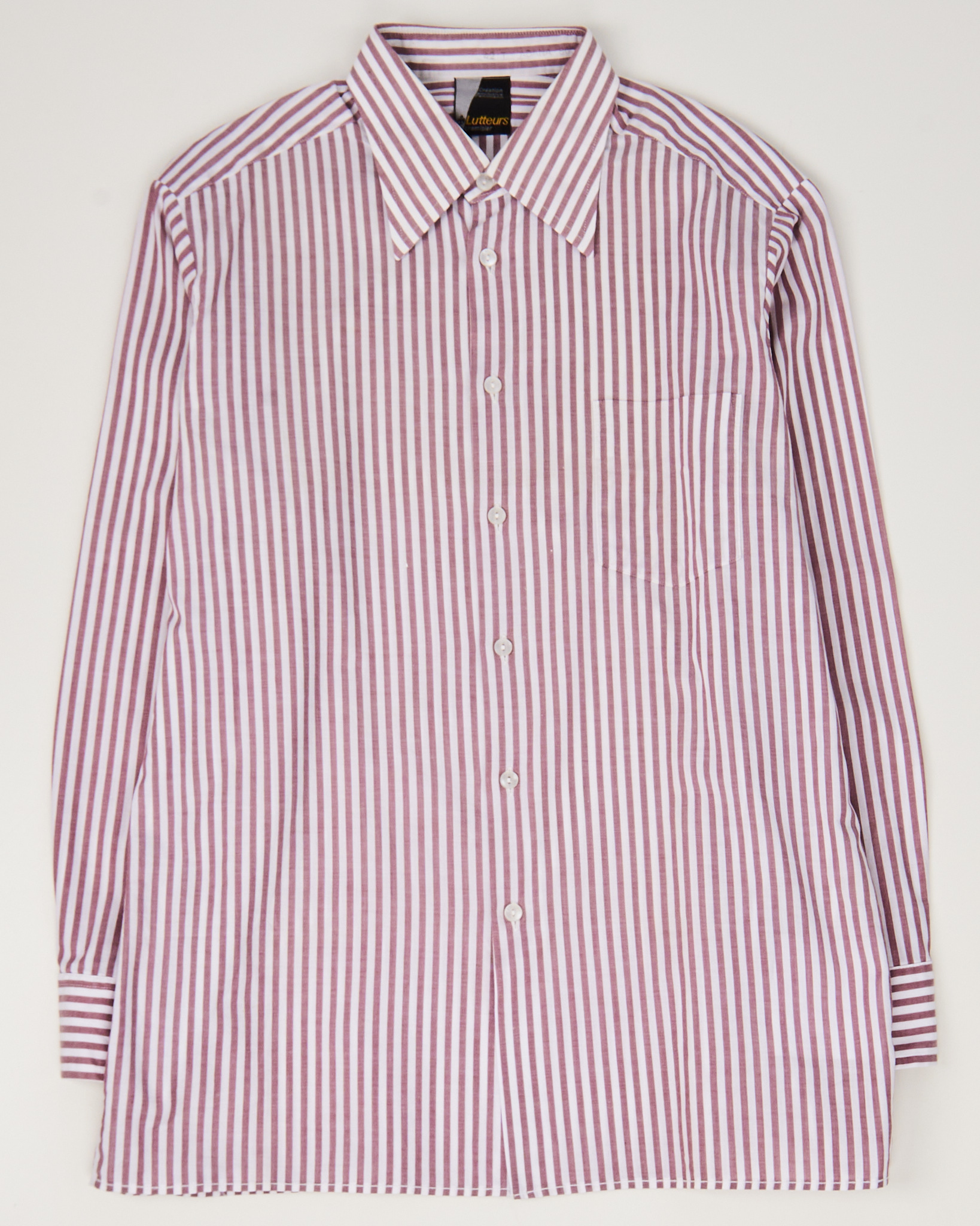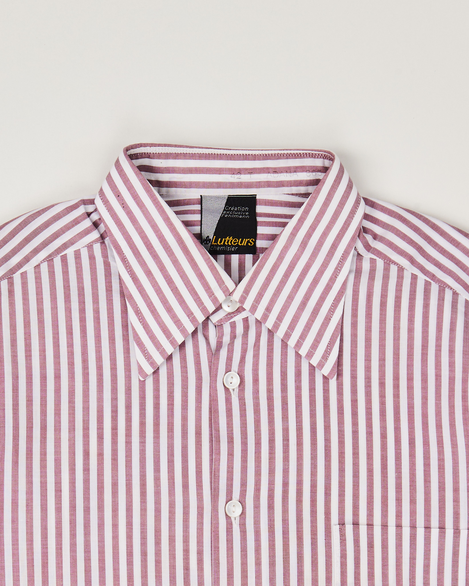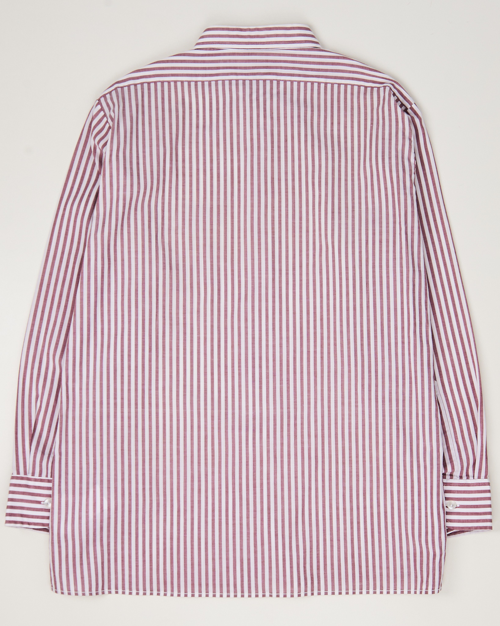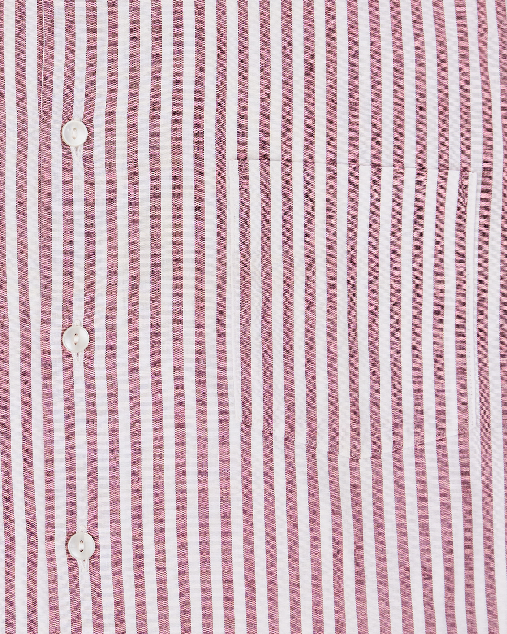 Рубашка из хлопковой ткани в красно-белую вертикальную полоску. Материал лёгкий, гладкий на ощупь, держит форму. Посадка прямая, свободно ложится по телу и не сковывает движения. Классический воротник и нагрудный карман.