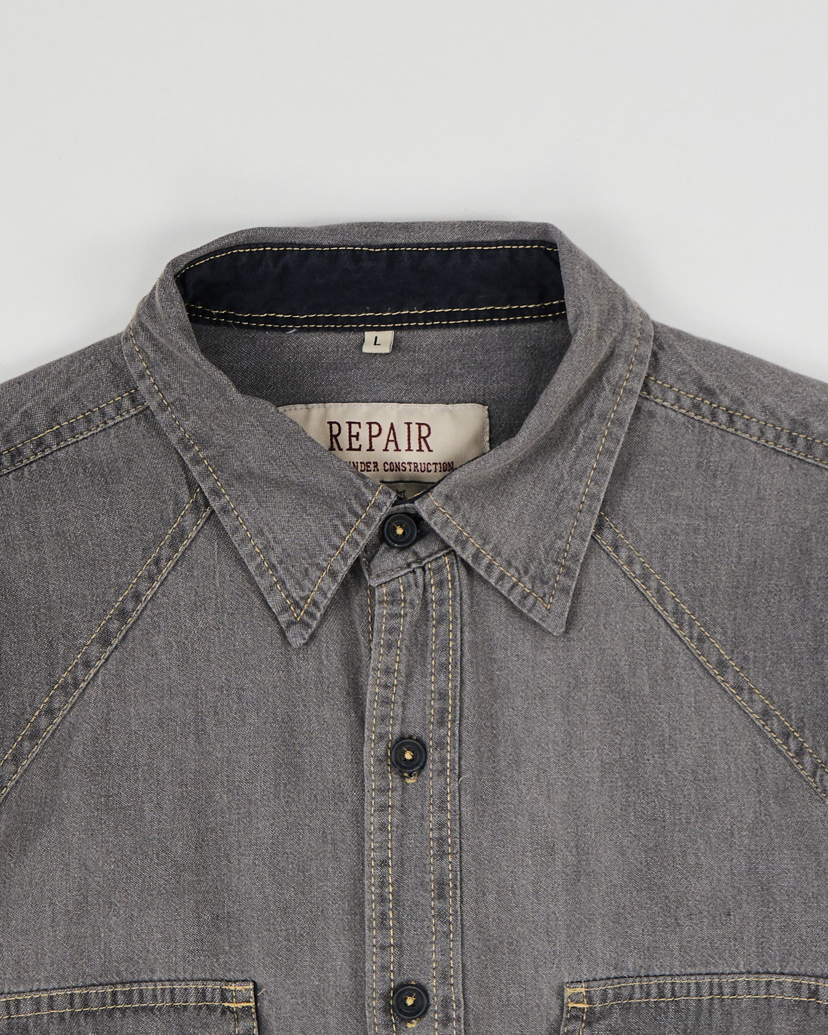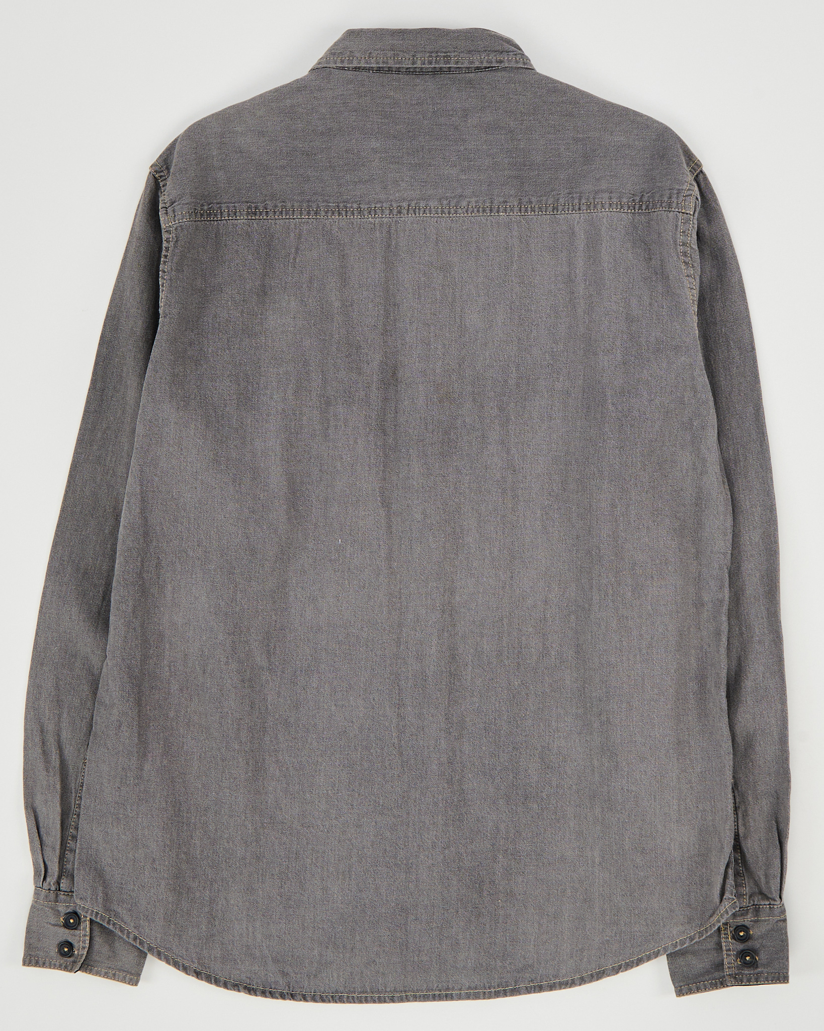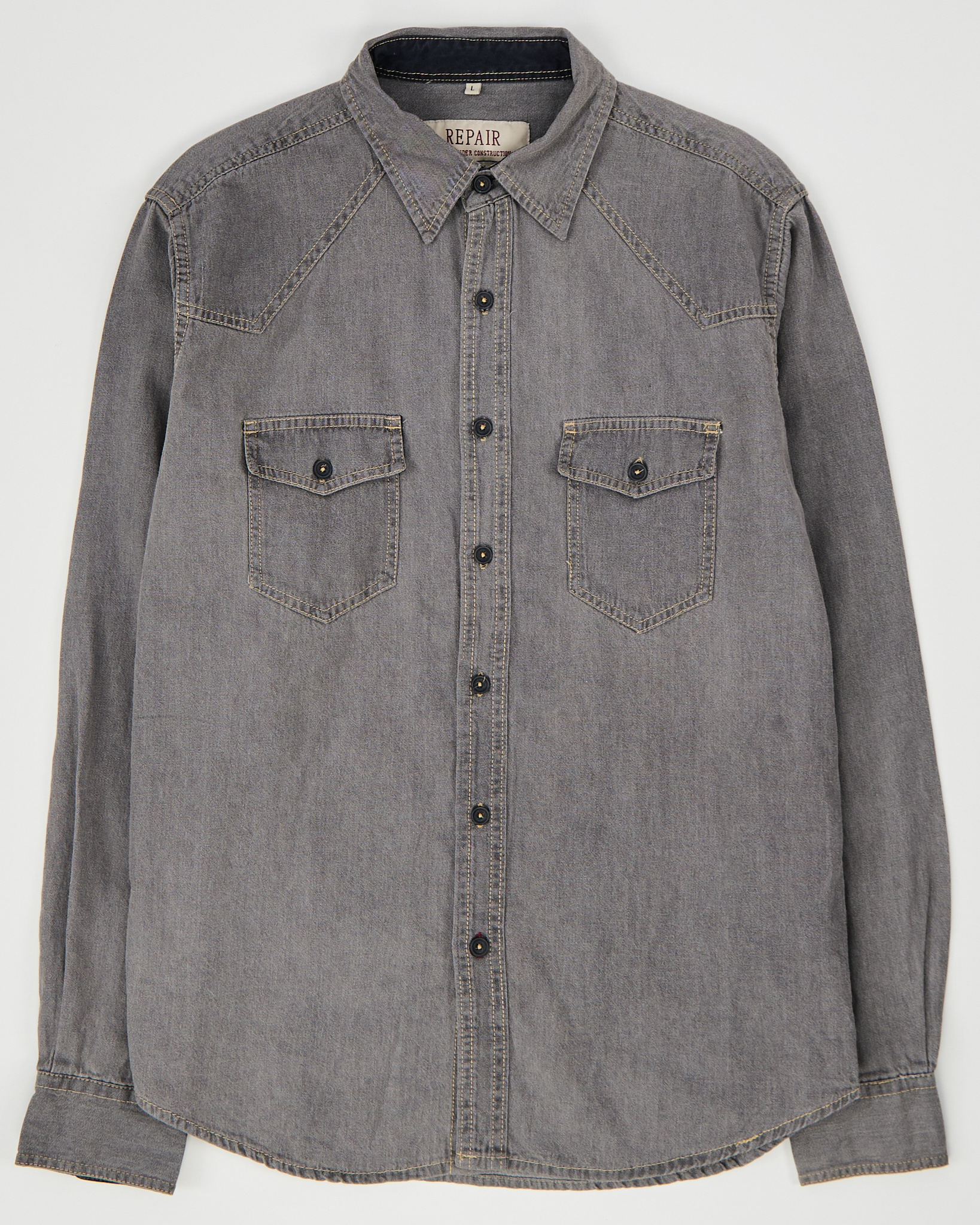 Рубашка из плотного хлопка. Прямой крой, свободная посадка. Контрастная строчка, фигурные кокетки и два кармана на груди.